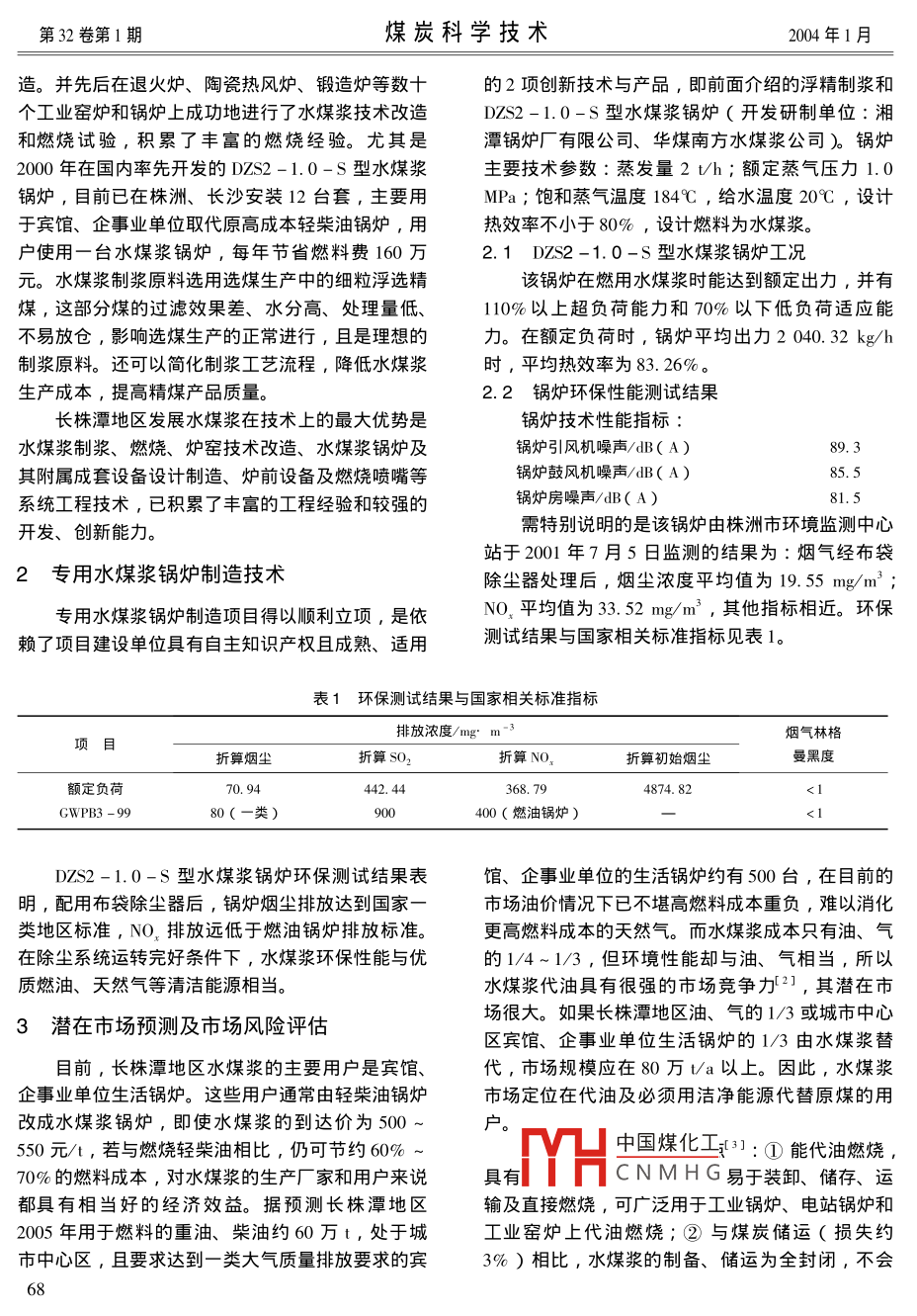 第32卷第1期煤炭科學(xué)技術(shù)2004年1月長(zhǎng)株潭地區(qū)水煤漿產(chǎn)業(yè)化若干問(wèn)題分析劉建文,單忠健,張德威2,劉隨芹3,張曉鋒21.中國(guó)礦業(yè)大學(xué)北京校區(qū),北京1083;2.湖南夭泰能源有限公司,湖南株洲412005;3.煤炭科學(xué)研究總院,北京100033)摘要:分析了長(zhǎng)株潭地區(qū)的水煤漿發(fā)展歷史、原料及系統(tǒng)集成技術(shù)優(yōu)勢(shì),探討了經(jīng)濟(jì)效益、潛在市場(chǎng)預(yù)測(cè)及市場(chǎng)定位與風(fēng)險(xiǎn)評(píng)估、高新適用技術(shù)研發(fā)與可行性等問(wèn)題。關(guān)鍵詞:水煤漿;產(chǎn)業(yè)化;高新適用技術(shù)中圖分類(lèi)號(hào):X38文獻(xiàn)標(biāo)識(shí)碼:B文章編號(hào):0253-2336(2004)01-0067-03Analysis on some issues on CWM industrialization in Changzhutan DistrictLIU Jian-wen, SHAN Zhong-jian', ZHANG De-wei, LIU Sui-qin', ZHANG Xiao-feng( 1. Beijing Campus, China University of Mining and Technology Beijing 100083, China2. Hunan Tiantai Energy Company Lid. Zhuzhou 412005, China ;3. China Coal Research Institute, Beijing 100013, China世界銀行將在2004年財(cái)政年度重點(diǎn)支持湖南是最具有開(kāi)發(fā)與產(chǎn)業(yè)化前景的潔凈煤技術(shù)。水煤漿城市發(fā)展戰(zhàn)略項(xiàng)目,其中包括對(duì)長(zhǎng)株潭經(jīng)濟(jì)走可持經(jīng)濟(jì)規(guī)模產(chǎn)業(yè)化是一個(gè)系統(tǒng)工程,本文就長(zhǎng)株潭地續(xù)發(fā)展戰(zhàn)略具有深遠(yuǎn)影響的潔凈煤工程,并由湖南區(qū)水煤漿發(fā)展歷史及原料、技術(shù)優(yōu)勢(shì),對(duì)目前市場(chǎng)天泰能源有限公司(原株洲洗煤廠)承擔(dān)項(xiàng)目建經(jīng)濟(jì)效益、潛在市場(chǎng)預(yù)測(cè)以及專(zhuān)用水煤漿鍋爐制造設(shè)。潔凈煤工程中的技術(shù)選擇以創(chuàng)新、適用和技術(shù)、水煤漿市場(chǎng)定位與風(fēng)險(xiǎn)評(píng)估、高新適用技術(shù)具有市場(chǎng)競(jìng)爭(zhēng)力為原則,綜合國(guó)內(nèi)潔凈煤技術(shù)領(lǐng)域研發(fā)與可行性等方面進(jìn)行探討。中燃前加工各項(xiàng)技術(shù)(選煤、配煤、型煤和水煤漿)的成熟程度、區(qū)域能源現(xiàn)實(shí)市場(chǎng)與潛在可開(kāi)1水煤漿發(fā)展歷史及原料、技術(shù)優(yōu)勢(shì)發(fā)市場(chǎng)、項(xiàng)目方技術(shù)消化能力及創(chuàng)新能力各方面因長(zhǎng)株潭地區(qū)水煤漿的發(fā)展歷史就是湖南天泰能素,確定了潔凈煤工程中的主要潔凈煤產(chǎn)品為型?源有限公司(原株洲選煤廠)的水煤漿發(fā)展歷程。煤、水煤漿和動(dòng)力配煤。而從技術(shù)檔次、發(fā)展?jié)?995年建成3萬(wàn)υa低揮發(fā)分浮選精煤制漿生產(chǎn)力、環(huán)保性能、市場(chǎng)競(jìng)爭(zhēng)力方面綜合考慮,水煤漿線,2003年完成5萬(wàn)υa浮精+精煤制漿技術(shù)改探討[J]巖土工程學(xué)報(bào),1999(6)參考文獻(xiàn)[7]張頂立.綜放工作面煤巖穩(wěn)定性研究控制[D]徐州:中[I]康天合,宋選民.煤層條件對(duì)頂煤可放性的影響研究[J]國(guó)礦業(yè)大學(xué),1995巖土工程學(xué)報(bào),1996(9)[8]宋振騏,陳立良,王春秋,等.關(guān)于綜采放頂煤安全開(kāi)采[2]靳鐘銘.開(kāi)天窗支架放頂煤工藝在硬煤層中的應(yīng)用[J]條件的認(rèn)識(shí)[J]煤炭學(xué)報(bào),1995煤炭科學(xué)技術(shù),1991(2)放頂煤開(kāi)采頂煤運(yùn)移實(shí)測(cè)與損傷特性分[3] Kang T H, Jin Z M. Laws of Coal- Rock Movement and the析[J]巖石力學(xué)與工程學(xué)報(bào),1996(2)Technical Parameters on the Fully Mechanized Sub- Level Ca-[10]吳健,張勇.頂煤裂隙的發(fā)展趨勢(shì)及其對(duì)注水防塵的Seam[J] the Ming engin煤炭學(xué)報(bào),1999(6)中國(guó)煤化工一[4]姜福興.采場(chǎng)頂板控制設(shè)計(jì)及其專(zhuān)家系統(tǒng)[M]徐州:中iHCNMHG山東科國(guó)礦業(yè)大學(xué)出版社,1995技大要研究方向?yàn)榈V山壓力與巖[5]張開(kāi)智,姜福興.放頂煤開(kāi)采適用條件定量評(píng)價(jià)方法[J]層控制。山東礦業(yè)學(xué)院學(xué)報(bào),1999(9)[6]楊淑華,姜福興,綜采放頂煤支架受力與頂板結(jié)構(gòu)的關(guān)系收稿日期:2003-09-18;責(zé)任編輯:曾康生67第32卷第1期煤炭科學(xué)技術(shù)2004年1月造。并先后在退火爐、陶瓷熱風(fēng)爐、鍛造爐等數(shù)十的2項(xiàng)創(chuàng)新技術(shù)與產(chǎn)品,即前面介紹的浮精制漿和個(gè)工業(yè)窯爐和鍋爐上成功地進(jìn)行了水煤漿技術(shù)改造DS2-1.0-S型水煤漿鍋爐(開(kāi)發(fā)研制單位:湘和燃燒試驗(yàn),積累了豐富的燃燒經(jīng)驗(yàn)。尤其是潭鍋爐廠有限公司、華煤南方水煤漿公司)。鍋爐2000年在國(guó)內(nèi)率先開(kāi)發(fā)的DZS2-1.0-S型水煤漿主要技術(shù)參數(shù):蒸發(fā)量2t/h;額定蒸氣壓力1.0鍋爐,目前已在株洲、長(zhǎng)沙安裝12臺(tái)套,主要用MPa;飽和蒸氣溫度184℃,給水溫度20℃,設(shè)計(jì)于賓館、企事業(yè)單位取代原高成本輕柴油鍋爐,用熱效率不小于80%,設(shè)計(jì)燃料為水煤漿。戶使用一臺(tái)水煤漿鍋爐,每年節(jié)省燃料費(fèi)160萬(wàn)2.1DZs2-1.0-S型水煤漿鍋爐工況元。水煤漿制漿原料選用選煤生產(chǎn)中的細(xì)粒浮選精該鍋爐在燃用水煤漿時(shí)能達(dá)到額定出力,并有煤,這部分煤的過(guò)濾效果差、水分高、處理量低110%以上超負(fù)荷能力和70%以下低負(f