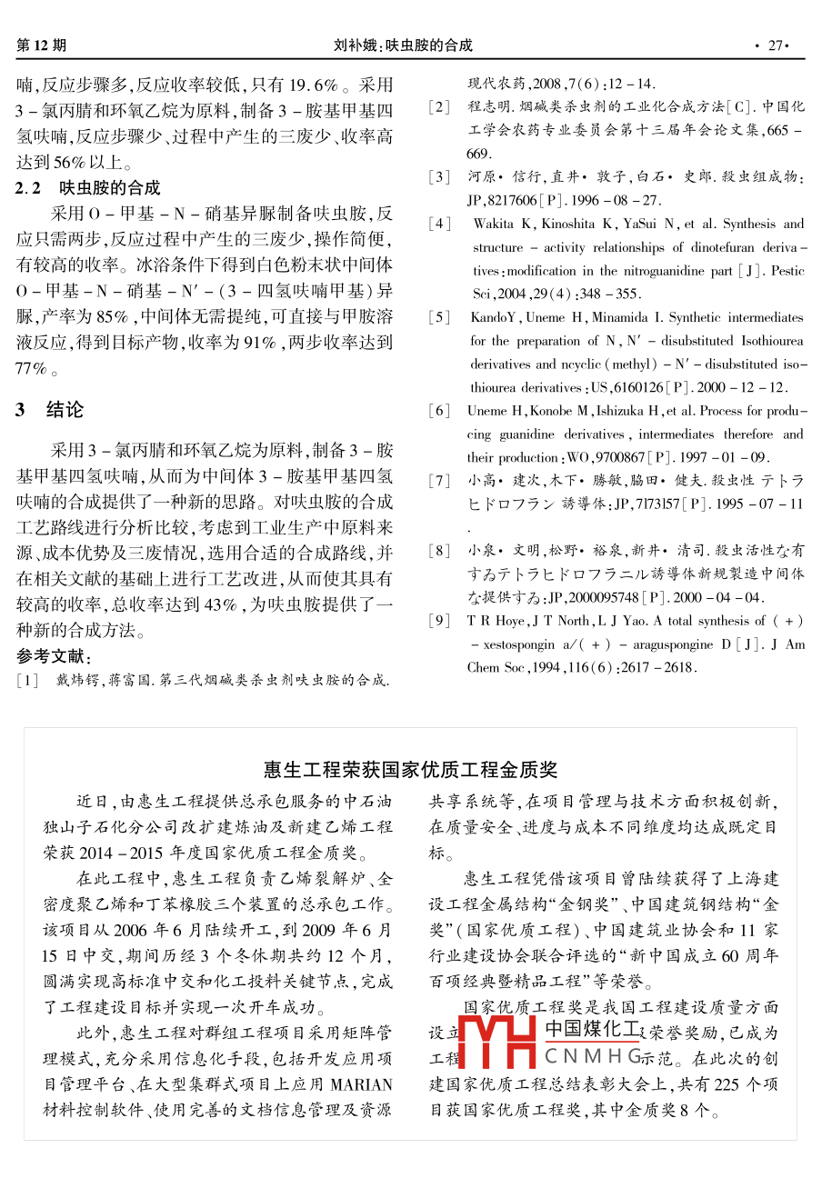 第12期劉補(bǔ)娥:呋蟲胺的合成●25.呋蟲胺的合成劉補(bǔ)娥(江蘇揚(yáng)農(nóng)化工集團(tuán)有限公司,江蘇揚(yáng)州225009)摘要:對(duì)呋蟲胺的合成路線進(jìn)行了 綜述,并對(duì)其最佳合成工藝進(jìn)行了研究。以3-氯丙腈和環(huán)氧乙烷為 原料,制備3-胺基甲基四氫呋喃,再與0-甲基-N-硝基異脲進(jìn)行縮合,胺化制備目標(biāo)產(chǎn)物,總收率達(dá)到43% ,為呋蟲胺的合成提供了一種新的合成方法。關(guān)鍵詞:新型煙堿類殺蟲劑;3-胺基甲基四氫呋喃;呋蟲胺;合成中圖分類號(hào):TQ453.2文獻(xiàn)標(biāo)識(shí)碼:A文章編號(hào):1003 - 3467 (2015)12 -0025 -03Synthesis of dinotefuranLIU Bu'e( Jiangsu Yangnong Chemical Industy Corporation Limited,Yangzhou 225009 , China )Abstract : Synthetic routes of dinotefuran are reviewed and the synthesis process of dinotefuran is studied.The 3 - amino - methyl tetrahydrofuran is prepared using 3 - chloropropyl nitrile and ethylene oxide asraw materials,which further reacted with 0 - methyl - N - nitroisourea to afford dinotefuran in yield of43% . The result provides a novel approach for synthesis of dinotefuran .Key words :new neonicotinoids insecticides ; 3 - aminmethytetrahydrofuran ; dinotefuran ; synthesis現(xiàn)工業(yè)化生產(chǎn);方法④收率36. 36%(以3 -胺基甲0前言基四氫呋喃計(jì)),由于收率太低,無(wú)法工業(yè)化生產(chǎn);呋蟲胺是煙堿類殺蟲劑中唯--不含氯原子和芳方法⑤收率77.4% (以3-胺基甲基四氫呋喃計(jì))。環(huán)的,被稱之為第三代煙堿類殺蟲劑,具有超高效、對(duì)比幾種工藝路線的優(yōu)缺點(diǎn),考慮到工業(yè)生產(chǎn)廣譜、用量少、毒性低(制劑微毒級(jí))、藥效持久、對(duì)中原料來(lái)源、成本優(yōu)勢(shì)、經(jīng)濟(jì)效益、三廢情況等方面作物無(wú)藥害使用安全等優(yōu)點(diǎn)。鑒于呋蟲胺良好的綜合評(píng)價(jià)后,選用第五種合成路線,即0-甲基-市場(chǎng)與應(yīng)用前景,該農(nóng)藥有望成為世界性的大型農(nóng)N-硝基異脲法在相關(guān)文獻(xiàn)的基礎(chǔ)上進(jìn)行工藝改藥。進(jìn),從而使其具有較高的收率。本文采用3 -氯丙目前現(xiàn)有的文獻(xiàn)報(bào)道合成工藝主要有以下幾腈和環(huán)氧乙烷為原料,制備3-胺基甲基四氫呋喃,種":①3-四氫呋喃甲基對(duì)甲苯磺酸酯法”;②再與0-甲基-N-硝基異脲進(jìn)行縮合,胺化制備3-四氫呋喃甲基三氟甲基磺酸酯法甲];③S-甲目標(biāo)產(chǎn)物。該工藝具備反應(yīng)步驟少、原料易得、三廢基-N-硝基-N'-鄰苯二甲酰異硫脲法'°-0);④少 、收率高等優(yōu)點(diǎn)。S-甲基-N-硝基-N'-甲基異硫脲法';⑤0-1實(shí)驗(yàn)部分甲基-N-硝基異脲法[8]。方法①收率68.35%(以3-羥甲基四氫呋喃計(jì)),該方法相對(duì)收率較低;方1.1儀器及 試劑法②收率39. 4% (以3 -羥甲基四氫呋喃計(jì)),由于島津FTB-8400S紅外光譜測(cè)定儀;Bruker三氟甲磺酸酐價(jià)格較貴,用量大,無(wú)法工業(yè)化生產(chǎn);Adv中國(guó)煤化工- 254薄層色譜板;島方法③收率56. 2%(以3 -胺基甲基四氫呋喃計(jì)),津 I:FYHc N MH G用試劑及原料均為分由于反應(yīng)會(huì)放出甲硫醇?xì)怏w,環(huán)境污染大,也無(wú)法實(shí)析純、未經(jīng)提純。主要試劑:3-氯丙腈、四氫呋喃、收稿日期:2015- 10-18.作者簡(jiǎn)介:劉補(bǔ)娥(1977- ),女,工程師,從事有機(jī)合成工作,電話:13815800583.河南化工●26.HENAN CHEMICAL INDUSTRY2015年第32卷二異丙胺、正丁基鋰.環(huán)氧乙烷、乙醚、氯化銨、氫化H2N_OCH3_A 縣OCH鋁鋰、氫氧化鈉、鹽酸、0-甲基-N-硝基異脲、氯NNO2No,仿、甲胺水溶液、硫酸鎂、乙酸乙酯、甲醇。1.2實(shí)驗(yàn)過(guò)程 .僅易yoCH .HNH_ A基NHCH,1.2.13-胺基甲基四氫呋喃的合成“cI~oN.9>催化劑。MN oH在四口瓶中投入62.7 g(0. 62 mol)3-胺基甲CN基四氫呋喃,200 g去離子水進(jìn)行攪拌,在冰浴下滴YOH 10%NaOH匯> CN加62. 86 g 36%的鹽酸(0.62 mol), 加入完之后,依次加入74.1 g(0. 62 mol)的0-甲基-N-硝基異.-CN LiAIH. 9 >-CHNH2脲、0.1 mol/L的稀鹽酸250.5 g(0. 025 mol) ,使得反應(yīng)體系的pH值為7,室溫反應(yīng)18 h,反應(yīng)結(jié)束后,用400 g氯仿進(jìn)行萃取,用無(wú)水硫酸鎂進(jìn)行干燥,負(fù)催化劑二異丙基氨基鋰的制備:在四口瓶中分壓脫溶,烘干得到107.05 g(0. 525 mol) 白色結(jié)晶產(chǎn)別加入1 200gTHF,111.3g(1.1 mol)二異丙胺,用物,收率84. 68% ,熔點(diǎn)62.4~63.3 C。氮?dú)獯祾叻磻?yīng)體系后,降溫至0 C ,向反應(yīng)瓶?jī)?nèi)緩慢在裝有回流管、溫度計(jì)、滴液漏斗的四口瓶中加滴加420 mL(1.05 mol)2.5 mol/L正丁基鋰的正已人 100 g(0.493 mol)1 -甲氧基-2-硝基-3-(四烷溶液,混合體系攪拌15 min后降溫至-78 C。氫-3-呋喃甲基)胍、300 g去離子水,進(jìn)行攪拌,催化劑制備好后向釜中加入89.5 g(1 mol)3 -在冰浴下緩慢滴加76. 1 g(0. 98 mol )40%的甲胺水氯丙腈,反應(yīng)體系攪拌20 min ,緩慢滴人160 g(3. 64溶液,滴加完畢,室溫?cái)嚢璺磻?yīng)3 h,反應(yīng)結(jié)束后,用mol)環(huán)氧乙烷,反應(yīng)液繼續(xù)在- 789C攪拌反應(yīng)1 h,稀鹽酸調(diào)節(jié)體系pH值為6 ~7,然后用300 g氯仿進(jìn)然后升至室溫,攪拌反應(yīng)1.5 h,用飽和的氯化銨淬行萃取分離,無(wú)水硫酸鎂干燥,負(fù)壓脫溶,,所得粗品滅反應(yīng)并用乙醚進(jìn)行萃取,合并有機(jī)層,用水和飽和用混合溶劑乙酸乙酯:甲醇為50: 1( 體積比)進(jìn)行氯化鈉溶液洗滌,并用無(wú)水硫酸鈉進(jìn)行干