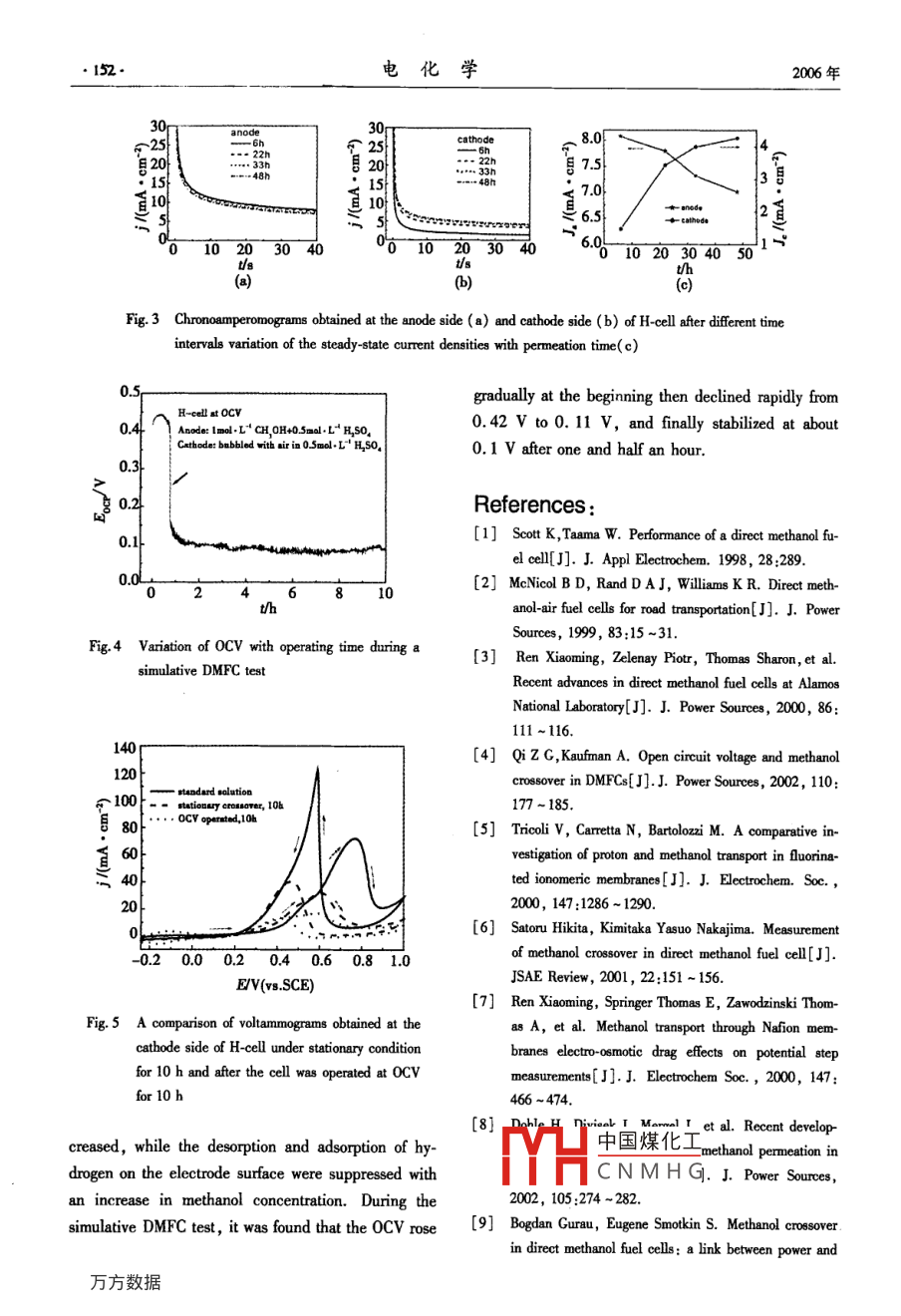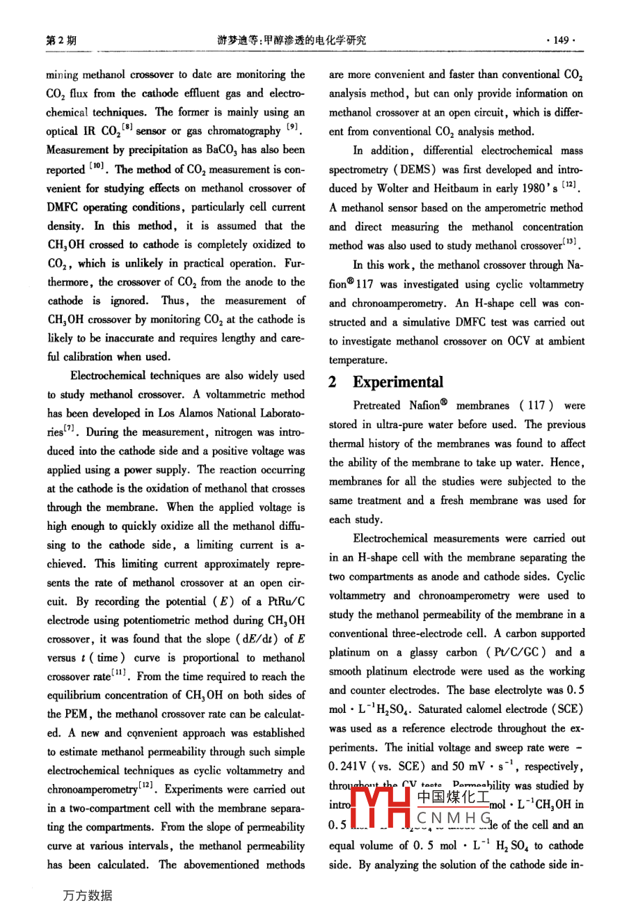 第12卷第2期電化學(xué)Vol 12 No. 22006年5月ELECTROCHEMISTRYMay 2006An Electrochemical Investigation a06-3471(2006)02-0148-06Article ID: 100Methanol crossover in DMFCsYOU Meng-di', CHENG Xuan", LIU Lian, ZHANG Lu(1. Department of Chemistry, 2. Department of Materials Science and EngineeringState Key Laboratory for Physical Chemistry of Solid SurfacesXiamen University, Xiamen 361005, Fujian, China)Abstract: Methanol crossover and its effect on the open-circuit voltage(ocv)in DMFCs were studied usingcyclic voltammetry and chronoamperometry under stationary condition and at ambient temperature. An H-shapecell was constructed and a simulative dmfC test was carried out tonvestigate methanol crossover through Na-fion117from anode to cathode The results revealed that the amount of methanol in the cathode side is dependent upon the time of penetration. As the concentration of methanol increased, the hydrogen adsorption-desorptionon the surface of electrode was suppressed and a shoulder peak appeared during the forward sweep for methanolidation The simulative dmfc test also showed that the methanol crossover caused a sudden decline in theKey words: Methanol crossover, Methanol oxidation, Cyclic voltammetry, ChronoamperometryCLC Number: TM 911.4Document Code:A1 Introductionanol oxygen fuel cell is 1. 18 V at 25 C. This valueResearch and development activities on direct is comparable to that for a hydrogen oxygen fuel cellwhich is 1.23 vl4 However, in practice, DMFCsmethanol fuel cells( DMFCs) have gained importancein recent years because of their potential applicationshave a much lower open circuit voltage(OCv).Oneas stationary and portable power sources. Methof the major reasons is that methanol can crossis an attractive fuel because its energy density is much through the proton exchange membrane(PEM),suchas Nafion to reach the cathode sidehigher than that of hydrogen, and it is an inexpensiveliquid that is easy to handle, store and transport 2diffusion( by a concentration gradient) and electroDMFCs provide the most versatile options for cleanosmotic drag( by protons ). Such crossover not onlyand efficient power production. It can be a useful results in a waste of fuel, but also causes an intemalchemical short to the fuel cells and lowers the cellpower source over a wide spectrum of energy requirements, from national defense to civil use and manyperformance. Most of the methanol crossing over willbe electrochemically oxidized at the cathode Such another fields. As a fuel cell. DMFCs are the mostoxidation reaction lowers the cathode potential and alpromising candidates for portable power applicationssible potential for a meth. so camost commonly used methods of deter中國(guó)煤化工Received date: 2005-11-22, Corresponding author, TEL: (86-592)218CNMHGupported by the Key project, the National Natural Science Foundation of China( 20433060第2期游夢(mèng)迪等:甲醇滲透的電化學(xué)研究mining methanol crossover to date are monitoring the are more convenient and faster than conventional CO 2CO2 flux from the cathode effluent gas and electro- analysis method, but can only provide information onchemical techniques. The former is mainly using an methanol crossover at an open circuit, which is differoptical IR CO, 8 sensor or gas chromatography ( 9. ent from conventional CO, analysis methodMeasurement by precipitation as BaCO, has also beenIn addition differential electrochemical massreported( 10 The method of CO, measurement is con- spectrometry(DEMS)was first developed and intro-venient for studying effects on methanol crossover of duced by Wolter and Heitbaum in early 1980sDMFC operating conditions, particularly cell current A methanol sensor based on the amperometric methodIn this method, it is assumed that the and direct measuring the methanol concentrationCH,OH crossed to cathode is completely oxidized to method was also used to studyanol crossover (131CO2, which is unlikely in practical operation. Fur-In this work, the methanol crossover through Nathermore, the crossover of Co, from thee anodeto the fion@ 117 was investigated using cyclic voltammetrycathodered. Thus, the measurement of and chronoamperometry. An Hpe cell was con-CH, OH crossover by monitoring CO, at the cathode is structed and a simulative dmfc test was carried oulikely to be inaccurate and requires lengthy and care- to investigate methanol crossover on OCV at ambientful calibration when usedemperatureElectrochemical techniques are also widely used2 Experimentalto study methanol crossover. A voltammetric methodhas been developed in Los Alamos National Laborato-Pretreated Nafion@ membranes(117)wereDuring the measurement, nitrogen was introstored in ultra-pure water before used. The previousduced into the cathodethermal history of the membranes was found to affectapplied using a power supply. The reaction occurringthe ability of the membrane to take up water. Henceat the cathode is the oxidation of methanol that crossesmembranes for all the studies were subjected to thethrough the membrane. Whenapplied voltage is same treatment and a fresh membrane was used forhigh enough to quic kly oxidize all the methanol diffu- each studysing to the cathode side, a limiting current is a-Electrochemical measurements were carried outchieved. This limiting current approximately repre-in an H-shape cell with the membrane separating thesents the rate of methanol crossover at an open cir- two compartmentscuit. By recording the potential(E)of a PRw/c voltammetry and chronoamperometry were used toelectrode using potentiometric method during CH, OH study the methanol permeability of the membrane in acrossover, it was found that the slope( dE/dt)of E conventional three-electrode cell. A carbon supportedversus t( time)curve is proportional to methanol platinum on a glassy carbon( Pt/C/GC)and acrossover rate[. From the time required to reach the smooth platinum electrode were used as the workingequilibrium concentration of CH, OH 