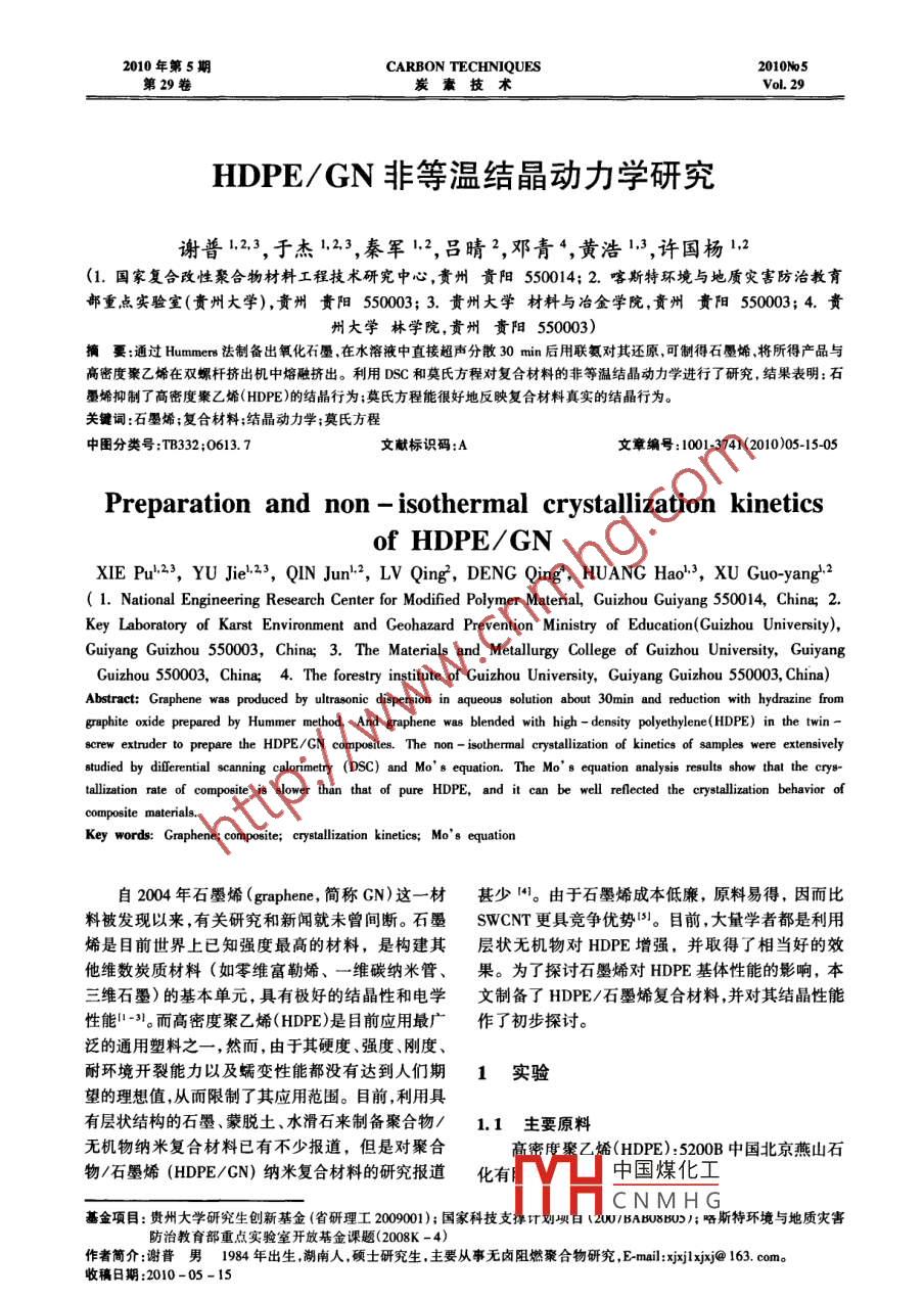 2010年第5期CARBON TECHNIQUES2010N5第29卷炭素技術(shù)Vol 29HDPE/GN非等溫結(jié)晶動(dòng)力學(xué)研究謝普·2.3,于杰3,秦軍2,呂晴2,鄧青‘,黃浩l3,許國(guó)楊12(1.國(guó)家復(fù)合改性聚合物材料工程技術(shù)研究中心,貴州貴陽(yáng)550014;2.喀斯特環(huán)境與地質(zhì)災(zāi)害防治教育部重點(diǎn)實(shí)驗(yàn)室(貴州大學(xué)),貴州貴陽(yáng)550003;3.貴州大學(xué)材料與冶金學(xué)院,貴州貴陽(yáng)550003;4.貴州大學(xué)林學(xué)院,貴州貴陽(yáng)550003)摘要:通過(guò) Hummer法制備出氧化石墨,在水溶液中直接超聲分散30min后用聯(lián)氨對(duì)其還原,可制得石墨烯,將所得產(chǎn)品與高密度聚乙烯在雙螺桿擠出機(jī)中熔融擠出。利用DsC和莫氏方程對(duì)復(fù)合材料的非等溫結(jié)晶動(dòng)力學(xué)進(jìn)行了研究,結(jié)果表明:石墨烯抑制了高密度聚乙烯(HDE)的結(jié)晶行為;莫氏方程能很好地反映復(fù)合材料真實(shí)的結(jié)晶行為。關(guān)鍵詞:石墨烯;復(fù)合材料;結(jié)晶動(dòng)力學(xué);莫氏方程中圖分類號(hào):TB332:0613.7文獻(xiàn)標(biāo)識(shí)碼文章編號(hào):1001-3741(2010)05-15-05Preparation and non-isothermal crystallization kineticsof HDPE/GNXIE Pu,23,YU Jie, QIN Jun2, LV Qing, DENG Qing,, HUANG Hao, XU Guo-yang'(1. National Engineering Research Center for Modified Polymer Material, Guizhou Guiyang 550014, China;Key Laboratory of Karst Environment and Geohazard Prevention Ministry of Education(Guizhou University)Guiyang Guizhou 550003, China; 3. The Materials and Metallurgy College of Guizhou University, Guiyanguizhou 550003, China; 4. The forestry institute of Guizhou University, Guiyang Guizhou 550003, ChinaAbstract: Graphene was produced by ultrasonic dispersion in aqueous solution about 30min and reduction with hydrazine fromgraphite oxide prepared by Hummer method. And graphene was blended with high- density polyethylene(HDPE) in the twinscrew extruder to prepare the HDPE/GN composites. The non-isothermal crystallization of kinetics of samples wereivelstudied by differential scanning calorimetry (DSC)and Mo s equation. The Mos equation analysis results show that the crys-allization rate of composite is slower than that of pure HDPE, and it can be well reflected the crystallization behavior ofKey words: Graphene; composite; crystallization kinetics; Mos equation自2004年石墨烯( graphene,簡(jiǎn)稱GN)這一材甚少。由于石墨烯成本低廉,原料易得,因而比料被發(fā)現(xiàn)以來(lái),有關(guān)研究和新聞就未曾間斷。石墨 SWCNT更具競(jìng)爭(zhēng)優(yōu)勢(shì)。目前,大量學(xué)者都是利用烯是目前世界上已知強(qiáng)度最髙的材料,是構(gòu)建其層狀無(wú)機(jī)物對(duì)HDPE增強(qiáng),并取得了相當(dāng)好的效他維數(shù)炭質(zhì)材料(如零維富勒烯、一維碳納米管、果。為了探討石墨烯對(duì)HDPE基體性能的影響,本三維石墨)的基本單元,具有極好的結(jié)晶性和電學(xué)文制備了HDPE/石墨烯復(fù)合材料,并對(duì)其結(jié)晶性能性能-3。而高密度聚乙烯(HDPE)是目前應(yīng)用最廣作了初步探討。泛的通用塑料之一,然而,由于其硬度、強(qiáng)度、剛度、耐環(huán)境開(kāi)裂能力以及蠕變性能都沒(méi)有達(dá)到人們期1實(shí)驗(yàn)望的理想值,從而限制了其應(yīng)用范圍。目前,利用具有層狀結(jié)構(gòu)的石墨、蒙脫土、水滑石來(lái)制備聚合物/1.1主要原料無(wú)機(jī)物納米復(fù)合材料已有不少報(bào)道,但是對(duì)聚合乙烯(HDPE):5200B中國(guó)北京燕山石物/石墨烯(HDPE/GN)納米復(fù)合材料的研究報(bào)道化有中國(guó)煤化工CNMHG基金項(xiàng)目:貴州大學(xué)研究生創(chuàng)新基金(省研理工2009001);國(guó)家科技支擇計(jì)劃BABUSBO;唔斯特環(huán)境與地質(zhì)災(zāi)害防治教育部重點(diǎn)實(shí)驗(yàn)室開(kāi)放基金課題(2008K-4)作者簡(jiǎn)介:謝普男1984年出生湖南人,碩士研究生,主要從事無(wú)鹵阻燃聚合物研究Eml:xjxjlxjxjo@163.com。收稿日期:2010-05-15炭囊技術(shù)第29卷天然磷片石墨:200目過(guò)篩,上海試劑廠X=AHn/(中×H=)聯(lián)氨:分析純,中國(guó)中資化工技術(shù)有限公司式中:AH、φ和H。分別代表聚合物的熔融濃硫酸:分析純重慶川江化學(xué)試劑廠;焓、聚合物復(fù)合材料中聚合物的質(zhì)量百分比和完全高錳酸鉀:分析純,重慶化學(xué)試劑總廠結(jié)晶樣品的熔融焓,對(duì)完全結(jié)晶的HDPE其熔融焓2主要設(shè)備用H=292.6J/g來(lái)計(jì)算。TE-40型同向雙螺桿擠出機(jī),南京瑞亞高聚物設(shè)備有限公司;2結(jié)果與討論CJ-80型注塑機(jī),震德塑料機(jī)械有限公司DSC-Q10型熱分析儀美國(guó)TA公司;2.1結(jié)晶溫度與結(jié)晶度的分析vcF21500超分散儀,美國(guó) Sonic& Materials Inc表1和圖1是HDPE及HDPE/G和HDPE/GN公司。復(fù)合材料在7℃/min的降溫速率下得到的結(jié)晶參1.3樣品制備數(shù)。表1中的是結(jié)晶峰溫、P是熔融峰溫、m是結(jié)1.3.1氧化石墨(GO)的制備晶起始溫度、t(wHF。)是熔融半峰寬、△H是熔融結(jié)根據(jù) Hummers原理,采用傅玲圓等改良的晶焓、X是結(jié)晶度。G以及GN的加入使得HDPEHummers法制備氧化石墨。將用200目篩子過(guò)篩的的p和X值均下降,這是因?yàn)樵贖DPE晶體長(zhǎng)大天然磷片石墨(G)10g,加入到裝有230mL濃度為過(guò)程中,此兩種石墨類物質(zhì)阻礙了分子鏈移向晶98%的濃硫酸的三角燒杯中,在冰浴中攪拌,再加核,從而抑制了HDPE的結(jié)晶14-14由表1中p入30 g KM