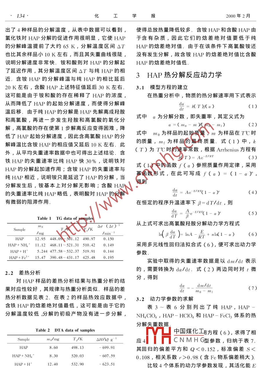 第51卷第1期化工報(bào)Vol. 51 No l2000年2月Journal of Chemical Industry and Engineering( ChinaFebruary 2000研究簡報(bào)A高氯酸羥胺熱分解動(dòng)力學(xué)米鎮(zhèn)濤常志華張香文邱立勤王亞權(quán)天津大學(xué)化工學(xué)院,天津300072)關(guān)鍵詞高氯酸羥胺分解動(dòng)力學(xué)熱分析圖分類號(hào)O643.122實(shí)驗(yàn)結(jié)果高氯酸羥胺(HAP)是一種用于推進(jìn)技術(shù)領(lǐng)21熱失重分析域的新型高能氧化劑,在高性能推進(jìn)系統(tǒng)中具有極4個(gè)體系的熱重曲線如圖1所示.由于HAP為重要的價(jià)值1-31吸濕,其熱重曲線在100℃以下部分主要與其脫水用熱分析技術(shù)研究含能物質(zhì)的熱分解,已有大有關(guān),圖2為純HAP熱分解的TG-DIG曲線圖量報(bào)道45.而對(duì)于HAP的熱分解的報(bào)道較少6-81,采用熱分析技術(shù)研究HAP的分解動(dòng)力學(xué)目前還沒有文獻(xiàn)報(bào)道.本文用熱解重量分析法(TG)和差示熱分析(DTA)對(duì)HAP的熱分解進(jìn)了研究.根據(jù)HAP合成及貯運(yùn)中可能引入的雜EE質(zhì),研究了NH4+、H、Fe3+對(duì)HAP熱分解行為的影響1實(shí)驗(yàn)部分3003504004505005506001.1高氯酸羥胺固體樣品的制備Fig 1 TG curves of HAP samples將HAP水溶液及含有添加物的HAP水溶液減1-HAP+Fe+; 2-HAP: 3-HAP+ NHA;4-HAP+H壓下蒸發(fā)(<80℃),濃縮后結(jié)晶,制得如下HAP固體樣品:純HAP固體結(jié)晶;含高氯酸銨α4.0%的HAP固體;含高氯酸α=3.0%的HAP固體;含三氯化鐵(Clˉ對(duì)HAP熱安定性無影響j1ae=0.29%的HAP固體1.2熱分析實(shí)驗(yàn)IG和DTA分別在日本島津公司制造的TGA50型熱重分析儀和DTA-50型差熱分析儀上進(jìn)行由于HAP吸濕,通過試驗(yàn)確定在100℃停留30300350400450500550600min作為脫水條件,在此條件下HAP不發(fā)生分解TG實(shí)驗(yàn)是在20 mt min的氮氛下以10℃.min1中國煤化工升溫至100℃,停留30min,再以8℃min1升溫of neat hapCNMHG至300℃結(jié)束.DTA實(shí)驗(yàn)的氮?dú)饬魉贋?0m其他條件同熱重分析從圖1可以看出,與純HAP的分解相比,含高氯酸銨的HAP以及含高氯酸的HAP的分解被延遲,而含氯化鐵的HAP的分解則提前了.表1給134化工報(bào)2000年2月出了4種樣品的分解溫度,從表中數(shù)據(jù)可以看到,使得總放熱量降低較多.含銨HAP和含酸HAP由氯化鐵對(duì)HAP分解的促進(jìn)作用很明顯,它使HAP于含有雜質(zhì),因此它們的焓差絕對(duì)值要低于純的分解峰溫提前了大約65K,分解溫度區(qū)間ΔTHAP的焓差絕對(duì)值.由于在該條件下高氯酸銨還也比其余樣品小10K左右,而且其失重曲線很陡,沒有發(fā)生分解,故含銨HAP的焓差絕對(duì)值比含酸說明分解速度非常快.銨和酸則對(duì)HAP的分解起HAP的焓差絕對(duì)值低了延遲作用,其分解溫度區(qū)間△T與純HAP的相近.含銨HAP的分解峰溫與純HAP的相比延后3HAP熱分解反應(yīng)動(dòng)力學(xué)20K左右,含酸HAP上述特征值延后30K左右.3.1模型方程的建立這可能是由于銨和酸的存在稀釋了HAP的濃度,在熱重分析中,物質(zhì)的熱分解速率用下式表示從而降低了HAP的起始分解速度,而使得分解峰=k T)/( a)(1)溫后移.由于純HAP的分解是HAP先解離成羥胺和高氯酸,再進(jìn)一步發(fā)生羥胺和高氯酸的氧化分式中a為分解分?jǐn)?shù),即失重率,其定義式為解,高氯酸的存在使第1步解離反應(yīng)變得困難,降低了HAP起始分解速度,因此含高氯酸HAP的分式中m0為樣品的起始質(zhì)量,m為樣品在T℃時(shí)解峰溫比含銨HAP的相應(yīng)值又延后10K左右.此的質(zhì)量,m;為樣品的最終質(zhì)量.式(1)中,k外,從平均失重速率數(shù)據(jù)中也可得出上述結(jié)論。含(7)為T℃時(shí)的速率常數(shù),根據(jù) Arrhenius方程有鐵HAP的失重速率比純HAP快30%,說明鐵對(duì)k(t)=AeHAP的分解起加速作用;含銨HAP的失重速率與式(1)中的函數(shù)f(a)參照質(zhì)量作用定律,采用純HAP相近,說明銨只是延遲了HAP的分解,當(dāng)冪函數(shù)形式,在此可寫成f(a)=(1-ay,分解發(fā)生后,銨基本上對(duì)分解無影響;含酸HAP得到的失重速率比純HAP略低,表明酸對(duì)HAP的分解da= Ae E/RT((4)有微弱的阻滯作用在恒定的程序升溫速率下B=dT/dt,則(5)Table 1 TG data of samples△a(△t)從上式可求出高氯酸羥胺分解動(dòng)力學(xué)方程式Ta/KT/K(a#)r(1-a)(6)HAP12.95448.09~501.124900.150HAP+NH411.12468,11-521.31510.420.149采用多元線性回歸法擬合式(6),便可求出動(dòng)力學(xué)HAP +H5.24477.58-532.37519.910參數(shù)HAP+Fe315.47390.48-431.17425.480.195實(shí)驗(yàn)中取得的失重速率數(shù)據(jù)是以dm/dt表示2.2差熱分析的,需要轉(zhuǎn)換為da/dt.式(2)兩邊同時(shí)對(duì)t微對(duì)HAP樣品的差熱分析結(jié)果與熱重分析的結(jié)分,得到dm/dt果對(duì)應(yīng)性較好,其規(guī)律與熱重分析類似.樣品的差(7)熱分析數(shù)據(jù)見表2.在表2的樣品熱效應(yīng)數(shù)據(jù)中,3.2動(dòng)力學(xué)參數(shù)的求解含鐵HAP的焓差絕對(duì)值最低,這可能是由于它的表3表6分別列出了純HAP,HAP分解溫度較低分解的初級(jí)產(chǎn)物沒有進(jìn)一步分解,NHCO, HAP-HCIO2和HAP-FeCl3體系的熱分解失重?cái)?shù)據(jù)Table 2 DTA data of samples中國煤化工方程(6),求得了相△H/k卜g應(yīng)4CNMHG型參數(shù),歸納于表7HAP498,13699,91其回歸的偏差平方和Q<0.152,標(biāo)準(zhǔn)偏差S0.98(含F(xiàn)e物系偏差稍大)HAP+H'比較4個(gè)體系的動(dòng)力學(xué)參數(shù)發(fā)現(xiàn),其活化能EHAP+詬方數(shù)據(jù)