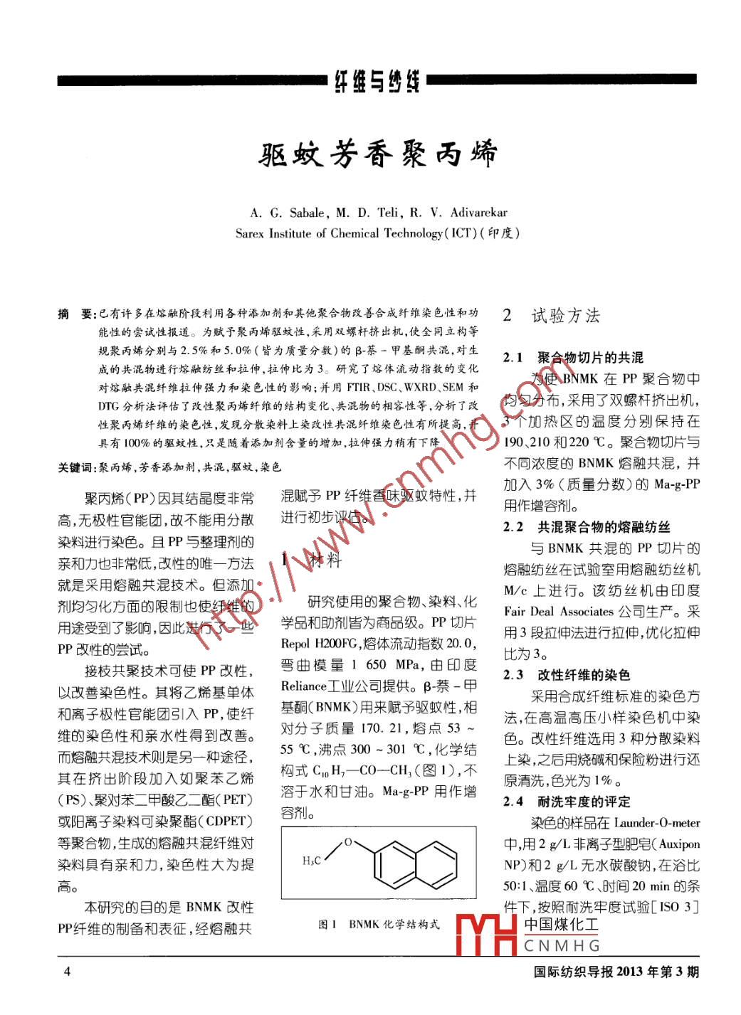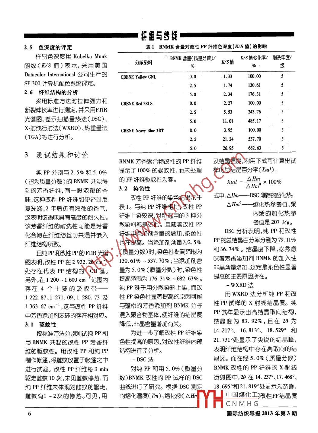 紅盤與線驅蚊芳香聚丙烯A. G. Sabale, M. D. Teli. R. V. AdvarekarSarex Institute of Chemical Technology (ICT)(EPRt摘要:已有許多在熔融階段利用各種添加劑和其他聚合物改善合成纖單染色性和功2試驗方法能性的嘗試性報道。為賦予聚丙烯驅蚊性,采用雙螺杄擠出機,使全同立構等規(guī)聚丙烯分別與2.5%和5.0%(皆為質量分數)的β-萘一甲基酮共混,對生成的共混物進行熔融紡絲和拉伸,拉伸比為3。研究了熔體流動指數的變化2.1聚合物切片的共混對熔融共混纖維拉伸強力和染色性的影響;并用FTIR、DSC、WXRD、SEM和為使BNMK在P聚合物中DrG分析法評估了改性聚丙烯纖維的結構變化、共混物的相容性等,分析了改均勻分布采用了雙螺桿擠出機,性聚丙烯纖維的染色性,發(fā)現分散來料上染改性共混纖維染色性有所提高,并3個加熱區(qū)的溫度分別保持在具有100%的驅蚊性,只是隨著添加劑含量的增加,拉仲強力稍有下降」190、210和220℃。聚合物切片與關鍵詞:聚丙烯,芳香添加劑,共混,驅蚊,染色不同濃度的BNMK熔融共混,并聚丙烯(PP)因其結晶度非?;熨x予P纖維香味驅蚊特性,并3%(質量分數)的MagP用作增容劑高,無極性官能團,故不能用分散進行初步評估。2.2共混聚合物的熔融紡絲染料進行染色。且PP與整理劑的親和力也非常低,改性的唯一方法1材料與BNMK共混的PP切片的熔融紡絲在試驗室用熔融紡絲機就是采用熔融共混技術。但添加M/c上進行。該紡絲機由印度劑均勻化方面的限制也使纖維的研究使用的聚合物、染料、化用途受到了影,因此進行了一些學品和助劑皆為商品級。P切片Fair Deal Associates公司生嚴。采Repl H200FG,熔體流動指數20.0用3段拉伸法進行拉伸,優(yōu)化拉伸PP改性的嘗試。接枝共聚技術可使P改性,雪曲模量1650MPa,由印度比為3。以改善染色性。其將乙烯基單體 Reliance I業(yè)公司提供。B禁-2.3改性纖維的染色采用合成纖維標準的染色方和離子極性官能團引入P,使纖基酮(BNK用來賦予驅蟻性,相法,在高溫高壓小樣染色機中染而烴融共混技術則是另一種途徑,55℃,沸點300-301℃,化學結色。改性纖維選用3種分散染料維的染色性和親水性得到改善對分子質量170.21,熔點53~其在擠出階段加入如聚苯乙構式CnH2C0-CH1(圖1),不上染,之后用燒堿和保險粉進行還原清洗,色光為1%。(PS)、聚對苯二甲酸乙二酯(PET)浴于水和甘油。MagP用作增24耐洗牢度的評定或陽離子染料可染聚酯( CDPET)容劑。染色的樣品在 Launder-O- meter等聚合物,生成的焓融其混纖維對中,用2gL非離子型肥皂( Auxipon染料員有親和力,染色性大為提NP)和2g/L無水碳酸鈉,在浴比0:1、溫度60℃、時間20min的條本研究的目的是BNMK改性件下,按照耐洗牢度試驗[ISO3PP纖維的制備和表征,經熔融共圖1BNMK化學結構式中國煤化工CNMHG國際紡織導報2013年第3期紅維與繡統(tǒng)2.5色深度的評定表1BNMK含量對改性PP纖維色深度(KS值)的影響樣品色深度用 Kubelka munkBNMK舍量(質量分數)K/S值變化率/耐洗牢度函數(KS值)表示,采用美國分散染料K/S值%級Datacolor International公司生嚴的CBENE Yellow GNL0.0100.00SF300計算機配色系統(tǒng)評定。.6l2.6纖維結構的分析5.0176.31采用標準方法對拉伸強力和CBENE Red 38LS0.0100.00斷裂伸長率進行測定,并采用FTIR2.5243.76光譜圖、差示掃描量熱法(DSC)、5.0l1.01X射線行射法(WXRD)熱重量法 CBENE Neavy Blue3Rr3.95100.00(TGA)等進行分析。55555555521.24537.705.026.95682.633測試結果和討論BNMK芳香聚合物改性的PP纖維及結晶溫度,利用下式可計算出試純PP分別與25%和5.0%顯示了100%的驅蚊性而未處理樣的總結晶百分率(Xa)(皆為質量分數)的BNMK共混得的P纖維驅蚊性為零。Xta△Hx100%到的芳香纖維,有一股濃郁的香32染色性△Hm0味,這種改性P纖維即便經過反改性PP纖維的染色結果示于式中:△mDC測得的熔化熱;復洗滌,2年后仍有濃郁的香氣,表1。與純PP纖維相比,改性PP△Hm—熔化熱參考值,聚這表明該香味具有高度的耐久性。纖維上染較深對所選用的3種分丙烯的熔化熱參該芳香纖維的耐洗性可能是芳香散染料都是如此。且隨著改性PP考值是207Jgo化合物在纖維紡絲前共混并嵌入纖維中添加劑含量的增加,染色性DSC分析表明,純PP和改性纖維結構所致。也在提高。當添加劑含量為25%PP的忘結晶百分率分別為x,1%且純P和性P的FIR光譜(質量分數)時染色性提高范圍為和3674%。結晶度下降,必然意圖表明改性PP在2922.26cm1130.61%~537.70%;當添加劑含味著芳香添加劑BNMK的加入使處存在代表PP結構的CH基。量為50%(質量分數)時,染色性非晶含量增加這定是染色性顯著另外,在1200-1600cm范圍內提高范圍為176,31%-682.63%。提高的主要原因所在。存在4個主要的吸收帶純PP難于用分散染料上染,而改-WXRD法122.87、1271.09、1280.73及性PP染色性顯著提高的原因可能用WXRD法分析純PP和改1363.67cm,這與改性P纖維與蓬松的芳香添加劑BNMK分子性P試樣的X射線結晶度。純混入聚合物基體使纖維的結晶度P試樣顯示出高結晶取向結構,3.1驅蚊性降低,非晶含量增加有關。結晶度為83.92%,且在20為按標準方法分別測試純PP和為進一步了解改性PP纖維染14.217°、16.813°、18.529°和與BNMK共混的改性P芳香纖色性提高的原因,對改性纖維內部21.731°處顯示了尖銳的結晶峰,維的驅蚊性。用改性PP和純PP結構進行了分析。表明纖維結構中存在高取向的結制作帳篷,將雌蚊放置于帳篷之中DSC法晶區(qū)。而在經5.0%(質量分數)進行試驗。改性PP纖維每3min對純PP和用5.0%(