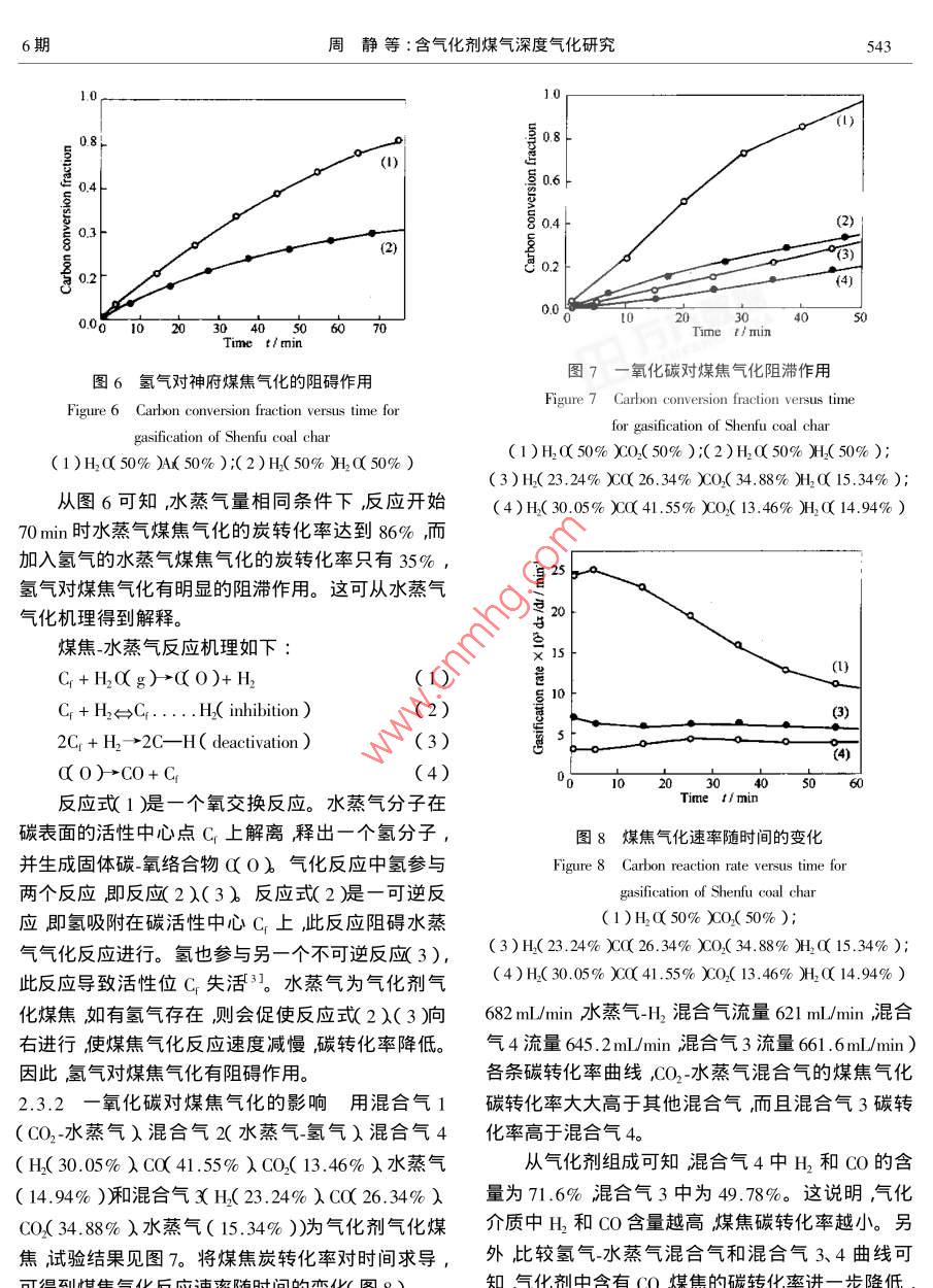 第30卷第6期燃料化學(xué)學(xué)報(bào)Vol.30 No.62002年12 月JOURNAL OF FUEL CHEMISTRY AND TBCHNOLOGYDec.2002文章編號(hào):0253-2409 2002 )06-0540-05含氣化劑煤氣深度氣化研究周靜,周志杰,王少云,龔欣,于遵宏(華東理工大學(xué)潔凈煤技術(shù)研究所上海200237 )摘要:利用自制小型加壓固定 床氣化爐研究氣化劑為混合氣的煤焦氣化?;旌蠚鉃楹珻O、Co、H和水蒸氣的氣體,它是模擬水煤漿氣化爐出爐煤氣成分在實(shí)驗(yàn)室制得的。實(shí)驗(yàn)考察氣化溫度、氣化劑流速、混合氣氣體成分對(duì)煤焦氣化的影響。實(shí)驗(yàn)發(fā)現(xiàn)煤焦氣化溫度越高氣化劑流速越大煤焦氣化反應(yīng)速度越快;H、co對(duì)煤焦氣化有阻滯作用。關(guān)鍵詞:煤焦氣化;固定床;高溫煤氣;阻滯作用中圖分類號(hào):TQ546文獻(xiàn)標(biāo)識(shí)碼:A .煤氣化技術(shù)除廣泛應(yīng)用于城市燃?xì)夤I(yè)燃?xì)?、文中利用自制的小型加壓固定床氣化爐研究混化工原料外其重要發(fā)展方向是用于整體煤氣化循合氣-煤焦氣化反應(yīng)?;旌蠚饽M水煤漿氣化爐出環(huán)發(fā)電領(lǐng)域( ICCC)采用水煤漿為原料的德士古爐煤氣成分制得,氣體中含CO2、CO、H2和水蒸氣。( Texaco )技術(shù)和以干煤粉為原料的謝爾( Shell )技術(shù)本文考察溫度、氣化劑流速、混合氣氣體組分對(duì)煤焦是已商業(yè)化的高性能氣流床煤氣化技術(shù)"。這兩種氣化的影響。氣化工藝用于發(fā)電時(shí),采用設(shè)置廢熱鍋爐回收煤氣1實(shí)驗(yàn)部分顯熱的辦法來(lái)提高發(fā)電效率。由于廢熱鍋爐投資1.1 實(shí)驗(yàn)原料試驗(yàn)用煤為陜西神府煤。將煤在大,且易于堵塞,目 前未能大面積推廣。通常出爐煤氣溫度1300C以上蘊(yùn)藏大量顯105 C烘干1h粉碎篩分選用粒度0.45 mm~ 0.9mm熱。若能利用這部分顯熱使出爐煤氣再與原煤進(jìn)行的煤做樣品。在氮?dú)饬髦袑⒀b煤的反應(yīng)器從室溫開反應(yīng),即用該出爐煤氣高溫段顯熱作為熱源將煤氣始以20 C/min升溫速率升溫至930 C然后在此溫度化,則可降低氣化裝置投資充分利用能源。另外,下熱解30min制成半焦。將制得的半焦進(jìn)行不同實(shí)水煤漿氣化爐出爐氣體中CO2含量約15% ,H2O 含驗(yàn)條件下氣化試驗(yàn)。煤焦分析見表1。量約10%這兩種組成對(duì)爐子的冷煤氣效率沒有任表1神府煤焦分析結(jié)果Table 1 Analysis of Shenfu coal char sample何貢獻(xiàn)。若使出爐高溫煤氣與煤進(jìn)行氣化反應(yīng),還可達(dá)到改良煤氣組成提高煤氣中的有效氣成分。Coal Proximate analysis wa 1%Ultimate analysis wwl 1%charM.AVFCC HNSt 0即通過碳和出爐高溫煤氣中水蒸氣和CO2反應(yīng)來(lái)Shenfu 3.92 14.08 1.49 80.51 80. 170.730.700.340.06提高煤氣中H2、CO、CH4的含量。反應(yīng)方程式2為:實(shí)驗(yàn)所用混合氣模擬水煤漿氣化爐出爐氣成分C+H20=CO+H(△H = 131x 10 kJ/kmol )配置根據(jù)氣體道爾頓分壓定律用鋼瓶、微量水泵及C+ CO2=2C0( OH = 173x 10 kJ/kmol )所以利用出爐高溫煤氣和煤反應(yīng),有充分利用能源加熱管在實(shí)驗(yàn)室制得。1.2 實(shí)驗(yàn)流程 實(shí)驗(yàn)裝置為小型加壓固定床煤氣和提高煤氣有效氣體成分等優(yōu)點(diǎn)。煤在氣化爐中首先進(jìn)行脫揮發(fā)分的熱解反應(yīng)得化反應(yīng)器流程如圖1所示。到固體產(chǎn)物半焦,隨后發(fā)生煤焦和氣化劑及揮發(fā)分混合氣(含CO2、CO、H2 )導(dǎo)出鋼瓶后通過減壓和氣化劑間發(fā)生反應(yīng)。由于焦氣化速度比煤快速熱閥調(diào)節(jié)壓力用微調(diào)閥和質(zhì)量流量控制器控制氣體解速率慢的多所以煤氣化的碳轉(zhuǎn)化率由焦的氣化流量。氣體流量由質(zhì)量流量計(jì)顯示并計(jì)量。氣體流經(jīng)壓力表和微量計(jì)量水泵打出的水一起通過加熱管速率決定。收稿日期: 2002-04-08 ;修回日期:2002-08-296期周靜等:含氣化劑煤氣深度氣化研究5416工化如圖2所示。將煤焦炭轉(zhuǎn)化率對(duì)時(shí)間求導(dǎo),可得上系353到煤焦氣化反應(yīng)速率圖3。- witcr 100g0.8vent←130.614/(3圖1實(shí)驗(yàn)流程圖Figure 1 Schematic diagram of coal gasification apparatus0020 406080100120 1401- -gas cylinder ; 2- pressure regulator ; 3- -mass flow control-Time 1/minler ;4 ,15- -flow regulating valve; 5 ,J12- pressure meter ; 6一圖2不同溫度下煤焦氣化碳轉(zhuǎn)化率與氣化時(shí)間的關(guān)系preheater; 7- reactor ; 8- -heater and temperature controller ;Figure 2 Carbon conversion fraction versus time for9- -thermocouples ; 10- -water pump;11- dryer ;13- -gas chro-matography ; 14- -soap film metergaifcation of Shenfu coal char(1)1002 C ;(2)967 C ;(3)783 C將水氣化成水蒸氣并加熱氣體。水蒸氣與混合氣(含CO2、CO、H2 )-起進(jìn)入反應(yīng)器和煤焦發(fā)生氣化管160反應(yīng)。反應(yīng)后的氣體從反應(yīng)器的底部導(dǎo)出通過干燥器除去氣體中的水分再經(jīng)過穩(wěn)壓調(diào)節(jié)器和出口與12調(diào)節(jié)閥,計(jì)量后排空。用氣相色譜儀分析出口氣體8的組成。1.3結(jié)果計(jì)算試驗(yàn)結(jié)果用碳轉(zhuǎn)化率表示。, [(yo∞+ yo, + ya, )V(Y'+ y'a, )Vo H'%一2040.60.80100120r =-22.4x WxCTime t/ min273x 12x273+t圖3不同溫度下煤焦氣化反應(yīng)速率與時(shí)間的關(guān)系Figure 3 Carbon reaction rate versus time for式中:x-碳轉(zhuǎn)化率;n- -煤焦量g;c-煤焦gasification of Shenfu coal char中元素碳含量,% iy一反應(yīng)器出口氣體組分