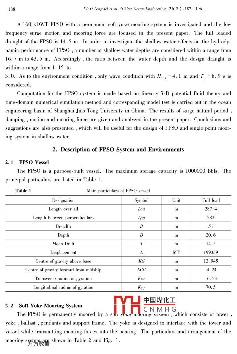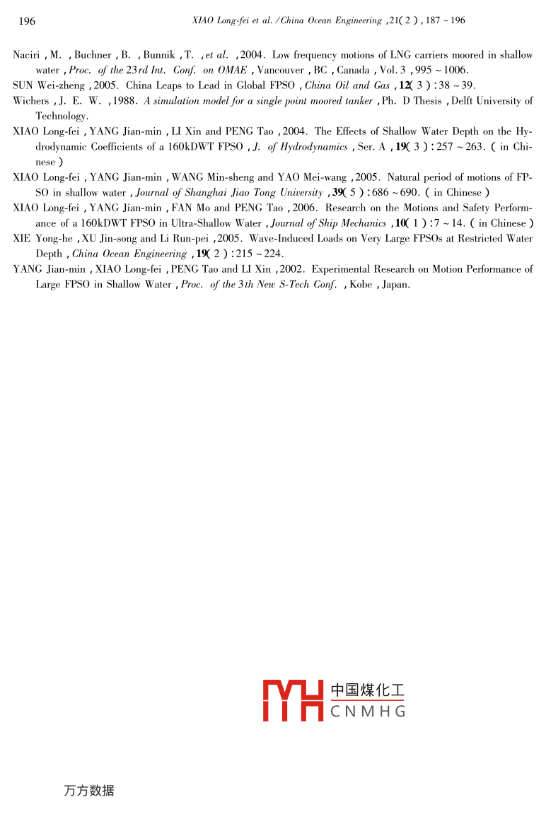 China Ocean Engineering , Vol.21 ,No.2 ,pp. 187 - 196C 2007 China Ocean Press , ISSN 0890-5487Shallow Water Effects on Surge Motion and Load of SoftYoke Moored FPSOXIAO Long-fei( 肖龍飛)' , YANG Jian-min(楊建民)and LI Xin(李欣)State Key Laboratory of Ocean Engineering , Shanghai Jiao Tong University ,Shanghai 200030 ,China( Received 29 May 2006 ; accepted 20 March 2007 )ABSTRACTMuch attention should be paid to a large FPS0 moored permanently in an oil field with water depth of only a-bout 20 m , since shallow water effects on the hydrodynamics may bring about collision and damage. A 160kDWTFPSO with a permanent soft yoke mooring system is investigated with various shallow water depths and focuses arethe low frequency surge motion and mooring load. Computation for the FPSO system is made based on linear 3-Dpotential fluid theory and time-domain numerical simulation method. Corresponding model test is carried out in theocean engineering basin of Shanghai Jiao Tong University. It is shown that , in the surge natural period , low fre-quency surge motion and mooring force increase remarkably with the decrease of water depth. Especially , thesmaller the ratio of water depth and draught is , the quicker the increase is. The shallow water effects should betaken into account carefully for determining the design load of a single point mooring system.Key words : FPSO ishallow water ; surge ; sofi yoke mooring system1. IntroductionFPSO ( Floating Production , Storage and Offloading ) has become a very popular solution inoffshore oil exploitations in China( Sun ,2005 ) ,as in the world ( Dominic ,2003 ). Much atten-tion should be paid to a large FPSO moored permanently by a soft yoke mooring system in oil fieldwith water depth of only about 20 m ,such as in the Bohai Bay of China( Liet al. ,2004 ;Xiao etal. , 2006 ) , since the effects of shallow water on FPSO hydrodynamics may make the hull collidethe seabed and mooring system and then bring about damage.Yang et al.( 2002 ) investigated vertical motions and touching seabed of a 300 kDWT FPSOin shallow water through model test and discovered shallow water effects on large FPSO. Li et al.( 2003 ) reported similar conclusions by numerical simulation. Subsequently , the added mass ,damping , natural period and wave-induced loads of FPSO in various shallow water depths are in-vestigated( Xiaoet al. ,2004 ,2005 ;Xie et a中國煤化工2004 ) dscussed shallo .water effects and provided guidance regardingMHCNMH Gating the low frequencymotions of LNG carriers moored in shallow water.* This work was financially supported by the National High Technology and Development Program of China( Grant No+ 2004AA616180 )1 Corresponding althor. E-mail : xiaolf@ sjtu. edu. cn188XIAO Long-fei et al. /China Ocean Engineering ,21(2 ), 187- 196A 160 kDWT FPSO with a permanent soft yoke mooring system is investigated and the lowfrequency surge motion and mooring force are focused in the present paper. The full loadeddraught of the FPSO is 14.5 m. In order to investigate the shallow water effects on the hydrody-namic performance of FPSO , a number of shallow water depths are considered within a range from16.7 m to43.5 m. Accordingly , the ratio between the water depth and the design draught iswithin a range from 1.15 to3.0. As to the environment condition , only wave condition with H13=4.1 m and T。=8.9 s isconsidered.Computation for the FPSO system is made based on linearly 3-D potential fluid theory andtime-domain numerical simulation method and corresponding model test is carried out in the oceanengineering basin of Shanghai Jiao Tong University in China. The results of surge natural perioddamping , motion and mooring force are given and analyzed in the present paper. Conclusions andsuggestions are also presented , which will be useful for the design of FPSO and single point moor-ing system in shallow water.2. Description of FPSO System and Environments2.1 FPSO VesselThe FPSO is a purpose-built vessel. The maximum storage capacity is 1000000 bbls. Theprincipal particulars are listed in Table 1.Table 1Main particulars of FPSO vesselDesignationSymbolUnitFull loadLength over alln287.4Length between perpendiculars282BreadthB51DepthDm20. 6Mean DraftTnr14.5Displacement199359Centre of gravity above baseKG12.945Centre of gravity forward from midshipLCG4.24Transverse radius of gyration16.53Longitudinal radius of gyrationKyy70.5中國煤化工2.2 Soft Yoke Mooring SystemMHCNMHGThe FPSO is permanently moored by a sont yoke' moorng system , which consists of tower ,yoke , ballast , pendants and support frame. The yoke is designed to interface with the tower andvessel while transmitting mooring forces into the bearing. The particulars and arrangement of themooring另萬數(shù)據(jù)shown in Table 2 and Fig. 1.XIAO Long-fei et al. /China Ocean Engineering ,21(2 ), 187- 196189Table 2Main particulars of the mooring systemDesignation .UnitValueElevation of tower ( bearing above sea surface )n20Length of yoke35Breadth of yoke ( between 2 universal joints )28Length of pendantWeight of yoke structure .MT412Weight of pendant ( each )70Weight of ballast1500390F.P.L_ 1400036000)>5200Fig. 1. Sketch of the soft yoke mooring system.2.3Environment ConditionIn order to investigate the shallow water effects on the hydrodynamic performance of FPSO ,anumber of shallow water depths h are considered , as shown in Table 3.Table 3W ater depthsh( m)16.718.020.0 .24. 029. 043.5h/T.1.151. 241.381.662.003. 00A typical storm in the Bohai Bay of China with significant wave height H/3 of 4. 1 m andpeak wave period T, of 8.9 s is selected as v中國煤化工gular wave spectrum isJONSWAP with a peak parameter γ of3. For t:MHcNMHGisnowindandcurent.3. Basic Theory3.1 Low Frequency Equations of FPSO MotionTo s8R方熬據(jù)roblems of motions and loads of the soft yoke moored FPSO in iregular waves190XIAO Long-fei et al. /China Ocean Engineering ,21(2 ), 187- 196without wind and current , the time domain e