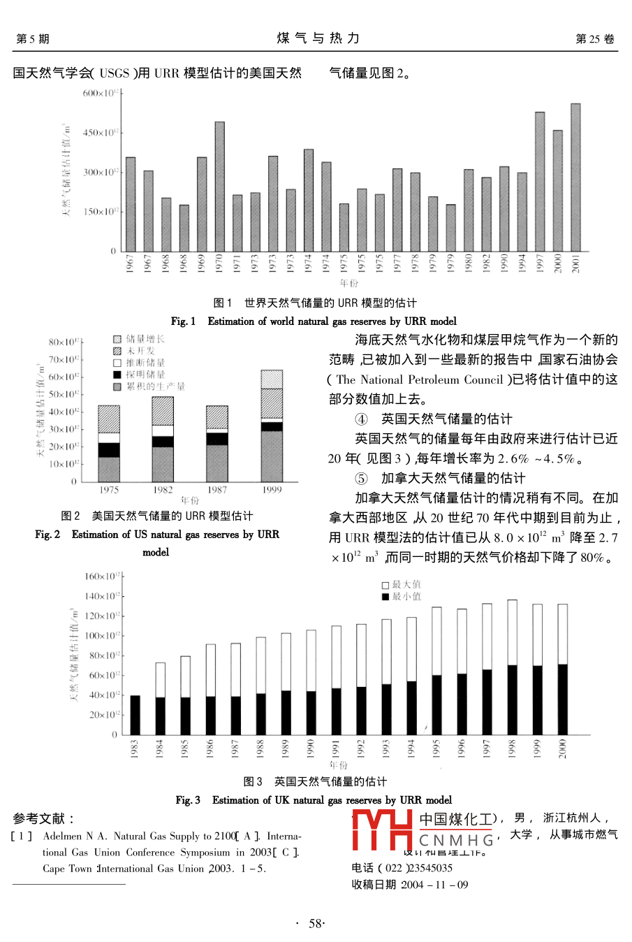 第25卷第5期煤氣與熱力205年5月gas heatMay 2005技術(shù)綜述與講座含”世界天然氣儲量的估計沈余生,張寶金,馬洪敬中國市政工程華北設(shè)計研究院,天津30004)摘要:綜述了天然氣儲量的估計方法和應(yīng)用實例關(guān)鍵詞:天然氣儲量;哈伯特曲線;URR模型中圖分類號:TU996文獻標識碼:B文章編號:1000-44162005)5-0057-02Estimation of natural gas reserve in worldSHEN Yu-sheng, ZHANG Bao-jin, MA Hong-jingNorth China Municipal Engineering Design Research Institute Tianyin 300074, ChinaAbstract: The estimation method of natural gas reserve and the application examples are reviewedKey words: natural gas reserve Hubbert curve URR model1天然氣儲量估計的方法極限可回收資源。目前的URR為靜態(tài)參數(shù)但實際近年來國際上天然氣市場的競爭十分激烈但上UR是動態(tài)的因為有些能源(如石油和天然人們對于世界天然氣資源的充裕程度卻關(guān)心較少,氣)均可以通過某種工藝回收。很少將極限可回收資源簡稱URR入生產(chǎn)和消費聯(lián)①哈伯特的URR模型系在一起普遍認為天然氣資源在最近幾十年內(nèi)是哈伯特的URR模型可確定一個合適的區(qū)域性充裕的。但是當我們考慮未來能源的利用時就會生產(chǎn)曲線,作為資源估計的初步依據(jù)。哈伯特在很自然地想到能源的儲量是否能滿足不斷增長的消1956年的文章中推薦使用這種鐘型曲線并使用鐘耗量。型曲線近似法對美國天然氣產(chǎn)量和儲量進行預(yù)測。URR要求預(yù)測一個大概的生產(chǎn)峰點,一些地理與石油一樣他預(yù)測天然氣的峰值將發(fā)生在1970學研究專家對這種研究方法比較感興趣如哈伯特年。與石油不同的是天然氣的峰值水平較低。事提出了長期生產(chǎn)曲線理論。長期生產(chǎn)項目的運行資實上30年來天然氣的產(chǎn)量并沒有下降源估計并不少見近來這個方法又被應(yīng)用于地球變②世界天然氣儲量的URR模型估計暖和長期能量利用上。實際上這種方法很難滿足圖1是一個35年來的世界天然氣儲量的估計,各方面的要求往往只適用于局部范圍。哈伯特曲天然氣資源儲量估計值似乎隨著估計時間的增加而線法是于1956年由哈伯特提出的而后發(fā)展為劍伯增長這反映了在很多方面還缺少研究或科技發(fā)展爾法和本特羅法這些方法被用來預(yù)測地球長期能還未達到新的預(yù)測水平。圖1中年份相同的數(shù)據(jù),源的使用年限采用N2URR模型11H中國煤化工CNMH GRR模型估計URR是過去的生產(chǎn)量、探明的儲量及在目前的美國利用URR模型來估計天然氣的儲量隨著工藝和價格條件下尚不能開采的量的總和也稱為天然氣工業(yè)的發(fā)展已經(jīng)有了許多實質(zhì)性的進展。美57第5期煤氣與熱力第25卷國天然氣學會(USGS)用URR模型估計的美國天然氣儲量見圖26(0×10目一組二450×10150×10圖1世界天然氣儲量的URR模型的估計Fig. 1 Estimation of world natural gas reserves by URR model80×10"國儲量增長海底天然氣水化物和煤層甲烷氣作為一個新的忍未開發(fā)70×10三口推斷儲量范疇已被加入到一些最新的報告中國家石油協(xié)會■探明儲量口累積的生產(chǎn)量( The national petroleum council)已將估計值中的這部分數(shù)值加上去。④英國天然氣儲量的估計:20×10英國天然氣的儲量每年由政府來進行估計已近10×1020年(見圖3)每年增長率為2.6%~4.5%⑤加拿大天然氣儲量的估計198219871999加拿大天然氣儲量估計的情況稍有不同。在加圖2美國天然氣儲量的URR模型估計拿大西部地區(qū)從20世紀70年代中期到目前為止,Fig 2 Estimation of US natural gas reserves by URR用UR模型法的估計值已從8.0×102m3降至2.702m3而同一時期的天然氣價格卻下降了160×102口最大值■最小值圖3英國天然氣儲量的估計by URR model參考文獻中國煤化工),男,浙江杭州人1] Adelmen N A. Natural Gas Supply to 2100 A ] Interna-CNMHG’大學,從事城市燃氣tional Gas Union Conference Symposium in 2003[ C和昌連⊥TFaCape Town i International Gas Union 2003. 1-5電話(022)23545035收稿日期2004-11