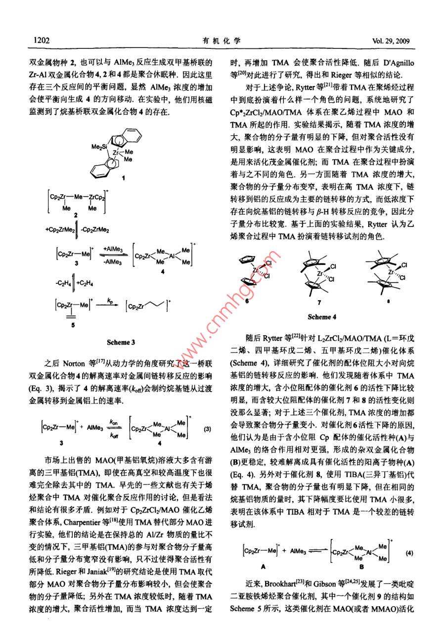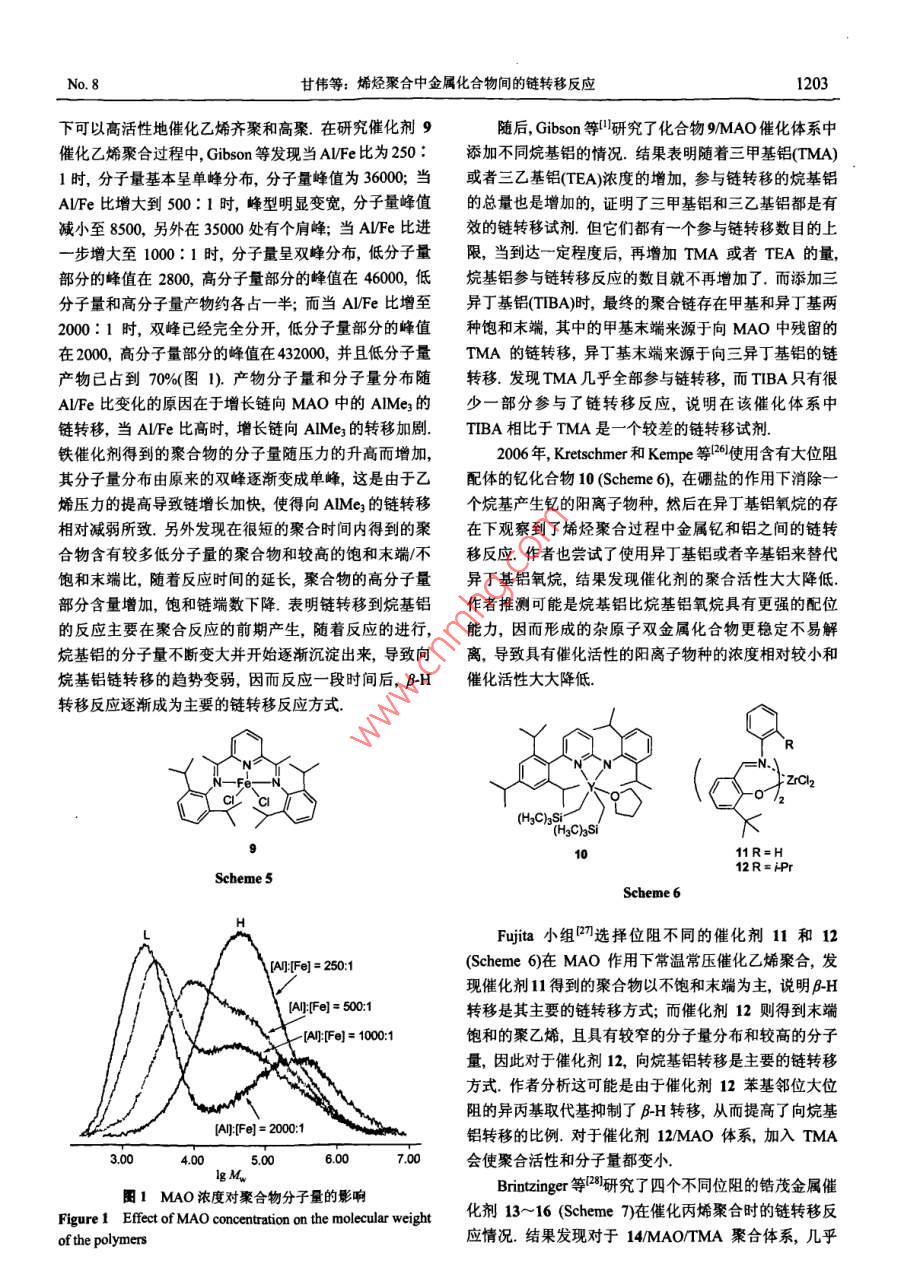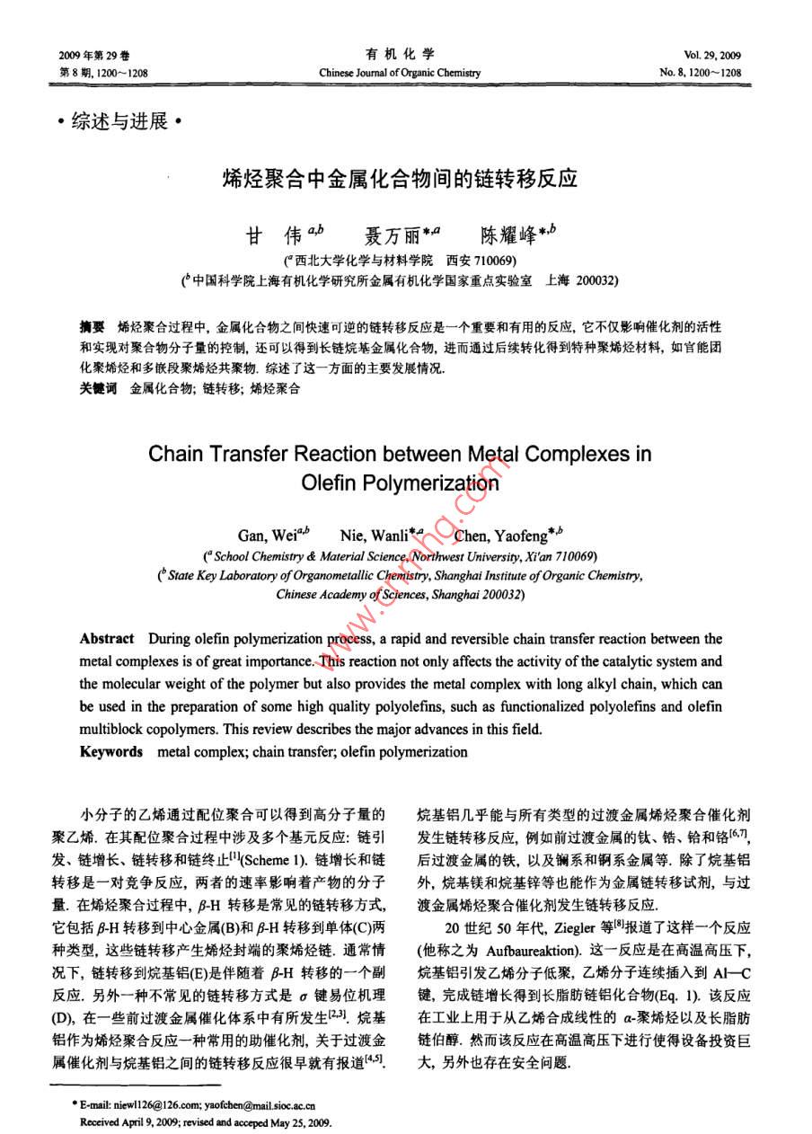 2009年第29卷有機(jī)化學(xué)Vol. 29, 2009第8期, 1200~ 1208Chinese Jounal of Organic CbemistryNo. 8, 1200~ 1208●綜述與進(jìn)展●烯烴聚合中金屬化合物間的鏈轉(zhuǎn)移反應(yīng)甘偉∞b聶萬(wàn)麗*陳耀峰*.b(°西北大學(xué)化學(xué)與材料學(xué)院西安710069)(°中國(guó)科學(xué)院上海有機(jī)化學(xué)研究所金屬有機(jī)化學(xué)國(guó)家重點(diǎn)實(shí)驗(yàn)室上海 200032)情要烯烴聚合過(guò)程中,金屬化合物之間快速可逆的鏈轉(zhuǎn)移反應(yīng)是-一個(gè)重要和有用的反應(yīng),它不僅影響催化劑的活性和實(shí)現(xiàn)對(duì)聚合物分子量的控制,還可以得到長(zhǎng)鏈烷基金屬化合物,進(jìn)而通過(guò)后續(xù)轉(zhuǎn)化得到特種聚烯烴材料,如官能團(tuán)化聚烯烴和多嵌段聚烯烴共聚物.綜述了這一方面的主要發(fā)展情況.關(guān)鍵詞金屬化合物; 鏈轉(zhuǎn)移;烯烴聚合Chain Transfer Reaction between Metal Complexes inOlefin PolymerizationGan, WeigbNie, Wanli*= Chen, Yaofeng*b(° School Chemistry & Material Science, Northwest University, Xi'an 710069)(° State Key Laboratory of Organomelallic Chemistry, Shanghai Istitute of Organic Chemistry,Chinese Academy of Sciences, Shanghai 200032)Abstract During olefin polymerization process, a rapid and reversible chain transfer reaction between themetal complexes is of great importance. This reaction not only affects the activity of the catalytic system andthe molecular weight of the polymer but also provides the metal complex with long alkyl chain, which canbe used in the preparation of some high quality polyolefins, such as functionalized polyolefins and olefinmultiblock copolymers. This review describes the major advances in this field.Keywords metal complex; chain transfer; olefin polymerization小分子的乙烯通過(guò)配位聚合可以得到高分子量的烷基鋁幾乎能與所有類型的過(guò)渡金屬烯烴聚合催化劑聚乙烯.在其配位聚合過(guò)程中涉及多個(gè)基元反應(yīng):鏈引發(fā)生鏈轉(zhuǎn)移反應(yīng),例如前過(guò)渡金屬的鈦、鋯、鉿和鉻167),發(fā)、鏈增長(zhǎng)、鏈轉(zhuǎn)移和鏈終止"(Scheme 1).鏈增長(zhǎng)和鏈后過(guò)渡金屬的鐵,以及鑭系和鋼系金屬等.除了烷基鋁轉(zhuǎn)移是一對(duì)競(jìng)爭(zhēng)反應(yīng),兩者的速率影響著產(chǎn)物的分子外,烷基鎂和烷基鋅等也能作為金屬鏈轉(zhuǎn)移試劑,與過(guò)量.在烯烴聚合過(guò)程中, -H轉(zhuǎn)移是常見(jiàn)的鏈轉(zhuǎn)移方式,渡金屬烯烴聚合催化劑發(fā)生鏈轉(zhuǎn)移反應(yīng).它包括B-H轉(zhuǎn)移到中心金屬(B)和B-H轉(zhuǎn)移到單體(C)兩20世紀(jì)50年代,Ziegler 等8報(bào)道了這樣-一個(gè)反應(yīng)種類型,這些鏈轉(zhuǎn)移產(chǎn)生烯烴封端的聚烯烴鏈.通常情(他稱之為Aufbaureation). 這一反應(yīng)是在高溫高壓下,況下,鏈轉(zhuǎn)移到烷基鋁(E)是伴隨著β-H轉(zhuǎn)移的一個(gè)副烷基鋁引發(fā)乙烯分子低聚,乙烯分子連續(xù)插入到AI- C反應(yīng).另外一種不常見(jiàn)的鏈轉(zhuǎn)移方式是σ鍵易位機(jī)理鍵,完成鏈增長(zhǎng)得到長(zhǎng)脂肪鏈鋁化合物(Eq.1). 該反應(yīng)(D),在一些前過(guò)渡金屬催化體系中有所發(fā)生231.烷基在工業(yè)上用于從乙烯合成線性的a-聚烯烴以及長(zhǎng)脂肪鋁作為烯烴聚合反應(yīng)一種常用的助催化劑,關(guān)于過(guò)渡金鏈伯醇.然而該反應(yīng)在高溫高壓下進(jìn)行使得設(shè)備投資巨屬催化劑與烷基鋁之間的鏈轉(zhuǎn)移反應(yīng)很早就有報(bào)道(4.].大,另外也存在安全問(wèn)題.●E-mail: niewl126@126.com; yaofchen@mailsocac.cnReceived April 9, 2009; revised and aceped May 25, 2009..No. 8甘偉等:烯烴聚合中金屬化合物間的鏈轉(zhuǎn)移反應(yīng)1201Lim 一Ppropagation (A)=BH transfer to metal (B)i一p=_ LMBH transfer to monomer (C)LM.σ-bond metathesis (向)AIR3 ^iMARz。 pchain transfer to alminum(E)RzANScheme 1。AEs+ 3n/ 5.0-30MPathene(1M'-p1+ M2-p2M-p2+ M-p1100 - 200°C :dormantdomant許多過(guò)渡金屬催化劑在常溫常壓下就可以高活性activek。>>kpCatalyzed chain growth地催化乙烯聚合,如果聚合過(guò)程中,有大量金屬鏈轉(zhuǎn)移試劑存在,聚合鏈可以在過(guò)渡金屬催化劑和金屬鏈轉(zhuǎn)移Scheme2試劑之間進(jìn)行非??焖俸涂赡娴慕粨Q,并且鏈轉(zhuǎn)移的速率遠(yuǎn)遠(yuǎn)大于鏈增長(zhǎng)的速率(Scheme 2), 這樣聚合鏈看起Ethyl公司的研究人員在兩項(xiàng)專利1[4.15]中介紹了在催化來(lái)就像是在鏈轉(zhuǎn)移試劑的金屬上增長(zhǎng),可以實(shí)現(xiàn)溫和條烯烴聚合中,第四族的鉿以及錒系的釷和鈾的茂金屬化件下金屬催化的Aufbaureaktion. 這- -反應(yīng)過(guò)程稱為催合物與烷基鋁之間存在有效的鏈轉(zhuǎn)移反應(yīng),而且可以利化鏈增長(zhǎng)(Catalyzed chain growth,簡(jiǎn)稱CCG)"然而在用該反應(yīng)制備長(zhǎng)鏈烷基鋁化合物.他們發(fā)現(xiàn)采用一般的聚合體系中, 鏈增長(zhǎng)的速率要遠(yuǎn)遠(yuǎn)大于鏈轉(zhuǎn)移的[Cp*2ThCHJ][MeB(CF>)3/AlEty (7300 equiv.)/IBAO(異速率,例如在某些茂金屬催化體系中,兩者的速率相差丁基鋁氧烷, 500 equiv,)體系催化乙烯聚合時(shí),可以實(shí)現(xiàn)3~4個(gè)數(shù)量級(jí)149.10,得到高分子量的聚合物.要有效實(shí)鏈轉(zhuǎn)移到鋁上的催化鏈增長(zhǎng)反應(yīng),得到泊松分布的低聚現(xiàn)催化鏈增長(zhǎng),過(guò)渡金屬催化劑和金屬鏈轉(zhuǎn)移試劑之間物(Eq. 2),聚合中沒(méi)有高聚物生成.的聚合鏈交換速率必