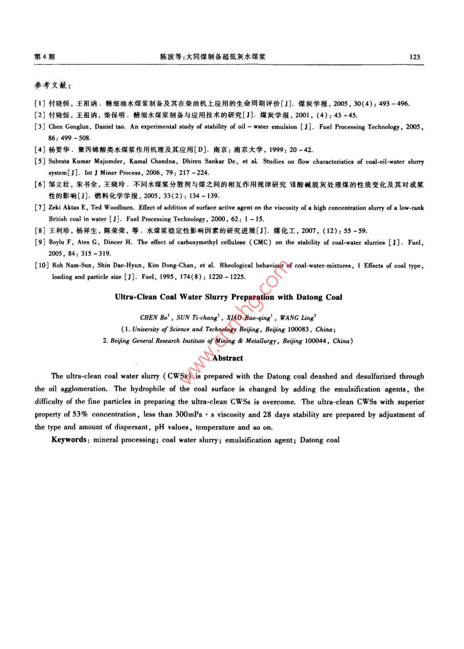 第6|卷第4期有色金屬VoL 61, No 42009年11月Nonferrous MetalsNovember. 2009大同煤制備超低灰水煤漿陳波',孫體昌,肖寶清',王玲2(1.北京科技大學土木與環(huán)境學院,北京100083;2.北京礦冶研究總院,北京100044)摘要:以油團聚脫除灰分的大同煤為原料,制備超低灰水煤漿。加入乳化劑來改變煤表面的親水性,克服了在制備超低灰水煤漿過程中煤的粒度細的困難,通過改變分散劑的種類及用量、調節(jié)pH值、溫度等因素,可以制得濃度達到53%、黏度小于300mPa·s穩(wěn)定性超過28d的超低灰水煤漿。關鍵詞:選礦工程;水煤漿;乳化劑;大同煤中圖分類號:TQ51745文獻標識碼:A文章編號:1001-0211(2009)04-0119-05超低灰水煤漿是常規(guī)水煤漿的延伸,具有像普行了實驗室規(guī)模或工業(yè)示范研究,美國在低速大功通水煤漿一樣的流動性、穩(wěn)定性和可霧化性。其制率柴油機上燃用精細水煤漿,在燃燒與磨損方面取漿煤的粒度特別細(一般小于10μm),灰分特別低得了重要進展。我國精細水煤漿的發(fā)展也很迅速。(一般在1%~2%,對有些煤種可小于1%),濃度中國礦業(yè)大學在精細水煤漿的制備和內燃機燃燒應可達到50%~55%,硫的總量<0.2%,穩(wěn)定性在一用方面進行了長期實驗研究。目前,浙江大學也個月無沉淀,在轉速為100·min"時,黏度小于經建成了精細水煤漿的制備及燃燒中試系統,并進300mPa·s等。由于精細水煤漿的灰分和硫分遠低行了許多理論和實驗研究在水煤漿分散劑、穩(wěn)定劑于普通水煤漿水煤漿粒度細,燃燒速度快效率高,等方面取得較大進展,但是還沒有實現工業(yè)化可以提高燃燒強度,因此精細水煤漿可作為柴油的針對經過油團聚工藝去除灰分的大同煤進行制替代燃料用于中小型燃油鍋爐、中央空調等,并有望漿實驗研究,考查了表面活性劑的種類及用量、pH用于柴油機和燃氣輪機。同時精細水煤漿用于燃用值、溫度等因素與水煤漿黏度的關系,討論了分散劑柴油的柴油機和小型油鍋爐等燃燒與柴油相比具有及乳化劑在煤表面的作用機理。明顯的價格優(yōu)勢,從局部看燃用精細水煤漿的優(yōu)點在于NOx的排放量遠低于柴油其SO2的排放量遠1實驗方法低于燃煤。我國是一個富煤貧油的國家,無論從我(1)試驗煤樣取自山西大同,原煤經過油團聚國的經濟發(fā)展還是能源安全開發(fā)潔凈的煤代油技脫灰后,煤的灰分與硫的含量分別為1.5%與術,把煤炭制成漿體燃料減輕燃燒散煤對環(huán)境污染,0.16%,煤的粒度D90粒度達到8.37μm,用以制備并達到替代柴油的目的。然而,由于超低灰水煤漿的制漿粒度比較細,粒子的表面自由能比較高,因超低灰水煤漿試驗研究。(2)試驗藥劑有乳化劑S-80、TX-10、OP系此在制被超低灰水煤漿存在漿體表觀黏度高濃度列及T-80,分散劑NS、NR,SL及SDBs,pH調整劑低的問題。在20世紀80年代美國為應付石油危機,著手為NaOH和H2SO4。開發(fā)研究精細水煤漿技術。由于當時所制備的精細(3)試驗用儀器有JJ-6攪拌器、馬弗爐等。水煤漿的成本接近于柴油,加上石油價格的下跌,該(4)通過水煤漿的表觀黏度與穩(wěn)定性對水煤漿技術停止了商業(yè)化,作為儲備技術保留。美國、性能進行評價,水煤漿的黏度與穩(wěn)定性測定方法主瑞士、澳大利亞、日本等對內燃機燃用精細水煤漿進要依據GBT18856.2-2002收稿日期:2008-10-082試驗結果及分析作者簡介:陳波(1975-)男,吉林扶余縣人,講師博士,主要從2.1乳化劑類型的選擇事礦物加工、潔凈煤技術等方面的研究選取4種不同的乳化劑(S-80、TX-10、T-8及OP)進行制漿試驗,結果如圖1所示(S-80成漿120有色金屬第6卷效果特別差,在圖中沒有列出)。結果表明,S-80不成漿,TX-10及OP-30成漿。從圖1可以看oP-12出,OP-30乳化劑對水煤漿的降黏效果比TX-10的成漿效果好。這主要是由于OP型表面活性劑的化學成分為烷基苯酚聚氧乙烯醚,OP系列乳化劑的水溶液的表面張力低,潤濕能力強。T-80乳化劑不溶于水,是油溶性的,而TX-10乳化劑是在T一0480乳化劑中表面未酯化的羥基上接入聚氧乙烯基乳化劑的用量席從而溶于水,增加其水溶性。OP、TX-10、T-80親水能力逐漸降低,致使水煤漿的降黏效果逐漸變圖2OP系列乳化劑對水煤漿黏度的影響差Fig 2 Effect of OP emulsifier agent on2.2oP系列乳化劑對大同煤超低灰水煤漿流動WSs viscosity性的影響對不同的OP系列的乳化劑對超低灰水煤漿的-o- NR黏度進行詳細研究,確定最佳的OP系列的乳化劑,不同的OP系列乳化劑對濃度為53%的超低灰水煤X--SDBS漿的黏度影響如圖2所示◆OP30TX-1014L6分散劑的用量鸕圖3分散劑對水煤漿黏度的影響Fig. 3 Effect of dispersants on CWSs viscosity得煤粒表面親水過強、水膜厚度過大或煤內表面吸乳化劑的用量隔附水量過多,引起煤粒的膨脹,使煤粒間的流動水圖1乳化劑的類型對水煤漿黏度的影響同時,當煤的表面達到飽和吸附后,再加分散劑的用Fig 1. Effect of emulsifier type on CWSs viscosity量達不到分散的效果,有可能是發(fā)生多層吸附從而降低分散效果。隨著分散劑用量的增加,在粒子從圖2可以看出,在制漿過程中分別加入OP12,OP-16,OP-17,OP-30時,制得的水煤漿的黏表面形成水化膜降低了粒子之間的吸引力,也就是度逐漸降低,主要是由于乳化劑的HLB值決定的,阻止粒子之間的團聚現象,使其在水溶液中穩(wěn)定存其HLB值分別為13,14,15,17,HLB值越大親水性在,有利于降低顆粒表面的黏度,著名的DLvo越強,使煤粒子能均勻分散到水溶液中,