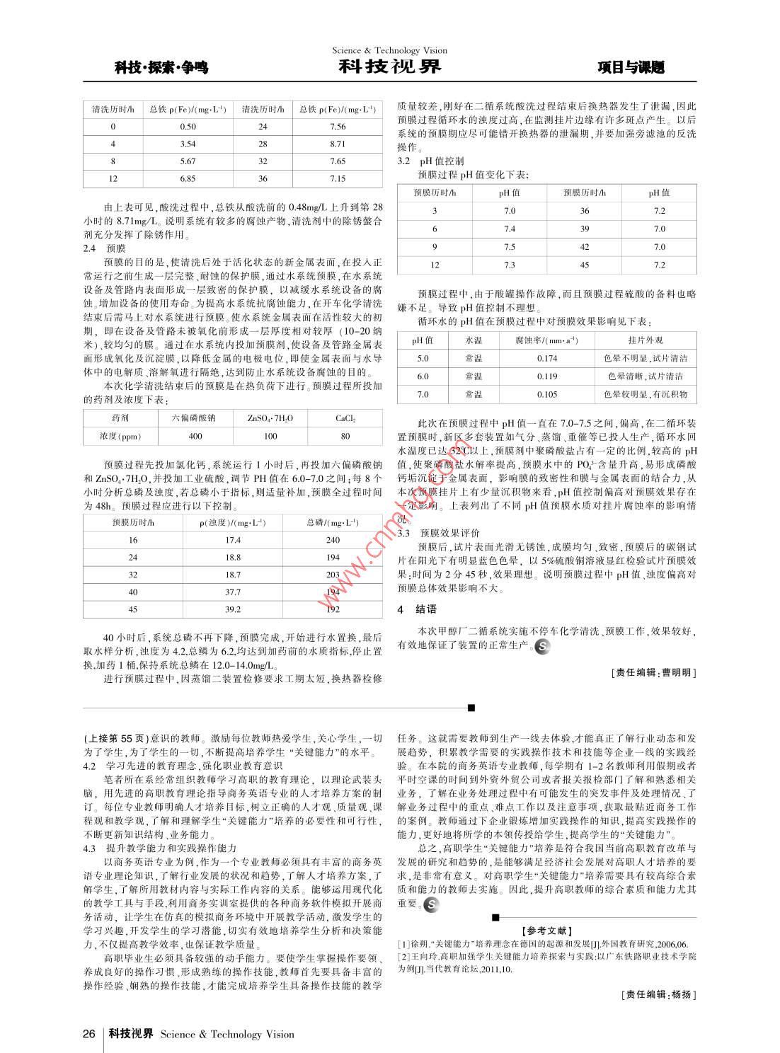 項目與課題科技視界科技*探索爭鳴循環(huán)水系統(tǒng)的不停車清洗、預膜吳立濤1黃維紅2(1.寧夏工商職業(yè)技術學院化工工程系,寧夏銀川750021;2.寧夏寶塔石化設計院,寧夏銀川750001)[摘要]寧夏某能源集團甲醇廠循環(huán)水系統(tǒng)受系統(tǒng)腐蝕、結垢等影響,需進行清洗、預膜,本文針對該系統(tǒng)的實際情況確定了化學清洗、預膜方案,運行結果表明清洗、預膜效果良好。[關鍵詞]循環(huán)冷卻水;清洗;預膜該集團甲醇廠循環(huán)水系統(tǒng)現(xiàn)有兩套裝置,一-循、二循裝置。其中二著 的生物粘泥剝離脫落,由于氯離子對下一步絡合劑清洗影響很大,循裝置擔負向蒸餾、重催、重整、氣體分餾等十兒套新區(qū)裝置提供循環(huán)所以 本次清洗不采用含氯的殺生劑。本方案采用季銨鹽LJ-327殺生冷卻水的任務,系統(tǒng)內(nèi)有水冷器30臺,換熱器材質(zhì)多為碳鋼.極少數(shù)劑 ,其本身是一種陽離子表面活性劑,具有分散性能,所以它除了有殺為不銹鋼。系統(tǒng)設計循環(huán)水量12000m/h, 系統(tǒng)容量6200m'.生作用之外還有對微生物粘泥和污垢具有剝離和分散的作用,使其懸正常生產(chǎn)時,二循系統(tǒng)所采用的水質(zhì)穩(wěn)定劑是“鋅鹽+有機磷"配浮于水中被除去。因二循管網(wǎng)系統(tǒng)換熱器油品泄漏頻繁,清洗時,我們方,pH值范圍為7.0-8.5. 殺菌方案是8常投加液氯;并交替沖擊式投 先投加了適量的除油劑1J-311及消泡劑1J-213.投加量分別為100加氧化性和非氧化性殺生劑。mg/L, 70 mg/L,運行24h,每隔3- -4h測定- -次冷卻水的濁度,當濁度曲線趨于平緩時,系統(tǒng)經(jīng)過水置換后,濁度降至10 mg/L以下,再進行1目前存 在問題粘泥剝離,先投加1J-327,然后投加消泡劑IJ-213,投加量分別為由于裝置換熱器運行時間由原來的1年-一修改為2年一 -修,以100mg/L. 50 mg/L,運行24 h,在清洗過程中,每隔3- 4h測定- -次冷及摻煉含硫高、密度大腐蝕性焦爐氣的比例增大,自2011年1月以卻水的濁度,當濁度曲線趨于平緩時,即可結束清洗.殺生劑清洗后,來,新區(qū)裝置換熱器因腐蝕泄漏的頻次增多,二循系統(tǒng)受裝置的換熱系統(tǒng)經(jīng)過置換后, 濁度降至10 mg/L以下,再進行絡合劑清洗。器泄漏等諸多因索的影響,致使循環(huán)水質(zhì)時好時壞,整個管網(wǎng)系統(tǒng)粘2.3絡合劑清洗泥量較高,腐蝕速率增大,異養(yǎng)菌難以控制。為改善水質(zhì),對二循系統(tǒng)絡合劑清洗就是通過藥劑的整合作用將水垢等溶解,同時對金屬不得不增大排污量,進而造成水穩(wěn)藥劑的流失,導致系統(tǒng)中的緩蝕阻基體 和水泥設施無侵蝕。本方案采用ATMP,六磷酸鈉,HEDP, 1J-322垢劑和殺佳劑的濃度經(jīng)常達不到要求。從1月份開始,二循系統(tǒng)運行(磺酸共聚物) 藥劑按一定比例和濃度在某-特定pH值范圍對系統(tǒng)和監(jiān)測過程中發(fā)現(xiàn)系統(tǒng)狀況較差,水質(zhì)開始惡化。主要表現(xiàn)在:進行絡合清洗.投加量分別為25mg/L, 100ng/L, 50ng/L, 30mg/L,清(1)全年濁度多數(shù)超標最高達120.5mg/L。 (指標為≤20mg/L)洗過程中投加適量濃硫酸(98%)以調(diào)節(jié)酸洗過程的pH在3- 4之間。(2)循環(huán)水中總鐵的質(zhì)量濃度較高,最高達8.08mg/L(指標為≤3有機絡合劑清洗水垢的機理是,當其使用濃度在正常范圍時,起mg/L阻垢作用,在高濃度情況下,可溶解一- 部分水垢。由于系統(tǒng)在清洗之前(3)二循系統(tǒng)異 養(yǎng)菌經(jīng)常超標.最高達10.2x10 個/mL(指標為≤一 直投加阻垢劑,因而形成的水垢少且較軟,經(jīng)殺生劑清洗后,剩下的5x 10*個/mL)(4)監(jiān)測腐蝕掛片有較明顯的腐蝕傾向,掛片腐蝕速率最高達PH值變化:酸洗過程歷時36h,pH值控制為3-4,以利于化學清0.50mm/a(指標為≤0.125mm/a)。洗劑充分發(fā)揮作用。硫酸的投加視pH值情況調(diào)節(jié)。酸洗pH值控制效(5) 系統(tǒng)中存在大量的生物粘泥,6月份平均值高達70.6mL/mt 果下表,酸洗后,對系統(tǒng)進行置換.濁度降至10mg/L以下,pH值升至(指標為≤4mL/ml)7.0以上二循管網(wǎng)系統(tǒng)換熱器污垢組分分析下表:清洗歷時/兒pH清洗歷時小.pH值析5.624.3目(S5O0 (950資物w(FeO) (A.O3| (Zn0) |(Cao)(MgO)| PO3平均30.12| 1.69 3.64 56.121.32 3.563.45.0最大| 85.16 5.14| 7.15| 74.23 | 13.12| 12.56 3.53 5.11| 5.6最小9.24| 0.88 0.14 4.65| 2.34| 0.44 0.10 0.23 | 0.124注:垢樣外現(xiàn)為棕色2012年5月份,我們利用裝置大修時機,對二循管網(wǎng)系統(tǒng)采用不濁度變化:酸洗過程濁度變化下表:停車化學清洗預膜方案,不停車清洗就是利用系統(tǒng)的循環(huán)水泵作為清洗歷時/hp(獨度)(mg+L)清 洗歷時/hp(獨度/(mg.1)清洗循環(huán)泵,利用循環(huán)水池作為配液槽,將各種藥劑加人水池,由循環(huán)6.52:37.2.2水泵將清洗藥劑送到水系統(tǒng)各處進行不停車化學清洗。45.2.22清洗方案7.9370.3根據(jù)目前系統(tǒng)情況.為了進一步降低清洗費用,本系統(tǒng)清洗過程1.5采用以下步驟16.8系統(tǒng)置換-殺生劑清洗(粘泥剝離)-絡合劑清洗-預膜由于目前系統(tǒng)的循環(huán)水質(zhì)很差,所以必須置換掉,在置換的同時由上表可見,8h后,酸洗明顯開始發(fā)揮作用,池水濁度從第8小時的7.9mg/L上升到第36小時的70.3mg/L。說明系統(tǒng)較“臟”,粘附還可以將系統(tǒng)中沉積的含油泥沙和碎片排出一部分。在系統(tǒng)中的大量粘泥腐蝕產(chǎn)物被剝離、清洗效果明顯。2.2殺生