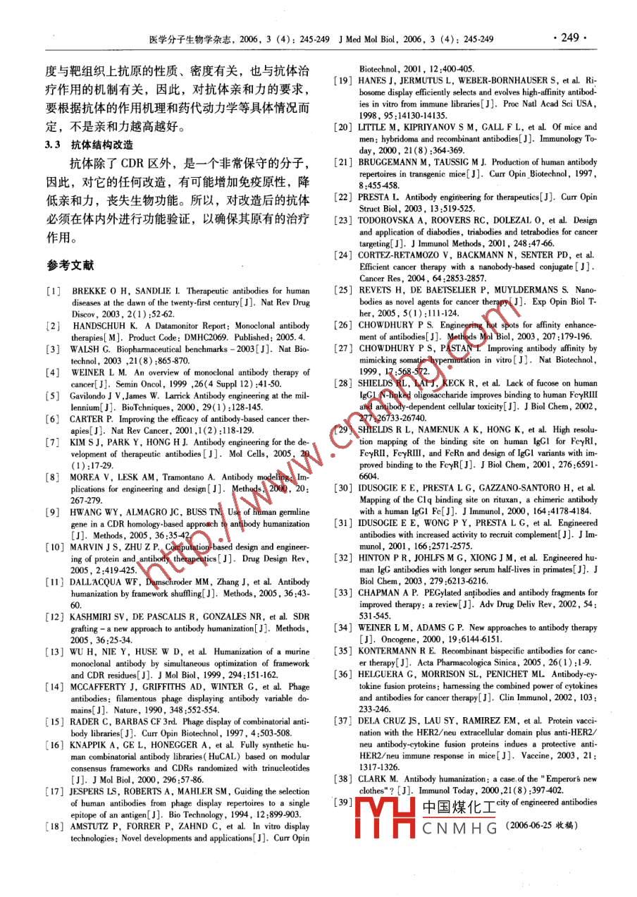 學(xué)分子生物學(xué)雜志,2006,3(4):245249 J Med Mol Biol,2006,3(4):245-249院士述評治療性抗體的改造沈倍奮軍事醫(yī)學(xué)科學(xué)院基礎(chǔ)醫(yī)學(xué)研究所北京市,100850沈倍奮,中國工程院院士,軍事醫(yī)學(xué)科學(xué)院基礎(chǔ)醫(yī)學(xué)研究所研究員,博士生導(dǎo)師。中國人民解放軍分子免疫學(xué)重點實驗室主任?,F(xiàn)任中華醫(yī)學(xué)會副會長,中國發(fā)明家學(xué)會副理事長。從事單克隆抗體和基因工程抗體的研究和應(yīng)用多年,近年來與不同學(xué)科的專家合作致力于基于抗原一抗體相互作用的立體結(jié)構(gòu)信息設(shè)計新功能分子的研究。在國內(nèi)外學(xué)術(shù)期刊上發(fā)表論文200余篇,主編專著4部。【摘要】市場上已有18個被FDA批準(zhǔn)的單克隆抗體,它們用于治療如腫瘤、移植排斥、自身免疫病、病毒感染等人類疾病。治療性抗體代表了生物制藥業(yè)發(fā)展最快的領(lǐng)域之一。隨著技術(shù)的發(fā)展,各種形式的工程抗體被構(gòu)建來改善它們的特性和效能,包括:鼠抗體人源化,提高生物學(xué)活性,如親和力成熟,改進(jìn)效應(yīng)功能,改善藥代動力學(xué)。文章評述了這一領(lǐng)域的最新進(jìn)展,同時也討論了工程抗體的免疫原性和親和力【關(guān)鍵詞】單克隆抗體;治療性抗體;基因工程抗體;抗體人源化【中圖分類號】R392.116Improvement of Therapeutic AntibodiesInstitute of Basic Medical Sciences, Academy of Military Medical Sciences, Beijing, 100850,ChinaAbstract] In the market, there are eighteen monoclonal antibodies approved by the FDA. Theyhave been used to treat human disease, such as cancer, transplant rejection, autoimmudisease..&tiviral prophylaxis and so on. The therapeutic antibodies represent one of the fastest growing areas ofthe biopharmaceutical industry. With the technology development, a diversity of engineered antibodyforms have been created to improve their characterization and efficacy, including humanization ofmurine antibodies, enhancing their biological activities such as affinity maturation, improvement ofeffector functions, and altering pharmacokinetics. This review summarized recent developments inthis field, also discussed the immunogenicity and affinity of engineered antibodiesKey words] monoclonal antibody; therapeutic antibody; engineered antibody; humanized anti-bod治療性抗體是可以用來治療疾病的抗體,因此中最重要的一大類,也是世界生物工程制藥業(yè)的支也稱它們?yōu)榭贵w藥物。截至2005年5月,美國柱產(chǎn)品之一。FDA已經(jīng)批準(zhǔn)18個抗體藥物,主要用于治療腫抗體作為治療性藥物已有上百年的歷史。當(dāng)時瘤、自身免疫性疾病、病毒感染和器官移植時的排主要用抗血清進(jìn)行治療,由于其成分太復(fù)雜、多斥反應(yīng)等。同時有100多種治療性抗體正在進(jìn)行變,而且是異源蛋白,在治療時會出現(xiàn)嚴(yán)重副作臨床試驗,500多種抗體處于臨床前研究。2003~用中國煤化工世,它是一種均一2004年抗體藥物銷售增長48.1%,突破100億美性好CNMHG抗原決定簇的抗元。在以后幾年里,抗體藥物可能以更快的速度增體。1982年,Lewy制備了針對一個B淋巴瘤患者長,預(yù)計到2010年可達(dá)到300億美元2。從抗體瘤細(xì)胞的抗獨特型單克隆抗體,對該患者的治療取藥物的發(fā)展速度來看,目前它已成為生物技術(shù)藥物得很好的療效。這一結(jié)果引起了人們對單抗用于治沈倍奮.治療性抗體的改造療產(chǎn)生了極大熱情和期望,單抗被稱之為“魔維結(jié)構(gòu)確定抗體高變區(qū)中與抗原結(jié)合的關(guān)鍵氨基彈”。但事實并非如此,以后試用的一些抗腫瘤單酸,然后將這些決定特異性的關(guān)鍵氨基酸移植到相抗并沒有達(dá)到預(yù)期的效果。1986年,美國FDA批匹配的人抗體相應(yīng)位置上。另一種常用的人源化方準(zhǔn)抗CD3單抗OKT3用于抗移植排斥反應(yīng);1995法是表面重塑技術(shù),即鼠抗體框架區(qū)表面氨基酸的年,歐洲上市17-1A鼠單抗治療大腸癌。這些單抗“人源化”,通過鼠和人抗體可變區(qū)立體構(gòu)象疊的臨床應(yīng)用顯示出兩個方面的主要問題:鼠抗體雖合比對,尋找合適的人抗體模板,將鼠Fv段表面然對靶抗原是非常特異的,但它不能激活相應(yīng)的人暴露的框架區(qū)殘基中與人Fv不同者改為人源的氨的效應(yīng)系統(tǒng),如抗體依賴性細(xì)胞介導(dǎo)的細(xì)胞毒作用基酸,達(dá)到Fv的表面殘基人源化,使免疫原性降(ADCC)、補體依賴的細(xì)胞毒作用(CDC)等;此低,由于不影響Fv的整體空間構(gòu)象,所以仍保留外,鼠抗體作為外源蛋白進(jìn)入人體,會使人體免疫與抗原的結(jié)合能力。系統(tǒng)產(chǎn)生應(yīng)答,即產(chǎn)生人抗鼠抗體( human anti20世紀(jì)90年代,抗體庫技術(shù)的出現(xiàn)為抗體人mouse antibody,HAMA),而且異源蛋白在人體內(nèi)源化和人源抗體的制備開辟了新途徑41。該技很快被清除,即半壽期很短4。因此,人們利用術(shù)將PCR擴增、抗體片段在大腸桿菌中功能性表重組DNA技術(shù)來解決上述問題561。達(dá)和噬菌體展示技術(shù)結(jié)合起來,在體外模擬體內(nèi)的抗體生成過程。具體是利用PCR方法將B細(xì)胞中1抗體人源化改造所有抗體基因釣出來,克隆到載體上,使之表達(dá)于最早出現(xiàn)的人源化抗體是人-鼠嵌合抗體,將噬菌體表面,構(gòu)建成噬菌體抗體庫,然后用抗原篩鼠抗體可變區(qū)基因片段