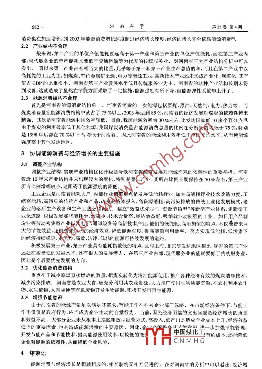 第25卷第4期河南科學Vol.25 No.42007年8月HENAN SCIENCEAug. 2007文章編號: 1004- 3918(2007)04- -0680- 04河南省能源消費與經(jīng)濟增長的關(guān)系分析沈娟,馬建華, 馮文峰(河南大學資源與環(huán)境研究所,河南開封475001)摘要:在對河南省能源消費、經(jīng)濟增長及其相互關(guān)系分析的基礎(chǔ)上,得出近10年來河南省經(jīng)濟增長的同時能源消費持續(xù)增長,能源彈性系數(shù)呈現(xiàn)不穩(wěn)定變化,能源強度持續(xù)下降的結(jié)論。從經(jīng)濟政策以及產(chǎn)業(yè)結(jié)構(gòu)和能源消費結(jié)構(gòu)3個方面分析了各項指標變化的原因,并對如何協(xié)調(diào)能源消費與經(jīng)濟增長的關(guān)系提出了幾點建議.關(guān)鍵詞:河南省;能源消費; 經(jīng)濟增長中圖分類號: F 206文獻標識碼: A .能源的稀缺性和不可再生性使得能源與經(jīng)濟增長的關(guān)系受到社會各界的普遍重視,然而大多數(shù)研究都是以全國或經(jīng)濟發(fā)達的省市為研究對象09.河南省是我國的農(nóng)業(yè)大省,能源消費總量,- -直位于全國各省(市、區(qū))的前列間,因此協(xié)調(diào)好河南省的能源與經(jīng)濟增長的關(guān)系對我國優(yōu)化能源消費有重要意義。本文以近年的統(tǒng)計資料對河南省的能源消費與經(jīng)濟增長問題進行探討,為有關(guān)部門的決策提供依據(jù).1能源與經(jīng)濟關(guān) 系的分析1.1能源消費情況河南省近10年來能源消費總量持續(xù)增長,表1 河南省1995- 2003年能源消費情況2003年達9 526x10* t標準煤,相對2002年增Tab.1 Energy consumption of Henan province among 1995 to 2003長10.73 %, 1995-2003年按最小平方誤差標準年份1995 1996 1997 1998 1999 2000 2001 2002 2003估計的平均增長率達4.3 %".能源消費結(jié)構(gòu)以能源消費增長率/%-2.80.9 7.9 1.9 6.7 4.7 4.4 10.7煤炭為主,2003年煤炭消費量達8157.3x10*t煤炭消費占總消費88.0 88.0 85.0 80.0 80.0 79.0 81.0 86.0 85.0標準煤,統(tǒng)計期內(nèi)全部年份的煤炭消費占有率的百分比1%都在75 %以上,最高達到88 %.從全國范圍來能源消費占全國4.9 4.8 4.9 5.5 5.7 6.0 6.1 5.8 5.6百分比/%看,河南省的能源消費長期以來都占有相當?shù)淖?數(shù)據(jù)來源于中國能源統(tǒng)計年鑒.比例,2001年河南能源消費占全國能源消費的6.1 %,其他年份也都在4.5 %以上(表1).表2河南省經(jīng)濟增長情況1.2經(jīng)濟增長情況分析Tab.2 Economic growth of Henan province among 1995 to 2003河南省近10年來經(jīng)濟保持著快速、平穩(wěn)的增長速度,特別是2000年以來經(jīng)濟增長速度一CDP增長率/% - 13.9 10.5 8.7 8.0 9.4 9.1 9.5 10.5直保持在9%以上,2003 年的CDP總值達第一產(chǎn)業(yè)占25.4 25.6 24.7 24.6 24.5 22.6 21.9 20.9 17.67 025.93億元,相對2002年增長10.5 %; 1995-CDP的比例1%2003年間按最小平方誤差標準估計的多年平均第二產(chǎn)業(yè)占增長速度達10.0%.從產(chǎn)業(yè)結(jié)構(gòu)來看,三大產(chǎn)GDP的比例%473 47.0 47.1 46.2 45.3 47.0 47.1 47.8 50.4業(yè)的產(chǎn)值都保持著持續(xù)增長的態(tài)勢,但在總產(chǎn)第三產(chǎn)業(yè)占.27.327.4 28.2 29.2 30.2 30.4 31.0 31.3 32.0值中所占的比例有不同的變化趨勢:第- -產(chǎn)業(yè)產(chǎn)注:數(shù)據(jù)來源于河南統(tǒng)計年簽圈值所占的比例從1995年的25.4 %下降到2003年的17.6%;第二產(chǎn)業(yè)占的比例基本保持不變且一直在45%以上;第三產(chǎn)業(yè)所占的比例有所上升,從1995年的27.3 %上升到2003年的32.0%(表2).中國煤化工收稿日期: 2007-03-19YHCNMHG基金項目:河南大學資源與環(huán)境研究所資助項目(HDZH062)作者簡介:沈娟(1984-), 女江西萍鄉(xiāng)人,碩士研究生,研究方向為環(huán)境規(guī)劃與管理.2007年8月沈娟等:河南省能源消費與經(jīng)濟增長的關(guān)系分析- 6811.3能源消費 與經(jīng)濟增長的關(guān)系除2003年外,在統(tǒng)計期內(nèi)河南省能源消費增長速度均低于同期經(jīng)濟增長速度,能源消費彈性系數(shù)均小于1,平均能源消費彈性系數(shù)只有0.5, 但從總體上看呈不穩(wěn)定變化趨勢。從1997年到1998年能源消費彈性系數(shù)從0.1猛增到0.9, 1999年下降至0.2,2003年上升到1(表3).這表明,經(jīng)濟增長對能源消費的依賴程度變化較大,盡管總體上經(jīng)濟的快速增長是由相對較低的能源消費支持的,但能源消費增長對經(jīng)濟增長率的貢獻有逐步增強的趨勢.表3河南省1995. -2003年能源消費與經(jīng)濟增長的關(guān)系Relationship of enegy consumption and economic growth of Henan province among 1995 to 2003年份19961997199819992000200120022003GDP增長率1%13.9 10.58.79.40.19.510.5能源消費增長率1%2.8.97.91.:6.7.7.410.7能源強度(噸標準煤數(shù)/萬元)2.(1.81.1.5.5能源消費彈性系數(shù)0.2).10.90.0.7).5經(jīng)濟增長率與能源消費之間通常存在以下關(guān)系式:a,=x°"+ax。) ,a,"=B。式中:an為經(jīng)濟增長率,a,)為依靠節(jié)能所取得的經(jīng)擠增長率,x為依靠增加能源消費所取得的經(jīng)濟增長率,β,為能源消費增長率.因此,利用1996--2003年的能源消費數(shù)據(jù),可以算出相應(yīng)年份依靠節(jié)能取得的經(jīng)濟增長率(表4).表4河南省 1996-2003年經(jīng)濟增長率Tab.4 Economic growth rate of Henan province among 1995 to 2003E份a.1%13.98.8.09.1a(2) /% ..80.857.941.886.724.6710.73"/% .11.19.66.14.4_5.由表4可知,1996--2003年節(jié)能對經(jīng)濟增長的多年平均貢獻率為50%,即從多年平均來看,依靠節(jié)能和依靠增加能源消費