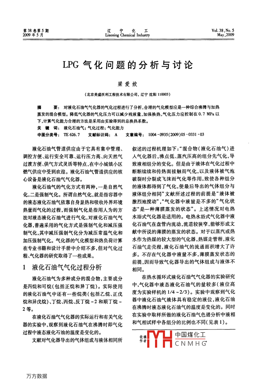 第38卷第5期遼寧化工Vol 38. No 5200年5月Liaoning Chemical IndustryMay,2009IPG氣化問題的分析與討論梁愛姣(北京美盛沃利工程技術(shù)有限公司,遼寧沈陽110003)要:對液化石油氣氣化器的氣化過程進行了分析,合理的氣化模型應(yīng)是一種綜合沸騰與加熱蒸發(fā)的混合模型。降低氣化器的氣化壓力可以減少殘液量,加強換熱,氣化壓力應(yīng)控制在0.7MPa以下,計算氣化能力合理的方法是采用由實驗得到的總換熱系數(shù)關(guān)鍵詞:液化石油氣;氣化過程;氣化能力中圖分類號:T626.7文獻標(biāo)識碼:A文章編號:1004-0935(2009)05-031-03液化石油氣管道供應(yīng)由于它具有集中管理、敘述的過程機理如下:“混合物(液化石油氣)進調(diào)控方便、運行安全可靠運行壓力高向天然氣入氣化器后,沸點低、蒸汽壓高的組分先氣化,導(dǎo)過渡方便供氣方式靈活等特點在中小城鎮(zhèn)小區(qū)致液相組分的變化。但是由于液體在氣化過程中燃氣供應(yīng)中受到歡迎。液化石油氣管道供應(yīng)的核斷斷續(xù)續(xù)和傳熱面接觸而氣化以及液體被氣泡心設(shè)備是液化石油氣氣化器破裂時分裂成飛沫而氣化等作用,致使各種組分液化石油氣的氣化方式有兩種,一是自然氣的液體都得到了氣化使最后導(dǎo)出的氣體組分與化,二是強制氣化。所謂自然氣化,就是指容器中液體組分相同”文獻所述過程的前提是“液體被的液態(tài)液化石油氣依靠自身顯熱和吸收外界環(huán)境激烈地攪動”,“氣化器中液量是不多的”氣化狀熱量而氣化的過程,而強制氣化是指用人為的方態(tài)“是一種薄膜蒸發(fā)的狀態(tài)”。上述情況對電熱法對液態(tài)液化石油氣進行氣化對液化石油氣氣水浴式氣化器是適用的。電熱水浴式氣化器中液化器,普遍采用的氣化方式是強制氣化和減壓強化石油氣在盤管內(nèi)流動流道較狹窄,能夠形成文制氣化,其中減壓強制氣化分為減壓常溫氣化和獻中所說的薄膜的蒸發(fā)的狀態(tài)。對于以蒸汽或熱加壓強制氣化。氣化器的氣化模型和熱負荷計算水作為熱媒的較大型的氣化器熱媒走管程,液化在專業(yè)書籍和設(shè)計手冊中介紹不多,但對氣化過石油氣走殼程液化石油氣的流通面積增大了許程、氣化器的研究取得了一些成果。多。不存在氣化器中液量不多,薄膜蒸發(fā)狀態(tài)的前提,因而導(dǎo)致氣化器導(dǎo)出的氣體組成與液體不1液化石油氣氣化過程分析相同。液化石油氣為多種成分的混合物,主要成分在熱水循環(huán)式液化石油氣氣化器的實驗研究是丙烷和可烷(包括正烷和異丁烷)。實際使用中,氣化器中液態(tài)液化石油氣的量較多(液位高的液化石油氣中還有一些烷類(包括乙烷、正戊度為實驗樣機的1/4~2/3)。實驗中觀察到氣化烷和異戊烷)、丁烷、丙烷、反丁烷-2和順丁烷器中液化石油氣液體具有穩(wěn)定的液位,液化石油2等在沸騰時液態(tài)液化石油氣的溫度是變化的。同時在液化石油氣氣化器的實際運行和有關(guān)氣化在實驗中取樣所做的液化石油氣色譜分析中液相器的實驗中,觀察到液化石油氣在沸騰時即氣化和氣相試樣中各組分的比例也不同(見表1)。過程中液態(tài)液化石油的溫度是變化的。中國煤化工文獻對氣化器導(dǎo)出的氣體組成與液體相同所收稿CNMHG332遼寧化工00年5月表1液化石油氣中各組分的摩爾分數(shù),%因可以溯到第2種組分對氣泡成長速度的影響。試樣乙烷丙烷丙烯異丁烷正丁烷三元和3種以上組分的混合物的情況與二元組分液相試樣2.2133.70.1717.0428.81混合物類似。相試樣19.1955.920.3710.3111.55對于氣化器所涉及的部分組分仍處于加熱蒸試樣正異丁烯反丁烯-2順丁烯-2異戊烷正戊烷發(fā)狀態(tài)的氣化過程,各組分所占比例,尤其液體溫液相試樣0.210.120.0712.605.06度高的比例是影響氣化過程的重要因素。氣相試樣00.03各組分氣化難易程度可用相同氣化壓力下3總換熱系數(shù)的確定組分的沸點高低不衡量,不同壓力下的沸點(見實際設(shè)備和設(shè)計是重要的是確定設(shè)備的氣化表2)能力。氣化能力的計算必然涉及傳熱過程的總傳表2不同壓力下的沸點℃熱系數(shù)。傳熱過程包括熱煤(熱水或蒸汽)與換氣化壓力/MPa乙烷丙烷異丁烷正丁烷正戊烷正丁烯熱管內(nèi)壁面的對流換熱、金屬管壁的導(dǎo)熱和液化-3818749113石油氣與換熱外壁面的對流換熱(有相變)3部58分。前兩項均可較為準(zhǔn)確地計算,第三項由于液態(tài)液化石油氣是多元組分混合物,而混合物的沸由表1和表2可看出,沸點低的組分容易氣騰換熱很復(fù)雜,因而熱系數(shù)的計算公式但其中均化,在氣相中比例大于液相中的比例;沸點高的組含有與特定二元物質(zhì)組合有關(guān)的實驗系數(shù)。對于分不易氣化,在氣相中的比例低于液相中的比例。氣化器研究所涉及的含有多組分,且部分組分尚實驗中氣化器中液化石油氣液體的溫度為未達到沸騰的混合物,不太可能得到適合的換熱40~60℃,氣化壓力在0.83MPa左右。各組分系數(shù)計算公式。因此實際設(shè)備的設(shè)計中合理而且的沸點隨氣化壓力的降低而降低。在較低的氣化實用的方法是采用具體實驗取得的總傳熱系數(shù)的強度條件下,在液化石油氣走殼程的氣化器中同近似值來進行熱工計算。自然氣化一樣存在重組分不斷積累的過程。國內(nèi)已有研究者對電熱水浴式氣化