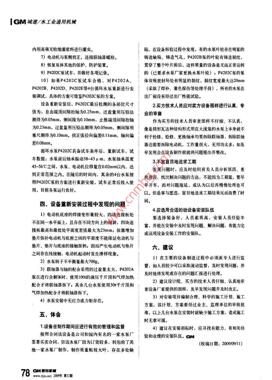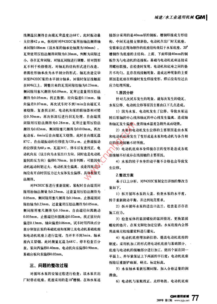 lGM城建/水工業(yè)通用機械循環(huán)水泵的安裝調(diào)試與改造總結(jié)東方希望集團重慶萬盛煤化有限責(zé)任公司(400805)白云升【摘要】5臺1300m°/角h的循環(huán)水泵安裝完畢后,試車多次發(fā)生燒瓦現(xiàn)象,經(jīng)過多次調(diào)試仍存在很多的問題,通過分析原因?qū)π略O(shè)備進行改造和重新安裝達到正常運轉(zhuǎn)【關(guān)鍵詞】循環(huán)水泵安裝調(diào)試改造、前言循環(huán)水系統(tǒng)水泵進入調(diào)試階段,水泵是單級雙吸離心泵,滑動軸承采用筒形結(jié)構(gòu),在筒形瓦上部開有兩個甩油槽,依靠甩油形式進行自潤滑,聯(lián)軸器采用的是帶沉孔接中間軸型膜片聯(lián)軸器,電動機和水泵安裝在兩個底座上。其詳細參數(shù)見下表。水泵調(diào)試過程中多次發(fā)生燒瓦現(xiàn)象,導(dǎo)致設(shè)備及后工序均不能正常進行調(diào)試。經(jīng)過近一個月十幾次的反復(fù)調(diào)整均不能消除燒瓦現(xiàn)象二、水泵試車過程5臺1300mh循環(huán)水泵開始進行單體試車,陸續(xù)出現(xiàn)泵軸承溫度偏高,溫升較快(最快溫升達毎分鐘40℃),最終造成軸瓦偏磨、燒結(jié)等情況。其中P4202E、P4202D兩臺泵在進行單體試車時,起動不到I0min軸瓦就被燒壞,P4202C泵開起后3min軸承箱開始冒煙,使用紅外電動機和水泵技術(shù)參數(shù)表位號流愛揚程必需汽蝕余軸功率名稱型號/(mh) /m/(r/min)電動機參數(shù)kw電源:I0000V50Hz3P離心泵|Ks1300P4202AB功率:2240kW13000C/D/E絕緣等級:F防護等級:P54;轉(zhuǎn)速:590/min765M題用即www.lyx.net200年第12廟城建/水工業(yè)通用機械GM線測溫儀測得自由端瓦背溫度達68℃,此時振動最接部分采用的是40mm厚的鋼板,槽鋼燁接成方形結(jié)大位移42μm。拆檢時對P4202C泵用抬軸法測得軸構(gòu),中間無連接攴撐斜肋。電動機在出廠時無底座承間隙0.08mm(該水泵的軸承處軸頸為l60mm)安裝單位在現(xiàn)場制作的底座結(jié)構(gòu)類似于水泵底座,20瓦背使用壓鉛法測得間隙為0.20mm。判斷為間隙過槽鋼作為底座的主結(jié)構(gòu),上面、下面焊接40mm的鋼小,存在瓦背間隙,對軸瓦間隙進行調(diào)整,針對筒形板作為與電動機的連接板;基礎(chǔ)與電動機底座連接采瓦不利于檢修情況,對軸瓦的結(jié)構(gòu)形式進行改造,用螺栓聯(lián)接。在檢查時發(fā)現(xiàn),電動機和底座之間的墊將圓柱形軸承改為水平剖分的形式,軸瓦改造完畢片不均勻,且存在線接觸現(xiàn)象,造成這種現(xiàn)象的主要回裝P420C泵的水平剖分軸承,回裝時保證接觸面原因是底座在焊接時發(fā)生焊接變形,焊后沒有經(jīng)過去在80%以上,調(diào)整出來的瓦頂間隙抬軸為0.23mm,應(yīng)力處理所致側(cè)間隙用塞尺測得為009mm,瓦背過盈量用壓鉛法1.原因分析測得為0.05mm;找正數(shù)據(jù):徑向偏差0.llmm,軸針對幾次試車發(fā)生的現(xiàn)象,就每次發(fā)生的燒瓦向偏差0.07mm。再次試車時不到lmin自由端瓦又水泵位移、電動機位移等原因主要由以下幾點造成。被燒毀,復(fù)查找正時,電動機和泵的聯(lián)軸器相對錯1)因為水泵、電動機發(fā)生了位移,導(dǎo)致水泵運位0.50mm;再次拆卸后進行刮瓦處理,自由端頂轉(zhuǎn)后泵軸的中心線和軸瓦的中心線發(fā)生偏離,造成軸間隙用壓鉛法測得為0.28mm,瓦背過盈用壓鉛法和軸瓦發(fā)生偏磨,使得軸承溫度急劇升高而燒毀測得為0.02mm,側(cè)間隙塞尺測得為0.010mm。再次2)水泵和電動機發(fā)生位移的主要原因是由水泵起動泵,6min后自由端瓦又燒毀,此時自由端瓦溫和電動機底座發(fā)生了變形或是水泵和電動機與各自相87℃,自由端振動的位移值為120μm,止推端振動應(yīng)的底座接觸不好所致的位移值為60μm,瓦溫34℃,停車后復(fù)查找正,電3)電動機底座本身焊接存在的變形是造成各底動機向東(該方向為水泵出口方向,同時也是電動機座接觸不好或存在線接觸的主要原因旋轉(zhuǎn)的反方向)偏移0.70mm,初步判斷:可能因電4)水泵的轉(zhuǎn)子本身的動平衡不合格也會導(dǎo)致發(fā)動機起動轉(zhuǎn)矩過大,電動機發(fā)生偏離,或是因泵出口生位移。我沒有開啟時因壓力過大泉體發(fā)生偏移,具體數(shù)據(jù)無2整改方案法測得?;谝陨戏治?對P4202C泵制定出詳細的整改方對P402C泵進行重新裝配,裝配時自由端頂間案如下。隙用抬軸法測量為0.25mm,過盈量用壓鉛法測得為1)拆開循環(huán)水泵的大蓋,檢查水泵的水平度,005mm,側(cè)間隙用塞尺測得為0.14mm,止推端頂間轉(zhuǎn)子重新做動平衡,并達到規(guī)范要求。隙抬軸為0.23mm,過盈量用壓鉛法測得為0.05mm,2)拆開循環(huán)水泵的進出口法蘭,檢查是否存在側(cè)間陳用塞尺測得為0.10mm,自由端徑向圓跳動施工應(yīng)力。0.035mm,止推端徑向圓跳動0.02mm。找正值徑向3)檢查泵體的緊固螺栓的緊固情況,更換緊固偏差013m,軸向偏差00m,試車時用四塊自分蝶栓的墊片,在泵支腳處加定位銷;水泵底座內(nèi)全部表分別架在泵的基礎(chǔ)底座和系腳上及電動機基礎(chǔ)底座用高強無收縮灌漿料進行灌實。和電動機底座上進行監(jiān)視,當(dāng)開車不到3min,軸承4)電動機底座增加斜拉肋,提高電動機底座的座內(nèi)又冒煙,此時測量瓦溫為68℃,停車檢查百分剛度,采用機加工的形式將電動機底座與基礎(chǔ)部分、表,泵向丙偏移0.40mm,電動機向東偏移0.90底座與電動機的接觸部分進行加工,使四個面在同一基礎(