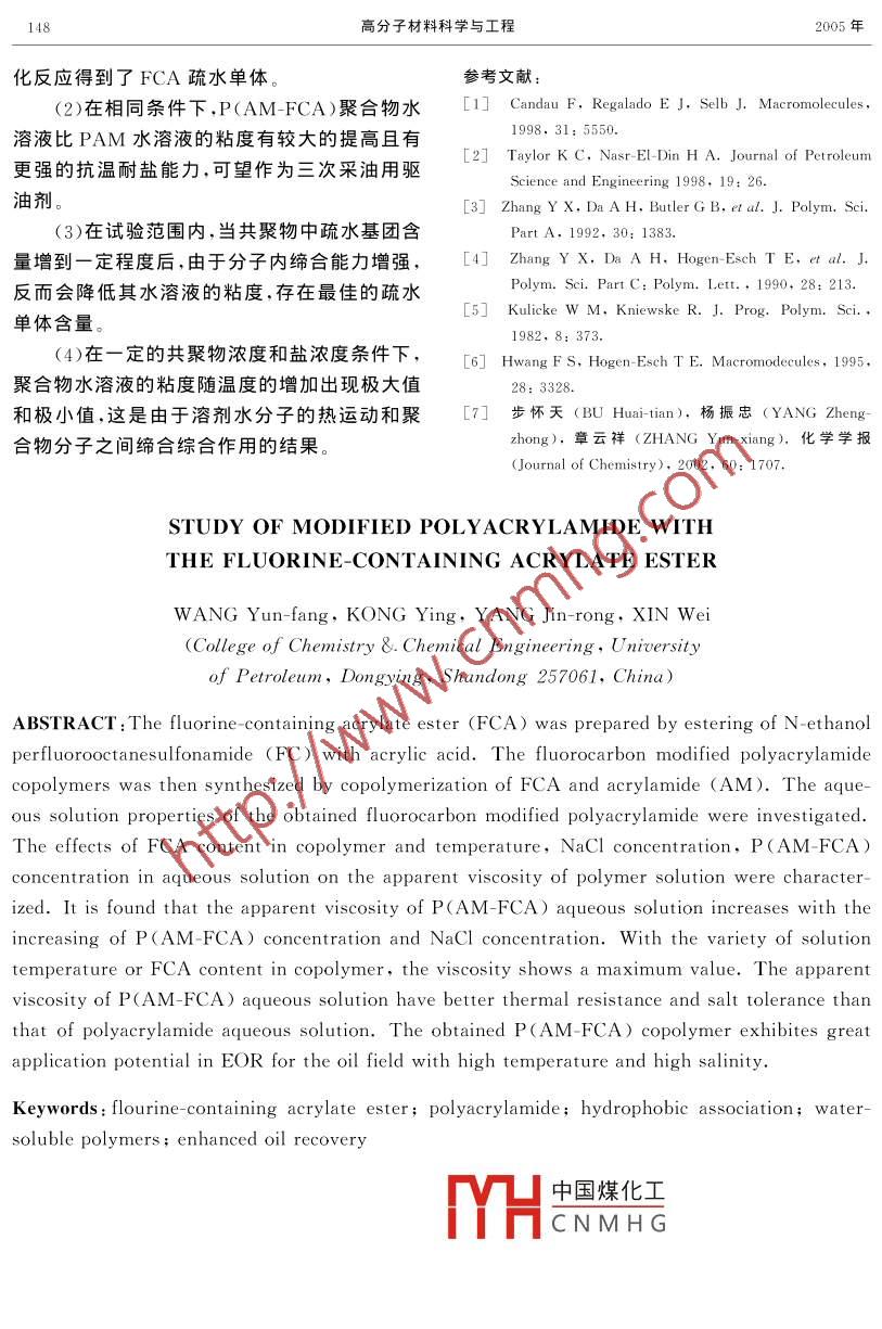 第21卷第1期高分子材料科學(xué)與工程2005年1月POLYMER MATERIALS SCIENCE AND ENGINEERINGJan.2005氟碳丙烯酸酯對聚丙烯酰胺的改性王云芳,孔瑛,楊金榮,辛偉(石油大學(xué)(華東)化學(xué)化工學(xué)院,山東東營257061)摘要:用N-丙基,N-羥乙基全氟辛基磺酰胺(FC)與丙烯酸反應(yīng)得到了N-丙基,N羥乙基全氟辛基磺酰胺丙烯酸酯(FCA),再通過與丙烯酰胺共聚得了氟碳改性聚丙烯酰胺P( AM-FCA)??疾炝斯簿畚镏蠪CA單體含量、溶液溫度、鹽濃度、P(AM-FCA)質(zhì)量分?jǐn)?shù)對溶液粘度的影響。結(jié)果表明,在實驗范圍內(nèi)共聚物溶液旳表觀粘度隨P(AM-FCA質(zhì)量分?jǐn)?shù)和鹽濃度的增加而増加,隨溶液溫度和FCA單體含量的增加岀現(xiàn)極值,共聚物和聚丙烯酰胺相比,具有良好抗溫、耐鹽性能,可望作為三次采油用驅(qū)油劑。關(guān)鍵詞:氟碳丙烯酸酯;聚丙烯酰胺;疏水締合作用;水溶性聚合物;三次采油中圖分類號:TQ326.4文獻標(biāo)識碼:A文章編號:1000-7555(2005)01-0145-04在三次采油技術(shù)中,聚丙烯酰胺作為一種1.2儀器水溶性聚合物驅(qū)油劑在國內(nèi)外已廣泛應(yīng)用。但核磁共振儀: Varian Unity400;紅外光譜由于聚丙烯酰胺耐溫、耐鹽能力差,不適用于我儀: Bio Rad Digita Division FTS-80;NDJ-1國高溫高鹽油層情況。在水溶性聚合物中,引入型旋轉(zhuǎn)粘度計,疏水基團,利用疏水基團的疏水締合作用是改1.3FCA單體的合成善聚合物耐溫耐鹽性能的重要途徑。疏水基團將FCo.05mol、丙烯酸0.lmol、濃硫酸能夠形成分子間締合作用而增加聚合物分子的0.24g、苯22mL,加入到裝有攪拌器、水分離流體力學(xué)體積,溶液的粘度隨聚合物濃度的増器和冷凝器的10mL三口燒瓶內(nèi)加熱回流直加呈指數(shù)增長,甚至聚合物在鹽水中的粘度至反應(yīng)完全(水的生成量達到理論值0.85比純水中更高。目前大多數(shù)研究都集中在用碳mL),再加熱蒸餾除去反應(yīng)物中的苯,用4%的氫疏水鏈改性水溶性聚合物。氟碳鏈與相同NaOH溶液中和反應(yīng)產(chǎn)物至中性,除去未反應(yīng)長度的碳氬鏈相比,具有更低的內(nèi)聚能密度和的丙烯酸,用乙醚萃取產(chǎn)品,去離子水洗滌乙醚表面能,其疏水締合作用比碳氫鏈更強:。合層兩次,再用無水硫酸鈉干燥,減壓蒸餾除去溶成可聚合的含氟共聚物單體,研究含氟丙烯酰劑,得淡黃色FCA液體產(chǎn)品30.6g,收率96%,胺共聚物溶液的性能,對于研究和開發(fā)新型的色譜分析純度為94.642%抗溫、耐鹽水溶性聚合物驅(qū)油劑是極為重要的1.4聚合物的合成將一定比例的FCA、SDS、AM用去離子水1實驗部分溶解均勻后,加NaOH調(diào)溶液的pH為9,溶液1.1試劑通氮保護,恒溫50℃,加入過硫酸銨、亞硫酸氫N-丙基,N-羥乙基全氟辛基磺酰胺:上海應(yīng)1但硎膠體聚合物。取一部分有機化學(xué)所提供;丙烯酸、過硫酸銨、亞硫酸氫中國煤化夜性能;另一部分用乙鈉、氬氧化鈉、丙烯酰胺、十二烷基硫酸鈉CNMHS烘干,用于儀器分析。(SDS):均為分析純;引發(fā)劑、助劑:自配1.5聚合物性能測試收稿日期:2003-05-20;修訂日期:2003-08基金項目:國家科技部十五攻關(guān)項目資助課題(2002BA312B05)作者簡介:王云芳(1962-),男,碩士,副教授.F-mail:wangyu@mai.hdpu.edu.cn146高分子材料科學(xué)與工程2005年采用NDJ-1型旋轉(zhuǎn)粘度計測定共聚物溶C一F基團的對稱和反對稱伸縮振動峰;1123液的表觀粘度,轉(zhuǎn)速30r/min。cm為C-O收縮振動峰;915cm-1,986cm為CH=CH一中雙鍵的對稱和反對稱伸縮振2結(jié)果與討論動峰;1411cm-1,1382cm-為-CH3,-CH2.1FCA單體的光譜分析鍵的伸縮振動峰;748cm-1為-(CH2)2-基團FCA單體的IR譜圖和C-NMR譜圖分的振動峰。以上數(shù)據(jù)說明,FC和丙烯酸發(fā)生了別見Fig.1和Fig.2。FCA的IR譜圖中,1731酯化反應(yīng)cm-1為C=O的收縮振動峰;1150cm-1為S=O伸縮振動峰;1205cm-,1239cm-1分別為350020001200Fig. 1 The IR spectra of FCAFig. 2 The C-NMR spectra of FCAFCA的C-NMR譜圖中,13.7為一CH3的加了聚合物的流體力學(xué)體積,從而增大了溶液化學(xué)位移;44.5和46.5為兩個一CH2-的化學(xué)的表觀粘度位移;61.6為CH2-OC=O基團中一CH2-的化學(xué)位移;77.2,77.0,76.8為不同位置C—F的化學(xué)位移;115.3,110.9,110.7是C-N鍵的化學(xué)位移;131.7是=CH2化學(xué)位移;165.6為CH一鍵的化學(xué)位移。從C-NMR譜圖數(shù)據(jù)可知,得到了目的化合物。2.2P(AM-FCA)水溶液的抗溫耐鹽性能2.2.Ⅰ溶液中共聚物質(zhì)量分?jǐn)?shù)對溶液粘度的影響:Fg.3為30C親件下,P( AM-FCA)及PAM在1.5%NaC1水溶液中表觀粘度與其質(zhì)中國煤化工,mass fracture( curve 1) and PCNMHG fracture(curve 2)on the量分?jǐn)?shù)的關(guān)系曲線。PAM溶液表觀粘度隨其parent viscosity質(zhì)量分?jǐn)?shù)的增加而緩慢上升,而P(AM-FCA)2.2.2NaCl質(zhì)量分?jǐn)?shù)對P(AM-FCA)溶液表溶液的表觀粘度隨其質(zhì)量分?jǐn)?shù)的增加而迅速增觀粘度的影響:Fig.4為NaCl的質(zhì)量分?jǐn)?shù)對P加,表明P( AM-FCA)分子在水溶液中發(fā)生了(AM-FCA)溶液表觀粘度的影響。其中,P強烈的分子間締合,形成可逆的網(wǎng)絡(luò)結(jié)構(gòu)而增 AM-FCA)溶液中聚合物的質(zhì)量分?jǐn)?shù)為第1期王云芳等:氟碳丙烯酸酯對聚丙烯酰胺的改性0.197%,溫度為3oC,P(AM-FCA)溶液的表合。在較低溫度范圍內(nèi),升高溫度,溶劑水分觀粘度隨NaCl質(zhì)量分?jǐn)?shù)的升高而增大,而質(zhì)子和聚合物分子運動加劇,粘度降低;隨著溫度量分?jǐn)?shù)為0.2%PAM溶液的