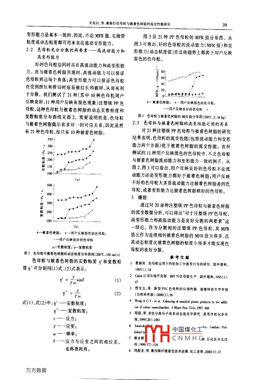 吳兆權(quán),等:聚烯烴色母粒與被著色樹脂的流變性能研究37聚烯烴色母粒與被著色樹脂的流變性能研究吳兆權(quán)陸玉本陳大華雷彩紅黃銳(東莞毅興塑膠原料有限公司523940) (四川大學(xué)高分 子材料科學(xué)與工程系,成都61006)摘要采用動(dòng)態(tài)應(yīng)力流變儀、轉(zhuǎn)矩流變儀和熔體流動(dòng)速率儀研究了聚烯烴色母粒熔體的流變特性。發(fā)現(xiàn)對色母粒這類特殊體系,其流動(dòng)能力和變形能力之間存在很大的區(qū)別;用MFR值或毛細(xì)管粘度來表征流動(dòng)能力及用動(dòng)態(tài)粘度來表征變形能力較為合適。對20多種注塑級P色母粒的研究表明,好的PP色母粒的流動(dòng)能力和變形能力都遠(yuǎn)高于被著色樹脂才能實(shí)現(xiàn)色母粒的良好分散。關(guān)鍵詞聚烯烴色母粒 流變特性流動(dòng)變形能力色母粒與被著色樹脂的流變特性之間應(yīng)滿足何果進(jìn)行比較,考察何種方式比較適合表征色母粒的種關(guān)系才能有利于色母粒的良好分散?這是一個(gè)世流動(dòng)變形能力。此外,我們采用動(dòng)態(tài)應(yīng)力流變儀、熔界性的技術(shù)難題,任何-個(gè)公司或研究機(jī)構(gòu)都不能體流動(dòng)速率儀等測試手段對數(shù)十種PP色母粒與被給出確切的回答。曹淑榮門對丙綸紡絲色母粒的研著色樹脂的流變性能進(jìn)行了比較,希望找出一個(gè)有究發(fā)現(xiàn),色母粒和紡絲基料熔體的流變性能差異是.利于色母粒分散的流變性能范圍。影響產(chǎn)品質(zhì)量的關(guān)鍵因素,并認(rèn)為色母粒和基料的1實(shí)驗(yàn)部分流變性能一致是比較好的??ú┨毓?1建議最好1.1 原材料選用與被著色樹脂熔體流動(dòng)速率(MFR)值相近的色低密度聚乙烯(LDPE):LDPE- A,TPC公司;母粒。詹寶玉等3認(rèn)為色母粒的流動(dòng)變形能力應(yīng)優(yōu)白色色母粒:W1.W2、W3,東莞毅興塑膠原料有于被著色樹脂。A.C-Y. Wang等4用以(苯乙烯/丙限公司;烯腈)共聚物(SAN)為載體的色母粒對ABS進(jìn)行著PP色母粒:注塑級,21種,東莞毅興塑膠原料有色發(fā)現(xiàn),所選用色母粒的MFR越高,所得注塑制品限公司。的顏色均勻性越好。因此,從文獻(xiàn)來看,似乎更傾向1.2實(shí)驗(yàn)儀器 與測試方法于色母粒的流動(dòng)變形能力應(yīng)優(yōu)于被著色樹脂。但對表1列出實(shí)驗(yàn)儀器、測試方法及生產(chǎn)廠家。.表!實(shí)驗(yàn)儀器、測試方法及生產(chǎn)廠家某一特定色母粒體系,其流變性能究競要比被著色儀器名稱型號測試方法生產(chǎn)廠家樹脂好多少尚不得而知。動(dòng)態(tài)應(yīng)力SR-500動(dòng)態(tài)頻率掃描美國Ronetric就測試手段而言,目前對色母粒流變行為的研流變儀Scientic Ine.究大多采用毛細(xì)管流變儀或轉(zhuǎn)矩流變儀。這種穩(wěn)態(tài)轉(zhuǎn)矩。SYS40恒定溫度下,最不同 德岡哈克公司流變僅轉(zhuǎn)速下的平衡轉(zhuǎn)矩測試下的連續(xù)形變常會造成高分子,特別是多相、多熔體流動(dòng)E.VINDEx按ASTM D1238 - 90意大利ATSAAR組分高分子形態(tài)結(jié)構(gòu)的變化或破壞,因而難以準(zhǔn)確.測試公司獲得材料結(jié)構(gòu)狀態(tài)的信息”’。Y.G. Yanovskyoi指2結(jié)果與討論出,對于填充高聚物體系,毛細(xì)管流變儀或轉(zhuǎn)矩流變2.1色母粒流動(dòng)變形能力的表征儀幾乎不能給出有關(guān)填料分散和混合程度等方面的塑料著色過程是通過色母粒與被著色樹脂的共信息,而動(dòng)態(tài)流變儀測試則能獲得大量這方面的有混來實(shí)現(xiàn)的,色母粒的流動(dòng)變形能力是影響共混效關(guān)信息。據(jù)筆者所知,還沒有人采用動(dòng)態(tài)應(yīng)力流變果從而影響著色效果的關(guān)鍵因素。因此,對色母粒測試手段測試色母粒熔體的動(dòng)態(tài)流變行為。生產(chǎn)、的流動(dòng)變形能力進(jìn)行表征無疑對色母粒的研究開研究人員比較習(xí)慣用MFR值和轉(zhuǎn)矩來表征色母粒發(fā)、生產(chǎn)及使用具有重要意義。在工業(yè)生產(chǎn)中,一般熔體的流動(dòng)變形能力17-10) ,并以此作為色母粒配方用MF中國煤化畢度(以下簡稱毛設(shè)計(jì)和改進(jìn)的依據(jù)之一。筆者擬采用動(dòng)態(tài)應(yīng)力流變儀測試色母粒的流變細(xì)TYHCNMH G淶表征。.特性,并與熔體流動(dòng)速率儀和轉(zhuǎn)矩流變儀的測試結(jié)收稿日期:2001-062138工程塑料應(yīng)用2001 年,第29卷,第I0期實(shí)際.上.流動(dòng)變形能力包括流動(dòng)能力和變形能力兩個(gè)方面。這兩者在本質(zhì)上有一定的共通性:變形就是一種流動(dòng),要流動(dòng)必須變形。表2列出用不A潤冊層同流變儀測得的4種原料的流變數(shù)據(jù)。從表2可看出,4種原料的流動(dòng)能力若按MFR值大小來表征,速率分布應(yīng)力分布速率分布成力分布則為:W3> W1> W2> LDPE- A;若按轉(zhuǎn)矩大小來表(a(b)征.則為:W3>W2>W1 > LDPE- A;若按復(fù)數(shù)粘度有潤滑層的流動(dòng): b-無潤滑層的流動(dòng)大小來表征,則為:LDPE -A>Wl> W2>W3。熔圈1毛細(xì)管內(nèi)兩種 不同流動(dòng)狀況示意圖體流動(dòng)速率儀和轉(zhuǎn)矩流變儀所測得的結(jié)果基本-要反映材料的流動(dòng)能力,而對材料的變形能力反映致,但與動(dòng)態(tài)流變儀所測得的結(jié)果幾乎完全相反。較少。三種流變儀就其本質(zhì)來說測定的都是材料的流動(dòng)變表