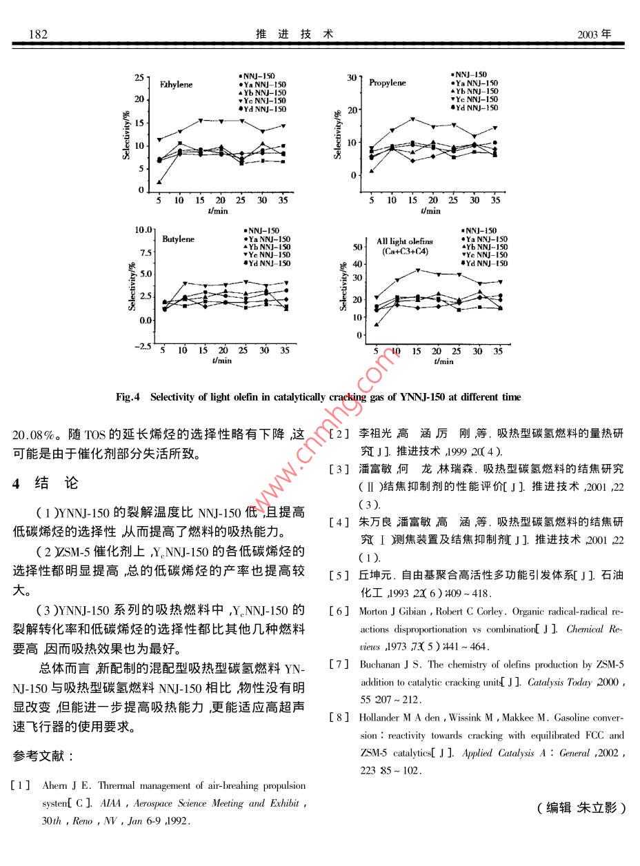 2003年4月推進技術Apr. 2003第24卷第2期JOURNAL OF PROPULSION TECHNOLOGYVol.24 No.2混配型吸熱碳氫燃料熱裂解及催化裂解咸春雷,方文軍,張波,王彬成,林瑞森(浙江大學化學系,浙江杭州310027)摘要:為提高吸熱型碳氫燃料的吸熱能效,將輔助燃料Y按不同比例與碳氫燃料混合,配制成新的混配型YNNJ-150燃料,利用連續(xù)流吸熱型碳氫燃料裂解微型反應色譜評價裝置,考察了它的熱裂解轉化率和低碳烯烴的選擇性,并在HZSM-5分子篩上進行了催化裂解評價。結果表明混配型YNNJ-150 燃料不僅降低了裂解溫度,同時提高了燃料裂解的低碳烯烴的選擇性,增加了燃料的吸熱能力,且混合輔助燃料Y的比例為15%時的混配燃料Y_NNJ-150 的效果最好。混配型燃料可成為今后研究的一個重要方向。關鍵詞:吸熱燃料;烴類燃料;混合燃料;熱降解;催化裂解中圖分類號: V312.1文獻標識碼: A文章編號: 1001-4055 ( 2003 ) 02-0179-04Thermal cracking and catalytic cracking of themixing endothermic hydrocarbon fuelXIAN Chun-lei , FANG Wen-jun , ZHANG Bo , WANG Bin-cheng , LIN Rui-sen( Dept. of Chemistry , Zhejiang Univ. , Hangzhou 310027 , China)Abstract: In order to improve the endothermtic capability of endothermtic hydrocarbon fuels ,new YNNJ-150 fuel was pre-pared by adding Y additive to NNJ-150. Cracking conversion and selectivity of light carbon olefins of mixing endothermic hydrocarbonfuels was investigated by the microreative chromatogram installation. Results show that the mixing YNNJ - 150 not only decreases thetemperature of cracking , but also improves the selectivity of light olefins and endothermic capability. Mixing fuel of containing percent15 Y is best in all diferent proportions. Cracking performance of mixing fuel on HZSM-5 was further studied. The mixing endothermichydrocarbon fuels may be the focus of future research.Key words: Endothermic fuel ; Hydrocarbon fuel ; Mixed fuel ; Thermal degradation ; Catalytic cracking1引言2實驗部分吸熱型碳氫燃料因可望更好地解決高超聲速飛2.1 吸熱型碳氫燃料的制備行器的冷卻問題而受到重視美國曾以沸石分子篩為通過對原油進行實沸點切割然后進行調(diào)配制成催化劑,對吸熱型碳氫燃料的催化裂解進行了評的吸熱型碳氫燃料NNJ-150 ) ,混配吸熱型碳氫燃料價1但固體催化劑裂解碳氫燃料要應用于高超聲速YNNJ- 150是把NNJ-150與一種輔助燃料Y按不同比例的航空、航天飛行器卻還存在著一些技術困難。 為此,混合配制而制成其主要性質與NNJ-150對比見表1。美國和俄羅斯開始著手引發(fā)劑添加劑)的研制和開2.2吸熱型碳氫燃料裂解測試發(fā)。鑒于國內(nèi)目前在這方面還是空白難度較大我們裂解反應利用連續(xù)流吸熱型碳氫燃料裂解微型首先在NN-150吸熱型碳氫燃料23]的基礎上用輔助反應色譜評價裝置3A中進行其熱裂解測試條件為在燃料Y與NNJ-150按不同比例進行混配制備了新的反應管內(nèi)全部填充小瓷管反應溫度為500C 600C ,YNNJ-150吸熱燃料提高吸熱型碳氫燃料的吸熱能效,Table 1 Main properties of endothermic hydrocarbon fuel并在ZSM-5催化劑上進行了催化裂解評價。180推進技術2003年Endohermice| NN-I50 | YNNJ-15OYNN- 150 YNJ-15OYNNJ-150碳烯烴的選擇性。hydrocarbon fuel Y=0% )(Y=5% )(Y=10% X Y=15%X Y=20% )從圖1中可以看出混配型YNNJ-150 在500時Density 20C/0.80563 0.803 780.802860.802 12 0.801 66已經(jīng)開始裂解在600C時YNNJ- 150的裂解轉化率有(gcm2 ) _了明顯的提高其中在5%時提高最為明顯,說明在Viscosity 20C/1.722 1 .6141.5781.556 1.542( mm2/s)NNJ-150中添加了輔助燃料Y后提高燃料的裂解轉Heat output/34.72 34. 5934.1533.02 32.46化率降低燃料的裂解溫度。輔助燃料Y在高溫下(kJ/ml )易產(chǎn)生一種烷基自由基,它引發(fā)了烴類化合物,使CRefractive index1.4480 1.4442 1.442 71.4376 1.4350(20C )-C鍵更易發(fā)生均裂產(chǎn)生自由基,從而引發(fā)了整個反應進行6]。在700C時裂解轉化率提高不明顯,這7009 ,氮氣流速為60ml/min ,燃料進料速度為主要是由于在700°高溫下NNJ- 150的裂解已經(jīng)較明0.15m/min ,反應產(chǎn)物經(jīng)冰水浴冷卻后,分離的氣體顯2]烷烴可以直接發(fā)生C-C均裂而使裂解反應進在混合池中充分混合后進入氣相色譜中,用50m行,從而使Y的引發(fā)效果表現(xiàn)的不是十分突出總體KC/AI2O,PLOT毛細色譜管柱分離,FID檢測收集液的轉化率變化不大。體產(chǎn)物并計量,催化裂解時在反應管中部放置1g所圖2為不同溫度下低碳烯烴的選擇性圖。從中需的催化劑,反應前催化劑要在500C干燥的氮氣流可以看出,YNNJ-150系列混配燃料在不同的溫度下中預處理2h其它條件與熱裂解反應基本相同。隨著Y量的增加,乙烯、丙烯的選擇性都有較大的提因主要考察低碳產(chǎn)物的生成情況而低碳產(chǎn)物主高在500C時乙烯的選擇性提高最為明顯,且在Y要存在于氣態(tài)產(chǎn)物中,因此裂解轉化率可以近似地的含量為15%時提高最大,丙烯、丁烯則提高不是很定義為氣態(tài)產(chǎn)物的質量產(chǎn)率。氣態(tài)產(chǎn)物中各物質的明顯均低于600C與7009C的選擇性,但在高溫下丙選擇性按面積歸一法計算。烯的選擇性有很大的提高。這主要是由于在500C3結果與討論時輔助燃料Y生成烷基自由基能與直鏈烷烴作用,3.1反應溫 度不同NNJ-150及YNNJ-150裂解結果使C-C鍵斷裂生成仲碳自由基,仲碳自由基以β斷裂生成乙烯當溫度升高到600C時烴鏈中C-C鍵.圖1為NNJ-150及YNNJ-150在不同反應溫度時已能斷裂生成自由基溫度高時自由基相互碰撞的幾的熱裂解結果。率加大使自由基數(shù)量相對