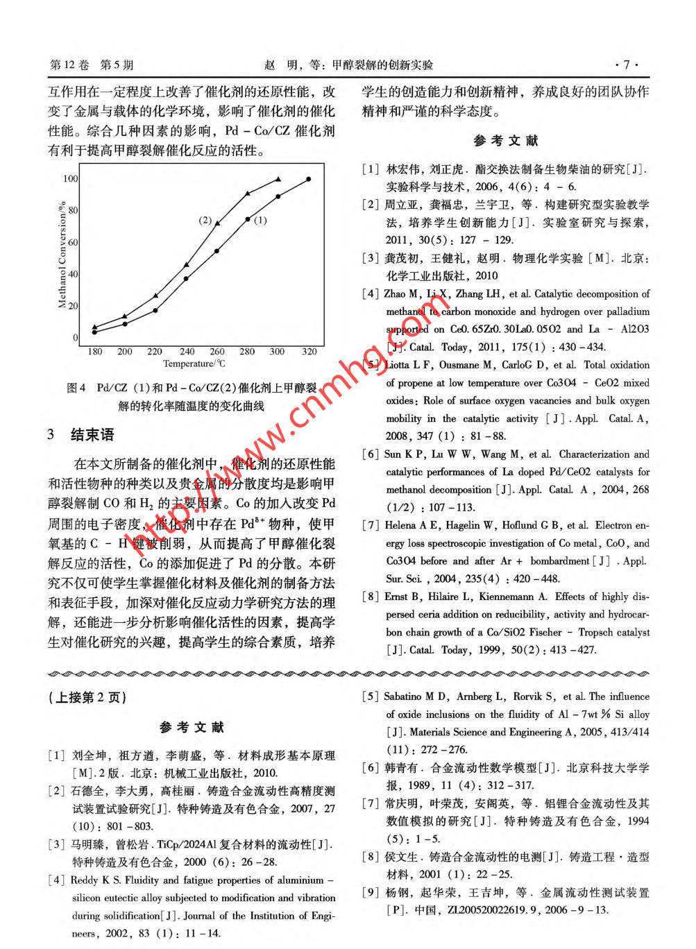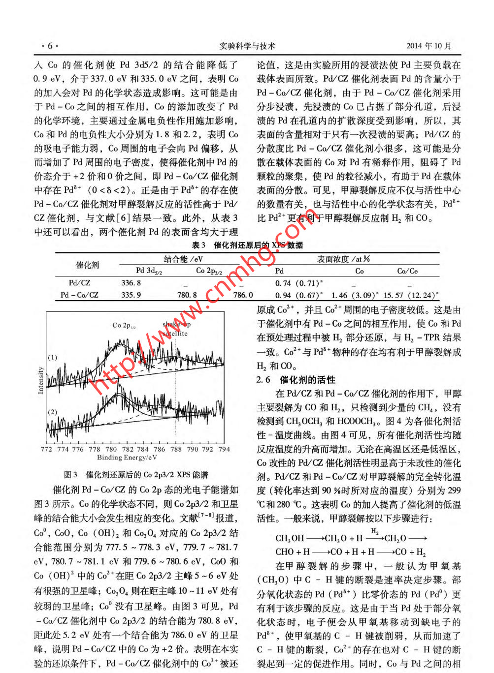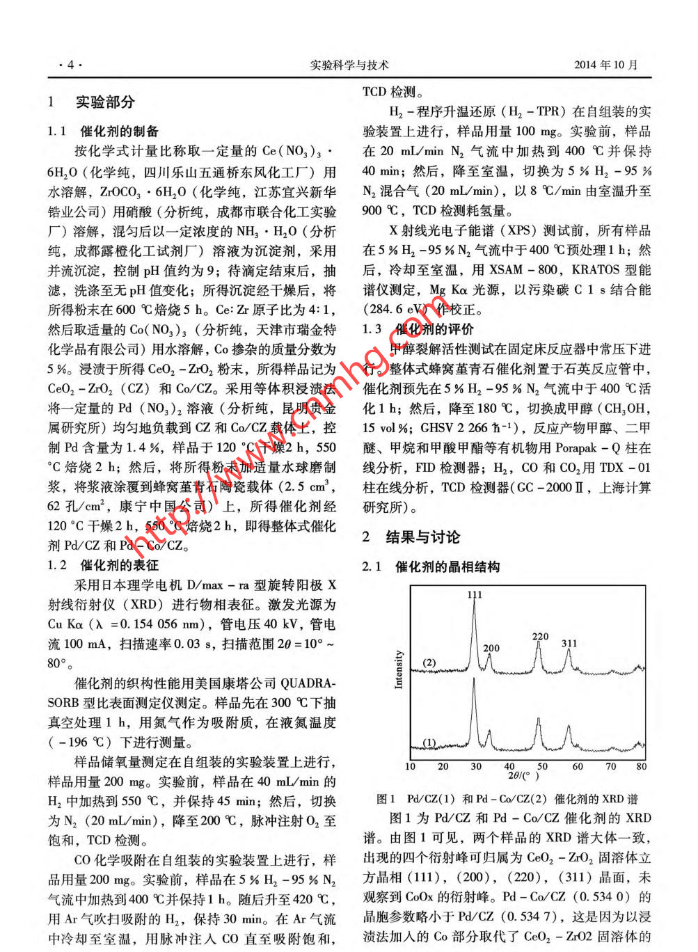 ●4.實(shí)驗(yàn)科學(xué)與技術(shù)2014年10月TCD檢測。1實(shí)驗(yàn)部分H2-程序升溫還原(H2 -TPR)在自組裝的實(shí)1.1催化劑的制備驗(yàn)裝置上進(jìn)行,樣品用量100 mg。實(shí)驗(yàn)前,樣品按化學(xué)式計(jì)量比稱取- - 定量的Ce(NO3)3●在20mL/minN2氣流中加熱到400C并保持.6H20 (化學(xué)純,四川樂山五通橋東風(fēng)化工廠)用40 min;然后,降至室溫,切換為5 % H2 -95 %水溶解,ZrOCO3 ● 6H20 (化學(xué)純,江蘇宜興新華N2混合氣(20 mL/min),以8 C/min由室溫升至鋯業(yè)公司)用硝酸(分析純,成都市聯(lián)合化工實(shí)驗(yàn)900 C, TCD檢測耗氫量。廠)溶解,混勻后以- -定濃度的NH,●H20 (分析X射線光電子能譜(XPS) 測試前,所有樣品純,成都露橙化工試劑廠)溶液為沉淀劑,采用在5%H2-95 %N2氣流中于400 C預(yù)處理1h;然并流沉淀,控制pH值約為9;待滴定結(jié)束后,抽后,冷卻至室溫,用XSAM - 800, KRATOS型能濾,洗滌至無pH值變化;所得沉淀經(jīng)干燥后,將譜儀測定,MgKa光源,以污染碳C1s結(jié)合能所得粉末在600 C焙燒5 h。Ce: Zr原子比為4:1,(284.6eV)作校正。然后取適量的Co( NO3)3 (分析純,天津市瑞金特1.3催化劑的評價(jià)化學(xué)品有限公司)用水溶解, Co摻雜的質(zhì)量分?jǐn)?shù)為甲醇裂解活性測試在固定床反應(yīng)器中常壓下進(jìn)5%。浸漬于所得CeO2 -Zr02粉末,所得樣品記為行。整體式蜂窩堇青石催化劑置于石英反應(yīng)管中,CeO2 -ZrO2 (CZ) 和Co/CZ。采用等體積浸漬法催化劑預(yù)先在5%H2-95% N2氣流中于400 C活將-一定量的Pd (NO3)2 溶液(分析純,昆明貴金化1 h;然后,降至180 C,切換成甲醇(CHgOH,屬研究所)均勻地負(fù)載到CZ和Co/CZ載體上,控15 vol %; CHSV 2 266 h-1),反應(yīng)產(chǎn)物甲醇、二甲制Pd含量為1.4%,樣品于120 °C干燥2 h, 550醚、甲烷和甲酸甲酯等有機(jī)物用Porapak-Q柱在°C焙燒2 h;然后,將所得粉末加適量水球磨制線分析,F(xiàn)ID 檢測器; H2, CO和CO2用TDX -01漿,將漿液涂覆到蜂窩堇青石陶瓷載體(2. 5 cm3,柱在線分析,TCD 檢測器(GC -20001I,上海計(jì)算62孔/cm2,康寧中國公司)上, 所得催化劑經(jīng).研究所)。120°C干燥2 h, 550 °C焙燒2 h,即得整體式催化2結(jié)果與討論劑Pd/CZ和Pd - Co/CZ。1.2催化劑的表征2.1催化劑的晶相結(jié)構(gòu)采用日本理學(xué)電機(jī)D/max- ra型旋轉(zhuǎn)陽極X11射線衍射儀(XRD)進(jìn)行物相表征。激發(fā)光源為CuKa(λ=0.154056nm),管電壓40kV,管電流100 mA,掃描速率0.03 s,掃描范圍2θ=10°~20080°。催化劑的織構(gòu)性能用美國康塔公司QUADRA-SORB型比表面測定儀測定。樣品先在300 C下抽真空處理1 h,用氮?dú)庾鳛槲劫|(zhì),在液氮溫度( -196 C)下進(jìn)行測量。樣品儲(chǔ)氧量測定在自組裝的實(shí)驗(yàn)裝置上進(jìn)行,2340506780樣品用量200 mg。實(shí)驗(yàn)前,樣品在40 mL/min的H2中加熱到550 C,并保持45 min;然后,切換圖1 Pd/CZ(1) 和Pd - Co/CZ(2)催化劑的XRD譜為N2 (20 mL/min),降至200 C,脈沖注射O2至圖1為Pd/CZ和Pd-Co/CZ催化劑的XRD飽和,TCD檢測。譜。由圖1可見,兩個(gè)樣品的XRD譜大體- -致,CO化學(xué)吸附在自組裝的實(shí)驗(yàn)裝置上進(jìn)行,樣出現(xiàn)的四個(gè)衍射峰可歸屬為CeO2 - ZrO2固溶體立品用量200 mg。實(shí)驗(yàn)前,樣品在5% H2-95% N2方晶相(111),(200), (220), (311) 晶面,未氣流中加熱到400 C并保持1 h。隨后升至420 C,觀察到CoOx的衍射峰。Pd- Co/CZ (0. 5340)的用Ar氣吹掃吸附的H2,保持30min。在Ar氣流晶胞參數(shù)略小于Pd/CZ (0. 534 7),這是因?yàn)橐越欣鋮s至室溫,用脈沖注人CO直至吸附飽和,漬法加入的Co部分取代了CeO2 - ZrO2固溶體的第12卷第5期趙明, 等:甲醇裂解的創(chuàng)新實(shí)驗(yàn)Ce或Zr,由于鈷離子半徑小于Ce**/Ce+和Z7r+,TPR譜。在H2作用下,PdO的還原過程為PdO- +導(dǎo)致晶胞收縮、晶胞參數(shù)變小,但還有部分Co高Pd20- +Pd, 而Co304的還原過程為Co3+-→Co*→度分散在固溶體表面,以非晶態(tài)存在,所以晶胞收Co°,其還原峰溫位于220 C ~500 C之間。由圖2縮程度不大。此外,兩種催化劑都沒有檢測到Pd可見,Pd/CZ催化劑在106 C有一個(gè)較尖銳的還原的任何特征衍射峰,可能是由于Pd的含量較低,峰,歸屬為載體表面PdO的還原,此還原溫度高或者在載體的表面呈高度分散狀態(tài)。于文獻(xiàn)報(bào)道值(81 C),這是由于PdO與載體CZ2.2催化劑的織構(gòu)性質(zhì)和儲(chǔ)氧性能發(fā)生了強(qiáng)相互作用,使PdO還原溫度升高。Pd -表1為各催化劑的比表面積、孔體積、平均孔Co/CZ催化劑在125 C有-個(gè)較寬泛的平頭峰,可徑和儲(chǔ)氧量。由表1可見,Co摻雜使得催化劑比能為載體表面PdO的還原和催化劑表面高分散的表面積有所降低,孔容和平均孔徑略有下降,這是Co3O4直接還原為Co0的耗氫峰的疊加,摻雜Co,由于Co浸漬在CZ載體的過程中堵塞了載體的部后,Pd-Co之間有一定的相互作用,使原來表面分孔道。由OSC數(shù)據(jù)可知,加入Co后,催化劑的的Pd0還原溫度升高,Co3O4 的還原溫度降低。這儲(chǔ)氧量顯著增加,一方面,Co 本身具有可變的價(jià)種高度分散在載體表面的Pd與Co產(chǎn)生的相互作態(tài),容易氧化還原,具有- -定的儲(chǔ)放氧性能;另一用也可通過XPS得到印證。一般來說,CeO2 表面方面,Pd -Co/CZ催化劑中有部分Co進(jìn)入了CeO2氧的還原溫度高于430 C,體相氧的還原溫度大致-ZrO2固溶體中,產(chǎn)生晶格畸變,氧缺陷增大,在800 C左右,Pd - Co/CZ催化劑位于390 C較寬氧的移動(dòng)速率加快,最終使催化劑儲(chǔ)氧量增加。催