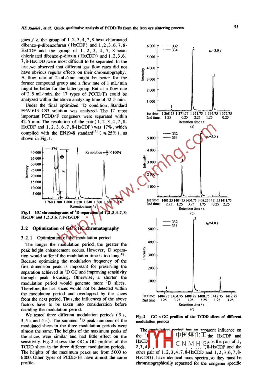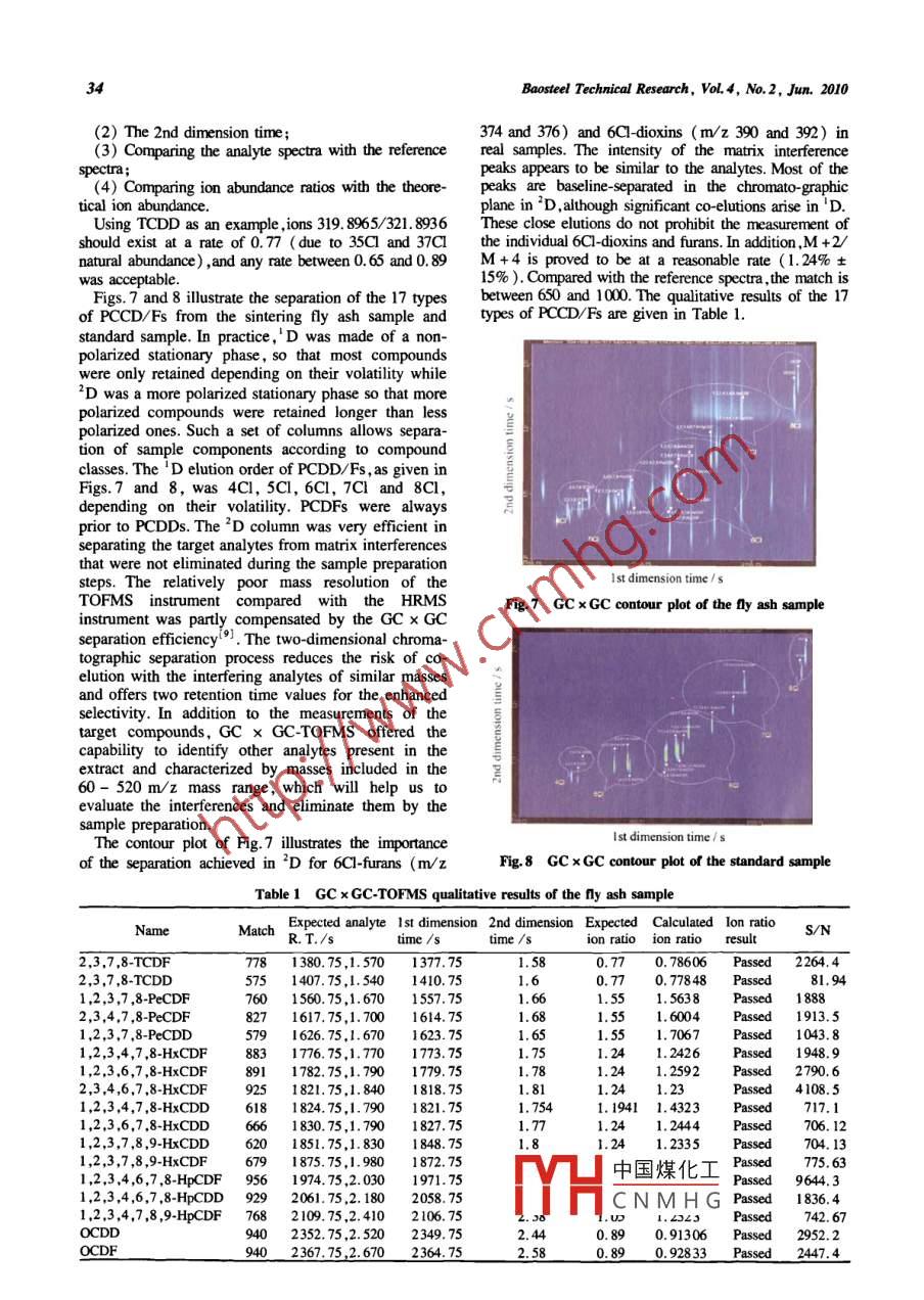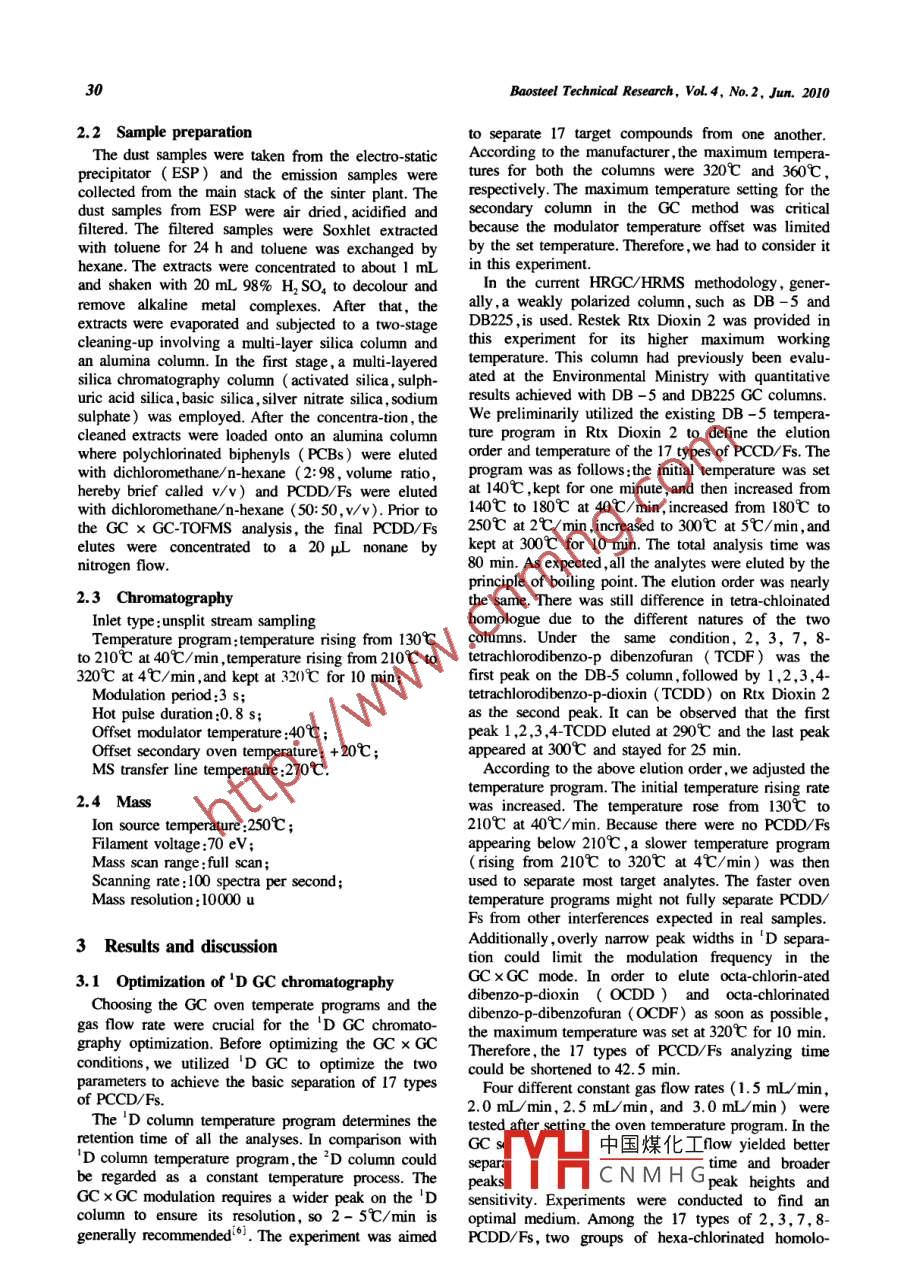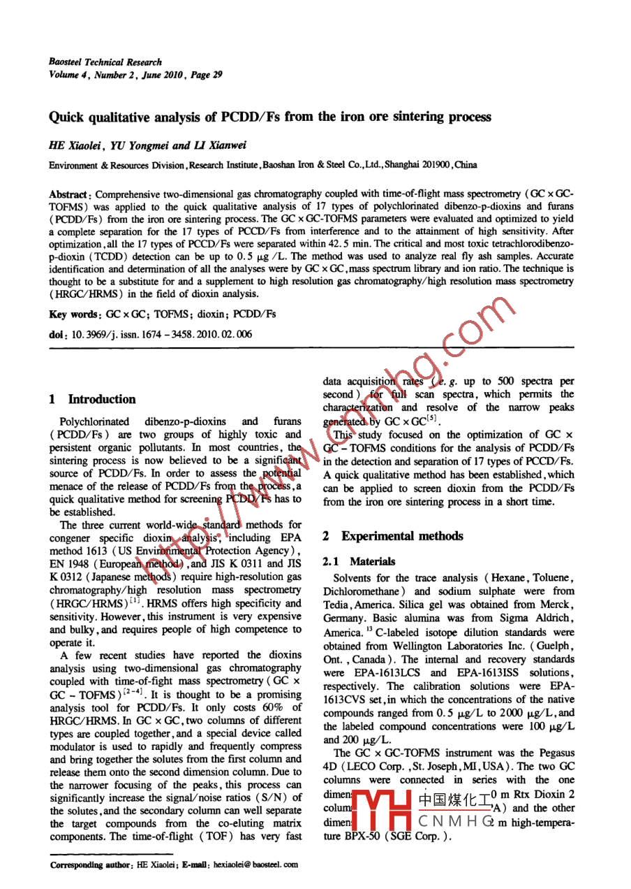 Baosteel Technical ResearchVolume4, Number2, June 2010, Page 29Quick qualitative analysis of PCDD/Fs from the iron ore sintering processHE Xiaolei, YU Yongmei and u XianweiEnvironnent & Resources Division ,Research Institute ,Baoshan lron & Steel Co.,Ltd,Shanghai 201900 ,ChinaAbstract: Comprehensive two-dimensional gas chromatography coupled with time of-flight mass spectrometry (GCxGC-TOFMS) was applied to the quick qualitative analysis of 17 types of polychlorinated dibenzo-p-dioxins and furans(PCDD/Fs) from the iron ore sintering process. The GC x GC-TOFMS parameters were evaluated and optimized to yielda complete separation for the 17 types of PCCD/Fs from interference and to the atanment of high sensitivity. Afteroptimization ,all the 17 types of PCCD/Fs were separated within 42.5 min. The critical and most toxic tetrachlorodibenzo-p-dioxin (TCDD) detection can be up to 0.5 ug /L. The method was used to analyze real fly ash samples. Accurateidentification and determination of all the analyses were by GC x GC ,mass spectrum library and ion ratio. The technique isthought to be a substiute for and a supplement to high resolution gas chromatography/ high resolution mass spectrometry(HRGC/HRMS) in the field of dioxin analysis.Key words: GC x GC; TOFMS; dioxin; PCDD/Fsdol: 10 3969/j. issn. 1674 - 3458.2010.02.006data acquisition rates ( e.g. up to 500 spectra per1 Introductionsecond) for full scan spectra, which permits thecharacterization and resolve of the narrow peaksPolychlorinated dibenzo-p-dioxins and furansgenerated by GC x (( PCDD/Fs) are two groups of highly toxic andThis study focused on the optimization of GC Xpersistent organic pollutants. In most countries, theGC - TOFMS conditions for the analysis of PCDD/Fssintering process is now believed to be a significantin the detection and separation of 17 types of PCCD/Fs.source of PCDD/Fs. In order to assess the potentialA quick qualitative method has been established , whichmenace of the release of PCDD/Fs from the process,acan be applied to screen dioxin from the PCDD/Fsquick qualitative method for screening PCDD/Fs has tofrom the iron ore sintering process in a short time.be established.The three current world-wide standard methods forcongener specific dioxin analysis, including EPA2 Experimental methodsmethod 1613 ( US Environmental Protection Agency)EN 1948 ( European method) , and JIS K 0311 and JIS.1 MaterialsK 0312 (Japanese methods) require high-resolution gasSolvents for the trace analysis ( Hexane, Toluene,chromatography/high resolution mass spectrometryDichloromethane) and sodium sulphate were from( HRGC/HRMS). HRMS offers high specificity andTedia, America. Silica gel was obtained from Merck,sensitivity. However , this instrument is very expensiveGermany. Basic alumina was from Sigma Aldrich,and bulky , and requires people of high competence toAmerica. 1 C-labeled isotope dilution standards wereoperate it.obtained from Wellington Laboratories Inc. ( Guelph,A few recent studies have reported the dioxinsOnt. , Canada). The intermal and recovery standardsanalysis using two-dimensional gas chromatographywere EPA-1613LCS and EPA-1613ISS solutions,coupled with time of-fight mass spectrometry(GC xrespectively. The calibration solutions were EPA-GC - TOFMS)(2-4.It is thought to be a promising1613CVS set , in which the concentrations of the nativeanalysis tool for PCDD/Fs. It only costs 60% ofcompounds ranged from 0.5 μg/L to 2000 μg/L, andHRGC/HRMS. In GC x GC, two columns of differentthe labeled compound concentrations were 100 μg/L .types are coupled together , and a special device calledand 200 μg/L.modulator is used to rapidly and frequently compressThe GC x GC-TOFMS instrument was the Pegasusand bring together the solutes from the first column andrelease them onto the second dimension column. Due to4D (LECO Corp. ,St. Joseph,MI,USA). The two GCthe narrower focusing of the peaks, this process cancolumns were connected in series with the onesignifcantly increase the signal/noise ratios (S/N) ofdimen:中國煤化I-0 m Rtx Dioxin 2the solutes ,and the secondary column can well separatecolumA) and the otherthe target compounds from the co-eluting matrixMYHC N M H G m high-tempera-components. The time-of-flight (TOF) has very fastture BPX-50 (SGE Corp. ).Coresponding autbor: HE Xiaoli; E-mail; hexiali@ bostel com30Basteel Technical Research, VoL4, No.2, Jun. 20102.2 Sample preparationto separate 17 target compounds from one another.The dust samples were taken from the electro- staticAccording to the manufacturer , the maximum tempera-precipitator ( ESP) and the emission samples weretures for both the columns were 320亡and 360C ,collected from the main stack of the sinter plant. Therespectively. The maximum temperature setting for thedust samples from ESP were air dried, acidifed ansecondary column in the GC method was criticalfitered. The filtered samples were Soxhlet extractedbecause the modulator temperature offset was limitedwith toluene for 24 h and toluene was exchanged byby the set temperature. Therefore , we had to consider ithexane. The extracts were concentrated to about 1 mLin this experiment.and shaken with 20 mL 98% H2 SO4 to decolour andIn the current HRGC/HRMS methodology, gener-remove alkaline metal complexes. After that, theally,a weakly polarized column, such as DB -5 andextracts were evaporated and subjected to a two-stageDB225 ,is used. Restek Rtx Dioxin 2 was provided incleaning-up involving a multi-layer silica column andthis experiment for its higher maximum workingan alumina column. In the first stage , a multi-layeredtemperature. This column had previously been evalu-silica chromatography column ( activated silica , sulph-ated at the Environmental Ministry with quantitativeuric acid silica, basic silica , silver nitrate silica , sodiumresults achieved with DB -5 and DB225 GC columns.sulphate) was employed. After the concentra-tion , theWe preliminarily utilized the existing DB - 5 tempera-cleaned ext