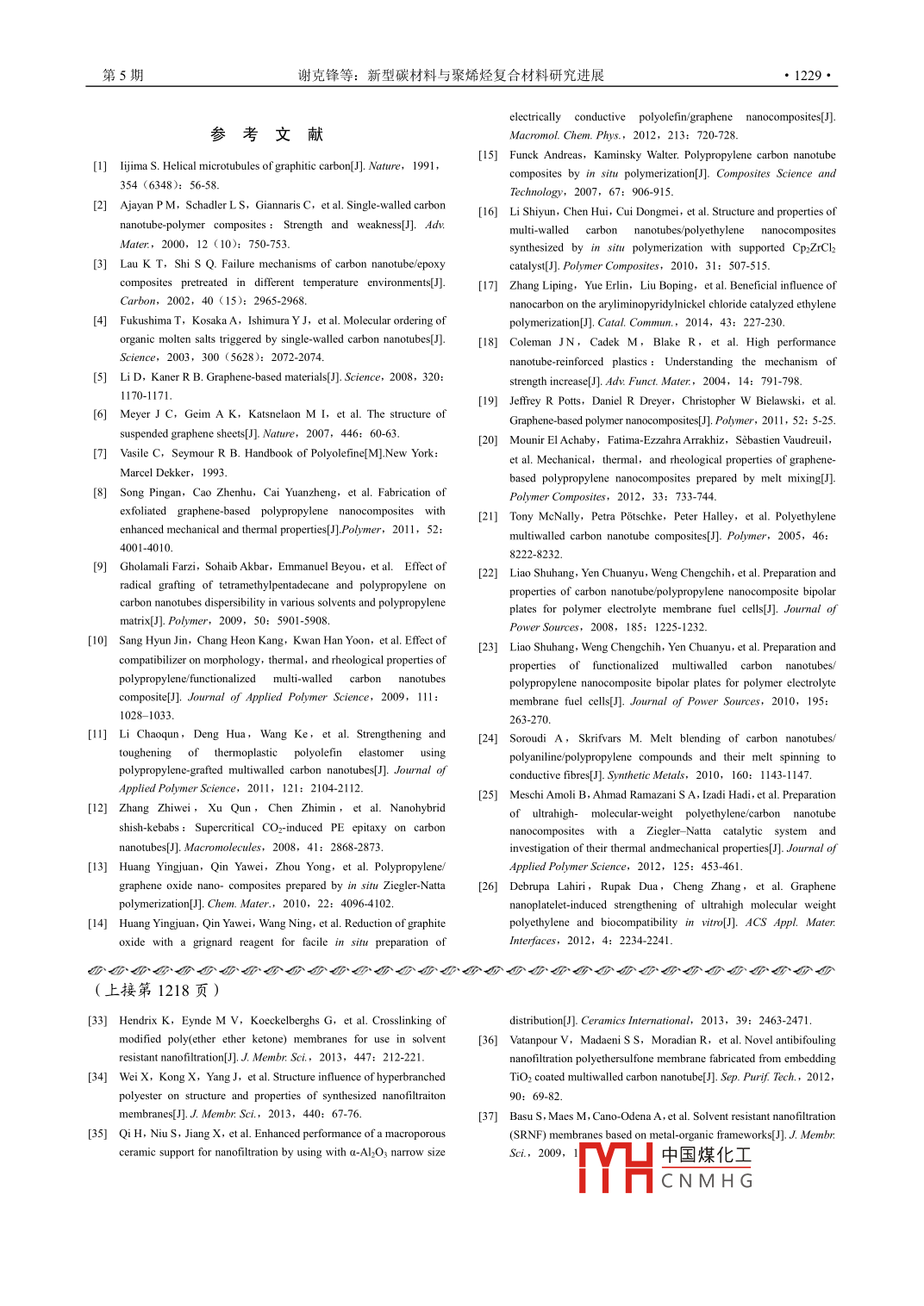 化工進(jìn)展2014 年第33卷第5期CHEMICAL INDUSTRY AND ENGINEERING PROGRESS●1225●進(jìn)展與述評(píng)。新型碳材料與聚烯烴復(fù)合材料研究進(jìn)展謝克鋒,宋賽楠,高琳,賈軍紀(jì),李艷芹,黃安平,王霞(中國(guó)石油蘭州化工研究中心,甘肅蘭州730060)摘要:最近二十多年,由于新型碳材料(包括富勒烯、碳納米管和石墨烯等)在很多方面具有優(yōu)異的性能,開(kāi)辟了諸多新穎的應(yīng)用領(lǐng)城。本文綜述了碳納米管和石墨烯在聚烯烴樹(shù)脂中的應(yīng)用,通過(guò)物理共混和原位合成法形成復(fù)合材料,提高了聚烯烴材料的力學(xué)性能、結(jié)晶和熔融性能、熱穩(wěn)定性和導(dǎo)電性等,復(fù)合材料在場(chǎng)發(fā)射顯示器件、儲(chǔ)氫材料、電池、超強(qiáng)超韌復(fù)合材料、顯微鏡探頭、超級(jí)電容器、電子槍、納米電子器件、傳感器等諸多領(lǐng)域已取得了較大的突破。關(guān)鍵詞:聚烯烴;碳納米管;石墨烯;復(fù)合材料;性能中圖分類號(hào): TQ 028.8文獻(xiàn)標(biāo)志碼: A文章編號(hào): 1000- 6613 (2014) 05- 1225 - 05DOI: 10.3969/jissn. 0006613.2014.05.024Research progress of new type carbon materials/polyolefin compositeXIE Kefeng, SONG Sainan,GAO Lin, JIA Junji, LI Yanqin, HUANG Anping,WANG Xia(Lanzhou Petrochemical Research Center, PetroChina, Lanzhou 730060,Gansu, China)Abstract: In the last twenty years, owing to the excellent properties, the novel carbon material(including fullerene, carbon nanotube, graphene, etc.) has opened up a number of applications in manyreas.This paper summarizes composites of carbon nanotube and graphene with polyolefin. Thcomposites are made by physical blending and polymerization in situ, which improves mechanicalproperties, crystallization and melting, thermal stability, and conductivity. Furthermore, breakthroughshave been made in the following aspects: field emission display device, hydrogen storage materials,battery,ultra-intense and super tough composite,microscopic probe,super-capacitor, electron gun,nano-electronic components,and sensors.Key words: polyolefin; carbon nanotube; graphene; composite; property隨著科學(xué)技術(shù)的高速發(fā)展,人們對(duì)聚合物材料耐強(qiáng)堿和強(qiáng)酸、奇特的導(dǎo)電性以及優(yōu)良的導(dǎo)熱性等應(yīng)用性能的要求越來(lái)越高。既要求聚合物材料有優(yōu)優(yōu)勢(shì),將其與聚合物復(fù)合,使碳納米管和聚合物的良的韌性,又要有較高的硬度;既希望聚合物耐高性質(zhì)充分結(jié)合起來(lái),有望能制備出一類高性能、多溫,又要求其易于加工成型;不僅性能良好,價(jià)格功能的聚合物基碳納米管復(fù)合材料。同時(shí),聚合物還要低廉。對(duì)于這些對(duì)材料綜合性能的要求,單一基碳納米管復(fù)合材料具有可設(shè)計(jì)性強(qiáng)、抗疲勞性能的聚合物往往難以滿足需要。于是,對(duì)聚合物進(jìn)行好、成型工藝簡(jiǎn)單等優(yōu)點(diǎn)。石墨烯是一-種碳原子之復(fù)合改性的研究越來(lái)越受到重視,并已成為開(kāi)發(fā)新間呈六角環(huán)形的片狀體,是一層碳原子構(gòu)成的一個(gè)型高性能聚合物材料的主要研究方向。二維空間無(wú)限延伸的基面,石墨烯獨(dú)特的物理、化碳納米管(CNTs) (1-4]和石墨烯( graphene) [5-學(xué)和力學(xué)性能為復(fù)合材料的開(kāi)發(fā)提供了原動(dòng)力,可的出現(xiàn),為聚合物的改性提供了新的元素。碳納米收稿日期: 2013-10-12; 修改稿日期: 2014-01-07。管作為典型的一維納米材料,與傳統(tǒng)的填料相比,第一作者及聯(lián)系人:謝克鋒(1986-),男,碩士,工程師,研究方向它具有極大的長(zhǎng)徑比、極高的彈性模量和彎曲強(qiáng)度、為烯烴材料的研究中國(guó)煤化工com.Cn。YHCNMH G .化進(jìn)展2014年第33卷望開(kāi)辟諸多新穎的應(yīng)用領(lǐng)域。隨著研究的深入和多需要對(duì)材料進(jìn)行表面的修飾,使之在復(fù)合材料兩相元化、性能更優(yōu)越的石墨烯復(fù)合材料將不斷制備出界面能夠相互吸引,不產(chǎn)生相分離。Song 等[8]將氧來(lái),從而為實(shí)現(xiàn)石墨烯的實(shí)際應(yīng)用奠定科學(xué)和技術(shù)化石墨超聲分散在聚丙烯乳液中,還原氧化石墨得基礎(chǔ)。到石墨烯和聚丙烯復(fù)合材料。EmmanuelBeyou研究傳統(tǒng)的聚烯烴材料主要為聚乙烯(PE)和聚小組9通過(guò)DCP在加熱后產(chǎn)生的自由基,使碳納米丙烯(PP), 具有性價(jià)比高、力學(xué)性能好和熱性能管和聚丙烯交聯(lián)制備出復(fù)合材料。Kwan Han Yoon穩(wěn)定以及結(jié)晶性調(diào)節(jié)范圍大、加工性能優(yōu)良、安全小組”01和Li等"通過(guò)氧化碳納米管上羧基與有機(jī)穩(wěn)定性好、可循環(huán)再利用等特點(diǎn)7]。用碳納米管和胺反應(yīng)得到胺修飾的碳納米管,使之與熔融的聚丙石墨烯與聚烯烴材料復(fù)合,可提高聚烯烴材料的力烯分散得到分散很好的復(fù)合材料。Xu等2]通過(guò)學(xué)性能、電學(xué)性能和熱性能等,其已經(jīng)發(fā)展成為聚SAIPE方法制備出聚乙烯與碳納米管串晶復(fù)合材烯烴材料改性很重要的一-種方法。料,聚乙烯以碳納米管為中心軸,形成連續(xù)的圓盤(pán)1新型碳材料與聚烯烴復(fù)合材料的狀結(jié)晶。物理共混法制備復(fù)合材料相對(duì)簡(jiǎn)便易行,容易大規(guī)模生產(chǎn),但其分散性不是很好。制備方法1.2 原位聚合法碳納米管和石墨烯與聚烯烴復(fù)合材料的