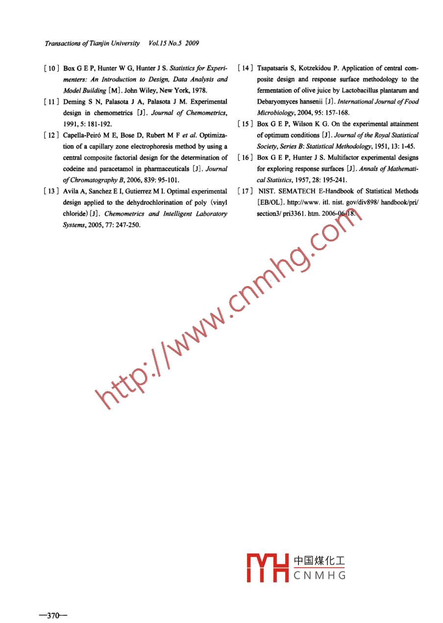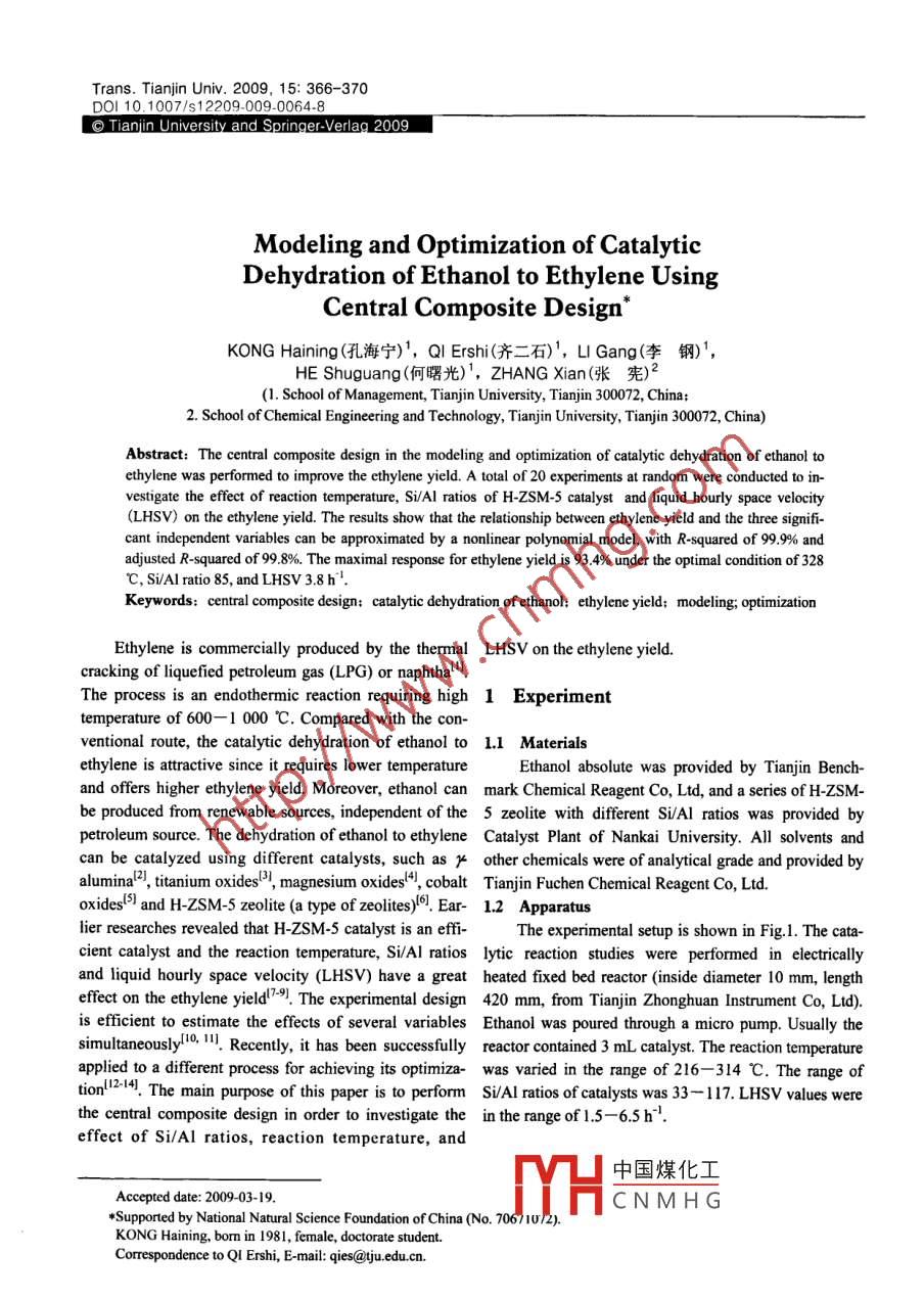 Trans. Tianjin Univ. 2009, 15: 366-370DOl10.1007/s1220900900648Modeling and optimization of catalyticDehydration of Ethanol to Ethylene UsingCentral Composite DesignKONG Haining(孔海寧), QI Ers(齊二石)1, LI Gang(李鋼)',HE Shuguang(何曙光)1, ZHANG Xian(張憲)2(1. School of Management, Tianjin University, Tianjin 300072, China;2. School of Chemical Engineering and Technology, Tianjin University, Tianjin 300072, China)Abstract: The central composite design in the modeling and optimization of catalytic dehydration of ethanol toethylene was performed to improve the ethylene yield. A total of 20 experiments at random were conducted to in-vestigate the effect of reaction temperature, Si/Al ratios of H-ZSM-5 catalyst and liquid hourly space velocity(LHSV) on the ethylene yield. The results show that the relationship between ethylene yield and the three signifi-cant independent variables can be approximated by a nonlinear polynomial model, with R-squared of 99.9%andadjusted R-squared of 99.8%. The maximal response for ethylene yield is 93. 4% under the optimal condition of 328C. Si/Al ratio 85 and LHSV 3.8h 1Keywords: central composite design: catalytic dehydration of ethanol; ethylene yield; modeling; optimizationEthylene is commercially produced by the thermal LHSv on the ethylene yieldcracking of liquefied petroleum gas(LPG) or naphthaThe process is an endothermic reaction requiring high 1 Experimenttemperature of 600-1 000 C. Compared with the con-ventional route, the catalytic dehydration of ethanol to 1.1 Materialsethylene is attractive since it requires lower temperature Ethanol absolute was provided by Tianjin Bench-and offers higher ethylene yield. Moreover, ethanol can mark Chemical Reagent Co, Ltd, and a series of H-ZSM-be produced from renewable sources, independent of the 5 zeolite with different Si/Al ratios was provided bypetroleum source. The dehydration of ethanol to ethylene Catalyst Plant of Nankai University. All solvents andcan be catalyzed using different catalysts, such as x other chemicals were of analytical grade and provided byalumina, titanium oxides), magnesium oxides+, cobalt Tianjin Fuchen Chemical Reagent Co, Ltdoxides'5)and H-ZSM-5 zeolite(a type of zeolites)(6). Ear- 1.2 apparatuslier researches revealed that H-ZSM-5 catalyst is an effi-The experimental setup is shown in Fig. 1. The catacient catalyst and the reaction temperature, Si/Al ratios lytic reaction studies were performed in electricallyand liquid hourly space velocity(LHSV) have a great heated fixed bed reactor(inside diameter 10 mm,lengtheffect on the ethylene yield! -). The experimental design 420 mm, from Tianjin Zhonghuan Instrument Co, Ltd)is efficient to estimate the effects of several variables Ethanol was poured through a micro pump. Usually theRecently, it has been successfully reactor contained 3 mL catalyst. The reaction temperatureapplied to a different process for achieving its optimiza- was varied in the range of 216-314 C. The range oftion. The main purpose of this paper is to perform si/Al ratios of catalysts was 33-117. LHSV values werethe central composite design in order to investigate the in the range of 1.5-65h.effect of Si/Al ratios, reaction temperature, and中國(guó)煤化工Accepted date: 2009-03-19CNMHGSupported by National Natural Science Foundation of China(No. 70671UKONG Haining, bom in 1981, female doctorate student.CorrespondencetoQIErshi,E-mail:qies@tju.edu.cnKONG Haining et al: Catalytic Dehydration of Ethanol to EthylenGas chromatograph1.3 Analysis of productsb2x x2+i x,X,+b2x2x,The products were analysed on gas chromatograph where Y is the predicted response(ethylene yield); bo isSP-3420( Bejing Beifen Instrument Co, Ltd )with flame the average of the results of all experiments; b, bz and byionization detector( FID)using PEG 20 000 capillary are the main half-effects of the coded factors X, X, andcolumn by programming the oven temperature in the X, respectively; bu, bz and ba3 are the quadratic effectsrange of60-10℃atl℃/minb12, b13 and b23 are two-factor interaction half-effects1.4 Experimental designThe design and analysis of the central compositeThe central composite design is an ettective experiment were carried out with Minitab. The experi-higher-order experimental design method, which seeks ments were conducted in a randomized order to avoidthe optimal conditions for a multivariable system, butsystematic bias. The central composite experimental de-requires much fewer experiments than a full factorialsign is shown in Tab. 2design method and has been shown to be sufficient todescribe the majority of steady-state process respTab2 Central composite experimental designThis paper performs the central composite design of three Standard Runorderorderfactors. The 20 experiments were performed at randorThe central composite experimental factors and level val68272.6ues are shown in Tab. 15341.6820Tab1 Experimental factors and levels in dehydration ofethanol to ethylene68.915913Factor85.72162503003501.68275.720The factors in this experiment are X (reaction tem-0010001010001000perature, C), X2(Si/Al ratios)and X,(LHSV,hThe central composite design is mainly employed in or-16-1.682der to produce a detailed model(Eq (1)), and investigateits linear, interaction and higher-order(quadratic) terms中國(guó)煤化工-1682774Y=bo+bx,+b2x2+b,x,+CNMHG88.7b1X2+b2X2+b3x2+Transactions of Tian in UniversityNo.520092 Results and discussionR-sq=Using Minitab 14.0 statistical software, the experi-mental results are fitted to a second-order model. Thecoefficients of the model and p value are shown in Tab. 3With a 95% confidence, blocks, XiX3 and X2x3 are insig-nificant. The model is as follows:Y=90.7+10.8X1-23X2Fig 2 Relationship between experimental and predicted15X3-116X2-09X2-54X3+54Xx1x2Tab3 Estimated regression coefficients for ethylene yieldCoefficientf-testConstan90.73330.276528.1100.0001083130.1835590350.1835-12.75-14550.18350.1786Fig 3 Normal probability plot of resi