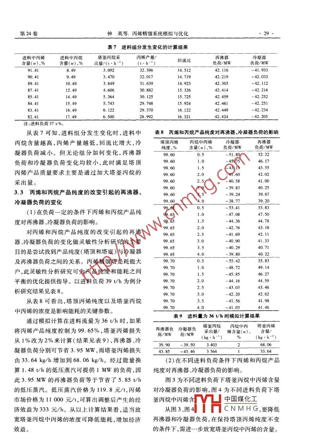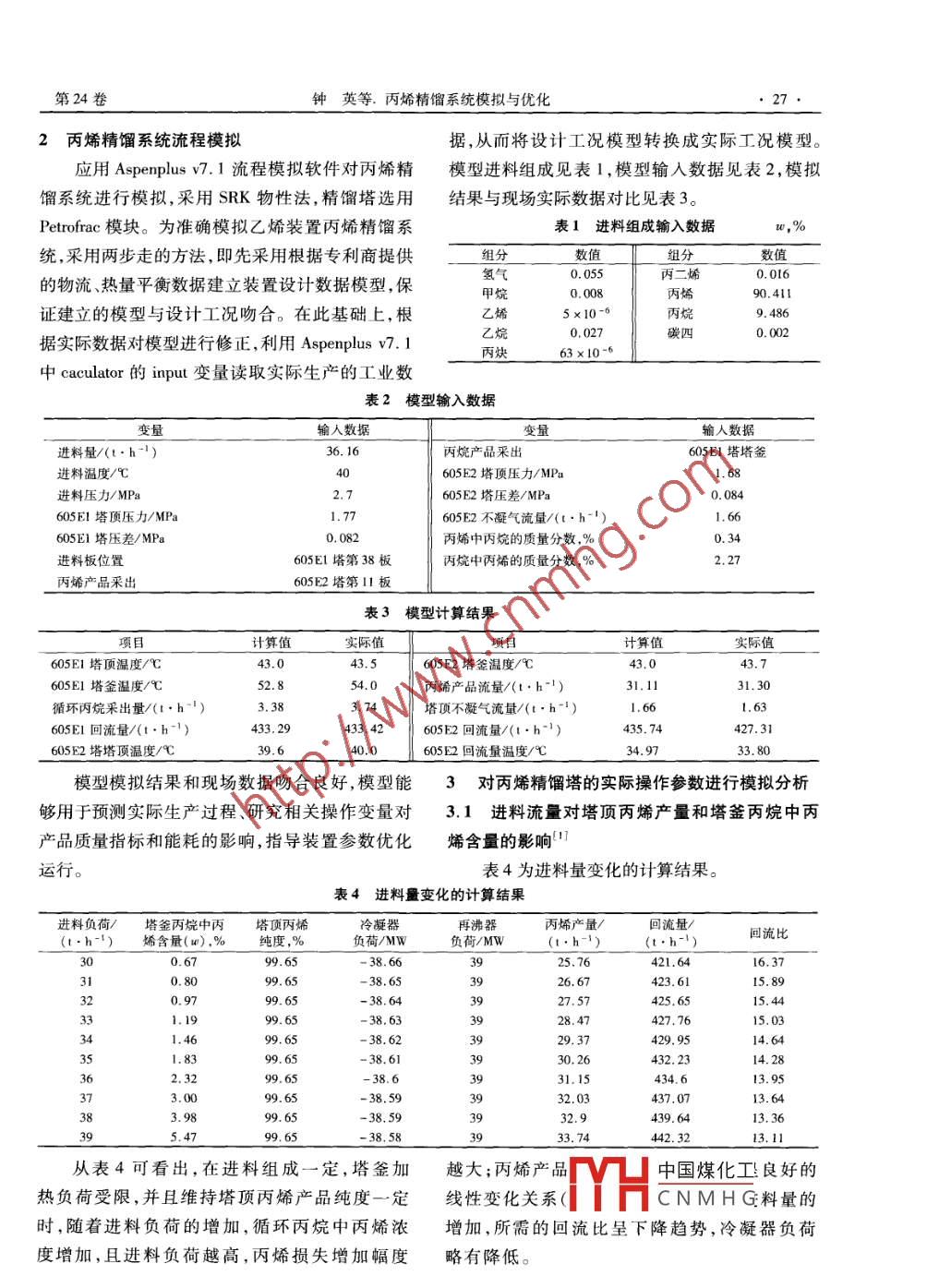 工業(yè)拉術乙烯工業(yè)2012,24(3)26ETHYLENE INDUSTRY丙烯精餾系統(tǒng)模擬與優(yōu)化鐘英,李兵,李懷玉(中國石油蘭州石化分公司,甘肅蘭州730060)摘要:基于丙烯精餾系統(tǒng)的實際運行教據(jù),利用 Aspenplus模擬軟件建立了能夠良姸描述裝置實際運行工況的模型,實現(xiàn)了對丙烯精餾過程的流程模擬。利用所建模型,研究了進料負荷、進料組威的變牝對丙烯產品產量、丙烷中丙烯濃度控制指標的影響以及對塔頂丙烯產品純度和丙炕中丙烯濃度指標所引起的冷凝器和再沸器負荷的變化做靈敏度分析,分別從控制回流比、嚴格控制產品質量純度和改變丙烷中丙烯的濃度指標方面提出了優(yōu)化建議。關鍵詞:丙烯丙烷模擬優(yōu)化丙烯精餾塔是乙烯裝置中較為特殊的一個1號丙烯精餾塔塔,因為丙烯和丙烷的相對揮發(fā)度非常小,分離要精餾塔不凝氣去脫「最進料來自丙烷塔求較高,丙烯精餾塔在整個分離過程中塔板數(shù)最多、回流比最大,其能量消耗也較高。在實際生產中,進料負荷或進料組成的變化以及外界干擾給丙烯精餾塔的穩(wěn)定操作和優(yōu)化帶來了極大不便。本文利用 Aspenplus模擬軟件建立丙烯精餾系統(tǒng)實際工況模型硏究丙烯精餾塔的進料負荷、進料去裂解爐聚合級丙烯產品組分的變化對丙烯產品產量和循環(huán)丙烷帶走的丙烯損失的影響,對塔頂丙烯產品純度和循環(huán)丙烷烯精餾系統(tǒng)流程示意中丙烯含量所引起的冷凝器和再沸器負荷的變化1.2實際運行情況做靈敏度分析,對丙烯精餾系統(tǒng)工藝變量進行尋隨著節(jié)能降耗工作的開展,裝置逐漸優(yōu)化裂解原料的投油結構,改善原料品質,提高了裂解爐優(yōu)輕質原料投用比例。目前輕質原料比例最高可達48.72%,且氣相原料通道由開車初期的3組,增1丙烯精餾系統(tǒng)簡介1流程簡介加至目前的7組。原料變輕,裂解氣輕組分增多,中國石油蘭州石化分公司(以下簡稱蘭化公特別是在滿負荷下投用IPG原料增加時,裂解氣司)460kta乙烯裝置丙烯精餾塔為雙塔系統(tǒng),包中的丙烷含量較高。受外界干擾,進料量一般在括2號丙烯精餾塔(605E1)和Ⅰ號丙烯精餾塔29~40th間變化,進料中的丙烯含量為82%~93%,丙烷含量在6%~17%間變化,影響丙烯精(605E2),605E1有129塊塔板,605E2有137塊塔餾塔的穩(wěn)定操作。板。來自MAPD反應器(601D)的進料(99.9%為碳三組分),從605E1的第38塊塔板進入。605E2第11板側線抽出純度為99.6%丙烯產品,塔釜丙中國煤化工作者石油大學化學工程與烷返回裂解爐作為裂解原料,丙烷中丙烯含量要YHCNMHG理工作,現(xiàn)為乙烯廠乙求控制在3%以下。流程見圖1。烯車間工藝技術員,工程師第24卷鐘英等.丙烯精餾系統(tǒng)模擬與優(yōu)化272丙烯精餾系統(tǒng)流程模擬據(jù),從而將設計工況模型轉換成實際工況模型。應用 Aspenplus.Ⅰ流程模擬軟件對丙烯精模型進料組成見表1,模型輸入數(shù)據(jù)見表2,模擬餾系統(tǒng)進行模擬,采用SRK物性法,精餾塔選用結果與現(xiàn)場實際數(shù)據(jù)對比見表3。Petrofrac模塊。為準確模擬乙烯裝置丙烯精餾系表1進料組成輸入數(shù)據(jù)統(tǒng),采用兩步走的方法,即先采用根據(jù)專利商提供數(shù)值數(shù)值的物流、熱量平衡數(shù)據(jù)建立裝置設計數(shù)據(jù)模型,保氫氣0.055丙二烯0.016甲烷0.00890.411證建立的模型與設計工況吻合。在此基礎上,根據(jù)實際數(shù)據(jù)對模型進行修正,利用 Aspenplus v70.027碳四0.00263×10-6中 caculator的 Input變量讀取實際生產的工業(yè)數(shù)表2模型輸入數(shù)據(jù)變量輸人數(shù)據(jù)變量輸人數(shù)據(jù)進料量/(th-1)36.16丙烷產品采出605E1塔塔釜進料溫度℃605E2塔頂壓力/MPa進料壓力/MP2.7605E2塔壓差/MPa0.084605El塔頂壓力/MPa605E2不凝氣流量/(t·h-1)605EI塔壓差/MPa丙烯中內烷的質量分數(shù),%進料板位置605E1塔第38板丙烷中丙烯的質量分數(shù),%丙烯產品采出605E2塔第11板表3模型計算結果項目計算值實際值計算值值605E1塔頂溫度/℃43.0605F2塔釜溫度/℃605E塔釜溫度/℃丙烯產品流量/(t·h-1)31.30循環(huán)丙烷采出量/(th)3.74塔頂不凝氣流量/(t·h-1)605E1回流量/(t·h-)605E2回流量/(t·h-)435.74605E2塔塔頂溫度/℃605E2回流量溫度/℃34.9模型模擬結果和現(xiàn)場數(shù)據(jù)吻合良好,模型能3對丙烯精餾塔的實際操作參數(shù)進行模擬分析夠用于預測實際生產過程、研究相關操作變量對3.1進料流量對塔頂丙烯產量和塔釜丙烷中丙產品質量指標和能耗的影響,指導裝置參數(shù)優(yōu)化烯含量的影響表4為進料量變化的計算結果。表4進料量變化的計算結果進料負荷/塔釜丙烷中丙塔頂丙烯再沸器丙烯產量/回流量(t·h-1)烯含量(w),%純度,%負荷/MW負荷/MW(th-1)回流比0.6799.6538.6625.76421.66.3726.670.9738.621.8399.6538.2.329999999999425.6528.47427.7615.0343231.15434.613.9599.6538.5932.9439.6413.3633.74442.32從表4可看出,在進料組成一定,塔釜加越大;丙烯產品V中國煤化工良好的熱負荷受限,并且維持塔頂丙烯產品純度一定線性變化關系CNMHG料量的時,隨著進料負荷的增加,循環(huán)丙烷中丙烯濃增加,所需的回流比呈下降趨勢,冷凝器負荷度增加,且進料負荷越高,丙烯損失增加幅度略有降低。乙烯工業(yè)第24卷若在進料量增加時,維持丙烯產品純度及丙塔頂丙烯產量烷中丙烯的濃度不變,計算結果見表5從表5可看出,要同時滿足丙烯產品純度及丙烷中丙烯的濃度要求,