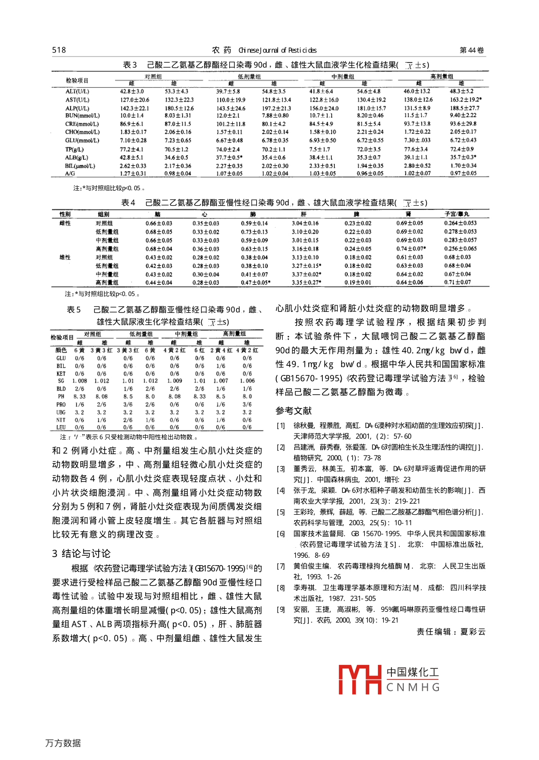 第44卷第11期農藥v.44№11205年11月Ci resen arrel d pesti ciNbM,2005毒性與殘留己酸二乙氨基乙醇酯亞慢性經(jīng)口毒性鄭先福1,孫炳劍2,鄭昊3河南農業(yè)大學基礎科學學院,鄭州450002;2河南農業(yè)大學植物保護學院,鄭州450002;鄭州鄭氏化工產(chǎn)品有限公司,鄭州450002)摘要按照妞B15670-1995的要求進行了己酸二乙氨基乙醇酯(DA6)90d的亞慢性經(jīng)口毒性試驗。結果顯示,與對照組相比,雌、雄性大鼠高劑量組的體重增長明顯減慢(p<0.05);雄性大鼠高劑量組AST、ALB兩項指標升高(p<0.05),肝、肺臟器系數(shù)增長(p<0.05)。高、中劑量組雌、雄性大鼠發(fā)生心肌小灶炎癥和腎臟小灶灸癥的動物數(shù)明顯增多。根據(jù)試驗結果,受檢樣品己酸二乙氨基乙醇酯對大鼠的無作用劑量為:雄性40.2m/ kg bw d,雌性49.1rg/ kg bw d。關鍵詞己酸二乙氨基乙醇酯,經(jīng)口亞慢性毒性中圖分類號:TQ450.2文獻標識碼:A文章編號:1006-0413(2005)11-516-03Subchronic Oral Toxicity of Hexanoic Acid 2-(diethylamino)ethyl Ester in RatsZHENG Xian-Fu, SUN Bing-Jian ZHENG HaoCollege of Basic Since, Henan Agricultural University, Zhengzhou 450002, China; College of Plant Protection, Henan AgriculturalUniversity, Zhengzhou 450002, China; Zhengzhou Zhengshi Chemical Production Co, Ltd, Zhengzhou 450002, China)Abstract: 90 days subchori c oral toxi ci ty of hexanoi c aci d2(d et hyl annno)et hyl est er was conduct ed i nrats basethe nati onal st andard GB15670-1995. The body wei ght of rats i n hi gh dose group were si gni fi cant ly less than those ofthe groups(p<0. 05). SerumAST, ALB were si gni fi cant l y i ncreased the coef fi ci ent of l i ver and l ung were i ncreased inal es exposed to the hi gh dose group(p0. 05). Local i nf I amat i on of cardi ac mscl e and l ocal i nf l amat i on of ki heywere i ncreased i n rat s exposed to the hi gh dose group and the mdd e dose group. The resu t shoved the 90-day oral noobserved- adversed-ef fect level(NDAEL)of hexanoi c aci d 2(d et hyl anino)et hyl ester i n w st ar rats was 40. 2ng/kgbwdral e), 49 1ng/kg bwdferalKey wor ds: hexanoi c aci d 2(di et hyl annno)ethyl ester, subchron c oral toxi city己酸二乙氨基乙醇酯(DA6)是一種新型的植物生長唯、雄大鼠各隨機分成對照、低劑量、中劑量和調節(jié)劑,具有很好的應用和市場前景1引,為明確己酸高劑量4組,每組10只動物。染毒途徑采用將受檢樣品二乙氨基乙醇酯對大鼠的90d亞慢性經(jīng)口毒性作用及其拌入鼠料中,壓成塊狀由大鼠經(jīng)口自行攝入的方法。受亞慢性無作用劑量,進行本試驗檢樣品在飼料中的含量依次為:0、754、3769、1材料與方法8462πg/kg,依據(jù)大鼠攝食量和體重計箅岀相應的雄、雌大鼠染毒劑量分別為:0、40.2、203.5、508.1mg/kg1.1受檢樣品性質bwd和0、49.1、252.1、602.7mg/ kg bw d。受檢樣品己酸二乙氨基乙醇酯為白色晶體,易溶于水,常溫保存(鄭州鄭氏化工產(chǎn)品有限公司提供)1.4試驗方法1.2試驗動物1.4.1體重與日常觀察每周用電子秤(日本 TANI TA公司生產(chǎn))稱量大鼠體健康wsta大鼠雄、雌性各40只,體重130150g,重;每日觀察大鼠的活動、進食及飲水情況,并記錄二級。購于中國藥品生物制品檢定所實驗動物中心。異常情況動物飼養(yǎng)于中國疾病預防控制中心二級動物室,室內溫度為23℃-26℃,相對濕度為40%60%,用中國軍1.42血常規(guī)及血清生化檢查事醫(yī)學科學院實驗動物中心提供的清潔級繁殖鼠料飼養(yǎng)試驗前全部動物、染毒結束時每組各取6只大鼠取觀察1周,自由取食和飲水尾血,用cel|l-Dy900自動血球記數(shù)儀(美國貝克公司生產(chǎn))測定紅細胞計數(shù)(×1012/L)白細胞計數(shù)(×109/L)及1.3動物分組和染毒劑量其分類和血紅蛋白含量等指標;同時取全部動物尾血以收稿日期:2004-07-21,修返日期:2005-07作者簡介:鄭先福(1967·),男,河南夏邑人,副教授,碩士,主要從事農作物化學控制研通訊作者:孫炳劍,電話:0371-3558170,E-mai:sb8624@ina.comYH中國煤化工CNMHG第11期鄭先福,等:已酸二乙氨基乙醇酯亞慢性經(jīng)口毒性5173000r/mn離心10mn,分離出血清,用日立7060型全化。取腦、心、肝、脾、肺、腎、腎上腺、睪自動生化分析儀(日本日立公司生產(chǎn))測定丙氨酸氨基轉丸或子宮測定其臟器系數(shù)移酶活性(ALT,酶動力法UL)、天門冬氨酸氨基轉移145病理檢查酶活性(AST,酶動力法U/L)、堿性磷酸酶活性(ALP對照、低劑量、中劑量各組各隨機取6只大鼠,酶動力法UL)、尿素氮含量(BUN,酶動力法m/L)、高劑量組取全部大鼠的腦、心、肝、脾、肺、腎肌酐含量(CRE,終點法μm{u)、膽固醇含量(CHO,腎上腺、睪丸、子宮、卵巢、胃、十二指腸等臟器終點法mm/L)、血糖含量(U,終點法mu)、總用10%福爾馬林固定,常規(guī)石臘包埋切片,HE染色蛋折含量(TP,終點法8/L)、白蛋白含量(ALB,終點光學顯微鏡檢查。法g/L)、總膽紅素含量(BIL,終點法μrol/凵)等指標。1.5數(shù)據(jù)統(tǒng)計與評價1.4.3尿常規(guī)檢查各項檢測數(shù)據(jù)用∝FICE97軟件 EXCEL中單因素方試驗結束前1d,每組各取6只大鼠分別留6h尿液差分析檢驗各項檢測結果的組間差異,以p<0.05判定為用尿分析儀( BAYER公司產(chǎn))和URS-10尿分析試紙測定尿的有顯著性。根據(jù)、《農藥登記毒理學試驗方法》顏色、尿糖(uGL∪、尿膽紅素(uBIL)、酮體(KET)、比重(SG、紅細胞(BLD)、pH值、尿蛋白(PRO、尿膽龍(B15670-1995)1規(guī)定的相關要求進行毒性評價。(UBG、亞硝酸鹽(NR)和白細胞(LEU等指標2結果1.4.4臟器檢査和臟器系數(shù)測定2.1體重變化情況試驗結