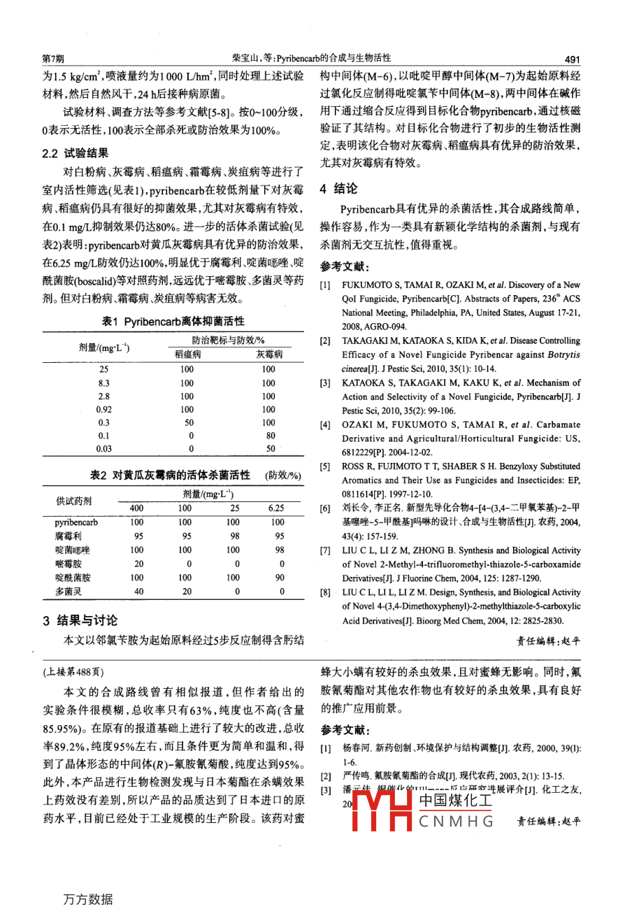 第50卷第7期農藥Vol. 50, No.72011年7月AGROCHEMICALSJul. 2011Pyribencarb的合成與生物活性柴寶山",田俊峰',孫旭峰' ,張金波',李志念',劉長令'(1.沈陽化工研究院有限公司新農藥創(chuàng)制與開發(fā)國家重點實驗室,沈陽10021; 2.鄭州大學化學系,鄭州450001)摘要:[目的] Pyribencarb是由 日本組合化學公司開發(fā)的一-類具 有新穎化學結構的QoI(quinone outsideinhibitor)殺菌劑。為研究該類殺菌化合物,探索了其合成方法并進行了生物活性測定。[方法]以鄰氯芐胺和6-甲基-2-吡啶甲醇為起始原料,共經過7步反應合成目標化合物pyribencarb,經核磁驗證其結構。[結果生物活性測定結果表明該化合物具有廣譜的殺菌活性,對灰霉病、稻瘟病具有較好的防治效果,尤其對灰霉病有特效。[結論] Pyribencarb具有優(yōu)異的殺菌活性,作為- -類具有新穎化學結構的殺菌劑,值得進-一步研究。關鍵詞:pyribencarb;合成;殺菌活性中圖分類號:TQ460.3文獻標志碼:A文章編號: 1006-0413(2011)07-0489-03Synthesis of Pyribencarb and lts BioactivityCHAI Bao-shan'2, TIAN Jun-feng , SUN Xu-feng' ZHANG Jin-bo', LI Zhinian', LIU Chang-lig'(1.State Key Laboratory of the Discovery and Development of Novel Pesticide, Shenyang Research Institute of Chemical IndustryCo, Ltd, Shenyang 10021, China; 2.Department of Chemistry, Zhengzhou University, Zhengzhou 450001, China)Abstract: [Aims] Pyribencarb is a new chemical class of QoI (quinone outside inhibitor) fungicides which was discoveredby KUMIAI chemical industry. To study this class of fungicide, the synthetic method and bio-adtivity were explored.[Methods] Pyribencarb was synthesized through seven steps from (2-chloropheny)methanamine and (6-methylpyridin-2-yl)methanol, and its structure was confirmed by 'H NMR. [Results] The test result showed that pyribencarb hasbroad spectrum fungicidal activity and good eficiency contolling gray mold, rice blas, especially against gay mold.[Conclusions] Pyribencarb provides potent fungicidal activity, it deserves further study asa kind of fungicide with novelchemical structure.Key words: pyribencartb; synthesis; fungicidal activityPyribencarb(試驗代號:KUF-1204,KIF-7767)是藥害 ,即將上市。-類具有新穎化學結構的QoI(quinone outside inhibitor)Pyribencarb的開發(fā),是以聯苯化合物1為先導,經過結殺菌劑,具有廣譜殺菌活性,特別是對灰霉病(Botrytis構修 飾,將苯環(huán)結構替換為具有肟醚結構的化合物2和化cinerea)和菌核病(Sclerotinia sclerotiorum)有特效 ,與其合物3 ,發(fā)現該類化合物對多種病害具有優(yōu)異的預防活性他QoI殺菌劑無交互抗性,并且對多種作物安全,無植物和治療活性 ,見圖1。XrKn圉1 Pyribencarb的創(chuàng)制經緯選擇以鄰氯芐胺為起始原料,經過?;Wo付克300(Varian)核磁共振儀(溶劑為CDCI, TMS為內標)。鄰氯?;擋;Wo?;s合等步驟合成目標化合物芐胺 、氯甲酸甲酯和鹽酸羥胺均為工業(yè)品,其余未加注明pyribencarb(見圖2),并對pyribencarb進行了室內生物活性均為市售化學試劑。測定。1.2 N-(2-氯芐基)乙酰胺(化合物M- -2)的合成1實驗部分將56.6 g(0.4 mol)鄰氯芐胺(M-1)慢慢滴加于裝有1.1儀器和試劑100 mI乙酸酐的后應瓶中.30 min滴加完畢,有明顯放熱現天津分析儀器廠生產的RY-1型熔點儀,Mercury象,反應中國煤化工水中,攪揮30 min,過YHCNMHG收稿日期:2011-02-10作者簡介:柴寶山(1982- -),男 ,遼寧盤錦人,在讀博士研究生,從事新農藥創(chuàng)制。Tel:024- 869270.E-mail:haibaoshan@l63.omo通訊作者:劉長令(1963-)。Tl024596978Emailiuchangling@vip.163.com490農藥AGROCHEMICALS第50卷濾得69.2 g白色固體(M-2),粗收率94.3%。H2NcrM-1M-2↓M-3一H2NCc個^M-5品N.OH>-fnstraLM-6CIpyribencarbM-7M-8圖2 Pyribencarb的合成路線1.3 N-(5-乙?;?-氯芐基)乙酰胺(化合物M-3)合成TLC監(jiān)測反應完畢。減壓脫溶,殘留物用乙酸乙酯/水萃取36.7 g(0.2 mol) N <(2-氯芐基)乙酰胺(M 2)于250 mL取 ,有機層干燥脫溶得1.03 g白色固體(化合物M-6),收率反應瓶中,加入80 mL二氯甲烷,室溫攪拌下分批加人83.3%。80.0 g(0.6 mo)三氯化鋁,然后慢慢滴加31.4 g(0.4 mol)乙1.7 2-(氯甲基)-6-甲基吡啶(化合物M- 8)的合成酰氯,1 h滴加完畢,升溫回流反應15 h,TLC監(jiān)測反應完畢。取0.26 g(2.1 mmol) 6-甲基-2-吡啶甲醇(M-7)于10 mL待反應液降至室溫后,倒人水中,并用二氯甲烷萃取,有機二氯甲烷中,慢慢加入0.35 g(2.9 mmol)氯化亞砜,室溫反層干燥,減壓脫溶,柱層析得27.1 g白色固體,收率60.0%,熔應過夜, TLC監(jiān)測反應完畢。減壓脫溶得土灰色固體,未點91~93 C。進一步處理直接用于下步反應。1.4 1-[3-(胺甲基)-4-氯苯基]乙酮(化合物M- 4)的合成1.8目標化合物pyribencarb的合成取20.0 g(0.09 mol) N-(5-乙?;?2-氯芐基)乙酰胺于裝有2-(氯甲基)-6-甲基吡啶(M-8)的反應瓶中加(M-3)于250 mL反應瓶中,加入80 mL濃鹽酸,升溫回流反入0.5 g(2 mmol) 2-氯-5-[1-(羥基亞氨基)乙基]芐基氨應6 h, TLC監(jiān)測反應完畢。減壓脫溶,得21.5 g灰褐色固體基甲酸甲酯(M-6),再加入0.9 g(6.5 mmol)碳酸鉀及8 mL(化合物M- 4),未經處理直接用于下步反應。DMF ,加熱80 C反應4 h, TLC監(jiān)測反應完畢。減壓脫溶,1.5 5-乙酰基-2-氯芐基氨基甲酸甲酯(化合物M-5)的柱層析得0.4 g白色固體收率55.3% ,熔點92~94 C,文合成獻93~96心4。'H NMR(300 MHz,CDCl,) 8:7.48~7.64(m,取21.5 g 1-[3-胺甲基)-4-氯苯基]乙酮(M-4)粗品3H,Ph-4,6-2H+Py-4-H).734-7.36(m,IH,Py-3-H),于250 mL反應瓶中,依次加入100 mL二氯甲烷和20.2g 79-7-7.m,H,W,-5-5),.7.-~7.C(m, 1H,Ph-3-H),(0.2 mol)三乙胺,室溫攪拌30 min,慢慢滴加氯甲酸甲酯5.34(br, 3H,OCH,+NH),4.44(d,J=6.0 Hz,2H, PhCH),10.4 g(0.11 mo),1 h滴加完畢,繼續(xù)攪拌S h,TLC