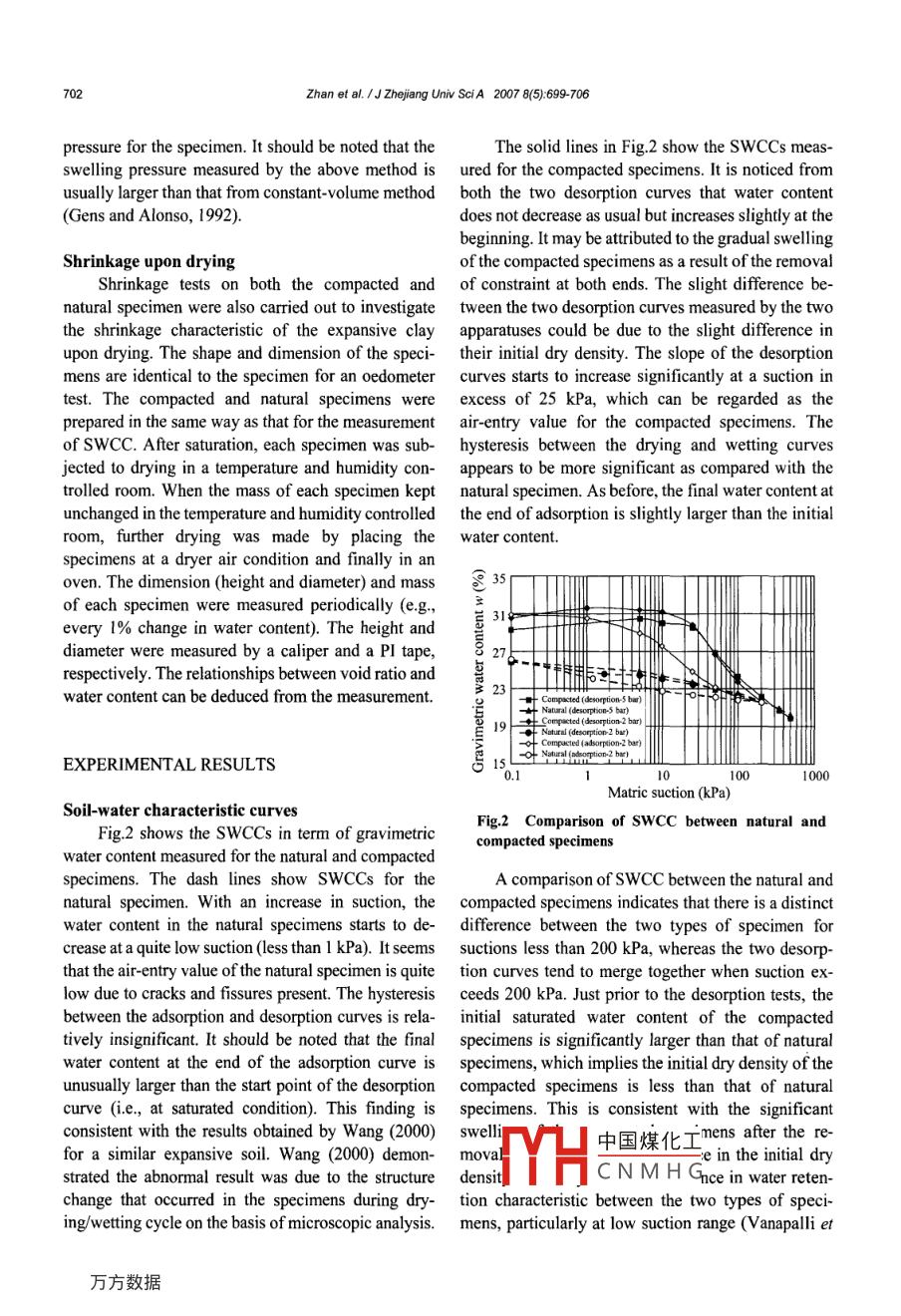 Zhan et al. 1J Zhejiang Univ SciA 2007 8(5):699-706699Journal of Zhejiang Unlversity SCIENCE AISSN 1673-565X (Prit; ISSN 1862- 1775 (Online)www.zju. educnjzus; www. springerink.comE-mail: jzus@zju.edu.cngZUSEffect of suction change on water content and total volumeof an expansive clay'ZHAN Liang-tongt", CHEN Ping', NG C.w.W.3('Department of Civil Engineering, Zhejiang University, Hangzhou 310027, China)(Department of Civil Engineering, Zhejiang Sci-Tech University, Hangzhou 310018, China)(Department ofCivil Engineering. Hong Kong University of Science and Technology, Hong Kong, China)E-mail: zhanlt@zju.edu.cn; chen_ 1230@yahoo.com.cnReceived Oct. 10, 2006; revision acepted Feb. 20, 2007Abstract: A laboratory study was carried out on both natural and compacted specimens to investigate the complex soil-waterinteraction in an unsaturated expansive clay. The laboratory study includes the measurement of soil-water characteristic curves, 1Dfree swelling tests, measurement of swelling pressure and shrinkage tests. The test results revealed that the air-entry value of thenatural specimen was quite low due to cracks and fissures present. The hydraulic hysteresis of the natural specimen was relativelyinsignificant as compared with the compacted specimen. Within a suction range 0 to 500 kPa, a bilinear relationship between freeswelling strain (or swelling pressure) and initial soil suction was observed for both the natural and compacted specimens. As aresult of over-consolidation and secondary structures such as cementation and cracks, the natural specimens exhibited significantlower swelling (or swelling pressure) than the compacted specimen. The change of matric suction exerts a more significant effecton the water phase than on the soil skeleton for this expansive clay.Key words: Expansive soil, Water content, Suction, Swelling, Shrinkagedoi:10.163 1/jzus.2007.A0699Document code: ACLC number: TU4INTRODUCTIONstrength and soil swelling (or a development ofswelling pressure under a confined condition). FieldExpansive clay is widely distributed in the world,studies show that the soil-water interaction inducedand often causes damages to light buildings, pave-by wetting-drying cycles is very complex, and in-ments, and slopes, which has been reported in manyvolves the coupled effects among the changes in wa-countries around the world (Nelson and Miller, 1992;ter content, suction, stress, deformation and shearLiu, 1997). The damage of expansive soils is closelystrength (Ng et al, 2003; Zhan, 2003). For example,related to the strong soil-water interaction in thethe wetting- induced swelling of an expansive clay is ashallow soil layers subject to seasonal wetting-drying function of initial suction (or initial water content),cycles. During dry seasons, evapotranspiration causes initial dry density and confining stress, with the as-loss of water content in the shallow soil layer, andsociated swelling pressure also depending on thehence the expansive soil shrinks and cracks. Duringstress-path employed in the tests (Brackley, 1975).wet seasons, rainfall infiltration results in an increaseA laboratory study was carried out on bothin water content and a decrease in soil suction in thenatural and compacted specimens to improve ourshallow soil layer, which leads to a reduction of shearunde中國(guó)煤化工-water interaction inanC N M H Ghe laboratory studyincluaes tne Tmeasurement 0I soll-water characteristic↓Corresponding author"Project No. 50408023) supported by National Natural Sciencecurves, free swelling tests, measurement of swellingFoundation of Chinapressure, and shrinkage tests. On the basis of the test00Zhan et al. 1J Zhejing Univ SciA 2007 8(5):699-706results, the relationships among matric suction, wateras 18.5%, with the maximum compaction pressurecontent and void ratio for the expansive soil werebeing 800 kPa. The dry density of the obtainedobtained, and the difference in the soil-water charac-specimens was equal to the average value of theteristic between natural and compacted specimensnatural specimens (i.e, 1.56 Mg/m ). The compactionwas identified.water content (i.e, 18.5%) was on the dry side of theoptimum water content. The optimum water contentas determined by the proctor compaction test wasMATERIALS AND SPECIMEN PREPARATION20.5%, corresponding to a maximum dry density ofMETHOD1.66 Mg/m'. After completion of preparation, theinitial suction of the natural specimens was measuredThe soil used in this laboratory study was aby a tensiometer, with the values ranging from 20 tobrownish-yellow expansive clay taken from the re-30 kPa. The initial suction of the compacted specimensearch slope in Zaoyang, Hubei of China (Ng et al,was measured by a high suction probe, with the2003). The basic physical properties of the soil aremeasured value being about 540 kPa (Zhan, 2003). Itpresented in Table 1. In accordance with the USCS was obvious that the difference in the initial suctionclassification system, the soil is clasified as a siltybetween the natural and compacted specimens is at-clay. With respect to expansion potential, the soil cantributable to the difference in their initial water con-be classified as a medium expansive soil in accor-tent.dance with the criterion proposed by Sridharan andFig.1 shows a comparison of the appearance ofPrakash (2000).natural and compacted specimens. The two specimensThe procedure for preparing natural specimenswere both in an air-drying state. Open cracks andincludes cutting appropriate size of soil blocks from fissures were well developed in the natural specimen,the block samples and then trimming them into di-whereas no obvious cracks appeared on the com-mensions ftting an oedometer ring (i.e, 70 mm in pacted specimen. In addition, there appeared somediameter and 19 mm in height). The compactedblack mottles on the natural specimen, which werespecimens were prepared with static compactionidentified as iron and manganese oxides (approxi-method. The compaction wate