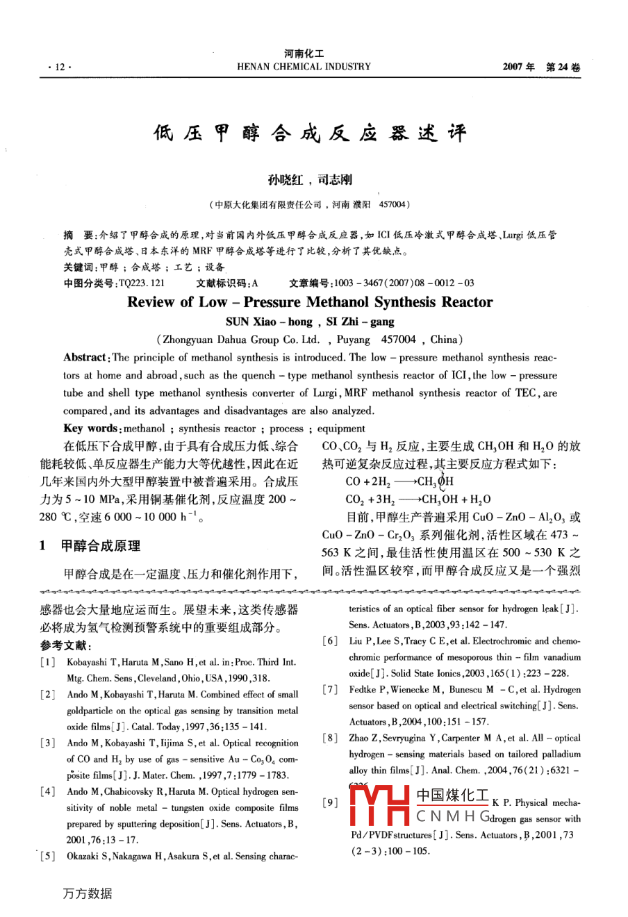 河南化工12HENAN CHEMICAL INDUSTRY2007年第24卷低壓甲醇合成反應(yīng)器述評孫曉紅,司志剛(中原大化集團(tuán)有限責(zé)任公司,河南濮陽457004)摘要:介紹了甲醇合成的原理,對當(dāng)前國內(nèi)外低壓甲醇合成反應(yīng)器,如lCI低壓冷激式甲醇合成塔、 Largi低壓管殼式甲醇合威塔、日本東洋的MRF甲醇合成塔等進(jìn)行了比較,分析了其優(yōu)缺點(diǎn)關(guān)鍵詞:甲醇;合成塔;工藝;設(shè)備中圖分類號:TQ223.121文獻(xiàn)標(biāo)識碼:A文章編號:1003-3467(2007)08-0012-03Review of Low -Pressure Methanol Synthesis ReactorSUN Xiao-hong, SI Zhi-gangZhongyuan Dahua Group Co Ltd. Puyang 457004, China)Abstract: The principle of methanol synthesis is introduced. The low-pressure methanol synthesis reacors at home and abroad, such as the quench-type methanol synthesis reactor of ICl, the low-pressuretube and shell type methanol synthesis converter of Lurgi, MRF methanol synthesis reactor of TEC,arecompared, and its advantages and disadvantages are also analyzedKey words: methanol synthesis reactor; process equipment在低壓下合成甲醇,由于具有合成壓力低綜合CO、CO2與H2反應(yīng),主要生成CH3OH和H2O的放能耗較低、單反應(yīng)器生產(chǎn)能力大等優(yōu)越性,因此在近熱可逆復(fù)雜反應(yīng)過程,其主要反應(yīng)方程式如下幾年來國內(nèi)外大型甲醇裝置中被普遍采用。合成壓CO+2H2-CH, H力為5-10MPa,采用銅基催化劑,反應(yīng)溫度200CO2+3H2—CH3OH+H2O280℃,空速6000-10000h1。目前,甲醇生產(chǎn)普遍采用CuO-ZnO-Al2O3或CuO-ZnO-Cr2O3系列催化劑,活性區(qū)域在4731甲醇合成原理563K之間,最佳活性使用溫區(qū)在500~530K之甲醇合成是在一定溫度壓力和催化劑作用下,間?;钚詼貐^(qū)較窄,而甲醇合成反應(yīng)又是一個(gè)強(qiáng)烈感器也會(huì)大量地應(yīng)運(yùn)而生。展望未來,這類傳感器eristics of an optical fiber sensor for hydrogen leak[JI必將成為氫氣檢測預(yù)警系統(tǒng)中的重要組成部分。Sens. Actuators. B. 2003.93: 142-147.參考文獻(xiàn):[6 Liu P, Lee S, Tracy C E, et al. Electrochromic and chemo-[1] Kobayashi T, Haruta M, Sano H, et al. in: Proc. Third Int.chromic performance ofrous thin-film vanadiumMtg. Chem. Sens, Cleveland, Ohio, USA, 1990, 318oxide[ J]. Solid State Ionics, 2003, 165(1): 223-228[2 Ando M, Kobayashi T, Haruta M. Combined effect of small[7 Fedtke P, Wienecke M, Bunescu M -C, et al. Hydrogengoldparticle on the optical gas sensing by transition metalr based on optical and electrical switching[ J].Sensoxide films[J]. Catal. Today, 1997, 36: 135-141Actuators,B,2004,100:151-157[3] Ando M, Kobayashi T, Iijima S, et al. Optical recognition[8 Zhao Z, Sevryugina Y, Carpenter M A, et al. All-opticalof CO and H, by use of gas-sensitive Au-Co, O4 comhydrogen-sensing materials based on tailored palladiumposite films[J].J Mater. Chem., 1997, 7: 1779-1783alloy thin films[ J]. Anal. Chem. 2004, 76(21): 6321[4] Ando M, Chabicovsky R, Haruta M Optical hydrogen sen中國煤化工itivity of noble metal -tungsten oxide composite films-K P Physical mecha-C NMHGdrogen gas sensor with2001,76:13-17Pd/PVDFstructures[ J]. Sens. Actuators, B, 2001, 73[5Okazaki S, Nakagawa H, Asakura S, et al. Sensing charac-(2-3):100-105第8期孫曉紅等:低壓甲醇合成反應(yīng)器述評放熱反應(yīng),雖然對化學(xué)反應(yīng)來說,溫度升高會(huì)使分子操作溫度250~260℃,操作壓力5~6MPa。該型運(yùn)動(dòng)加快,分子內(nèi)的有效碰撞增多,并使分子有效結(jié)式塔催化劑床層的溫差較小,操作比較平穩(wěn),轉(zhuǎn)化率合的機(jī)會(huì)增加,使甲醇合成反應(yīng)加快;但是由于CO、也較高,還能副產(chǎn)中壓蒸汽,但由于殼程占據(jù)了很大CO2與H2生成CH3OH的反應(yīng)是可逆放熱反應(yīng),隨的空間,催化劑的裝填系數(shù)小(僅35%)。這種塔為著溫度增高逆反應(yīng)的化學(xué)平衡常數(shù)增大,對甲醇生解決熱膨脹應(yīng)力問題,必須采用兩種不同膨脹系數(shù)成不利。因此,要求甲醇反應(yīng)放出的熱量,應(yīng)及時(shí)移的特殊的不銹鋼材質(zhì),管材需要進(jìn)口,供貨周期很走。另外,從上述化學(xué)反應(yīng)方程式可以看出,CO、長,設(shè)備造價(jià)也很高。CO2與H2生成CH3OH的反應(yīng)是一個(gè)體積縮小的反近年來為了適應(yīng)大型甲醇(2500td以上)生應(yīng),提高合成的壓力有利于反應(yīng);由于催化劑廠家開產(chǎn)的需要,Lurg公司開發(fā)了管殼式和冷管式合成塔發(fā)了高活性的催化劑,近年來,低壓甲醇合成工藝得串聯(lián)的組合型合成裝置,分別采用水冷和氣冷移熱,到了廣泛的應(yīng)用。預(yù)熱后的氣體從頂部離開,進(jìn)入管殼式合成塔的管2國內(nèi)外低壓甲醇合成塔介紹內(nèi)催化劑床層反應(yīng),管外通入鍋爐給水,沸騰后帶走熱量,出塔氣體進(jìn)入冷管式合成塔上部催化劑床層目前,國內(nèi)外使用的低壓甲醇塔主要有英國的繼續(xù)反應(yīng),出冷管的塔氣體回收熱量溫度降低后進(jìn)ICI絕熱型冷激塔、德國 Lurgi管殼式低壓合成塔、人甲醇分離器進(jìn)行分離。氣體作為循環(huán)氣進(jìn)行再循丹麥托普索低壓徑向合成塔、日本東洋(TC)工程環(huán),由于采用串聯(lián)式合成塔,故循環(huán)量比較小,可節(jié)公司MRF低壓合成塔、瑞士卡薩利MC低壓合成省能耗。Lugi工藝?yán)梅磻?yīng)熱副產(chǎn)中壓蒸汽,能較塔等。國內(nèi)開發(fā)的有華東理工大學(xué)絕熱等溫低壓合好的回收能量,其經(jīng)濟(jì)性和操作可靠程度更好。成塔等。2.3日本東洋的MRF甲醇合成塔