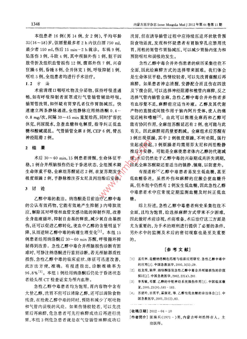 蒙古醫(yī)學雜志 Inner Mongolia Med J2012年第4卷第11期1347表2兩組患者療效比較(n,%)高濾過腎小球病理損傷及保護腎功能有明顯優(yōu)越顯效有效無效總有效率(%)性,并能抗腎纖維化,延緩腎小球硬化進展2。川治療組30芎嗪還可通過抑制血漿內(nèi)皮素的產(chǎn)生和抗脂質(zhì)過氧對照組30763.3化作用對腎功能具有保護作用3注:與對照組相比,"P<0.05本文通過兩組患者療效觀察,表明參芎葡萄糖注射液能有效降低慢性腎臟病患者的肌酐、尿素氮、討論血漿黏度、纖維蛋白原,對改善腎功能有一定療效。[參考文獻腎臟疾病多數(shù)存在凝血與纖溶障礙,在某種程度上影響疾病的治療與預后()。慢性腎臟病對其1武偉葉任高黃烈誠中西結(jié)合治療原發(fā)性腎病綜合征的臨床早期進行干預治療,延緩腎衰進展,尤為重要。研究[J]中國中西醫(yī)結(jié)合腎病雜志,2002,8(3):454-456[2]王亞平,李伯祥川芎嗪防治腎間質(zhì)纖維化的實驗研究[]中參芎葡萄糖注射液由鹽酸川芎嗪和丹參素組國中西醫(yī)結(jié)合腎臟病雜志,2002,3(2):77-78.成,現(xiàn)代藥理研究表明,丹參能增加腎臟血流量,提3]李中和劉章鎖邢國蘭川芎嚎對增殖性腎炎病人血漿內(nèi)皮素高腎臟對肌酐和自由基的清除率,能阻止凝血酶作和脂質(zhì)過氧化物的影響[J].中國新藥與臨床雜志,2002,21用于纖維蛋白原,抑制血小板聚集,降低血液黏稠(4):239-242度,緩解微血管痙攣,改善毛細血管的通透性和血液粘著力,糾正腎臟微循環(huán),從而改善腎功能(2。川收搞日期202-04-2芎嗪在改善血流流變性,改善微循環(huán)、降血脂、改善作者簡介]李瑞英(1976-),女,內(nèi)蒙古呼和浩特市人。在讀碩士研究生,主治醫(yī)師。急性乙醇中毒患者的麻醉處理張瑞兵(呼和浩特市玉泉區(qū)紅十字醫(yī)院麻醉科,內(nèi)蒙古呼和浩特010030)[摘要]目的:探討急性廴醇中毒患者圍術(shù)期的麻醉處理方法。方法:回顧我院急性辶醇中毒合并手術(shù)的患者16例,末前均清除口咽呼吸道分泌物,給予洗胃,開放兩組靜脈通道,靜注納絡酮0.4~0.8πg(shù)/次,并積極擴容、抗休克、脫水治療。本組病例全麻患者8例,CEP6例,背叢神經(jīng)隉滯2例。結(jié)杲:經(jīng)術(shù)前處理后30~60min15例患者清醒,1例合并顱腦損傷仍昏迷,全組圍術(shù)期生命體征平穩(wěn),全麻紐蘇醒廷遲2例結(jié)論:對急性廴醇中毒患者首選納洛酮靜脈注射,30~60min后蘇醒,呼吸循環(huán)抑制迅速改善。末前均應洗胃,減少了嘔吐物和氣管誤吸的風險??傊?良妤的圍術(shù)期處理和合理選擇麻醉方法,是安全實施手術(shù)避免意外的關(guān)鍵。[關(guān)鍵詞]辶醇中毒;麻醉;納洛酮中圖分類號]R595.6[文獻標識碼]B[論文編號]10040951(2012)11-134702急性乙醇中毒俗稱急性酒精中毒,飲入的乙醇因。急性乙醇中毒患者合并手術(shù)時,其麻醉風險嚴迅速在胃腸道吸收,飲酒后1~2h,血中濃度達高重提高,我院自2005-2010年治療急性乙醇中毒患峰。一次飲用乙醇75-80g,出現(xiàn)中毒,致死量為者合并手術(shù)16例,通過圍術(shù)期的認真處理,均順利250~500g。乙醇吸收后隨血液滲入內(nèi)臟和組織,完成手術(shù),麻醉結(jié)果滿意,無意外發(fā)生,現(xiàn)將體會報約90%的乙醇在組織中氧化成二氧化碳和水,其途道如下。經(jīng)腎臟、汗腺、唾液等排出。過量乙醇抑制大腦皮1對象和方法質(zhì),引起一系列精神神經(jīng)癥狀,抑制延髓呼吸中樞對心臟也有麻痹作用,呼吸中樞麻痹是主要致死原1.1對彖內(nèi)蒙古醫(yī)學雜志 Inner Mongolia Med J2012年第44卷第11期本組患者16例(男14例,女2例),平均年齡洗胃,但在誘導插管過程中應持續(xù)壓迫環(huán)狀軟骨預31(16-58)歲,飲酒量最多者2h內(nèi)飲白酒750ml,防食物返流,發(fā)現(xiàn)和懷疑患者有胃腸穿孔應禁用洗最少者150ml,傷后15min-2h就診。車禍9例,胃,用粗的胃管作胃腸減壓,可以減少胃腸內(nèi)張力和墜落傷3例,斗歐4例,其中顱腦外傷1例,軀干四預防嘔吐和誤吸的發(fā)生肢骨折及組織血管損傷12例,腹部外傷7例,興奮急性乙醇中毒合并外傷患者的病歷采集往往不狂躁6例,昏睡8例,合并休克1例,呼吸抑制1例,全面,因此給麻醉方式的選擇帶來困難。我們體會嘔吐5例,全組患者均進行手術(shù)治療。是生命體征平穩(wěn),傷情較輕者,可以先洗胃催醒后再1.2方法麻醉。如果患者神志清醒,安靜配合而且傷在四肢術(shù)前清理口咽嘔吐物及分泌物保持呼吸道通及下腹會陰,可以選擇神經(jīng)阻滯和椎管內(nèi)麻醉,反之暢,如有呼吸抑制者面罩或行氣管插管輔助呼吸。選擇氣管內(nèi)插管全麻,急性乙醇中毒合并外傷者多插胃管洗胃,如懷疑有胃穿孔者僅作胃腸減壓。快有血容量不足,麻醉前應適當補液。乙醇及其代謝速建立兩條靜脈通道,全組靜脈應用納洛酮0.4-產(chǎn)物的直接或間接作用于腦內(nèi)阿片受體,使人的痛0.8mg/次,間隔30~45min重復給藥,同時擴容抗覺遲鈍和嗜睡{3]。由此可以推理全麻藥和乙醇可休克,利尿脫水,急查血糖和電解質(zhì),指導糾正低血能有協(xié)同作用,全麻組蘇醒延遲有2例,也可能與此糖和酸堿混亂。氣管插管全麻8例,CEP6例,臂叢有關(guān)。因此麻醉用藥量要酌減。全麻組術(shù)后蘇醒有神經(jīng)阻滯2例。3例出現(xiàn)煩躁,其中2例極度煩躁,不聽勸阻,強行2結(jié)果坐起或站起,3例煩躁者均需用芬太尼和丙泊酚靜推后才安靜??赡苁侨槭够菡唧w內(nèi)