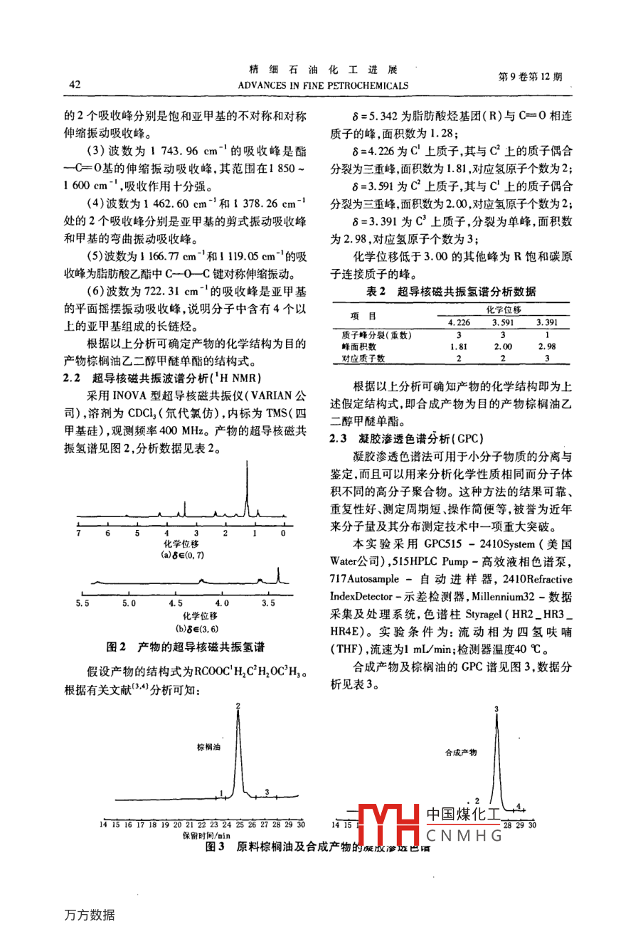 2008年12月姜斌等.生物柴油棕櫚油乙二醇甲醚酯的結(jié)構(gòu)分析41生物柴油棕櫚油乙二醇甲醚酯的結(jié)構(gòu)分析姜斌!杜謀濤!郭和軍王芳袁曉東2(1.西安洪慶高科技研究所西安710025;2.海軍后勤技術(shù)裝備研究所,北京100072)摘要以精制棕櫚油、乙二醇屮醚為原料,金屬鈉為催化劑,制備出一種新型生物柴油——棕橢油乙二醇甲醚單酯。采用F-R和HNMR對產(chǎn)物結(jié)構(gòu)進(jìn)行了表征。通過凝膠滲透色譜(GPC)法分析了原料棕櫚油及產(chǎn)物的分子量及其分布,證實(shí)了酯交換反應(yīng)對棕櫚油結(jié)構(gòu)的改變關(guān)鍵詞棕櫚油乙二醇甲醚酯生物柴油棕櫚油結(jié)構(gòu)分析隨著世界經(jīng)濟(jì)的快速發(fā)展,石油能源短缺所料,金屬鈉為催化劑,制備出新型生物柴油棕櫚油帶來的影響日益深刻,研究新型能源以逐漸取代乙二醇甲醚酯。本文報(bào)道了對該產(chǎn)物進(jìn)行的結(jié)構(gòu)石油的主導(dǎo)地位已經(jīng)成為各國研究的重點(diǎn)方向,分析。而生物柴油作為一種新型的可長期使用的清潔能1反應(yīng)原理源,已得到廣泛的應(yīng)用。為提高催化效率采用金屬鈉為催化劑,利用目前生物柴油大都以豆油和菜籽油為原料制堿催化酯交換反應(yīng),通過乙二醇甲醚將棕櫚油甘取其結(jié)構(gòu)僅含有一個(gè)酯基。棕櫚油是化工行業(yè)油三酯中的甘油取代下來,使1個(gè)甘油三酯分子的重要原料,來源充足;同時(shí)采用乙二醇甲醚為原轉(zhuǎn)變成3個(gè)長鏈脂肪酸單酯,甘油是副產(chǎn)物。反料,在生物柴油中引入一個(gè)醚基,可以增加生物柴應(yīng)后相對分子質(zhì)量減小,粘度降低,流動(dòng)性提高。油的含氧量。筆者以棕櫚油和乙二醇甲醚為原反應(yīng)簡式為:2 HOCH2CH2OCH3+ 2 Na--2 NaOCH2CH2OCH, +H2RICOOCH2RICOOCH2CH2OCH3CH, ONaR2 2 COOCH+3 NaOH2CH2OCH2-化劑H2RICOOCHR3COOCH CH2OCH3 CH2ONa棕櫚油棕櫚油乙二醇甲醚酯甘油鈉2產(chǎn)物的結(jié)構(gòu)分析表1紅外光譜數(shù)據(jù)2.1紅外光譜法分析(FT-IR基團(tuán)歸屬振動(dòng)類型吸收強(qiáng)度紅外光譜分析主要用來檢測產(chǎn)物中特征基2924.54CH2不對稱伸縮振動(dòng)強(qiáng)團(tuán)12)。采用 EQUINOX55型傅立葉變換紅外分2853.79對稱伸縮振動(dòng)強(qiáng)光光度計(jì),頻率范圍400031~39.259cm1,l743.961462.60剪式振動(dòng)鹽片材料為KBr。圖1為產(chǎn)物的紅外光譜,表1彎曲振動(dòng)列舉了產(chǎn)物的紅外光譜圖中的峰歸屬。1166.77C-0C反對稱伸縮振動(dòng)中等l119.05C-0-C對稱伸縮振動(dòng)中等平面搖擺振動(dòng)(1)波數(shù)為345889cm的吸收峰是醇的OH的伸縮振動(dòng)吸收峰,這可以說明提純產(chǎn)物中有少量反應(yīng)物乙二醇甲醚或水。(2)波數(shù)為2924.54cm和2853.79cm1中國煤化工3500300025002000波數(shù)/cm1CNMHG作事生物柴油的合成圖1產(chǎn)物的紅外光譜與性能研究精細(xì)石油化工進(jìn)展第9卷第12期ADVANCES IN FINE PETROCHEMICALS的2個(gè)吸收峰分別是飽和亞甲基的不對稱和對稱6=5.342為脂肪酸烴基團(tuán)(R)與C=0相連伸縮振動(dòng)吸收峰。質(zhì)子的峰,面積數(shù)為1.28;(3)波數(shù)為1743.96cm的吸收峰是酯6=4226為C上質(zhì)子,其與C2上的質(zhì)子偶合C=0基的伸縮振動(dòng)吸收峰,其范圍在1850~分裂為三重峰,面積數(shù)為1.81,對應(yīng)氫原子個(gè)數(shù)為2;1600cm-1,吸收作用十分強(qiáng)。6=3591為C2上質(zhì)子,其與C上的質(zhì)子偶合(4)波數(shù)為1462.60cm和1378,26cm-1分裂為三重峰,面積數(shù)為200,對應(yīng)氫原子個(gè)數(shù)為2處的2個(gè)吸收峰分別是亞甲基的剪式振動(dòng)吸收峰6=3.391為C上質(zhì)子,分裂為單峰,面積數(shù)和甲基的彎曲振動(dòng)吸收峰。為2.98,對應(yīng)氫原子個(gè)數(shù)為3;(5)波數(shù)為116677cm和11105cm-的吸化學(xué)位移低于3.00的其他峰為R飽和碳原收峰為脂肪酸乙酯中C-0_C鍵對稱伸縮振動(dòng)。子連接質(zhì)子的峰。(6)波數(shù)為722.31cm1的吸收峰是亞甲基表2超導(dǎo)核磁共振氫譜分析數(shù)據(jù)的平面搖擺振動(dòng)吸收峰,說明分子中含有4個(gè)以學(xué)位移上的亞甲基組成的長鏈烴。3.5913.391質(zhì)子峰分裂(重?cái)?shù))根據(jù)以上分析可確定產(chǎn)物的化學(xué)結(jié)構(gòu)為目的蜂面積數(shù)1.8I2.98產(chǎn)物棕櫚油乙二醇甲醚單酯的結(jié)構(gòu)式。對應(yīng)質(zhì)子數(shù)22超導(dǎo)核磁共振波譜分析(HNMR)采用NOA型超導(dǎo)核磁共振儀(Ⅴ ARIAN公根據(jù)以上分析可確知產(chǎn)物的化學(xué)結(jié)構(gòu)即為上述假定結(jié)構(gòu)式,即合成產(chǎn)物為目的產(chǎn)物棕櫚油乙司),溶劑為CDCl2(氖代氯仿),內(nèi)標(biāo)為TMS(四二醇甲醚單酯。甲基硅),觀測頻率400MHz。產(chǎn)物的超導(dǎo)核磁共2.3凝膠滲透色譜分析(GPC)振氫譜見圖2,分析數(shù)據(jù)見表2。凝膠滲透色譜法可用于小分子物質(zhì)的分離與鑒定,而且可以用來分析化學(xué)性質(zhì)相同而分子體積不同的高分子聚合物。這種方法的結(jié)果可靠、重復(fù)性好、測定周期短、操作簡便等,被譽(yù)為近年來分子量及其分布測定技術(shù)中一項(xiàng)重大突破?;瘜W(xué)位移本實(shí)驗(yàn)采用 GPC515-2410 System(美國a)d∈(,7)Waer公司),515 HPLC Pump-高效液相色譜泵717 Autosampler-自動(dòng)進(jìn)樣器,2410 Refractive5.54.54.0Index Detector-示差檢測器, Millennium32-數(shù)據(jù)化學(xué)位移采集及處理