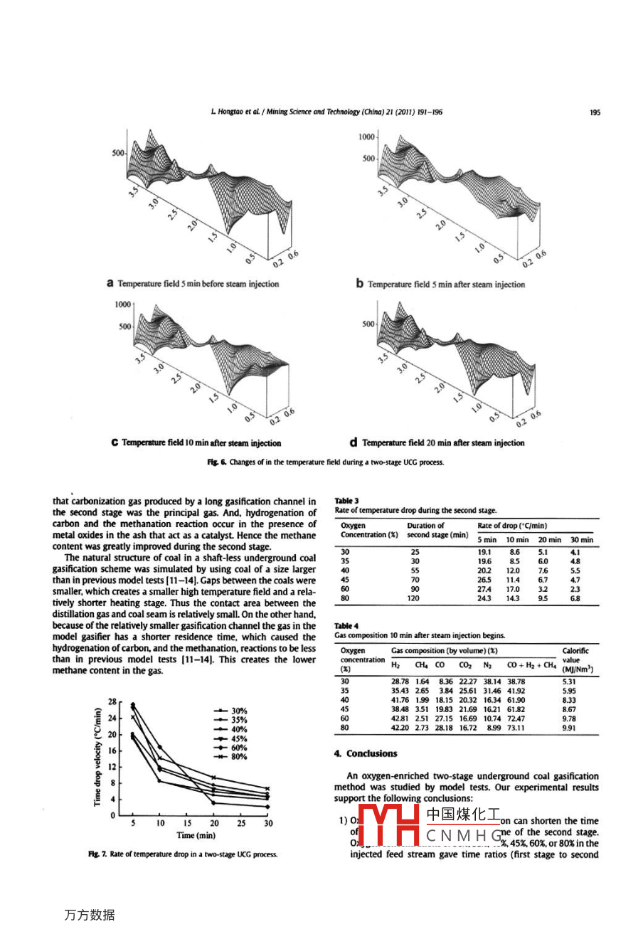 Mining Science and Technology( China)21(2011)191-196Contents lists available at Science DirectMining Science and Technology( China)ELSEVIERjournalhomepagewww.elsevier.com/locate/mstcMethod of oxygen-enriched two-stage underground coal gasificationLiu Hongtao.", Chen Fenga, Pan Xia Yao Kai, Liu Shuqinrory of Coal-Based Low Carbon Energy, ENN Group Co. Ltd, Langfang 065001, ChinaI of Chemical and Emvironmental Engineering China Universiy of Mining E Technology. Bed/ing 100083, ChinaARTICLE INF OABSTRACTTwo-stage underground coal gasificatas studied to improve the caloric value of the syngas and toAugust 2010extend gas production times. A model test using the oxygen-enriched two-stage coal gasification methodwas carried out. The composition of the gas produced, the time ratio of the two stages, and the role of thetemperature fieldthe time of the first stage and prolongs the time of the second stage. Feed oxygen concentrations of 30%35*, 40, 45% 60%, or 80% gave time ratios(first stage to second stage)of 1: 0. 12, 1: 0. 21, 1: 0.51, 1: 0.64.1: 0.90, and 1: 4.0 respectively. Cooling rates of the temperature field after steam injection decreased withUnderground coal gasificationtime from about 19 1-27, C/min to 23-6. Cmin. But this rate increased with increasing oxygenEnriched axygenconcentrations in the first stage. The caloric value of the syngas improves with increased axygenTwo-stage gasificatione first stage. Injection of 80% oxygen-enriched air gave gas with the highest caloricvalue and also gave theroduction time The caloric value of the gas obtained from the oxygen-enriched two-stage asifmethod lies in the range from 5.31 MJ/Nmto 10.54 MJ/Nmt o 2011 china University of Mining Technology. All rights reserved.Suncun and Feicheng Mines in Xinwen where syngas of a muchhigher caloric value was obtained than before[7-9). In the past,Underground Coal Gasification(UCG)is a process of producing tests used the two-stage air UCG method where the time of the firstcombustible gases by controlled coal combustion. It involves both stage, which increases the underground zone gasification temperheating and chemical effects on the coal and combines the ature, is very long and the ratio between the first and second stageprocesses of building coal mines, coal exploitation, and above. times was about 1.8: 1-2. 7: 1(9-18]ground gasification. This is a multi-disciplinary, new technology foThe heating time of the first stage is shortened, and the time ofobtaining energy and chemicals. UCG has the advantages of safety. the second stage that produces gas is extended by using oxygen-low investment, high efficiency, environmental soundness, and enriched air in our two-stage UCG model testswith first suggesting underground coal gasification in 1868, Since to simulate the underground coal seam[11-14]. Fissures betweenthen many outstanding works have been completed by scientists the coal blocks are excessive and allow blow by of gases, andworldwide [1]. Dozens of underground coal gasification stations fluctuations of gas composition, during the tests. This makes itthe Angren UCG station is still running today [2]. Research on Now large scale coal blocks(dimensions 0. 4 m x 0.8 m x 0.8 m)underground coal gasification technology has also been carried out have been used to simulate the underground coal seam Model testsin China but the caloric value of the syngas produced by using of the oxygen-enriched two-stage UCG method have been carriedconventional UCG methods is very low[3-6] Improving the caloric out and variations of timing of the two stages have been explored.value of the syngas was the goal of Yu Liet al who conducted "Long Expansion of the temperature field has also been studied.Tunnel, Large Section, and Two Stages"underground coal gasincation method research. Similar tests were conducted at the xinheNo. 2 Mine in Xuzhou, the Liuzhuang Mine in Tangshan, and the 2. ExpeCorresponding author. TeL: +86 316 2595070E-mailaddressliuliute126.com(lOrdossee front matter Copyright o 2011, China University of Mining TechnologyYH中國煤化工 m the lignite opencastCNMHGdo:lo016/jmsc201102018L Hongtao et aL /Mining Science and Technology(China)21(2011)191-196Table 1Proximate and ultimate analysis of Ordos lignite( by weight 3)Proximate analysisUltimate analysisA Val FCduf Cdaf Har Oaf Nur Saaf100944144575543845116.7101the experiment were 0. 4 m x 0.8 m x 0.8 m. The ultimate(C, H, ON, and S content) and proximate(total moisture, ash, and volatilematter) analysis of the lignite sample gave the results shown inTable 1( Fig. 1).2.2. Experimental reactorThe UCG model test reactor was designed in the shape ofcylinder with the external dimensions 7. 4 m(length)and 3.5 m(diameter)which is shown in Fig. 2. The hearth of the reactor ispoured refractory material and its outer wall is made of a special2 A schematic diagram of the underground coal gasification test system.steel used for pressure vessels. The reactor can work at hightemperatures, up to 1800"C, for long terms. The hearth of the the air is injected. Combustion in the coal seam is initiated, whichreactor is in the shape of a rectangular prism 5.0 m x 1.6 m x 1.6 m. produces heat that is stored in the coal seam. The temperatureFive inlet or outlet pipes, thirty-three temperature and pressurincreases within the gasifier in a stepwise way and forms an idealeasurement ports, and four peep holes for a closed circuit temperature field. In the second stage steam is injected. The reacndustrial television(CCTV)were installed in the reactor. Data is tion between steam and the incandescent coal seam producesmeasured online during the test and collected using a Distributed water gas with a high content of H2 and CO. Because the decom-Control System(DCS)(Honeywell)and saved to a hard disk. Theosition reaction is endothermic, so the temperature in the gasifierarious curves can be exported online from the DCS.The coal blocks were piled up to simulate an underground coal value the gasi