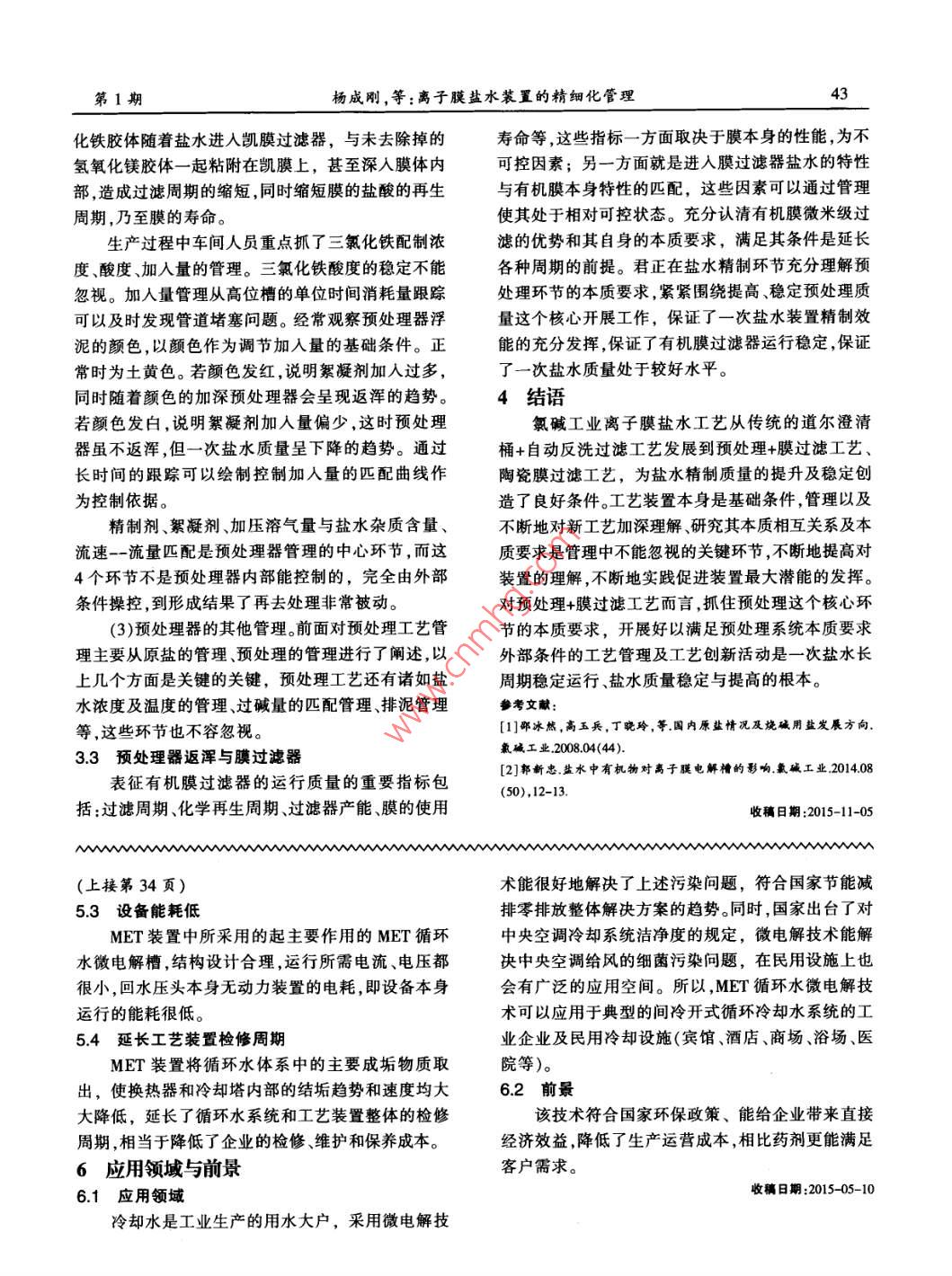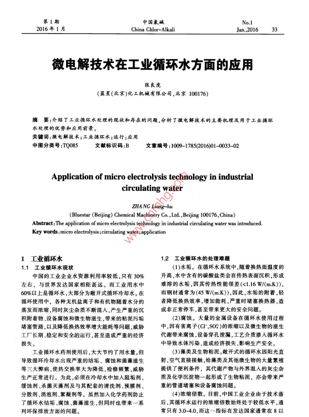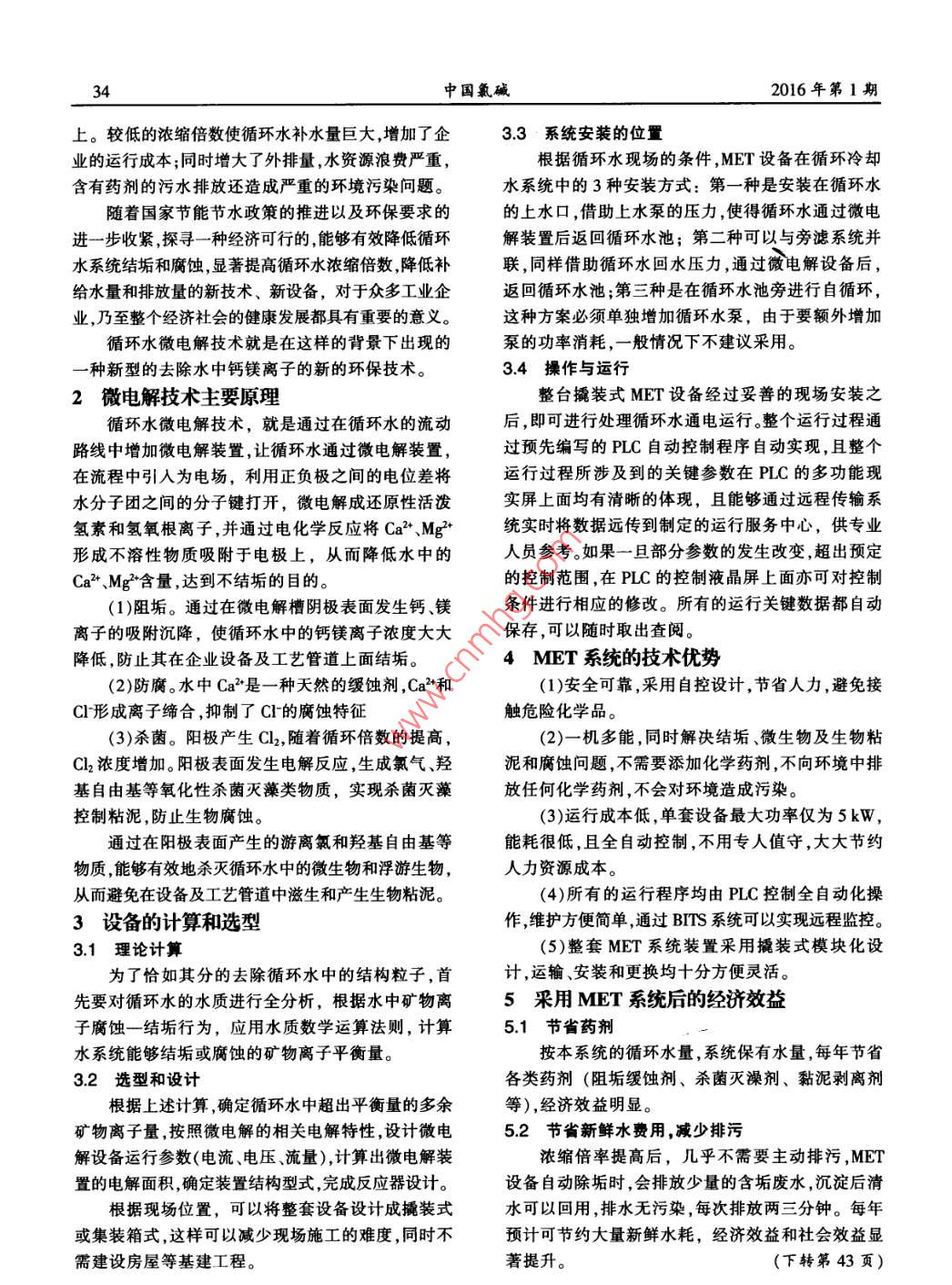第1期中國氯堿2016年1月China chlor-AlkaliJan,2016微電解技術(shù)在工業(yè)循環(huán)水方面的應用張良虎(藍星(北京)化工機械有限公司,北京100176)摘要:介紹了工業(yè)循環(huán)水處理的現(xiàn)狀和存在的問題,分析了微電解技術(shù)的主要機理及用于工業(yè)循環(huán)水處理的優(yōu)勢和應用前景。關(guān)鍵詞:微電解技術(shù);工業(yè)循環(huán)水;運行;應用中圖分類號:TQ085文獻標識碼B文章編號:1009-1785(201601-0033-02Application of micro electrolysis technology in industrialcirculating waterZHANG Liang-huBluestar(Beijing)Chemical Machinery Co., Ltd, Beijing 100176, China)Abstract: The application of micro electrolysis technology in industrial circulating water was introducedKey words: micro electrolysis; circulating water; application1工業(yè)循環(huán)水12工業(yè)循環(huán)水的處理難題11工業(yè)循環(huán)水現(xiàn)狀(1)水垢。在循環(huán)水系統(tǒng)中,隨著換熱面溫度的中國的工業(yè)企業(yè)水資源利用率較低,只有30%升高,水中含有的碳酸鹽類會在傳熱表面沉積,形成左右,與世界發(fā)達國家相距甚遠。而工業(yè)用水中難溶的水垢,因其傳熱性能很差(<116W/(mK)),60%以上是循環(huán)水,大部分為敞開式循環(huán)冷卻水。在而鋼材通常為(45W(mK),因此,水垢的附著,輕循環(huán)使用中,各種無機鹽離子和有機物隨著水分的者降低換熱效率,增加能耗,嚴重時堵塞換熱器,造蒸發(fā)而濃縮,同時灰塵雜質(zhì)不斷混入,產(chǎn)生嚴重的沉成非正常停車,甚至帶來更大的安全問題。積附著物、設備腐蝕和微生物滋生,帶來的粘泥污垢(2)腐蝕。大量的金屬設備在循環(huán)水使用過程堵塞管路,以及降低換熱效率增大能耗等問題,威脅中,因有害離子(C,SO)的濃縮以及微生物的滋生工廠長期、穩(wěn)定和安全的運行,甚至造成嚴重的經(jīng)濟代謝帶來腐蝕設備穿孔泄漏,工藝介質(zhì)滲人循環(huán)水損失。中導致水體污染,造成經(jīng)濟損失,影響生產(chǎn)安全。工業(yè)循環(huán)水藥劑使用后,大大節(jié)約了用水量。但(3)藻類及生物粘泥。敞開式的循環(huán)水因陽光直導致循環(huán)冷卻水出現(xiàn)嚴重的結(jié)垢、腐蝕和菌藻滋生射,空氣直接接觸,給藻類及其他微生物的大量繁殖等三大弊病,使熱交換率大為降低,檢修頻繁,威脅提供了便利條件,其代謝產(chǎn)物與外界混入的灰塵雜生產(chǎn)正常進行。為此,必須在冷卻水中加入阻垢劑、質(zhì)及化學沉淀物一起形成了生物粘泥,亦會帶來嚴緩蝕劑、殺菌滅藻劑及與其配套的清洗劑、預膜劑、重的管道堵塞和設備腐蝕問題。分散劑、消泡劑、絮凝劑等。雖然加入化學藥劑防止(4)濃縮倍數(shù)。目前,中國工業(yè)企業(yè)由于技術(shù)落了循環(huán)水結(jié)垢、腐蝕、菌藻滋生,但同時也帶來一系后,其循環(huán)水運行的濃縮倍數(shù)始終處于較低水平,通列環(huán)保排放方面的問題。常只有3.0~40,而這一指標在發(fā)達國家通常在8以中國氯硫2016年第1期上。較低的濃縮倍數(shù)使循環(huán)水補水量巨大,增加了企33系統(tǒng)安裝的位置業(yè)的運行成本;同時增大了外排量,水資源浪費嚴重根據(jù)循環(huán)水現(xiàn)場的條件,MET設備在循環(huán)冷卻含有藥劑的污水排放還造成嚴重的環(huán)境污染問題。水系統(tǒng)中的3種安裝方式:第一種是安裝在循環(huán)水隨著國家節(jié)能節(jié)水政策的推進以及環(huán)保要求的的土水口,借助上水泵的壓力,使得循環(huán)水通過微電進一步收緊探尋一種經(jīng)濟可行的能夠有效降低循環(huán)解裝置后返回循環(huán)水池;第二種可以與旁濾系統(tǒng)并水系統(tǒng)結(jié)垢和腐蝕,顯著提髙循環(huán)水濃縮倍數(shù)降低補聯(lián),同樣借助循環(huán)水回水壓力,通過微電解設備后,給水量和排放量的新技術(shù)、新設備,對于眾多工業(yè)企返回循環(huán)水池;第三種是在循環(huán)水池旁進行自循環(huán),業(yè),乃至整個經(jīng)濟社會的健康發(fā)展都具有重要的意義這種方案必須單獨增加循環(huán)水泵,由于要額外增加循環(huán)水微電解技術(shù)就是在這樣的背景下出現(xiàn)的泵的功率消耗,一般情況下不建議采用。種新型的去除水中鈣鎂離子的新的環(huán)保技術(shù)。34操作與運行2微電解技術(shù)主要原理整臺撬裝式MET設備經(jīng)過妥善的現(xiàn)場安裝之循環(huán)水微電解技術(shù),就是通過在循環(huán)水的流動后,即可進行處理循環(huán)水通電運行。整個運行過程通路線中增加微電解裝置,讓循環(huán)水通過微電解裝置,過預先編寫的PLC自動控制程序自動實現(xiàn),且整個在流程中引入為電場,利用正負極之間的電位差將運行過程所涉及到的關(guān)鍵參數(shù)在PLC的多功能現(xiàn)水分子團之間的分子鍵打開,微電解成還原性活潑實屏上面均有清晰的體現(xiàn),且能夠通過遠程傳輸系氫素和氫氧根離子,并通過電化學反應將Ca2Mg2統(tǒng)實時將數(shù)據(jù)遠傳到制定的運行服務中心,供專業(yè)形成不溶性物質(zhì)吸附于電極上,從而降低水中的員參考。如果一且部分參數(shù)的發(fā)生改變超出預定Ca2+Mg2含量,達到不結(jié)垢的目的。的控制范圍,在PLC的控制液晶屏上面亦可對控制(1)阻垢。通過在微電解槽陰極表面發(fā)生鈣鎂條件進行相應的修改。所有的運行關(guān)鍵數(shù)據(jù)都自動離子的吸附沉降,使循