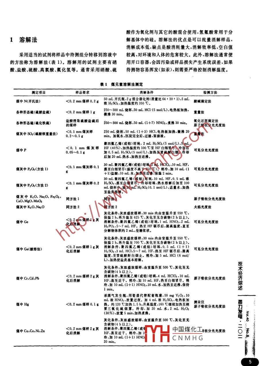 煤及煤灰消解技術(shù)綜述周桂萍',史傳紅21.國家電網(wǎng)技術(shù)學院發(fā)電與新能源培訓(xùn)部,山東濟南2500022.華電濰坊發(fā)電有限公司,山東濰坊261201[摘要] 對常用的煤和煤灰中元素檢測的消解方法如溶解法、熔融法和燃燒法的基本原理及在煤炭檢驗中的應(yīng)用情況進行了綜述。介紹了微波消解技術(shù)用于煤元素檢測的研究進展。相比于傳統(tǒng)的溶解法、熔融法和燃燒法,微波消解技術(shù)對樣品的消解時間大大編短,并且可一次處理多個樣品,使檢測效率大幅提高。[關(guān)鍵詞]煤;煤灰;溶解法;熔融法;燃燒法;微波消解;微波燃燒消解[中圈分類號] 0657[文獻標識碼] A[文章編號] 1002 - 364(2011)06 - 0004 -05[DOI編號] 10.3969/j. issn. 1002 - 3364. 2011. 06. 004REVIEW ON THE DIGESTION TECHNOLOGY OF COAL AND COAL ASHZHOU Guiping' ,SHI Chuanhong1. State Power Grid Technology College ,Jinan 250002 ,Shandong Province PRC2. Huadian Weifeng Power Generation Co Ltd, Weifang 261201 ,Shandong Province,PRCAbstract:The basic principle of commonly used digestion methods, including dissolving method,fusingmethod, and burning method, for detecting elemnts contained in coal and coal ash,as well as their ap-plication situation in coal inspection have been reviewed. The progress of studying adoptation of micro-wave degestion technology to detect elements contained in coal has been presented. Compared with theconventional dissolving method, fusing method, and burning method, the time used for digesting sam-ples by using microwave digestion technology has been greatly shortened, and many samples can be技handled at a time, making the efficiency of digestion to be enhanced by a big margin.經(jīng)Key words: coal; dissolving method; fusing method; burning method; microwave digestion; microwaveburning digestion煤中含有許多有害元素,在運輸、貯存、燃燒利用及煤灰樣轉(zhuǎn)化到溶液中,即對樣品進行消解處理。常勢過程中有害元素 會以氣體、飄塵或粉塵形態(tài)進人大氣,用的煤和煤灰消解方法有溶解法、熔融法和燃燒法具發(fā)或隨雨水等滲人土壤造成環(huán)境污染。 因此,對于發(fā)電有 消解時間短、殘?zhí)嫉汀悠房瞻字敌?、可批量消解等、?shù)電用煤除了進行日常的燃燒特性檢測以外,還需測定其優(yōu)點。微波消解技術(shù)利用微波產(chǎn)生熱量加熱試樣,目有機、無機元素的含量。測定這些元素需要將固體煤中國煤化工曹δCNMHG作者簡介:周桂萍(1970 -),山東日照人,理學博士,副教授,高工,從事電力化學和環(huán)保專業(yè)的教學與研究.E- mall; zhguiping@yahoo com. cn酸作為氧化劑與其它的酸混合使用,氫氟酸常用于分1溶解法解基體中的硅。溶解法的優(yōu)點是可以批量消解樣品,消解成本低,缺點是酸消耗量大,消解效率低,空白值采用適當?shù)脑噭悠分写郎y組分轉(zhuǎn)移到溶液中較高,對環(huán)境和人體的危害較大。此外,溶解法通常使的方法稱為溶解法(表1)。溶解用的試劑主要有硝用開口容器,會因污染或樣品損失產(chǎn)生系統(tǒng)誤差,如果酸、鹽酸、硫酸、高氯酸、氟化氫等。通常采用硝酸、硫待測物容易揮發(fā)(如汞),則需要嚴格控制消解溫度。裹1煤元素溶解法測定測定項目樣品要求.消解條件檢測方法50 mL開氏瓶,2g混合催化劑(質(zhì)量比64# 101 1),5 mL煤中N(開氏法)<0.2 mm煤樣0.2g濃H2SO, .加熱溫度約350 C。酸堿滴定法各種形態(tài)硫(硫酸鹽碗)<0.2 mm煤樣1g250~300 mL燒杯,50 mL HCI <5 mo/L).電熱板加熱,重量法微沸30 min.各種形態(tài)碗(碗化鐵碗)鹽酸授取碗酸鹽硫后250~300 ml燒杯,50 mL (1+7) HNO,煮佛30 min,氧化還原滴定法的煤樣原子吸收分光光度法煤灰中SO、(硫胺鋇重量法)<0.1 mm煤灰樣250 mL燒杯,50 mL (1+3) HCl,電熱板加熱,微沸200.2~0.5gmin.加氨水,沉淀完全后,過濾,留濾液.豪四氟乙烯(或鉑)坩堝,2 mL H2SO.(5 mol/L),5 mL<0. 1 mm煤灰樣HF (40%),加熱溫度約100乜至HF白煙暫盡。冷卻后煤中P0. 05~0.1 g加0.5 mL H2SO,(5 mo/L),加熱至冒硫酸白煙.冷卻可見分光光度法后加20 m熱水,加熱至近佛。.<0.1 mm煤灰樣0.130 mL聚四氟乙烯(或鉑)坩堝,2 mL HCIO, ,10 mL HF,煤灰中P:O%(方法1)蒸至白煙冒盡(溫度不高于250 C)。稍冷,加10 mL(1可見分光光度法30 mL聚四氟乙烯(或鉑)坩堝,10 mL HF,0.5 mL濃煤灰中P2O:(方法2)<0.1 mm煤灰樣0.2 H2SO,蒸至白煙冒盡。 冷卻坩堝,熱水溶解后加至100mL燒杯中,加20 mL H2SO,(0. 1 mol/L),適量水,加熱至鹽類溶解。煤灰中K:O, Na2O, FerO,局方法1聞方法1原于吸收分光光度法CaO,MgO,MnOr煤灰中KzO,NaxO同方法2火焰光度法灰化條件:灰皿盛放煤樣,30 min內(nèi)由室溫升至550 C,<0.2 mm煤樣1g灰保溫2 h.再升溫至625 C,灰化至無含碳物(2h以上)。煤中Ge消解條件:豪四氟乙烯(或鉑)坩堝,1 mL HNO3,2 mL可見分光光度法化后清解H3PO,5~7 mL HF.熱至HF驅(qū)盡后,提高溫度,直至.分解物體積約2 mL,呈糖漿狀。灰化條件:灰皿盛放煤樣,30 min內(nèi)由室溫升至550 C ,保溫2 h,再升溫至700 C.灰化至無含碳物(2 h以上)。<0.2 mm煤樣1g灰消解條件:秦四氟乙烯(或鉑)坩堝,0.5 mL (1+1)煤中Ga(酸溶法)化后消解H2S0,3 mL HC1.5~7 mL HF,熱至HF驅(qū)盡后,提高溫度,至胃硫酸酐白煙止。稍冷,加5 mL HC (6 mol/L) ,加熱使鹽類基本榕解。技灰化條件;灰皿盛放煤樣,由室溫升至500 C,灰化至無含碳物(4 h以上).<0.2 mm煤樣2g灰消解條件 :豪四氟乙烯(或鉑)坩堝,4 mL HCIO,10 mL煤中Cr,Cd,PbHF,蒸至近干。稍冷,加10 mL HF,熱至白煙冒盡。稍冷,加10 mL (1+1) HNO3,10 mL水,加熱至近佛,保持1 min.述汞蒸氣發(fā)生瓶,用瓷蓋代昝配套瓶塞,