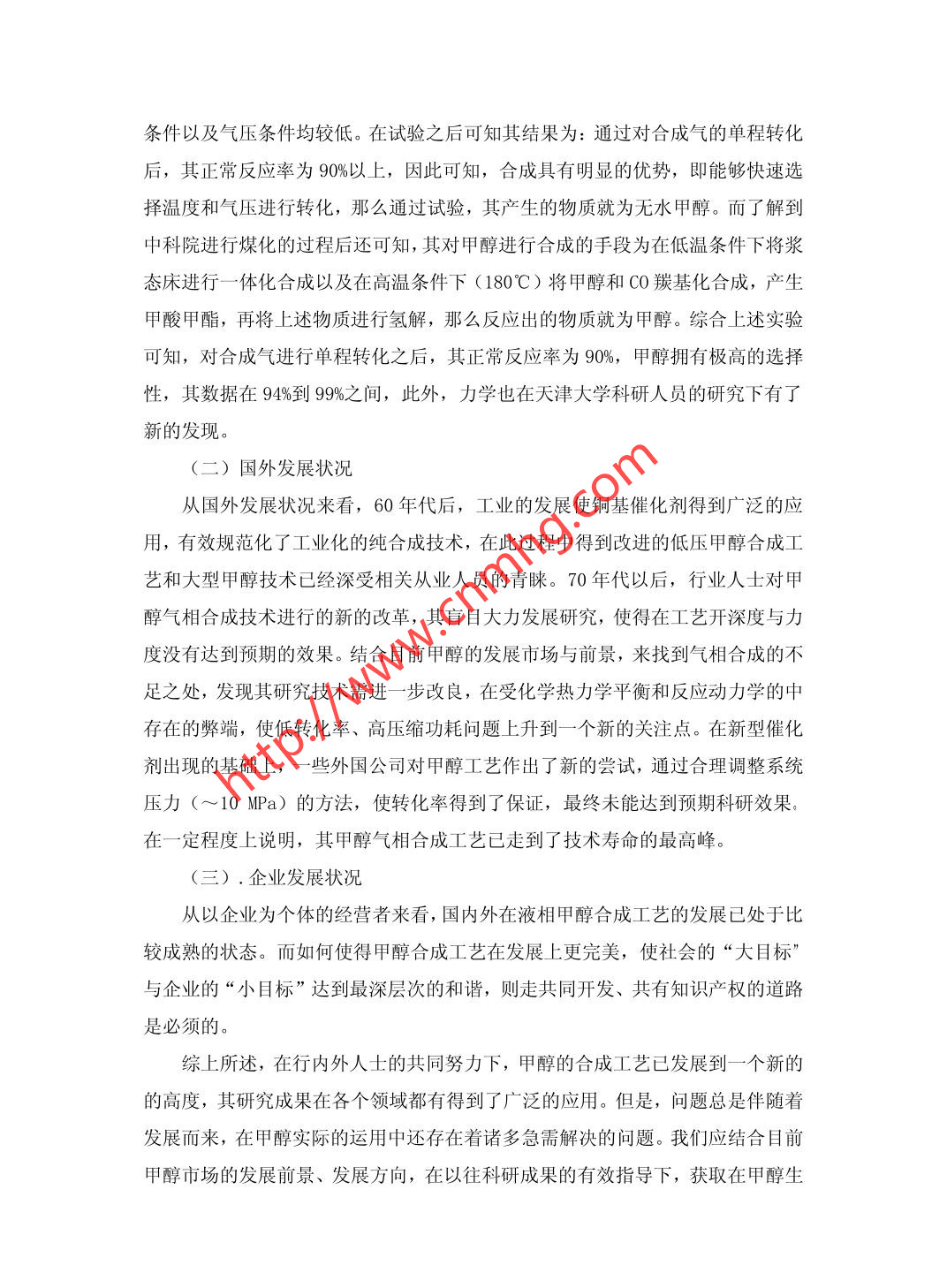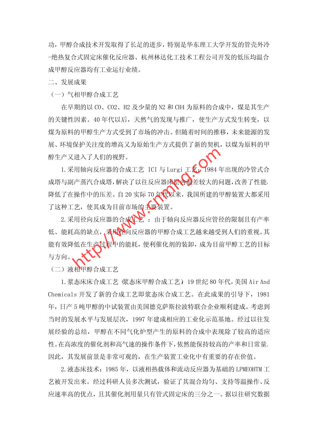 甲醇的合成工藝王娜河北東華冀衡化工有限公司河北 石家莊050000摘要:當(dāng)今時(shí)代甲醇已經(jīng)成為了一種用途十分廣泛的有機(jī)化學(xué)原料,它在社會生產(chǎn)中各個(gè)領(lǐng)域都有非常廣泛的應(yīng)用。本文主要分析我國現(xiàn)在甲醇合成技術(shù)的發(fā)展與展望。關(guān)鍵詞:甲醇合成工藝中途分類號: TQ042文獻(xiàn)標(biāo)識碼: I甲醇是-種具有多種用途的基本有機(jī)化工產(chǎn)品,除了在化工方面的多種應(yīng)用外,它還可以作為清潔燃料在汽車中代替汽油或與汽油摻混使用。另外,以其為飼料的微生物蛋白(SCP) 乃至食品添加劑都在深入的研究當(dāng)中。從現(xiàn)階段甲醇合成工藝的發(fā)展上來看,其合成工藝基本上是ICI、TOPSOE、Lurgi 及TEC等甲醇合成技術(shù)。一、甲醇合成工藝概述甲醇工業(yè)化始于20世紀(jì)初,1923 年德國BASF公司首先建立了一套采用Zn-Cr催化劑、合成壓力為30. 0MPa、規(guī)模為300噸/年的高壓法甲醇生產(chǎn)裝置。20世紀(jì)60年代,甲醇工業(yè)隨著選擇性好、低溫活性高的銅基催化劑開發(fā)成功而取得重大進(jìn)展。1966 年英國ICI公司研制成功Cu-Zn-Al催化劑后,推出ICI低壓甲醇合成工藝,在所屬Billingham 工廠建立了工業(yè)化裝置; 1971年德國Lurgi公司成功開發(fā)出采用活性更高的Cu-Zn-A1-V催化劑的另-一著名低壓法工藝-Lurgi工藝;此后,世界各大公司競相開發(fā)了各具特色的低壓法工藝技術(shù)。(一)國外工藝技術(shù)概況當(dāng)今大型:工業(yè)化甲醇合成工藝基本上采用氣相合成工藝,大型化甲醇反應(yīng)器和催化劑都在迅速發(fā)展。當(dāng)今世界占主導(dǎo)地位的大型甲醇合成專利技術(shù)有戴維、魯奇、托普索、卡薩利、三菱瓦斯及英國克瓦那等。(二)國內(nèi)工藝技術(shù)概況國內(nèi)在甲醇技術(shù)的開發(fā)和工業(yè)化也已有幾十年的歷史,但生產(chǎn)規(guī)模較小。近些年,隨著南化、西南化工研究院和南化研究院的低壓甲醇合成催化劑的開發(fā)成功,甲醇合成技術(shù)開發(fā)取得了長足的進(jìn)步,特別是華東理工大學(xué)開發(fā)的管殼外冷-絕熱復(fù)合式固定床催化反應(yīng)器、杭州林達(dá)化工技術(shù)工程公司開發(fā)的低壓均溫合成甲醇反應(yīng)器均有工業(yè)運(yùn)行業(yè)績。二、發(fā)展成果(一)氣相甲醇合成工藝在早期的以CO、C02、 H2及少量的N2和CH4為原料的合成中,煤是其生產(chǎn)的關(guān)鍵性因素。40 年代以后,天然氣的發(fā)現(xiàn)與推廣,使生產(chǎn)方式發(fā)生轉(zhuǎn)變,以煤為原料的甲醇生產(chǎn)方式受到了市場的沖擊。但隨著時(shí)間的推移,未來能源的發(fā)展、環(huán)境保護(hù)關(guān)注度的增高又為原始生產(chǎn)方式提供了新的契機(jī),以煤為原料的甲醇生產(chǎn)又進(jìn)入了人們的視野。1.采用軸向反應(yīng)器的合成工藝ICI 與Lurgi工藝: 1984 年出現(xiàn)的冷管式合成塔與副產(chǎn)蒸汽合成塔,解決了以往反應(yīng)器床層內(nèi)溫差較大的問題,改善了性能,降低了在操作中的壓差。自20實(shí)際70年代以來,我國所建的甲醇裝置大都采用了這種工藝,使其成為目前市場的主要裝置。2.采用徑向反應(yīng)器的合成工藝:由于軸向反應(yīng)器反應(yīng)管徑的限制且有產(chǎn)率低、能耗高的缺點(diǎn),采用徑向反應(yīng)器的甲醇合成工藝越來越受到人們的重視。其能有效降低在生產(chǎn)過程中的能耗,便利催化劑的裝卸,成為目前甲醇工藝的目標(biāo)與方向。(二)液相甲醇合成工藝1.漿態(tài)床床合成工藝漿態(tài)床甲醇合成工藝) 19世紀(jì)80年代,美國Air AndChemicals開發(fā)了新的合成工藝即漿態(tài)床合成工藝。在此成果的引導(dǎo)下,1981年,日產(chǎn)5噸甲醇的中試裝置由美國德克薩斯拉波特聯(lián)合企業(yè)順利建成。考慮到當(dāng)時(shí)的發(fā)展水平與發(fā)展層次,1997 年建成相應(yīng)的工業(yè)化示范基地。經(jīng)過以往發(fā)展經(jīng)驗(yàn)的總結(jié),甲醇在不同氣化爐型產(chǎn)生的原料的合成中表現(xiàn)除了較高的適應(yīng)性。在高濃度的催化劑和高氣速的操作條件下,依然能保持較高的產(chǎn)率和日常量。因此,其發(fā)展前景是非??捎^的,在生產(chǎn)裝置工業(yè)化中有重要的存在價(jià)值。2.液態(tài)床技術(shù):1985年,以液相熱載體和流動反應(yīng)器為基礎(chǔ)的LPMEOHTM工藝被開發(fā)出來。經(jīng)過科研人員多次測試,驗(yàn)證了其混合均勻、支持等溫操作、反應(yīng)速率高的優(yōu)點(diǎn),且其催化劑用量只有管式固定床的三分之一。據(jù)以往研究數(shù)據(jù)發(fā)現(xiàn),漿態(tài)床反應(yīng)器中催化劑懸浮量過大會造成了其沉降與團(tuán)聚。鑒于此,1990年,在科研人員有目標(biāo)性的研究下,滴流床合成甲醇方法出現(xiàn)了。滴流床性能全面,其囊括了漿態(tài)床和固定床的所有優(yōu)點(diǎn),且在催化劑裝填量大以及床層中物料的流動中作出了新的改良。較以往成果來看,在轉(zhuǎn)化率依據(jù)溫度反應(yīng)上具有優(yōu)越性,因此更符合低氫碳比的制造要求。(三)超臨界相介質(zhì)近幾年,超臨界相介質(zhì)中合成甲醇工藝技術(shù)得到了持續(xù)的發(fā)展,其成果越來越受到人們關(guān)注。隨著研究深入,其在反應(yīng)平衡和生產(chǎn)率上達(dá)到了新突