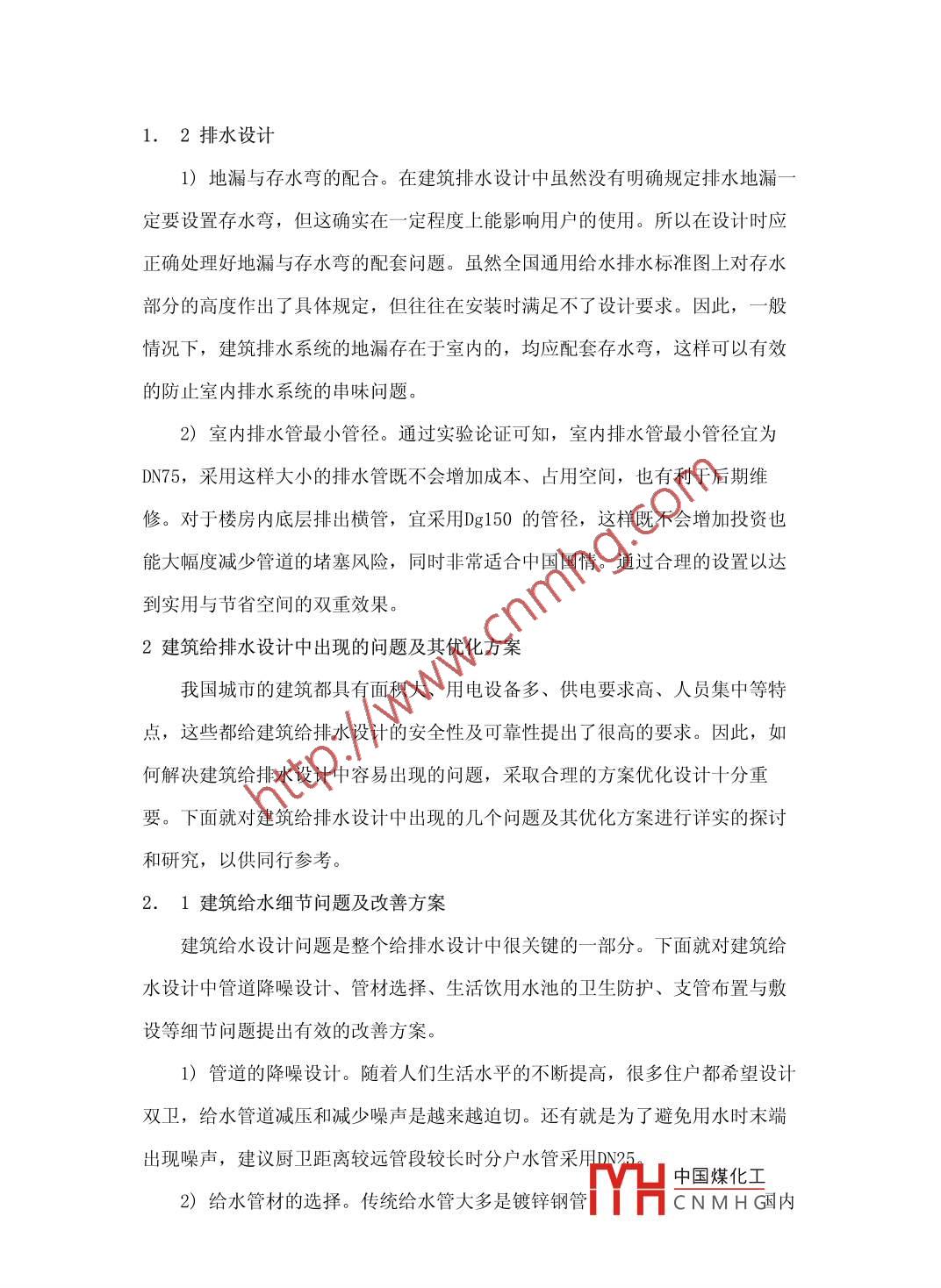 分析建筑給排水設(shè)計(jì)的優(yōu)化設(shè)計(jì)廖修文景紅莉機(jī)械工業(yè) 第六設(shè)計(jì)研究院有限公司摘要:在新世紀(jì),構(gòu)建經(jīng)濟(jì)節(jié)約型和環(huán)境友好型社會(huì)的主題不斷的深入到社會(huì)各個(gè)行業(yè)及人們的生活,建筑給排水設(shè)計(jì)人員必須緊跟時(shí)代,與時(shí)俱進(jìn),正視新情況和新問(wèn)題,并勇于挑戰(zhàn)。具體而言,應(yīng)從設(shè)計(jì)過(guò)程的各個(gè)細(xì)節(jié)嚴(yán)格把關(guān),不斷從工作實(shí)踐中總結(jié)經(jīng)驗(yàn),不斷研究新情況,解決新問(wèn)題,不斷完善設(shè)計(jì)技術(shù),以更好地適應(yīng)建筑業(yè)蓬勃發(fā)展的今天對(duì)建筑給排水設(shè)計(jì)提出的新要求,實(shí)現(xiàn)全面均衡、務(wù)實(shí)安全、可持續(xù)發(fā)展戰(zhàn)略。關(guān)鍵詞:建筑給排水;優(yōu)化設(shè)計(jì);常見(jiàn)問(wèn)題中圖分類(lèi)號(hào): TL353+.2文獻(xiàn)標(biāo)識(shí)碼: A文章編號(hào):1建筑給排水設(shè)計(jì)各個(gè)環(huán)節(jié)的作用1. 1給水設(shè)計(jì)1)自動(dòng)排氣閥。自動(dòng)排氣閥通常作用于延時(shí)自閉閥蹲式大便器的供水系統(tǒng),如辦公樓、學(xué)校、酒店等,管道系統(tǒng)的頂層自動(dòng)排氣閥最好裝置在管道的最高點(diǎn)。延時(shí)自閉閥能很好地控制流量,但無(wú)法控制氣流。當(dāng)系統(tǒng)停水,給水管內(nèi)通常會(huì)積累大量的空氣?;謴?fù)供水管道的空氣將被壓縮至水管道系統(tǒng)的頂部,形成一個(gè)壓縮空氣區(qū)。此時(shí)如果有人再按下延時(shí)自閉閥的按鈕,則會(huì)將便器內(nèi)的污物隨氣流帶至地面或?qū)⑽蹪n濺到使用者身上。2)戶(hù)外控制閥門(mén)。適當(dāng)增設(shè)單體建筑戶(hù)外控制閥門(mén)在住宅給水設(shè)計(jì)中立管底部的給水閥門(mén)是必不可少的,這一 ~措 施增加之后當(dāng)?shù)讓幼?hù)發(fā)現(xiàn)下水管堵塞引起地面冒水時(shí),可及時(shí)關(guān)閉給水總閥,從而有效減少排污量。3)室外閥門(mén)。注意室外閥門(mén)的安裝形式,大部分室外安裝的閥門(mén)口徑都是Dg7以上的,可以采用截止閥、閘板閥或蝶閥等。一 般均是法蘭安裝,而且有國(guó)家標(biāo)準(zhǔn)圖。值得注意的是,設(shè)計(jì)時(shí)在每--個(gè)法蘭連接閥處設(shè)--個(gè)伸縮器則可以解決這一-問(wèn)題。中國(guó)煤化工MYHCNMH G1.2排水設(shè)計(jì)1)地漏與存水彎的配合。在建筑排水設(shè)計(jì)中雖然沒(méi)有明確規(guī)定排水地漏定要設(shè)置存水彎,但這確實(shí)在一-定 程度上能影響用戶(hù)的使用。所以在設(shè)計(jì)時(shí)應(yīng)正確處理好地漏與存水彎的配套問(wèn)題。雖然全國(guó)通用給水排水標(biāo)準(zhǔn)圖上對(duì)存水部分的高度作出了具體規(guī)定,但往往在安裝時(shí)滿(mǎn)足不了設(shè)計(jì)要求。因此,- -般情況下,建筑排水系統(tǒng)的地漏存在于室內(nèi)的,均應(yīng)配套存水彎,這樣可以有效的防止室內(nèi)排水系統(tǒng)的串味問(wèn)題。2)室內(nèi)排水管最小管徑。通過(guò)實(shí)驗(yàn)論證可知,室內(nèi)排水管最小管徑宜為DN75,采用這樣大小的排水管既不會(huì)增加成本、占用空間,也有利于后期維修。對(duì)于樓房?jī)?nèi)底層排出橫管,宜采用Dg150的管徑,這樣既不會(huì)增加投資也能大幅度減少管道的堵塞風(fēng)險(xiǎn),同時(shí)非常適合中國(guó)國(guó)情。通過(guò)合理的設(shè)置以達(dá)到實(shí)用與節(jié)省空間的雙重效果。2建筑給排水設(shè)計(jì)中出現(xiàn)的問(wèn)題及其優(yōu)化方案我國(guó)城市的建筑都具有面積大、用電設(shè)備多、供電要求高、人員集中等特點(diǎn),這些都給建筑給排水設(shè)計(jì)的安全性及可靠性提出了很高的要求。因此,如何解決建筑給排水設(shè)計(jì)中容易出現(xiàn)的問(wèn)題,采取合理的方案優(yōu)化設(shè)計(jì)十分重要。下面就對(duì)建筑給排水設(shè)計(jì)中出現(xiàn)的幾個(gè)問(wèn)題及其優(yōu)化方案進(jìn)行詳實(shí)的探討和研究,以供同行參考。2.1建筑給水細(xì)節(jié)問(wèn)題及改善方案建筑給水設(shè)計(jì)問(wèn)題是整個(gè)給排水設(shè)計(jì)中很關(guān)鍵的一部分。下面就對(duì)建筑給水設(shè)計(jì)中管道降噪設(shè)計(jì)、管材選擇、生活飲用水池的衛(wèi)生防護(hù)、支管布置與敷設(shè)等細(xì)節(jié)問(wèn)題提出有效的改善方案。1)管道的降噪設(shè)計(jì)。隨著人們生活水平的不斷提高,很多住戶(hù)都希望設(shè)計(jì)雙衛(wèi),給水管道減壓和減少噪聲是越來(lái)越迫切。還有就是為了避免用水時(shí)末端出現(xiàn)噪聲,建議廚衛(wèi)距離較遠(yuǎn)管段較長(zhǎng)時(shí)分戶(hù)水管采用DN25..中國(guó)煤化工2)給水管材的選擇。傳統(tǒng)給水管大多是鍍鋅鋼管MHCNMHG國(guó)內(nèi)水路運(yùn)輸不能滿(mǎn)足水質(zhì)衛(wèi)生標(biāo)準(zhǔn)。因而為了滿(mǎn)足標(biāo)準(zhǔn)要求,應(yīng)選擇最佳的、最優(yōu)質(zhì)的給水管材。與金屬管相較之,塑料給水管的優(yōu)勢(shì)則更加明顯,一-般而 言塑料給水管不僅重量輕、耐壓強(qiáng)度好,而且安裝方便,省鋼節(jié)能,使用壽命又長(zhǎng)。因此,建設(shè)部應(yīng)大力推廣使用塑料給水管。3)