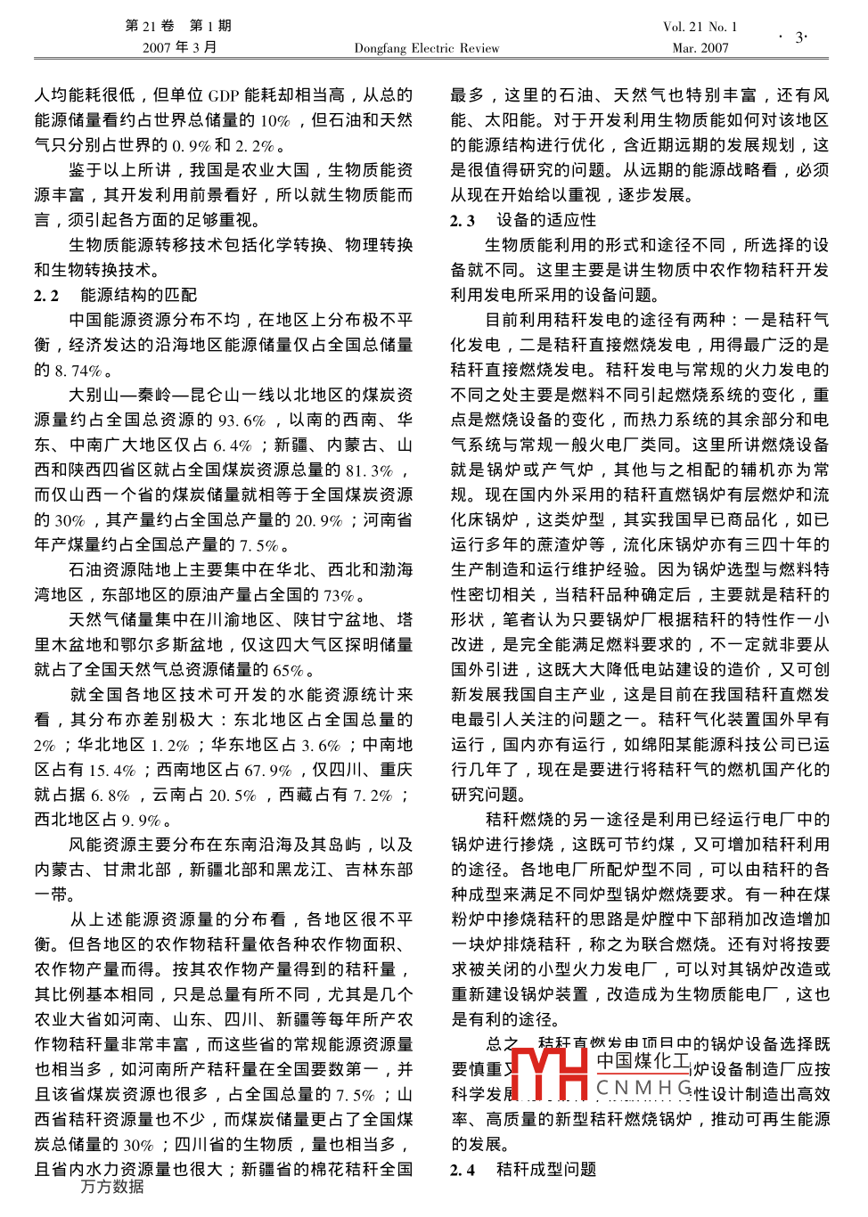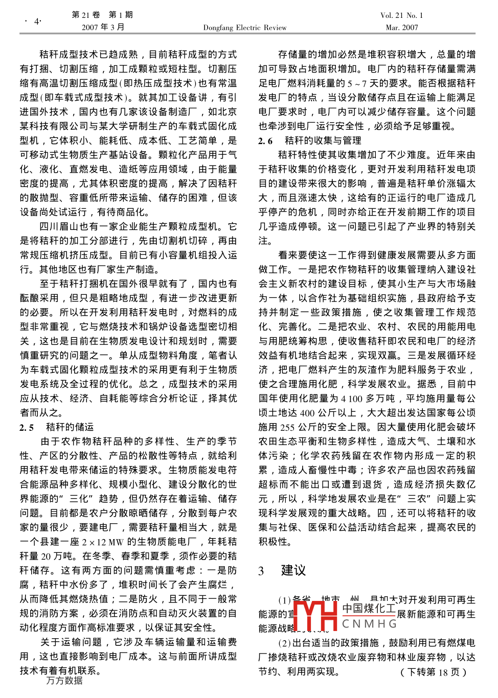 第21卷第1期007年3月Dongfang Electric ReviMar.2007生物質(zhì)能(秸稈)發(fā)電的思考閆廷滿(四川省電力設(shè)計(jì)院,四川成都,610072)摘要:簡要說明了由于石化能源在地球上資源量旳有限性,必須開發(fā)利用新能源和可再生能源的必要性。重點(diǎn)分析了生物質(zhì)能的開發(fā)利用,主要是農(nóng)作物秸稈的利用。從秸稈的特點(diǎn)出發(fā),即秸稈品種的多樣性、產(chǎn)地的分散性、產(chǎn)生的季節(jié)性和質(zhì)地散拋性,提岀在開發(fā)利用過程中關(guān)于6個(gè)方面問題的思考。扼要闡述了解決這些問題的途徑,以供討論。關(guān)鍵詞:生物質(zhì)能;秸稈發(fā)電;問題探討中圖分類號(hào):TM619文獻(xiàn)標(biāo)識(shí)碼:A文章編號(hào):1001-9006(2007)-0001-04Consideration for Generating Eletricityby Using Bio-protoplasmYAN Ting-man( Sichuan Power Design Institute, Chengdu 610072Abstract: This paper elaborates that as the finiteness of petrifactive energy on the earth, we must develop to use thenew energy and the renewable energy. It also analyzes the emphasis on the development and use of biological energy which mainly refered to the cropper straw stalk, also named agricultural rejectuse. Embarking from the straw stalk characteristics, such as the stram stalk variety multiplicity, the habitat dispersivity, the production seasonal property and the quality of material disperses, to take the six as-pects to ponder which appear in the development and use process. It presents briefly the approach toKey words: fresh matter i electricity generation by using straw stalk i quesion discussion能源對(duì)人類生存和社會(huì)經(jīng)濟(jì)發(fā)展極為重要,由北和東北)各省相當(dāng)豐富。生物質(zhì)能也是我國的優(yōu)勢于常規(guī)能源的有限性,近年來世界各國對(duì)可持續(xù)能資源,因我國是農(nóng)業(yè)大國,生物質(zhì)種類多,如:農(nóng)源的未來給予了高度重視,尋找新型能源、提高能作物類、農(nóng)業(yè)廢棄物、林作物類和水生藻類等,據(jù)源利用率和節(jié)約能源已成為重要的戰(zhàn)略任務(wù)。我國初步統(tǒng)計(jì)生物質(zhì)資源總量每年可超過7億噸標(biāo)準(zhǔn)煤在其中長期發(fā)展規(guī)劃中已眀確提出可再生能源的發(fā)量。有專家分析計(jì)算,地球上的生物質(zhì)能源資源量展目標(biāo):到2020年可再生能源新增裝機(jī)容量要達(dá)到可相當(dāng)于全世界能源消耗總量的10~20倍,而目前1億千瓦,除太陽能、水電和其他能源外,風(fēng)力發(fā)只有1%TV凵中國煤化工電裝機(jī)3000萬千瓦,生物質(zhì)能發(fā)電裝機(jī)2000萬千但CNMHG發(fā)利用剛起步。西瓦。我國風(fēng)力資源在沿海各省和”三北”(西北、華歐一些國家起步早一點(diǎn),有了一些較成熟的經(jīng)驗(yàn)收稿日期:2006-10-31作者簡介1939—),男,教授級(jí)高工,四川省電力設(shè)計(jì)院原院長、總工程師。第21卷第1期007年3月Dongfang Electric ReviMar.2007但也有待進(jìn)一步研究的問題。中國一歐盟合作項(xiàng)目(3)城市垃圾:工業(yè)、生活和商業(yè)垃圾的示范將為我國生物質(zhì)能的開發(fā)利用積累經(jīng)驗(yàn)。生(4)有機(jī)廢水:工業(yè)和生活污水物質(zhì)能開發(fā)利用在許多國家受到高度重視,聯(lián)合國(5)糞便:牲畜、家禽和人的糞便等開發(fā)計(jì)劃署(UNDP)、世界能源委員會(huì)、美國能源部(6)能源植物:生長超速、輪伐期短的高能喬都把它作為發(fā)展可再生能源的首要選擇。世界糧農(nóng)木、灌木和草本植物,如麻風(fēng)樹、芒草、棉籽、芝組織認(rèn)為,生物質(zhì)能有可能成為未來可持續(xù)能源系麻、花生、大豆等統(tǒng)的主要能源。預(yù)計(jì)到本世紀(jì)中葉,采用新技術(shù)生(7)水生植物:藻類、海草、浮萍、水葫蘆、蘆產(chǎn)的各種生物質(zhì)能替代燃料將占全球總能耗的40%葦、水風(fēng)信子等。以上目前產(chǎn)量最大、用得最多的生物質(zhì)就是農(nóng)作物然而近年我國在開發(fā)生物質(zhì)能發(fā)電的過程中出秸稈、林木和糞便。許多農(nóng)村仍有相當(dāng)多的農(nóng)戶利現(xiàn)了許多新的情況,如何健康地、可持續(xù)地發(fā)展我用各種農(nóng)作物秸稈作為生活用燃料,也有一定數(shù)量國生物質(zhì)能產(chǎn)業(yè)和技術(shù),成了大家十分關(guān)注的問農(nóng)戶在國家和政府支助下利用人畜糞便產(chǎn)生沼氣作為生活用燃料。1.4產(chǎn)地分散性1生物質(zhì)能的特點(diǎn)這里指農(nóng)業(yè)廢棄物秸稈、牲畜糞便和林業(yè)廢棄物,全國每年有超過7億噸標(biāo)準(zhǔn)煤量,它的產(chǎn)生遍1.1可再生特性及全部農(nóng)業(yè)生產(chǎn)地區(qū)和林業(yè)區(qū)(含加工地),由于產(chǎn)這里著重介紹農(nóng)作物秸稈。它屬可再生能源生面積大,農(nóng)戶管理特別分散。四川省是我國第三年復(fù)一年可保證能源的永續(xù)利用。有資料介紹,植大農(nóng)業(yè)省,有占地面積48.5萬平方公里,2005年物在燃燒過程中放出CO2,但它在生長過程中要吸末總?cè)丝跒?750萬人,絕大部分是農(nóng)業(yè)人口,全收CO2,這放出和吸收是基本平衡的,所以對(duì)環(huán)境年農(nóng)業(yè)秸稈總量加上牲畜糞便達(dá)1億噸保護(hù)有利。同時(shí)從秸稈的化學(xué)成分和熱值看亦有它1.5質(zhì)地散拋性的優(yōu)勢,將它燃燒產(chǎn)生的灰分不小于10%,而且灰生物質(zhì)能的體積密度相當(dāng)?shù)?如稻