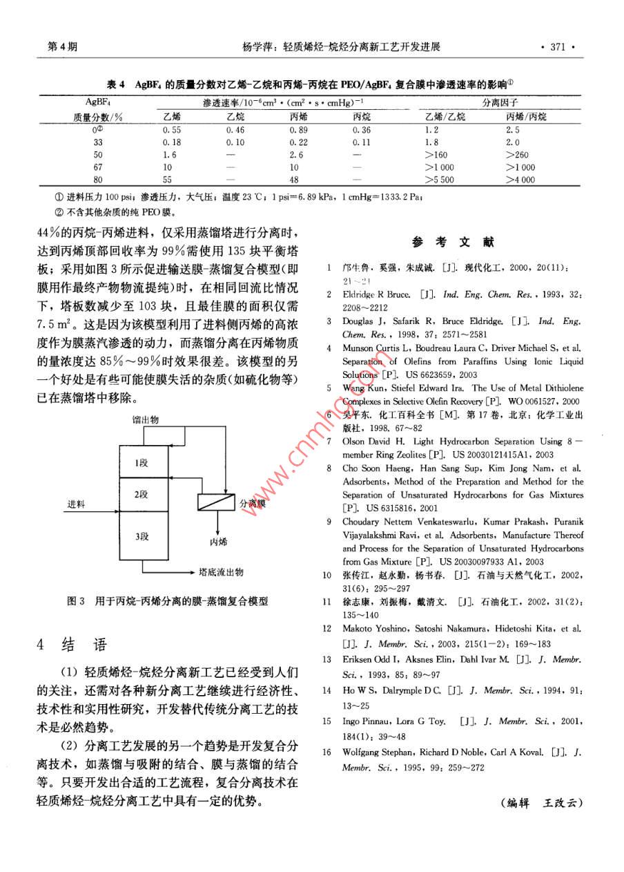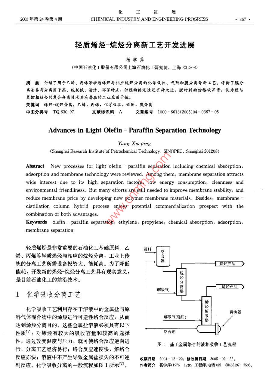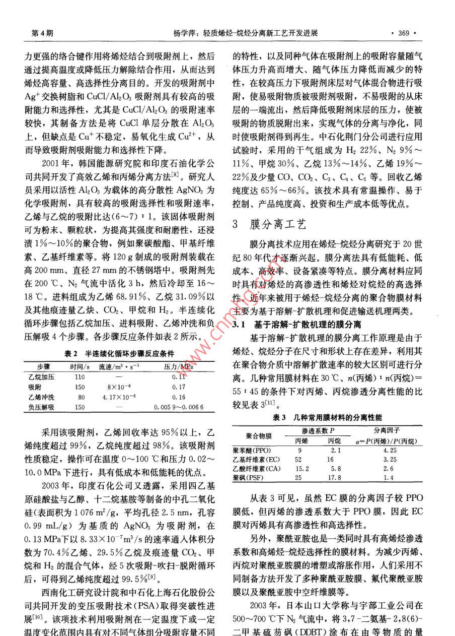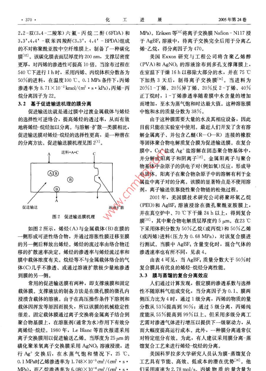 化工進(jìn)2005年第24卷第4期CHEMICAL INDUSTRY AND ENGINEERING PROGRESS●367●輕質(zhì)烯烴烷烴分離新工藝開發(fā)進(jìn)展楊學(xué)萍(中國石油化工股份有限公司上海石油化工研究院,上海201208)摘要介紹了用于乙烯、丙烯等輕質(zhì)烯烴與相應(yīng)烷烴分離的化學(xué)吸收、吸附和膜分離等新工藝。評(píng)價(jià)了膜分離法具有分離因子高、能耗低、清潔、環(huán)保特點(diǎn),但膜的穩(wěn)定性還有待改進(jìn),膜材料的價(jià)格較昂貴;認(rèn)為膜與蒸餾相結(jié)合的復(fù)合分離技術(shù)具有潛在的工業(yè)應(yīng)用價(jià)值。關(guān)鍵詞烯烴-烷烴分離, 乙烯,丙烯,化學(xué)吸收,吸附,膜分離中圖分類號(hào)TQ 630. 97文獻(xiàn)標(biāo)識(shí)碼A文章編號(hào)1000- 6613(2005)04 - 0367 - 05Advances in Light Olefin - Paraffin Separation TechnologyYang Xueping(Shanghai Research Institute of Petrochemical Technology, SINOPEC, Shanghai 201208)Abstract New processes for light olefin - paraffin separation including chemical absorption,adsorption and membrane technology were reviewed. Among them, membrane separation attractswide interest due to its high separation factors, low energy consumption, cleanness andenvironmental friendliness. But many efforts are still needed to improve membrane stability, andreduce membrane price by developing new polymer membrane materials. Besides, membrane ”distillation column hybrid process enjoys potential commercialization prospect with thecombination of both advantages.Keywords olefin - paraffin separation, ethylene, propylene, chemical absorption, adsorption,membrane separation輕質(zhì)烯烴是非常重要的石油化工基礎(chǔ)原料。乙進(jìn)料、絡(luò)烯、丙烯等輕質(zhì)烯烴與相應(yīng)的烷烴分離,工業(yè)上傳統(tǒng)的分離工藝所需設(shè)備投資大、能耗高。為了降低C烷烴產(chǎn)品能耗,開發(fā)新的烯烴烷烴分離工藝具有現(xiàn)實(shí)意義,烴是目前石油化工的前沿技術(shù)。分|烯烴嚴(yán)品D解吸氣1化學(xué)吸收分離工藝化學(xué)吸收I藝?yán)么嬖谟谌芤褐械慕饘冫}與原|炒|烴解再沸器料氣體混合物中的烯烴進(jìn)行可逆性絡(luò)合反應(yīng),從而解吸氣(選用)吸.|塔達(dá)到烯烴分離目的。這些金屬鹽溶液必須具有以下性質(zhì):對(duì)烯烴有較大的吸收容量和較高的選擇絡(luò)合劑性;通過改變溫度與壓力,就可使絡(luò)合反應(yīng)逆向進(jìn)圖1基于金屬絡(luò) 合的液相吸收工藝流程行,分離工藝經(jīng)濟(jì)易行;絡(luò)合反應(yīng)速度快,解絡(luò)合反應(yīng)亦快;溶液中不產(chǎn)生導(dǎo)致金屬鹽損失的不可逆收稿日期2004-12-22; 修改稿日期2005-02 -22.副反應(yīng)?;瘜W(xué)吸收分離的一般流程如圖1所示0。作者簡介楊學(xué)萍(1976- ),女, 工程師。.電話021 - 68462197- 7508?!?68●化I進(jìn)展2005年第24卷進(jìn)料在噴淋式絡(luò)合器中與絡(luò)合溶液接觸,然后壓力或提高溫度將乙烯從絡(luò)合物中進(jìn)行回收,但不發(fā)生絡(luò)合反應(yīng)的烯烴和未發(fā)生絡(luò)合反應(yīng)的烷烴進(jìn)入與水、 乙炔、CO和H2等雜質(zhì)反應(yīng)5。該絡(luò)合物結(jié)烷烴分離塔,烷烴產(chǎn)品從塔頂排出,塔底物流則進(jìn)構(gòu)式為M[SC2(RR,)]2或M[S2C2 (R RRR)]2,人烯烴解吸塔,并通過溫度升高或氣體解吸的方法其中M為過渡金屬,最好為Ni;R為H或吸電子將烯烴釋放出來?;鶊F(tuán),如雜環(huán)、氰基基團(tuán)以及全部或部分被吸電子Ag+、Cu+ 與烯烴發(fā)生絡(luò)合作用,具有可逆基團(tuán)取代的烴基基團(tuán),最好為CFs或CN。實(shí)驗(yàn)發(fā)性、價(jià)格低和毒性低的特點(diǎn),因此最適合用于化學(xué)現(xiàn),濃度為100%的H2S與該絡(luò)合物反應(yīng)非常緩慢,吸收工藝。在Agt方面,人們重點(diǎn)進(jìn)行AgBF,和其反應(yīng)速率比乙烯慢一個(gè)數(shù)量級(jí); 含8%(物質(zhì)的量AgNO體系的開發(fā)。經(jīng)研究,發(fā)現(xiàn)這些含Agt溶含量) H2S的乙烯反應(yīng)速率與純乙烯反應(yīng)速率- -樣,液的最大吸收能力隨絡(luò)合溫度上升和Ag+濃度的且反應(yīng)過程仍為可逆。事實(shí)上,乙烯裝置中H2S濃增加而減少。此外,加入銨鹽也可增加溶液對(duì)烯烴度遠(yuǎn)低于8%(物質(zhì)的量含量),因此該工藝有工業(yè)的吸收能力?;瘧?yīng)用前景。另外,在烯烴與絡(luò)合物接觸過程中,在Cu+吸收體系中,除水可作為吸收介質(zhì)外,可采用惰性共溶劑,以利于絡(luò)合和解絡(luò)合反應(yīng)的進(jìn)還可采用非水介質(zhì)參與吸收。例如Tenneco化學(xué)行。溶劑對(duì)不同烯烴進(jìn)料的反應(yīng)影響見表1。品公司利用CuAICl, -芳烴溶液的ESEP工藝可從表1共溶劑存在 下烯烴絡(luò)合反應(yīng)的含21%乙烯、76%N2和3%CO混合氣中回收平衡常數(shù)和反應(yīng)速率常數(shù)99%的乙烯,純度達(dá)99. 97%(物質(zhì)的量含量)問。平衡常數(shù)速率常數(shù)在該工藝中,溶劑使用壽命很長,且基本不存在設(shè)共溶劑/mol.L ./X104 mol.L-1.S-1乙烯丙烯 1-己烯 乙烯 丙烯 1-己烯備腐蝕。甲若1407030925112003年,美國Chevron公司報(bào)道了采用離子二氣乙烷515377_液分離烯烴與烷烴的方法[1。離子液是- -種新型的2吸附分離工藝高效綠色溶劑,通??赏ㄟ^雜芳環(huán)與烷基化劑反應(yīng)生成季銨鹽、再與Lewis酸或其共軛堿進(jìn)行離子交當(dāng)氣體(或液體)混合物與固體接觸時(shí),在鄰近換制得。將金屬鹽(如銀鹽)溶解在室溫下為