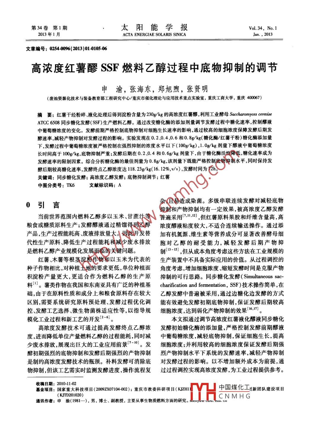 第34卷第1期太陽能學(xué)報Vol 34, No. 12013年1月ACTA ENERGIAE SOLARIS SINICAJan.,2013文章編號:02540096(2013)01010506高濃度紅薯醪SSF燃料乙醇過程中底物抑制的調(diào)節(jié)申渝,張海東,鄭旭煦,張賢明(廢油資源化技術(shù)與裝備教育部工程研究中心/重慶市催化理論與應(yīng)用技術(shù)重點實驗室,重慶工商大學(xué),重慶4000摘要:紅薯干經(jīng)粉碎、液化處理后得到淀粉含量為230g/kg的高濃度紅薯醪,利用工業(yè)酵母 Saccharomyces cereviseATCC6508同步糖化發(fā)酵(SF)生產(chǎn)燃料乙醇。通過改變糖化酶的添加劑量調(diào)節(jié)發(fā)酵過程中糖化速率控制醪液中葡萄糖濃度的變化。發(fā)酵前期嚴(yán)格控制底物抑制對細(xì)胞生長速率的影響通過較高的細(xì)胞濃度保障發(fā)酵后期發(fā)酵速率,減輕產(chǎn)物抑制對發(fā)酵過程的影響。實驗發(fā)現(xiàn)在0.2、0.40.6和0.8g/kg(糖化酶/紅薯干粉)糖化酶添加量下發(fā)酵過程中葡萄糖濃度被嚴(yán)格控制在強(qiáng)烈抑制的濃度水平以下(100g/kg),1.0g/kg劑量下醪液中葡萄糖濃度長時間高于100g/kg,底物抑制嚴(yán)重;發(fā)酵后期在02、0.4和0.6g/kg劑量下,由于糖化酶活性降低糖化速率成為發(fā)酵速率的限制因素。綜合分析糖化酶的最佳劑量為0.8g/kg,該劑量下既能嚴(yán)格控制底物抑制水平同時保持發(fā)酵后期較高糖化速率發(fā)酵終點乙醇濃度達(dá)11823g/kg(16.12%,v/v),發(fā)酵時間為72h關(guān)鍵詞:同步糖化發(fā)酵;高濃度乙醇發(fā)酵;底物抑制調(diào)節(jié);紅薯中圖分類號:TK6文獻(xiàn)標(biāo)識碼:A0引言雜,且易造成染菌。多級串聯(lián)連續(xù)發(fā)酵對減輕底物抑制和產(chǎn)物抑制均有一定效果,被高濃度乙醇發(fā)酵當(dāng)前世界范圍內(nèi)燃料乙醇多以玉米、甘蔗汁等普遍采用7,112),但紅薯原料果膠和纖維含量高,高糧食或糖質(zhì)原料生產(chǎn);發(fā)酵醪液通過精餾得到乙醇濃度醪液粘度較大,不適合連續(xù)輸送操作。通過添產(chǎn)品,生產(chǎn)過程能耗高、廢液排放量大。因此開發(fā)替加有機(jī)氮源維生素等營養(yǎng)成分可顯著改善酵母細(xì)代性生產(chǎn)原料降低生產(chǎn)過程能耗和減少廢水排放胞對乙醇的耐受能力,減輕發(fā)酵后期產(chǎn)物抑是燃料乙醇產(chǎn)業(yè)規(guī)模化發(fā)展面臨的關(guān)鍵問題。制13-15,但從成本角度考慮這些方法在工業(yè)規(guī)模的紅薯、木薯等根莖淀粉作物和以玉米為代表的生產(chǎn)裝置中不具備實際應(yīng)用的價值。從過程調(diào)控的種子作物相比,對種植土地的要求更低,單位種植面角度考慮,增加細(xì)胞濃度、縮短發(fā)酵時間是克服產(chǎn)物積淀粉產(chǎn)量更大,更適合作為燃料乙醇的生產(chǎn)原抑制的可行思路。同步糖化發(fā)酵( Simultaneous sac-料。薯類作物在我國和東南亞具有廣泛的種植基 charification and fermentation,SF)技術(shù)操作簡單,在礎(chǔ),由于在原料性質(zhì)和成分上和糧食原料存在較大乙醇發(fā)酵中普遍被采用,通過邊糖化邊發(fā)酵的方式控發(fā)酵工藝選擇微生物菌株適應(yīng)性等,以指導(dǎo)規(guī)細(xì)胞濃度,達(dá)到弱化產(chǎn)物抑制的效果今力區(qū)別,需要系統(tǒng)研究原料預(yù)處理、發(fā)酵過程優(yōu)化調(diào)能有效避免發(fā)酵初期底物抑制,保證發(fā)酵后期較高模化工業(yè)過程和新工藝的開發(fā)26。本文擬通過調(diào)節(jié)高濃度紅薯液化醪液同步糖化高濃度發(fā)酵技術(shù)可通過提高發(fā)酵終點乙醇濃發(fā)酵初始糖化酶的添加量,嚴(yán)格控制發(fā)酵前期醪液度,進(jìn)而降低單位產(chǎn)量燃料乙醇的過程能耗,同時減中葡萄糖濃度,減輕底物抑制,保證細(xì)胞生長,提高少廢水排放展現(xiàn)出巨大的工業(yè)應(yīng)用前景0。發(fā)細(xì)胞濃度;并利用較高的細(xì)胞濃度保證發(fā)酵后期強(qiáng)酵初期強(qiáng)烈的底物抑制和發(fā)酵后期強(qiáng)烈的產(chǎn)物抑制烈產(chǎn)物抑制水平下系統(tǒng)的發(fā)酵速率,減輕產(chǎn)物抑制是制約高濃度發(fā)酵技術(shù)的瓶頸。補(bǔ)料發(fā)酵可消除底對發(fā)酵過程的影響。以不增加額外成本為前提,通物抑制,但該工藝需實時監(jiān)測發(fā)酵進(jìn)度操作流程復(fù)過過程調(diào)控實現(xiàn)高濃度發(fā)酵,為工業(yè)過程提供參考。收稿日期:2010-1102基金項目:國家重大科技項目(2009zX07104002);重慶市教委科研項目(KzZH中國煤化工新團(tuán)隊建設(shè)項目(KrTD01020)CNMHG通訊作者:申渝(1981—),男,博士、副教授,主要從事生物質(zhì)燃料方面的研究。106太陽能學(xué)報34卷1材料與方法由于實驗中發(fā)酵溫度為30℃,低于糖化酶的最適溫度(60℃),糖化速率可能會存在較大差異。經(jīng)1.1菌種和培養(yǎng)方法工業(yè)釀酒酵母 Saccharomyces cerevisiae ATCC測定初始醪液中淀粉含量約為230gkg,完全糖化后6508由大連理工大學(xué)生物工程系白鳳武教授贈送。的葡萄糖含量約為255g/kg。實驗結(jié)果表明發(fā)酵溫斜面培養(yǎng)基(g):葡萄糖10,蛋白胨2,酵母粉度下,糖化酶對高濃度紅薯液化醪液的糖化速率遠(yuǎn)2,瓊脂粉20。接種后置于30℃培養(yǎng)箱靜置培養(yǎng)低于最適溫度下的速率,如圖1所示,0.2、0.4和0.6g/kg劑量下80h內(nèi)均達(dá)到糖化終點;0.8和24h,于4℃冰箱保存。種子培養(yǎng)基(g/L):葡萄糖30,蛋白胨2,酵母粉1.0g/kg劑量