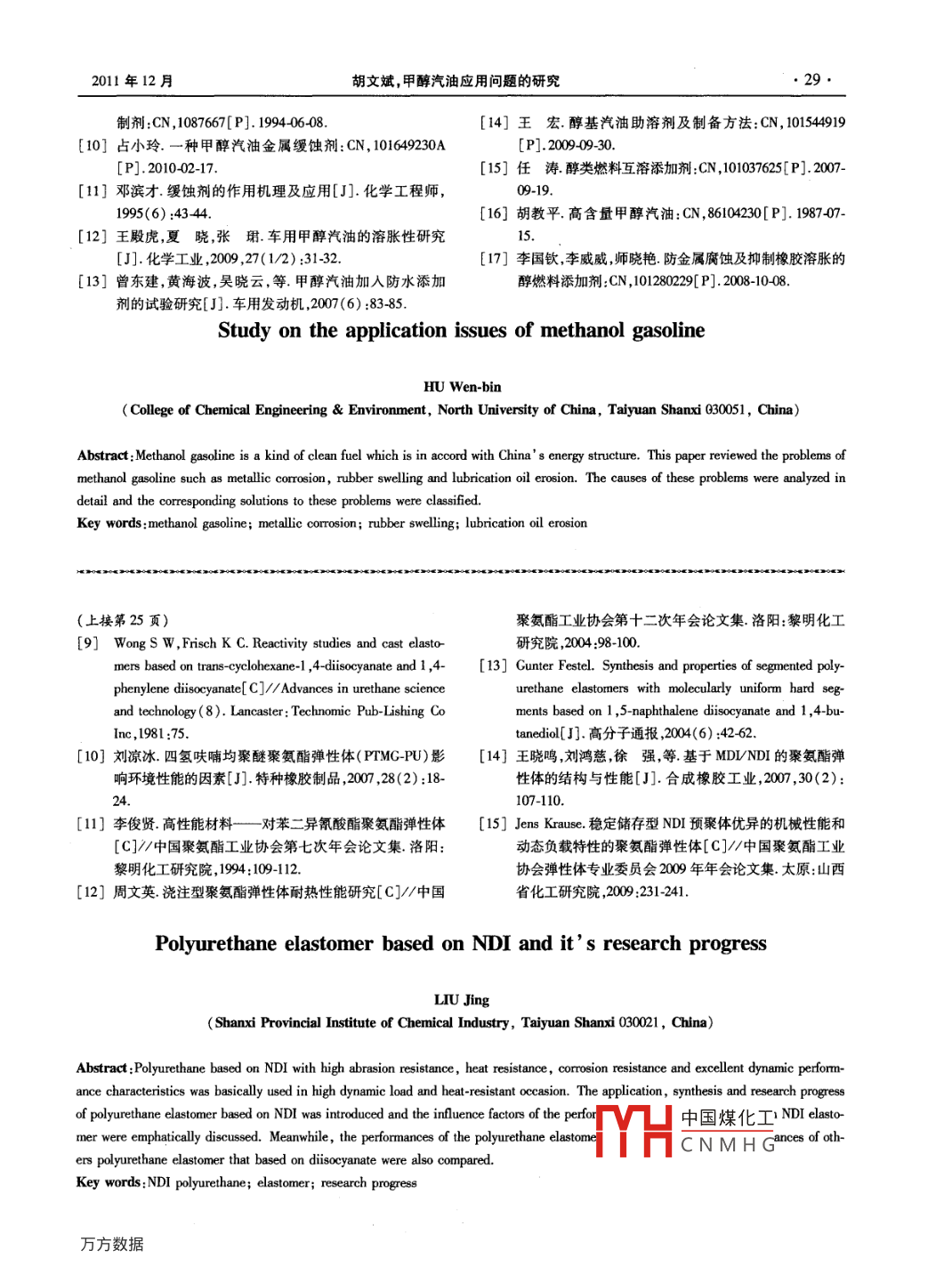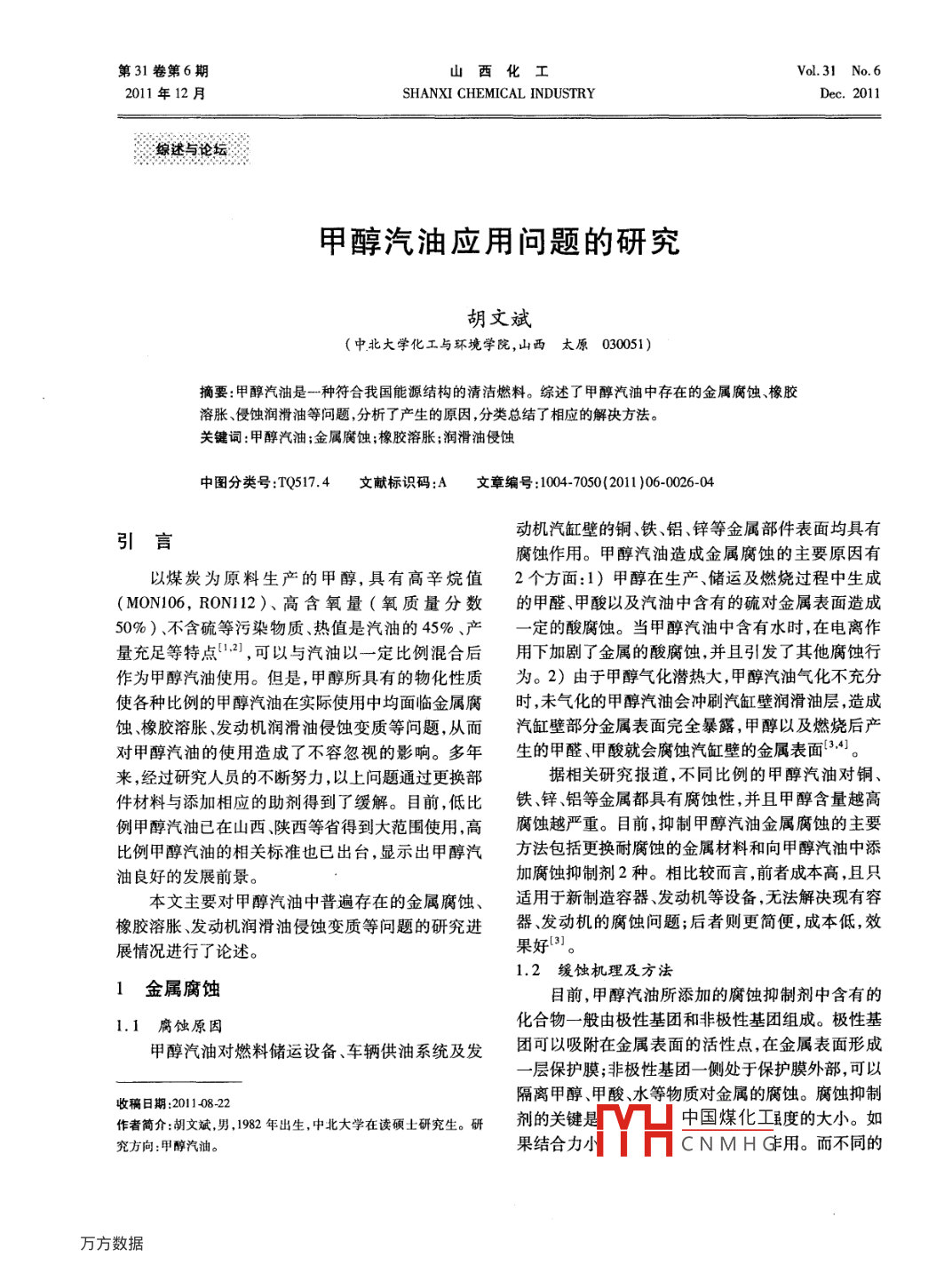 第31卷第6期山西化工Vol 31 No 6011年12月SHANXI CHEMICAL INDUSTRYDec.2011綜述與論壇甲醇汽油應(yīng)用問題的研究胡文斌(中北大學(xué)化工與環(huán)境學(xué)院,山西太原030051)摘要:甲醇汽油是一種符合我國能源結(jié)構(gòu)的清潔燃料。綜述了甲醇汽油中存在的金屬腐蝕、橡膠溶脹、侵蝕潤滑油等問題,分析了產(chǎn)生的原因,分類總結(jié)了相應(yīng)的解決方法。關(guān)鍵詞:甲醇汽油;金屬腐蝕;橡膠溶脹;潤滑油侵蝕中圖分類號(hào):TQ517.4文獻(xiàn)標(biāo)識(shí)碼:A文章編號(hào):1004-7050(2011)06-0026-04引言動(dòng)機(jī)汽缸壁的銅、鐵、鋁、鋅等金屬部件表面均具有腐蝕作用。甲醇汽油造成金屬腐蝕的主要原因有以煤炭為原料生產(chǎn)的甲醇,具有高辛烷值2個(gè)方面:1)甲醇在生產(chǎn)、儲(chǔ)運(yùn)及燃燒過程中生成(MON106,RON12)、高含氧量(氧質(zhì)量分?jǐn)?shù)的甲醛、甲酸以及汽油中含有的硫?qū)饘俦砻嬖斐?0%)、不含硫等污染物質(zhì)、熱值是汽油的45%定的酸腐蝕。當(dāng)甲醇汽油中含有水時(shí),在電離作量充足等特點(diǎn)2,可以與汽油以一定比例混合后用下加劇了金屬的酸腐蝕,并且引發(fā)了其他腐蝕行作為甲醇汽油使用。但是,甲醇所具有的物化性質(zhì)為。2)由于甲醇?xì)饣瘽摕岽?甲醇汽油氣化不充分使各種比例的甲醇汽油在實(shí)際使用中均面臨金屬腐時(shí),未氣化的甲醇汽油會(huì)沖刷汽缸壁潤滑油層,造成蝕、橡膠溶脹、發(fā)動(dòng)機(jī)潤滑油侵蝕變質(zhì)等問題,從而汽缸壁部分金屬表面完全暴露,甲醇以及燃燒后產(chǎn)對(duì)甲醇汽油的使用造成了不容忽視的影響。多年生的甲醛、甲酸就會(huì)腐蝕汽缸壁的金屬表面3來,經(jīng)過研究人員的不斷努力,以上問題通過更換部據(jù)相關(guān)研究報(bào)道,不同比例的甲醇汽油對(duì)銅、件材料與添加相應(yīng)的助劑得到了緩解。目前,低比鐵、鋅、鋁等金屬都具有腐蝕性,并且甲醇含量越高例甲醇汽油已在山西陜西等省得到大范圍使用高腐蝕越嚴(yán)重。目前,抑制甲醇汽油金屬腐蝕的主要比例甲醇汽油的相關(guān)標(biāo)準(zhǔn)也已出臺(tái),顯示出甲醇汽方法包括更換耐腐蝕的金屬材料和向甲醇汽油中添油良好的發(fā)展前景。加腐蝕抑制劑2種。相比較而言,前者成本高,且只本文主要對(duì)甲醇汽油中普遍存在的金屬腐蝕、適用于新制造容器發(fā)動(dòng)機(jī)等設(shè)備,無法解決現(xiàn)有容橡膠溶脹、發(fā)動(dòng)機(jī)潤滑油侵蝕變質(zhì)等問題的研究進(jìn)器發(fā)動(dòng)機(jī)的腐蝕問題;后者則更簡便,成本低,效展情況進(jìn)行了論述。果好3。1.2緩蝕機(jī)理及方法1金屬腐蝕目前,甲醇汽油所添加的腐蝕抑制劑中含有的1.Ⅰ腐蝕原因化合物一般由極性基團(tuán)和非極性基團(tuán)組成。極性基甲醇汽油對(duì)燃料儲(chǔ)運(yùn)設(shè)備、車輛供油系統(tǒng)及發(fā)團(tuán)可以吸附在金屬表面的活性點(diǎn)在金屬表面形成層保護(hù)膜;非極性基團(tuán)一側(cè)處于保護(hù)膜外部,可以收稿日期:2011408-22隔離甲醇、甲酸、水等物質(zhì)對(duì)金屬的腐蝕。腐蝕抑制作者簡介:朝文斌,男,192年出生,中北大學(xué)在讀碩土研究生。研劑的關(guān)鍵是中國煤化工度的大小。如究方向:甲醇汽油。果結(jié)合力小HCNMHG用。而不同的2011年12月胡文斌,甲醇汽油應(yīng)用問題的研究27·金屬對(duì)于不同化合物的結(jié)合力不同,因此需要將不的腐蝕抑制劑。除此以外,研究者還提供了同時(shí)具同的化合物進(jìn)行復(fù)配,以適用不同的金屬。目前使有緩蝕功能和其他功能的腐蝕抑制劑配方。例如,用的腐蝕抑制劑主要是由不同化合物按照一定要求在專利CN1016492300中就公開了成分為脂肪酸復(fù)配后制備出的適用于甲醇汽油的混合物。防銹劑、烯基酯或醚、非離子表面活性劑的甲醇汽油郭四虎與吳耀曲制備了不同的腐蝕抑制劑,腐蝕抑制劑。這種腐蝕抑制劑不但對(duì)銅、鋁45#鋼并且在M15甲醇汽油中進(jìn)行了防腐蝕實(shí)驗(yàn),結(jié)果如鋅和氣化器材質(zhì)等多種金屬具有優(yōu)良緩蝕性能,而表1所示。其中,由糖類與多元有機(jī)酸合成的化合且具有助溶作用,不會(huì)破壞甲醇汽油的酸堿平衡。物和氮雜環(huán)類復(fù)配而成的HG腐蝕抑制劑具有較以上所述甲醇汽油腐蝕抑制劑多為含有羥基等好的緩蝕效果。組分分子中的極性基團(tuán)能夠吸附在極性基團(tuán)的化合物、含氮類化合物以及屏蔽酚類。銅、鋁表面,非極性基團(tuán)在金屬表面形成保護(hù)膜,起這是因?yàn)?這些化合物分子中含有的羥基等極性基到了阻止電化學(xué)腐蝕和減弱硫等酸性物質(zhì)的酸腐蝕團(tuán)可以吸附在金屬表面形成保護(hù)膜;而含有未配對(duì)作用。而且,腐蝕抑制劑組分分子中的部分官能團(tuán)電子的氮原子能與金屬形成配位鍵,從而形成能與鐵等金屬形成絡(luò)合物,在鋼鐵表面形成致密保層阻擋腐蝕物質(zhì)的保護(hù)膜;屏蔽酚類起到的主要作護(hù)膜,阻止對(duì)鋼鐵金屬表面的腐蝕。在李圣勇與李用是減少空氣對(duì)甲醇與金屬的氧化,避免空氣對(duì)金圣濤的銅腐蝕實(shí)驗(yàn)中,以苯并唑與吡唑酮2種氮雜屬腐蝕的影響。因此,甲醇汽油腐蝕抑制劑組成一般環(huán)化合物進(jìn)行復(fù)配制備腐蝕抑制劑,并在不同比例包括