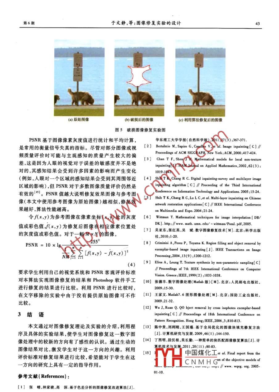 第31卷第6期實驗室研究與探索Vol.31 No. 6RESEARCH AND EXPLORATION IN LABORATORYJun. 2012圖像修復(fù)實驗的設(shè)計于文靜,楊富琴,馮偉國(華東理工大學(xué)電子與信息實驗教學(xué)中心,上海,200237)摘要:設(shè)計了圖像修復(fù)實驗,通過實驗操作激發(fā)學(xué)生對圖像修復(fù)研究的興趣。實驗中使用基于樣本的圖像修復(fù)方法實現(xiàn)圖像的修復(fù),首先對該方法的基本原理及實現(xiàn)過程進行解釋;然后利用該方法實現(xiàn)對各種不同類型損毀圖像的修復(fù)。提供可實現(xiàn)數(shù)字圖像修復(fù)相關(guān)方法的Matlab 程序代碼,學(xué)生可利用相關(guān)程序?qū)Ω鞣N不同類型的損毀圖像進行修復(fù),得到了視覺上無明顯人工修復(fù)痕跡的圖像。學(xué)生對于破損圖像的破損面積的大小和位置進行改變,得到不同的修復(fù)結(jié)果。通過對結(jié)果的分祈加深對方法的.理解。關(guān)鍵詞:圖像修復(fù);圖像處理;文字移除中圖分類號:TP 751.1 .文獻標(biāo)志碼:A文章編號:1006 -7167(2012)06 - 0040 -04Design of the Experiment on Image ImpaintingYU Wen-jing, YANG Fu-qin,ENG Wei-guo( Experimentation Center for Electronics and Information Education , East ChinaUniversity of Science and Technology, Shanghai 200237, China)Abstract: The experiment on image inpainting is designed to deepen sludents ' understanding of the concept and theimplementation of the image inpainting technology , and to stimulate students’interest in research on the image inpaintingtechnology. In the experiment , the image inpainting is achieved by the sample-based image inpainting methods. First, theexperiment explains the basic principles and the implementation of this method. Moreover , different types of damagedimage are inpainted by this method. The matlab code of related methods are provided which could achieve digital imageinpainting so that students could use relative programs to restore different types of damaged images and get images withno obvious artificial lraces visually. Furthermore,students could get different inpainting results by changing the damagedsize and the location of damaged images so as to deepen their underslanding of the method by analyzing the results. Thisimage restoration method is implemented in digital image experiments for the first time.Key words: image inpainting; image processing; word removal覺其修復(fù)痕跡的一種圖像處理技術(shù)。圖像修復(fù)主要在0引言文物保護[23]、影視特技制作(23]、多余目標(biāo)物體剔除、圖像修復(fù)1 ( Image Inpainting, Image Completion)圖像縮放3.0]、圖像的有損壓縮“4]、視頻圖像的錯誤隱是指按照一定的規(guī)則,利用未被損壞的圖像信息,估計匿等方面有著重大應(yīng)用'”。正是由于圖像修復(fù)的重并填充圖像指定區(qū)域內(nèi)的缺損信息,使得最終修復(fù)后要作用,在數(shù)字圖像處理實驗中增加圖像修復(fù)部分的的圖像在視覺效果.上連續(xù)、光滑、自然,且不為人眼察實驗內(nèi)容對于學(xué)生了解這一領(lǐng)域中的相關(guān)技術(shù),進而應(yīng)用|中國煤化工勺基于變分和偏微分收稿日期:2011 -12-20方程.MYHCNMHG,PDE).與基于樣本作者簡介:于文靜(1974-).女,山東夏津人,碩上,講師,主要研究.方向:數(shù)字圖像修復(fù)算法及優(yōu)化算法研究。的紋理合成圖像修復(fù)方法,前者通過求解微分方程,光Tel. :13301956747 ,021 64253339 ; E-mail; wenjingyu@ ecust. edu. en滑地將破損區(qū)域周圍的已知信息傳播到破損區(qū)域中,從而完成修復(fù);后者基于給定的小區(qū)域紋理樣本,按照第6期于文靜,等:困像修復(fù)實驗的設(shè)計41表面的幾何形狀,拼接生成整個曲面的紋理,在視覺上(4)按照中像素點的灰度值填充出,中未知部是相似而連續(xù)的??紤]到PED的抽象性,本實驗設(shè)計分的像素值。結(jié)束后將填充后的區(qū)域標(biāo)識為已知用基于樣本的圖像修復(fù)方法實現(xiàn)。區(qū)域。實驗中通過Matlab程序設(shè)計實現(xiàn)Criminism提出(5)沿填充后新的未知區(qū)域的邊緣,重新返回的基于樣本的圖像修補算法,利用本方法對不同類型(1),依此類推,直到所有的未知區(qū)域被填充。的破損圖像進行修復(fù),并介紹圖像修復(fù)的評價標(biāo)準(zhǔn),基2實驗設(shè)計于這一-標(biāo)準(zhǔn),學(xué)生對于修復(fù)算法實現(xiàn)的圖像修復(fù)和Photoshop手動修復(fù)后的結(jié)果進行比較。希望通過本.圖像修復(fù)實驗作為圖像處理課程內(nèi)容的補充與增實驗的學(xué)習(xí)和實踐激發(fā)學(xué)生的學(xué)習(xí)興趣。強,應(yīng)具有以數(shù)字圖像處理課程的先修課程和計算機處理能力。①先修課程:高等數(shù)學(xué)、數(shù)字信號處理、數(shù)1基于樣本的圖像修復(fù)算 法原理[89]字圖像處理;②計算機語言:Matlab。如圖1所示,1表示一幅完整圖像區(qū)域,nC I是本文介紹的數(shù)字圖像修復(fù)實驗為課程實驗,創(chuàng)新待修復(fù)區(qū)域,即信息缺失區(qū)域;則φ= 1-2表示待修類實驗內(nèi)容未在本文中介紹。復(fù)圖像中的已知區(qū)域,本實驗理論基于Criminism提出2.1 實驗環(huán)境的基于樣本的圖像修補算法,這一算法主要包括以下操作系統(tǒng),XP或以上版本;Matlab7.0或以上版本幾個步驟:含圖像處理toolbox,圖像修復(fù)基本操作相關(guān)的程序,基(1)對于圖像待修復(fù)區(qū)邊緣a2的每個像素點p,于樣本的圖像修復(fù)程序, PSNR計算程序, Photoshop軟計算以點p為中心的待修復(fù)塊業(yè)。的