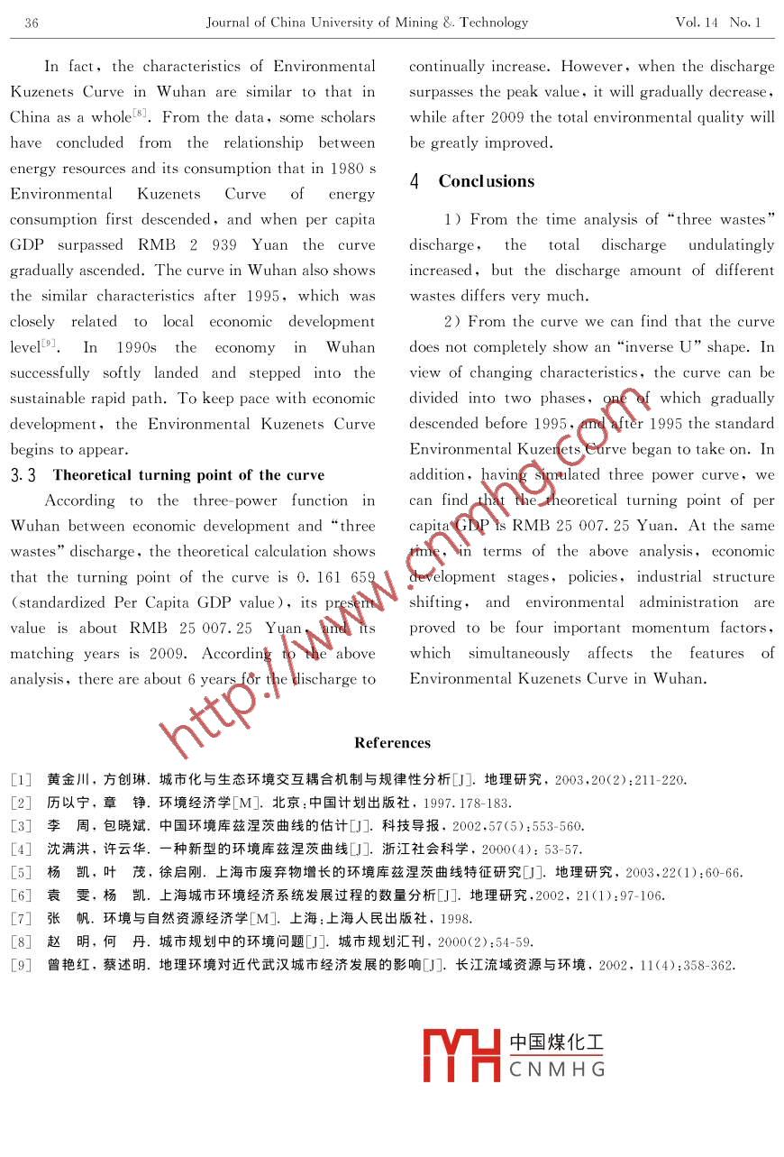 Jun. 2004Journal of China University of Mining &. TechnologyVol.14 No. 1Probe into Environmental K uznetsCharacteristics and Causes of W astewater,Waste Gas, and Solid Wastes in Wuhan CityLIU Yao- -bin(劉耀彬)', LI Ren- dong(李仁東)2(1. School of Management, CUMT, Xuzhou 221008,China;2. Institute of Geodesy and Geophysics, Chinese Academy of Science, Wuhan 430077, China)Abstract: Environmental K uznets characteristics and causes of waste water, waste gas, and solid wastes in W uhancity was researched; By comparing the variation of“three wastes", i.e. waste water, waste gas, and solid wastes,the model between standardized per capita GDP and values of“three wastes ”discharge was established and thecauses were analyzed based on the theory of environmental economics. The results show that 1) the total amount isfluctuantly increasing. but the discharges of the three kinds are temporarily different, 2) the curve conforms to thethree -power function, in which the curve descends from 1985 to 1994, and the curve preliminary shows theenvironmental Kuznets characteristics from 1995 to 2001,3) the simulated calculation ilustrates that the turningpoint of this environmental Kuznets curve would be over 25007. 25 Yuan per caprta, and 4) the economicdevelopment, changing of industry structure, energy resource structure, and environmental policies are the mainfactors leading to the Environmental Kuznets Curve in Wuhan city.Key words: discharge of“three wastes”; economic growth; Environmental Kuznets Curve; factorsCLC number: X 1Document code: A Article ID: 1006- 1266(2004)01- 003304Kuzenets Curve. Additionally, he advanced aIntroductionmathematics model based on the environmentalThere exists a kind of sequential coordinativecharacteristic values during lower revenue, shifting,relationshipbetween city development and itsand higher revenue phasest2l.ecologyenvironmentIl.In 1982, AmericanWuhan as a metropolis in the middle belt ineconomists Grossman and Krueger, who wereChina,its environmental quality lagged behindenlightened by K uzenets posing“Inverse U”curve,other metropolises according to the Nationalfirstly advanced“Environmental Kuzenets Curve”Environment Data Bulletin in 2001,which indicatessupposition for developed countries according to thethat its ecology environment is bad and not innorm that some developed countries had undergoneharmony with the goal of“ Ecology Parks andpreliminarily quick growth, serious pollution andInternational Metropolis ”that Wuhan governmentthen the improvement of environment quality.pursues. How to improve the sustainable developingAfter the following years, Bonaton ( Internationalcapability of Wuhan city without hinderingDevelopment Institute of Harvard University )economic development is an important issue facingcollected a mount of relevant data bet ween economic中國煤化工fact, although theredevelopment andenvironmentalquality from .THCNMHGenets Curve,wecandevelopinganddevelopedcountries,andCOnL1O1 allu 111p1UvC L110curve features to make itdemonstratedtheexistence of Environmentalhave three different trends by taking market andReceived date: 2003- 10- 13Foundatiqn i果Hey Knowledge Innovative Project of Chinese Academy of Science (KZCX2 SW-415)Biography!薩說bin (1970-), male, from Macheng, Hubei province, doctoral student, engaged in the research on city and regionalplanning and management.3Journal of China University of Mining &. TechnologyVol. 14 No. 1policy measures'3], and approach the environmental2 Variation of“Wastes” Dischargegoal (Fig. 1). In 2001 the discharges of“ threeIn April 1984, Wuhan environment protection .wastes",i. e . waste water,waste gas, and solidbureau was established and two years later thewaste,mount to 683. 56 million tons, 195. 01branches were also set up, which indicated thatbillion tons, and 5. 30 million tons, respectively. Itenvironmental protection was in a legislative stage ins of practicalsignificance tresearchtheWuhan. In order to study the characteristics ofEnvironmental Kuzenets Curve characteristics andEnvironmental K uzenetsCurveundernewcauses between economic development and“ threeconditions,we have objectively collected thewastes”discharge.discharge of“three wastes”and relevant economicFig.1 is an inversed Environmental Kuzenets .dataduring1985- 2001.For convenientlyCurve in Wuhan city. In Fig. 1, Curve A shows theanalyzing the changing characteristics of“ threesituationnwhichenvironmentaldamagewastes”discharge, we have individually made threedegeneration may reach the ecology thresholdcurve figures (Fig. 2). From Fig. 2a we can see thatwithout considering the environmental cost. Inthe discharge of waste water in W uhan graduallycurve B, part of the environmental cost is taken intodecreased from 1985 to 1997, but it undulatinglyaccount. In this situation, we can make the curveincreased after 1998. From Fig. 2b, it can be seenbe smooth and environmental worsening peakthat the discharge of waste gas basically rised fromdescended by drafting discharge standard,discharge1985 to 2001. However, the discharge decreased byfees,and executing discharge certificate trade. In12.4% after 2000. And in Fig. 2c, the discharge ofcurve C, all the environmental cost has been takensolid waste cyclically fluctuated, in which the firstinto account. We can make the peak be furtherperiod was between 1985 and 1990 ,the seconddescended, thus the damage of ecology environmentperiod between 1991 and 1996, and between 1997may reach the lowest by further restrictingand 2001 was the third period, but the fact is thatdischarge standard, increasing discharge fees, andthe total discharge increased.stopping unfavorable pensions for environment.According to the above analysis, we can findthat the total discharge undulatingly increases ,Ecologyi thresholdwhich on one hand, shows that the characteristics品of Environmental Kuzenets Curve is not apparent ,Economic developing levelon the other hand, the task of