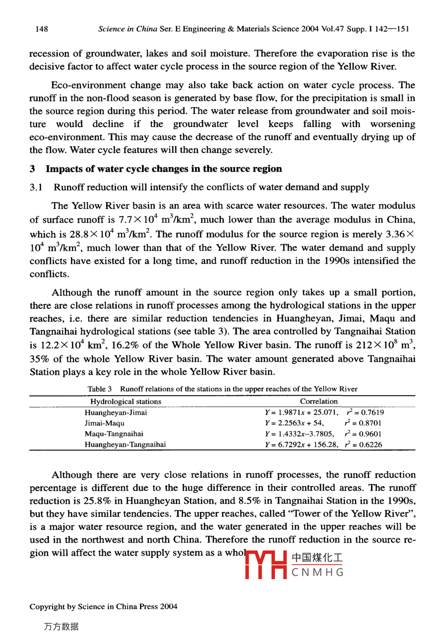 142Science in China Ser. E Engineering & Materials Science 2004 Vol.47 Supp. 1 142- -151Study on the changes of water cycle and itsimpacts in the source region of the YellowRiverZHANG Shifeng', JIA Shaofeng', LIU Changming , CAO Wenbing",HAO Fanghua, LIU Jiuyu4 & YAN Huayun51. Institute of Geographic Sciences and Natural Resources Research, Chinese Academy of Sciences,Bejing 100101, China;2. China University of Geosciences, Beijing 100083, China;3. Beijing Normal University, Beijing 100875, China;4. Bureau of Hydrology of Yellow River Conservancy Commission, Zhengzhou 450003, China;5. Bureau of Hydrology and Water Resource Investigation of Qinghai Province, Xining 810001, ChinaCorrespondence should be addressed to Zhang Shifeng (email: zhangsf @ igsnrr.cn)Received January 18, 2004; revised April 8, 2004AbstractThe water cycle in the source region of the Yellow River underwent greatchanges in the 1990s. The major features of the changes are as follows: the gaugedrunoff declined significantly while the precipitation increased slightly, and the runoffprocess was more concentrated on the flood season. Water balance analyses indicatethat the pondage was kept in thestatus of negative equlilibrium, causingeco-environmental problems. The runoff decrement is due to evaporation increment inthis region. Studies show that the runoff process in this region is closely related to that ofthe other hydrological stations in the upper reaches. When the runoff declines in thesource regions, the amount of water also declines in the whole upper reaches of theYellow River, affecting the balance between water demand and supply. Meanwhilechanges will take place in the water cycle of the river course system when theeco-environment deteriorates. The trend of water cycle change in the source region isthat the runoff will keep declining with the increment of evaporation caused bytemperature rise in the northwest of China in the 21st century. But the hydraulicengineering in the source region will help to mitigate the deterioration of localeco-environment system, though the impacts to the lower reaches of this project may notbe the case.Key words: source region of the Yellow River, water cycle, evaporation, negative equilibrium.DOI: 10.1360/ 04ez0012The Yellow River originates from the QingrMH中國(guó)煤化工;Province. Con-cerming its hydrological, geological, geomorphicC N M H Geveral ways canbe found to define the source region of the Yellow River". The source region studied inCopyright by Science in China Press 2004Study on the changes of water cycle and its impacts in the source region of the Yellow River143this paper is in the most narrow sense. It lies in latitude 34°一-35°15' north and longi-tude 95*40'- -98°30' east!2- 4! The gauged area is 20930 km2, average precipitation 310mm, evaporation ability 1300- 1 600 mm, and the altitude is above 4200 m. This area istypical of arid plateau with an average temperature of - 4C and frost free period of 2-3 d.The runoff of the source region has declined sharply since the 1990s. Theeco-environment has changed significantly with biodiversity declining and grasslanddeteriorating. Up to now, a lot of researches of the impacts of climate changes oneco-environment in the source region have been donel5- 門. However, what kind ofchanges have taken place to the water cycle factors? What are the driving forces, andhow much is their contribution to the changes. This is yet a very important research as-pect to be studied.Water cycle factors and water balance assessment in the source region of theYellow RiverThe regional water balance principle is adopted as a basic way to analyze the char-acteristics of water cycle changes. The factors of water cycle in a given watershed in-clude precipitation, runoff, evaporation and pondage. The basic equation of water bal-ance is as follows:R=P- E土sW,(1)in which R represents the annualrunoff, P the annual precipita-tion, E the actual annual evapo-ration and△W thewaterpondageindicatingLanzhouamount variations in soil, lake,Guide XunhuaS~reservoir and river system. Then m Huangheyan(Tangnaihaichanges of water cycle can bereflected by the changes of theseMadu6Jungongfactors.l Jimai、Maq電Fig.1 is the sketch of thesource region of the YellowTangkeRiver. Huangheyan station is thehydrological control station of0.75_150300,kmthe source region above Maduo.Fig. 1. The sketch of the source region of the Yellow River.Gauged data of precipitation andrunoff at Huangheyan station is employed in theanwhile the run-off has been restituted into natural runoff in the co中國(guó)煤化工activities.YHCNMHGConsidering human activities in the source region, the measured runoff will be con-www.scichina.com144Science in China Ser. E Engineering & Materials Science 2004 Vol.47 Supp. 1 142- -151verted into natural runoff by the way of restitution. The formula of the restitution ofnatural runoff in a watershed is as follows:RN= RM+ RA + Ri+ Rp+ Rr.(2)In the above formula, RN and RM represent natural runoff and measured runoff. RA,Rq and Rp represent water withdrawal by agricultural, industrial and domestic use re-spectively, and Rr represents water pondage amount in the reservoir and lakes in a givenperiod. There is very limited water use by industry and agriculture, while domestic useand livestock drinking constitute a major part. The most significant restitution amount iscaused by livestock drinking with the sharp increase of livestock population. Domesticuse is also an element of water restitution. By the end of the 1990s there was a popula-tion of 10000 people in the source regionb, ' ' and they were mainly living on animal hus-bandry. The livestock has been tripled in the past 30 years since the 1970s', and nowthe total population of the livestock is 3.5 million. Suppose the quota of livestockdrinking is 40 L/d per head, and that of domestic use is 60 L/d, doubled as before, theresults show that there is an increment of 0.0011X 10* m3 for domestic