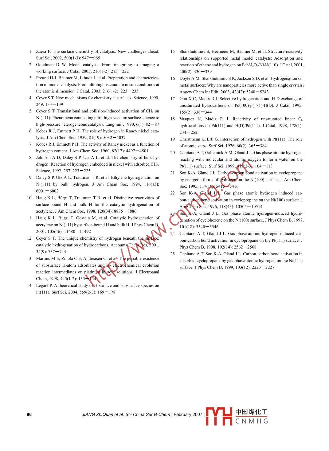 Science in China series b: Chem2007in China presser verlaInteraction of gas phase atomic hydrogen with Pt(111):Direct evidence for the formation of bulk hydrogenspeclesJIANG ZhiQuan. HUANG WeiXin't bAo XinHeDepartment of Chemical Physics, University of Science and Technology of China, Hefei 230026, China2 State Key laboratory of Catalysis Dalian Institute of Chemical Physics, Chinese Academy of Sciences, Dalian 116023, ChinaEmploying hot tungsten filament to thermal dissociate molecular hydrogen, we generated gas phaseatomic hydrogen under ultra-high vacuum(UHV)conditions and investigated its interaction with Pt(111)surface. Thermal desorption spectroscopy (TDs)results demonstrate that adsorption of molecularhydrogen on Pt(111)forms surface Had species whereas adsorption of atomic hydrogen forms not onlysurface Had species but also bulk Had species. Bulk Had species is more thermal-unstable than surfaceHad species on Pt(111), suggesting that bulk Had species is more energetic. This kind of weakly-adsorbed bulk Had species might be the active hydrogen species in the Pt-catalyzed hydrogenationreactionsPt(111) surface, bulk H species, thermal desorption spectroscopyHeterogeneous catalysis plays important roles in chemi- cause the concentration of the formed activecal industry and environmental protection, however, too low to be detected under UhV conditions. Thereforbecause of its complexity, most fundamental under- the key to overcome the "pressure gap"is to form destanding of heterogeneous catalysis is achieved by in- tectable active species in the practical catalytic reactiovestigating catalytic reactions over model catalysts(sur- on the surface of model catalysts under UHV conditionsface science studies) under ultra-high vacuum(UHVPt, Pd, and Ni catalysts demonstrate excellent cata-conditions. Although surface science studies can give lytic activity for the hydrogenation of unsaturated hyunambiguous information on the investigated system drocarbons. It has been reported that the raney ni cata-nism and reaction kinetivarious gaps exist between the conditions employed in ethylene and that its activity is directly related with theface science studies and those in practical heteroge- Had content within the catalyst, 7. But the surface hadneous catalytic reaction, one of which is the great dif- species formed via the adsorption of molecular hydrogenference in the employed reaction pressures, namely, the on Ni(lll) cannot react with co-adsorbed ethylene to"pressure gap"existing between surface science studies produce ethane under UHV conditions. Ceyer et al. 8-121of model catalysts and practical heterogeneous catalytic employed highly-energetic gas phase atomic hydrogenreactions-3. Many heterogeneous catalytic reactions to interact with Ni(111) under UHV conditions, whichcan facilely occur under certain reaction pressure, butcannot under UHV conditions 4. 5. The"pressure gap'doi:10.1007/s11426-007-2029-xarises mainly because the reactants cannot form theCorrespondingauthor(email:huangwx(@ustc.edu.cn)tive species in the practical catalytic reaction on the sur-ported by the National Natural Science Foundation of China (Grant Noface of model catalysts under UHV conditions, or be-0503027), Talent Program of Chinese Academy of Sciences, and China Postdotoral Science Foundation( Grant No. 2005038479)www.scichina.comwww.springerlink.comSci China SelYH中國煤化工CNMHG5OInO. 1191-96bulk); comparing surface Had species, bulk Had species heating rate of 5 K/s was employedinteracts with Ni(lll) more weakly; but the reactionHighly-pure gases(H2 and O2) were admitted in theresults proved that bulk Had species in Ni(111) shows UHV chamber via the controllable leak valve. One leakhigh catalytic activity for hydrogenation and is thevalve for H2 dosing ended with a stainless steel tubetive hydrogen species for Ni-catalyzed hydrogenation with an outer diameter of 3 mm to direct the gas, in frontreaction. These results for the first time demonstrate that of which a home-made tungsten coil(tungsten filamentthe active species in practical catalytic reactions can be diameter: 0.2 mm; coil diameter: 4 mm; coil length: 3lyprepared under UHV conditions by emcm)was positioned. The tungsten coil could be controlploying highly-nergetic reactants to interact with model lably heated by a power supply with the constant-currentcatalysts. And in such a way it is likely to overcome the mode. The Pt(111) surface was positioned about 5 cm inpressure gap "so that the molecular-level understanding front of the tungsten coil when exposed to H2. Duringof heterogeneous catalysis can be achieved. Experimen- the exposure of gas phase atomic hydrogen, H2 was ad-tal results of catalytic hydrogenations over Pt and pd mitted into the UHV chamber to a desirable pressure andmodel catalysts also suggest that weakly-adsorbed Had then the tungsten coil was heated so that H2 would bespecies, instead of strongly-adsorbed surface Had Species, cracked into atomic hydrogen when passing through theis the active species). Under UHV conditions, un- hot tungsten coil. We could not measure the temperaturesaturated hydrocarbons do not hydrogenate with surface of the tungsten coil due to the lack of thermocouple at-Had species on Pd(111)and Pd(100)7 8, but the same tached to the tungsten coil. Therefore, the tungsten coilhydrogenation reaction can proceed on Pd nanoparticles, temperature was expressed in a relative value by theon which weakly-adsorbed subsurface Had species, applied voltage and current of the power supply. It isplaying a key role in the catalytic hydrogenation reac- noteworthy that the sample temperature might increasetion, can form via molecular hydrogen adsorption 5,6. by 10-15 K because of the irradiation of the hot tungSo far there is no report studying the weakly-adsorbed sten coil during the exposure of gas phase atomic hy-Had species on Pt surfaces. In this work, we employed drogen. The exposure herein was reported in Langmuirth