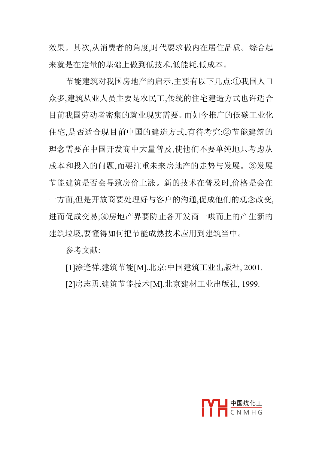 節(jié)能建筑的思考張?zhí)宜捱w中遠(yuǎn)實業(yè)集團(tuán)有限公司江蘇宿遷223800【摘要】低碳經(jīng)濟(jì)理念的提出,加強了全球?qū)G色建筑的關(guān)注程度,追求可持續(xù)發(fā)展。本文著重從節(jié)能建筑的視角出發(fā),闡述了節(jié)能建筑的思想衍變,概括了節(jié)能建筑主要內(nèi)容和相關(guān)法規(guī),并分析了節(jié)能建筑在我國的發(fā)展趨勢以及對我國房地產(chǎn)業(yè)的啟示?!娟P(guān)鍵詞】低碳經(jīng)濟(jì);節(jié)能建筑隨著全球人口和經(jīng)濟(jì)規(guī)模的不斷增長,能源使用帶來的環(huán)境問題如全球氣候變暖,給人類的生存與發(fā)展帶來了嚴(yán)峻的挑戰(zhàn)。“低碳經(jīng)濟(jì)”概念就在這種背景下提出,推進(jìn)人類選擇可持續(xù)發(fā)展的路線,并把這種理念運用到各個領(lǐng)域中去。低碳經(jīng)濟(jì)首先要考慮最省錢減排方法。據(jù)有關(guān)數(shù)據(jù)顯示:低碳經(jīng)濟(jì)40%的份額可以通過節(jié)能的方法,其中建筑節(jié)能的方法是最經(jīng)濟(jì)的。節(jié)能建筑是遵循氣候設(shè)計和節(jié)能的基本方法,對建筑規(guī)劃分區(qū)、群體和單體、建筑朝向、間距、太陽輻射、風(fēng)向以及外部空間壞境進(jìn)行研究后,設(shè)計出的低能耗建筑。、建筑節(jié)能思想的衍變建筑節(jié)能概念的提岀始于20世紀(jì)70年代,世界石油危機爆發(fā),促使發(fā)達(dá)國家采取各種措施節(jié)約能源,建筑節(jié)能被提上議事日程。進(jìn)入上世紀(jì)80年代以后,人們發(fā)現(xiàn)工業(yè)休氧作碳的過度中國煤化工CNMHG排放能夠引起生態(tài)災(zāi)難,所以要減少溫室氣體排放,世界上發(fā)達(dá)國家對建筑節(jié)能工作也更加重視,在生活舒適性不斷提高的條件下,新建建筑單位面積能耗以減少到原來的1/3到1/5。建筑節(jié)能改造的理念對于英國的碳減排具有重要的意義。從2007年4月起英國要求新建建筑必須滿足《可持續(xù)住宅規(guī)范》,2016年起新建住宅必須到達(dá)6星級。2008年3月,英國政府制定新目標(biāo),從2019年起所有新建非住宅建筑必須為零碳建筑。法國為了應(yīng)對全球氣候變暖,2007年10月提岀了《 Grenelle環(huán)保倡議》(簡稱環(huán)保倡議)的環(huán)境政策,為解決環(huán)境問題和促進(jìn)可持續(xù)發(fā)展建立了一個長期的政策。美國政府以立法形式制定強制性的最低能源效率標(biāo)準(zhǔn)。早在70年代末80年代初,能源危機就促使美國政府開始制定并實施建筑物及家用電器的能源效率標(biāo)準(zhǔn)。美國前副總統(tǒng)戈爾在2008年11月9日發(fā)表文章,提出要動員力量,改變建造的隔熱性能和密封性能,指出在美國40%的二氧化碳排放量是由建筑物能耗引起的。2009年英國政府發(fā)布“解熱節(jié)能低碳戰(zhàn)略”,將在2050年實現(xiàn)零碳排放。在十一屆人大政府工作報告中,溫家寶總理曾提出,要大力發(fā)展“省地節(jié)能環(huán)保型住宅”,住宅建設(shè)需要從“消耗少、品質(zhì)高、污染低、壽命長、可循環(huán)、功能全”的角度來綜合考慮產(chǎn)品的開發(fā)我國在“十五規(guī)劃”明確提岀,要建設(shè)資源節(jié)約型、環(huán)境友好什含將節(jié)約能原作為重的發(fā)日TH作建節(jié)能設(shè)計標(biāo)準(zhǔn)推動既有建筑節(jié)能改造,推廣新型墻體材料和節(jié)能產(chǎn)品,推廣高效節(jié)點綠色照明系統(tǒng),還要充分利用余熱余壓作用。節(jié)能建筑的主要內(nèi)容個建筑物是否達(dá)到節(jié)能標(biāo)準(zhǔn)或者是否具有節(jié)能性能,能節(jié)多少能,需要通過對該建筑物采取的技術(shù)措施進(jìn)行分析、技術(shù)手段進(jìn)行測試評價,其中所用材料的熱工性能是最重要的評價依據(jù)節(jié)能建筑有五大特征:①少消耗資源;②高性能品質(zhì);③減少環(huán)境污染;④長生命用期;⑤多回收利用。節(jié)能建筑應(yīng)考慮的九大問題:①建筑的環(huán)境;②建筑的朝向;③建筑的體型問題;④建筑的面積問題;⑤建筑的物理環(huán)境問題;⑥建筑的節(jié)水問題;⑦建筑的節(jié)地問題;⑧建筑的太陽能利用問題;⑨建筑的裝修問題。節(jié)能建筑設(shè)計的基本原則和要求:①節(jié)能建筑設(shè)計應(yīng)貫徹“因地制宜”的設(shè)計原則;②建筑外圍護(hù)結(jié)構(gòu)的熱工設(shè)計應(yīng)貫徹超前性原則;③建筑設(shè)計者要有社會責(zé)任感。、我國節(jié)能建筑相關(guān)規(guī)范、法律、措施以及相應(yīng)的思索我國很早就開始重視建筑節(jié)能,1986年國家頒布了《北方地區(qū)居住建筑節(jié)能設(shè)計標(biāo)準(zhǔn)》。1997年11月1日第八屆全國人民代表大會常務(wù)委員會第28次會議通過《中華人民共和國節(jié)約能源法》。在2007年10月28日第十屆全國人民代表大會常務(wù)委員會中國煤化工獨CNMHG立的關(guān)于“建筑節(jié)能”的章節(jié)。國辦發(fā)[199972號文件《關(guān)于推進(jìn)住宅產(chǎn)業(yè)現(xiàn)代化提高住宅質(zhì)量若干意見的通知》明確要求住宅建設(shè)要堅持可持續(xù)發(fā)展戰(zhàn)略。我國建設(shè)部第81號令:《實施工程建設(shè)強制性標(biāo)準(zhǔn)監(jiān)督規(guī)定》已于2000年8月21日經(jīng)第27次部常務(wù)會議通過現(xiàn)予以發(fā)布,自發(fā)布之日起施行