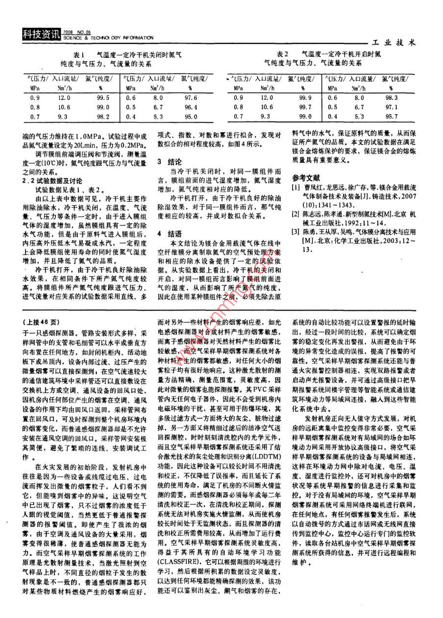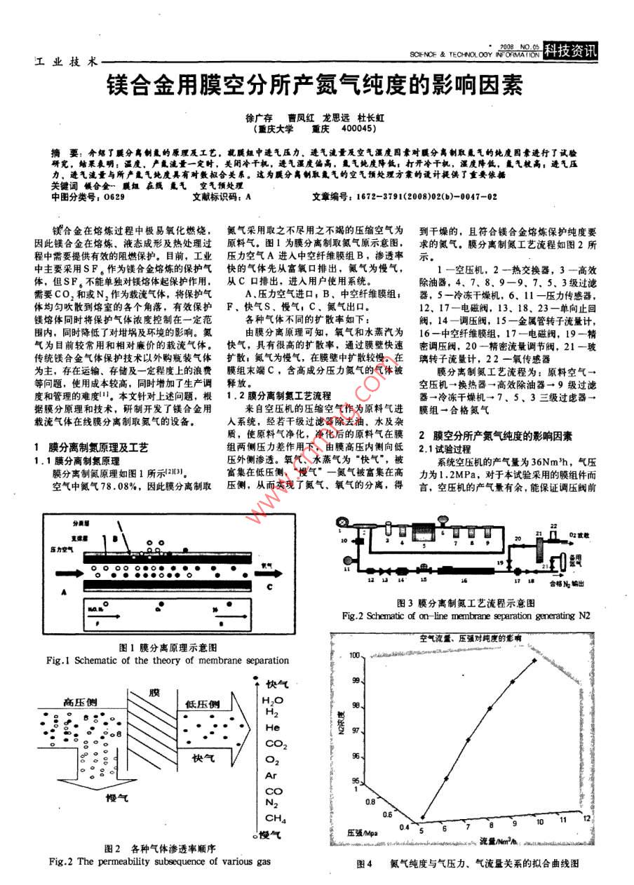 工業(yè)技術(shù)Ano如s科技資訊鎂合金用膜空分所產(chǎn)氮?dú)饧兌鹊挠绊懸蛩匦鞆V存曹鳳紅龍思遠(yuǎn)杜長虹重慶大學(xué)重慶400045)摘要:介紹了鼷分離制熏的原理及工藝,就膜中透氣壓力,透氣流量及空氣濕度國素對膜分離制取熏氣的純度因素進(jìn)行了試驗(yàn)砑究,果表明:溫度,產(chǎn)氯流量一定時(shí),美閉冷干機(jī),進(jìn)氣濕度偏高,氣免度降低:打開冷干機(jī),溫度降低,氳氣蟻高:進(jìn)氣壓力、避氣流量與所產(chǎn)氣梵度具有對數(shù)擬合美系。這為分離制取氣的空氣預(yù)處理方拿的設(shè)計(jì)提供了重要依據(jù)關(guān)鍵詞饌合金膜組在線熏氣空氣預(yù)處理中圖分類號:0629文獻(xiàn)標(biāo)識碼文章編號:1672-3791(2008)02(b)-0047-0因此鎂合金在熔煉、液態(tài)成形及熱處理過原料氣。圖1為膜分離制取氮?dú)庠疽鈭D,求的氮?dú)?。膜分離制氮工藝流程如圖2所程中需要提供有效的阻燃保護(hù)。目前,工業(yè)壓力空氣A進(jìn)入中空纖維膜組B,滲透率示。中主要采用SF。作為鎂合金熔煉的保護(hù)氣快的氣體先從富氧口排出,氮?dú)鉃槁龤?1一空壓機(jī),2一熱交換器,3一高效體,但SF6不能單獨(dú)對鎂熔體起保護(hù)作用,從C口排出,進(jìn)入用戶使用系統(tǒng)。除油器,4、7、8、9—9、7、5、3級過濾需要cO2和或N2作為載流氣體,將保護(hù)氣A.壓力空氣進(jìn)口,B、中空纖維膜組;器,5一冷凍干燥機(jī),6、11—壓力傳感器,體均勻吹散到熔室的各個(gè)角落,有效保護(hù)F,快氣S,慢氣;C、氮?dú)獬隹?2、17一電磁閥,13、18、23-單向止回鎂熔體同時(shí)將保護(hù)氣體濃度控制在一定范各種氣體不同的擴(kuò)散率如下閥,14一調(diào)壓閥,15一金屬管轉(zhuǎn)子流量計(jì),圍內(nèi),同時(shí)降低了對坩堝及環(huán)境的影響。氮由膜分離原理可知,氧氣和水蒸汽為16-中空纖維膜組,17一電磁閥,19—精氣為目前較常用和相對亷價(jià)的載流氣體??鞖?具有很高的擴(kuò)散率,通過膜壁快速密調(diào)壓閥,20一精密流量調(diào)節(jié)閥,21—玻統(tǒng)鎂合金氣體保護(hù)技術(shù)以外購瓶裝氣體擴(kuò)散;氮?dú)鉃槁龤?在膜璧中擴(kuò)散較慢。在璃轉(zhuǎn)子流量計(jì),22一氧傳感器為主,存在運(yùn)輸、存儲(chǔ)及一定程度上的浪費(fèi)膜組末端C,含高成分壓力氮?dú)獾臍怏w被膜分離制氮工藝流程為:原料空氣→等問題,使用成本較高,同時(shí)增加了生產(chǎn)調(diào)釋放空壓機(jī)→換熱器→高效除油器→9級過濾度和管理的難度l本文針對上述問題,根1.2膜分離制氮工藝流程器→冷凍干燥機(jī)→7、5、3三級過慮器→據(jù)膜分原理和技術(shù),研制開發(fā)了鎂合金用來自空壓機(jī)的壓縮空氣作為原料氣進(jìn)膜組一合格氮?dú)廨d流氣體在線膜分離制取氮?dú)獾脑O(shè)備。入系統(tǒng),經(jīng)若干級過濾器除去油,水及雜質(zhì),使原料氣凈化,凈化后的原料氣在膜2膜空分所產(chǎn)氮?dú)饧兌鹊挠绊懸蛩?膜分離制氮原理及工藝組兩側(cè)壓力差作用下,由膜高壓內(nèi)側(cè)向低2.1試驗(yàn)過程1.1膜分離制氮原理外側(cè)滲透。氧氣、水蒸氣為“快氣",被系統(tǒng)空壓機(jī)的產(chǎn)氣量為36Nmh,氣壓膜分離制氮原理如圖1所示213富集在低壓側(cè),“慢氣氮?dú)獗桓患诟吡?.2MPa,對于本試驗(yàn)采用的膜組件而空氣中氮?dú)?8.08%,因此膜分離制取壓側(cè),從而實(shí)現(xiàn)了氮?dú)狻⒀鯕獾姆蛛x,得言,空壓機(jī)的產(chǎn)氣量有余,能保證調(diào)壓閥前壓力空氣°°:?!D3膜分離制氮工藝流程示意圖Fig 2 Schematic of on-line membrane separation generating N2空氣流量、壓強(qiáng)對純度的能嘲圖1膜分離原理示意圖Fig. I Schematic of the theory of membrane separation快氣高壓側(cè)低壓側(cè)快氣慢氣c慢氣壓強(qiáng)№p圖2各種氣體滲透率順序x量/mFig. 2 The permeability subsequence of various gas圖4氮?dú)饧兌扰c氣壓力、氣流量關(guān)系的擬合曲線圖科技資訊TECHO OGY NFOFMATION表1氣溫度一定冷干機(jī)關(guān)閉時(shí)氮?dú)獗?氣溫度一定冷干機(jī)開啟時(shí)氮純度與氣壓力、氣流量的關(guān)系氣純度與氣壓力、氣流量的關(guān)系壓力/入凵流/氮?dú)饧兌?氣壓力/入山流/氦氣純度氣壓力/入口流/氯純度/氣壓力/入口流量/氮?dú)饧兌?Nm/hMPa Nm/hWPa、m3/h99.597.60.912.099.98.098.30.896.40.810.66.7端的氣壓力維持在1.0MPa,試驗(yàn)過程中成項(xiàng)式,指數(shù)、對數(shù)和冪進(jìn)行擬合,發(fā)現(xiàn)對料氣中的水氣,保證原料氣的質(zhì)量,從而保品氮?dú)饬髁吭O(shè)定為2Lmin,壓力為0.MPa。數(shù)擬合的相對程度較高,如圖4所示證所產(chǎn)氮?dú)獾钠焚|(zhì)。本文的試驗(yàn)數(shù)據(jù)在滿足調(diào)節(jié)糢組前端調(diào)壓閥和節(jié)流閥,測量溫鎂合金熔煉保護(hù)的要求,保證鎂合金的熔煉度一定(0℃)時(shí),氮?dú)饧兌雀鷼鈮毫εc氣流量3結(jié)論質(zhì)量具有重要意之間的關(guān)系當(dāng)冷干機(jī)關(guān)閉時(shí),對同一膜組件而2.2試驗(yàn)數(shù)據(jù)及討論言,膜組前面的進(jìn)氣濕度增加,氮?dú)鉂穸葏⒖嘉墨I(xiàn)式驗(yàn)數(shù)據(jù)見表1、表2。增加,氮?dú)饧兌认鄬?yīng)的降低。】曹鳳紅,龍思遠(yuǎn),徐廣存,等鎂合金用載流由以上表中數(shù)據(jù)可見,冷干機(jī)主要作冷干機(jī)打開,由于冷干機(jī)良好的除油氣體制備技術(shù)及裝備J鑄造技術(shù),2007用除油除永,冷