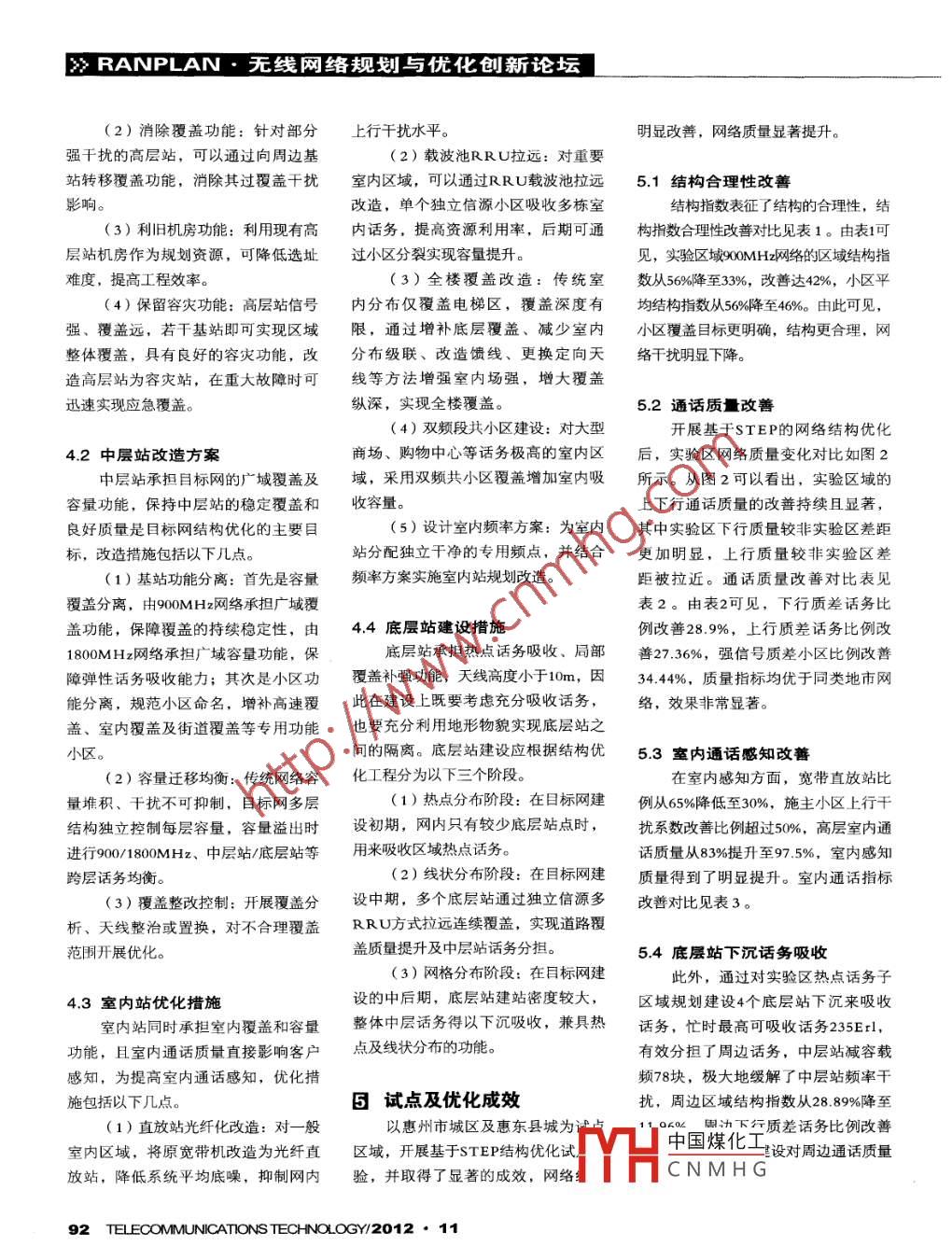 》RANPLAN.無(wú)線網(wǎng)絡(luò)規(guī)劃與優(yōu)化創(chuàng)新論壇(C ANPLanwww.ranplan.co.uk協(xié)辦基3 FSTEP的GSM結(jié)構(gòu)優(yōu)化古小璐古智趄中國(guó)移動(dòng)通信集團(tuán)廣東有限公司惠州分公司提出了一種基于STEP要素的網(wǎng)絡(luò)結(jié)構(gòu)優(yōu)化體系,通過(guò)轉(zhuǎn)變網(wǎng)絡(luò)發(fā)展方式,從結(jié)構(gòu)角度闡述了目標(biāo)網(wǎng)絡(luò)形摘要態(tài),并提出了長(zhǎng)期演進(jìn)的網(wǎng)絡(luò)結(jié)構(gòu)優(yōu)化策略,對(duì)無(wú)線網(wǎng)絡(luò)進(jìn)行重構(gòu)和優(yōu)化,從而解決了GSM網(wǎng)絡(luò)在發(fā)展中面臨的容量、覆蓋和質(zhì)量因素相互制約的瓶頸問題。關(guān)鍵詞GSM網(wǎng)絡(luò)結(jié)構(gòu)網(wǎng)絡(luò)優(yōu)化STEP0引言增加,頻率復(fù)用干擾增大,大量的高站容工程還導(dǎo)致網(wǎng)絡(luò)結(jié)構(gòu)快速變化,為滿足快速增長(zhǎng)的業(yè)務(wù)需求,和直放站加劇了干擾擴(kuò)散,導(dǎo)致載干比造成網(wǎng)絡(luò)質(zhì)量劇烈波動(dòng)、客戶感知.中國(guó)移動(dòng)GSM無(wú)線網(wǎng)絡(luò)通過(guò)長(zhǎng)期簡(jiǎn)單C/I不斷降低。設(shè)頻率復(fù)用距離為D,小度不斷降低。加站和粗放擴(kuò)容,規(guī)模急劇擴(kuò)大。在區(qū)覆蓋半徑為R,可用頻點(diǎn)數(shù)為M,小網(wǎng)絡(luò)發(fā)展初期這種方式能夠高效地提區(qū)平均載頻配置為E,則載干比C/I滿足3目標(biāo)網(wǎng)及STEP結(jié)構(gòu)優(yōu)化升容量,但隨著擴(kuò)容工程持續(xù)開展,公式( 1 )。策略網(wǎng)絡(luò)結(jié)構(gòu)逐漸復(fù)雜,網(wǎng)絡(luò)質(zhì)量劇烈波∈="k:qr=k員增針對(duì)傳統(tǒng)網(wǎng)絡(luò)的結(jié)構(gòu)弊端,為突動(dòng),頻率干擾急劇增加,網(wǎng)絡(luò)容量、破發(fā)展瓶頸、提升用戶感知,提出了覆蓋和質(zhì)量間的矛盾日益凸顯,網(wǎng)絡(luò)目標(biāo)網(wǎng)及其結(jié)構(gòu)優(yōu)化策略,通過(guò)轉(zhuǎn)變優(yōu)化難度越來(lái)越大,網(wǎng)絡(luò)遇到了嚴(yán)峻由公式(1)可見,載干比C/I與頻率發(fā)展方式,根據(jù)話務(wù)分布特點(diǎn)和用戶的發(fā)展瓶頸問題。因此,如何突破發(fā)復(fù)用距離D、可用頻點(diǎn)數(shù)M正相關(guān),與行為特性,在地域上將傳統(tǒng)二維平面展瓶頸,實(shí)現(xiàn)GSM網(wǎng)絡(luò)的可持續(xù)科學(xué)小區(qū)覆蓋半徑R和平均小區(qū)配置E負(fù)相網(wǎng)絡(luò)改造為立體層次網(wǎng)絡(luò),在功能上發(fā)展,已成為中國(guó)移動(dòng)網(wǎng)絡(luò)優(yōu)化專業(yè)關(guān)。持續(xù)建站及擴(kuò)容工程使頻率復(fù)用對(duì)網(wǎng)絡(luò)進(jìn)行強(qiáng)化和區(qū)分,在能效.上對(duì)的重要研究課題。距離D減小、小區(qū)配置E增大,當(dāng)可用資源利用實(shí)現(xiàn)提高和均衡,同時(shí)在手頻率資源M和小區(qū)覆蓋半徑R不變時(shí),段上開展創(chuàng)新和精細(xì)優(yōu)化。2傳統(tǒng)網(wǎng)絡(luò)結(jié)構(gòu)的發(fā)展瓶頸必然導(dǎo)致載干比C/I降低。傳統(tǒng)的無(wú)線網(wǎng)絡(luò)是一個(gè)物理結(jié)構(gòu)復(fù)因此,傳統(tǒng)網(wǎng)絡(luò)結(jié)構(gòu)的發(fā)中國(guó)煤化工構(gòu)雜、邏輯結(jié)構(gòu)簡(jiǎn)單、承載功能綜合、頻頸在于無(wú)法解決容量、覆蓋增MYHCN MH G網(wǎng)絡(luò)長(zhǎng)期發(fā)展的立率復(fù)用單-的二維平面網(wǎng)絡(luò),隨著容量求導(dǎo)致質(zhì)量降低的矛盾。同時(shí),擴(kuò)體層以網(wǎng)路,如圖1所示。目標(biāo)網(wǎng)形態(tài)90 TEl ECOMMUNICATIONSTECHNOLOGY/2012●11》RANPLAN.無(wú)線網(wǎng)絡(luò)規(guī)劃與優(yōu)化創(chuàng)新論壇(2)消除覆蓋功能:針對(duì)部分上行干擾水平。明顯改善,網(wǎng)絡(luò)質(zhì)量顯著提升。強(qiáng)干擾的高層站,可以通過(guò)向周邊基(2)載波池RRU拉遠(yuǎn):對(duì)重要站轉(zhuǎn)移覆蓋功能,消除其過(guò)覆蓋干擾室內(nèi)區(qū)域,可以通過(guò)RRU載波池拉遠(yuǎn)5.1結(jié)構(gòu)合理性改善影響改造,單個(gè)獨(dú)立信源小區(qū)吸收多棟室結(jié)構(gòu)指數(shù)表征了結(jié)構(gòu)的合理性,結(jié)(3)利舊機(jī)房功能:利用現(xiàn)有高內(nèi)話務(wù),提高資源利用率,后期可通構(gòu)指數(shù)合理性改善對(duì)比見表1。由表可層站機(jī)房作為規(guī)劃資源,可降低選址過(guò)小區(qū)分裂實(shí)現(xiàn)容量提升。見,實(shí)驗(yàn)區(qū)域900MHz網(wǎng)絡(luò)的區(qū)域結(jié)構(gòu)指難度,提高工程效率。(3)全樓覆蓋改造:傳統(tǒng)室數(shù)從56%降至33%,改善達(dá)42%,小區(qū)平(4)保留容災(zāi)功能:高層站信號(hào)內(nèi)分布僅覆蓋電梯區(qū),覆蓋深度有均結(jié)構(gòu)指數(shù)從56%降至46%。由此可見,強(qiáng)、覆蓋遠(yuǎn),若干基站即可實(shí)現(xiàn)區(qū)域限,通過(guò)增補(bǔ)底層覆蓋、減少室內(nèi)小區(qū)覆蓋目標(biāo)更明確,結(jié)構(gòu)更合理,網(wǎng)整體覆蓋,具有良好的容災(zāi)功能,改分布級(jí)聯(lián)、改造饋線、更換定向天絡(luò)干擾明顯下降。造高層站為容災(zāi)站,在重大故障時(shí)可線等方法增強(qiáng)室內(nèi)場(chǎng)強(qiáng),增大覆蓋迅速實(shí)現(xiàn)應(yīng)急覆蓋??v深,實(shí)現(xiàn)全樓覆蓋。5.2通話質(zhì)改善(4)雙頻段共小區(qū)建設(shè):對(duì)大型開展基于