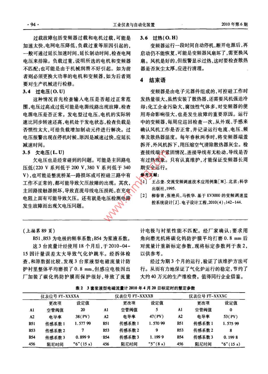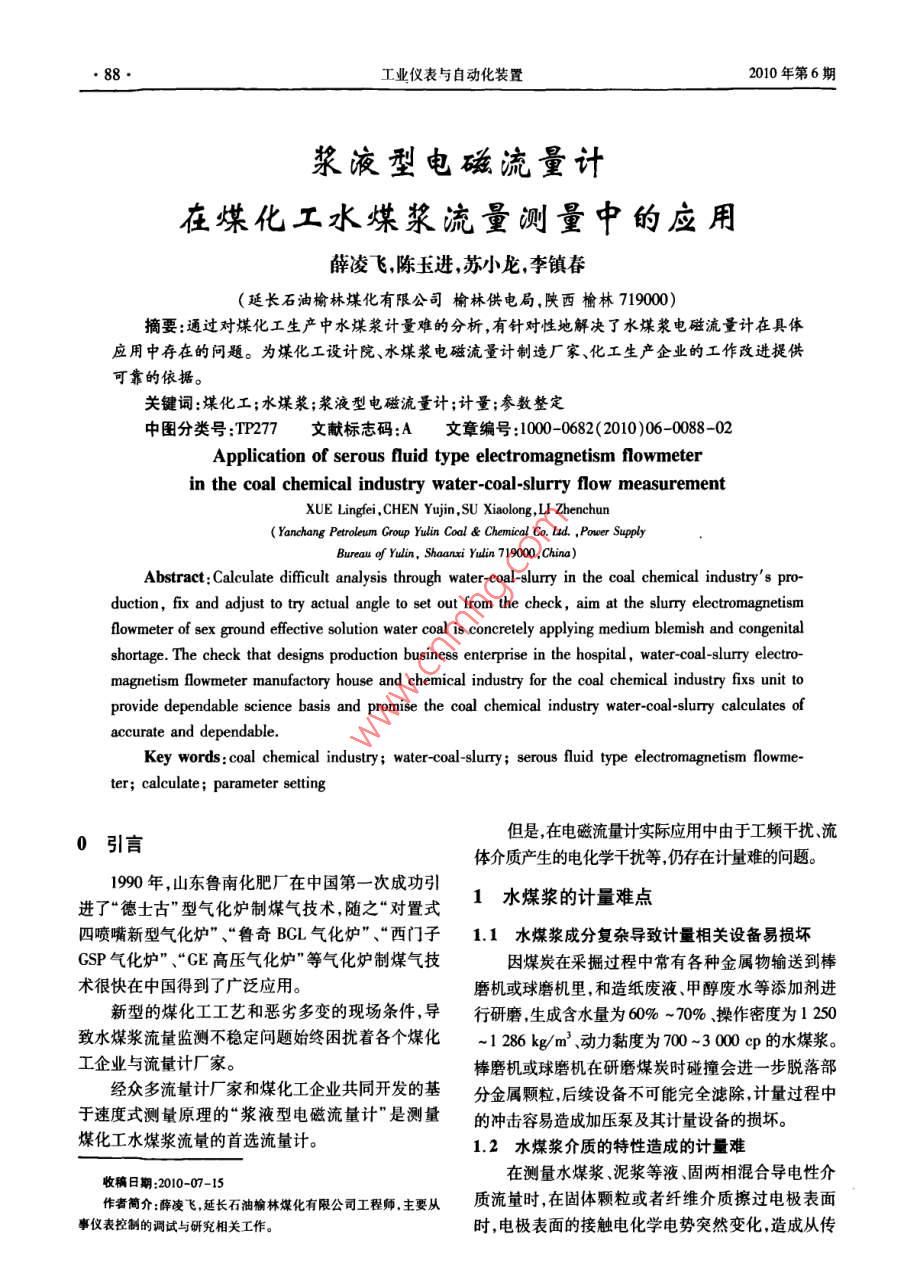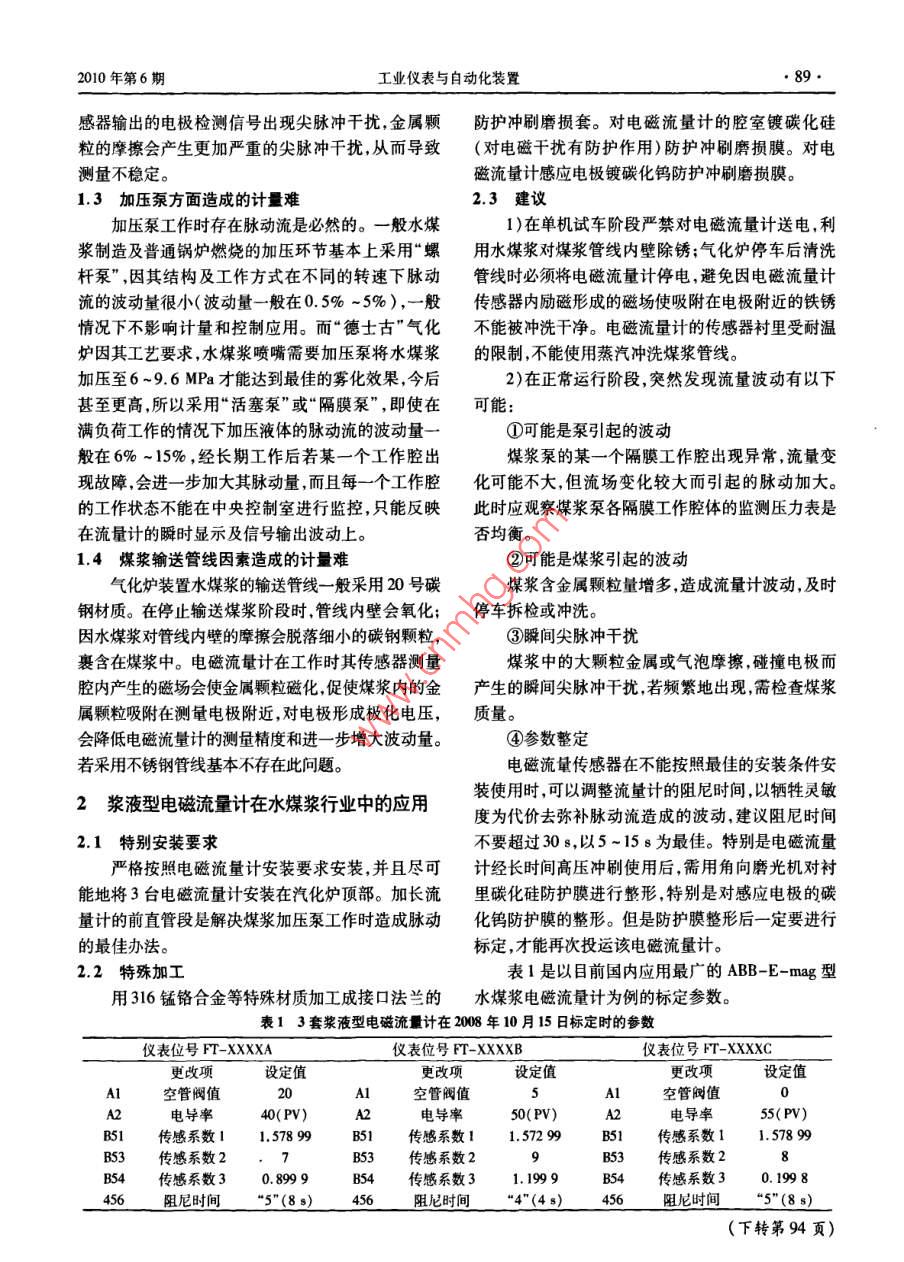 工業(yè)儀表與自動(dòng)化裝置2010年第6期漿漩型電磁流量計(jì)在煤化工水煤漿流量測量中的應(yīng)用薛凌飛,陳玉進(jìn),蘇小龍,李鎮(zhèn)春(延長石油榆林煤化有限公司榆林供電局,陜西檜林719000摘要:通過對煤化工生產(chǎn)中水煤漿計(jì)量難的分析,有針對性地解決了水煤漿電磁流量計(jì)在具體應(yīng)用中存在的問題。為煤化工設(shè)計(jì)院、水煤漿電磁流量計(jì)制造廠家、化工生產(chǎn)企業(yè)的工作改進(jìn)提供可靠的依據(jù)。關(guān)鍵詞:煤化工;水煤漿;漿液型電磁流量計(jì);計(jì)量;參數(shù)整定中圖分類號(hào):TP277文獻(xiàn)標(biāo)志碼:A文章編號(hào):1000-0682(2010)06-088-02Application of serous fluid type electromagnetism flowmeterin the coal chemical industry water-coal-slurry flow measurementXUE Lingfei, CHEN Yujin, SU Xiaolong, LI ZhenchunYanchang Petroleum Group Yulin Coal& Chemical Co Ld., Pooer SupplyBureau of Yulin, Shaanxi Yulin 719000, China)Abstract: Calculate difficult analysis through water-coal-slurry in the coal chemical industrys pro-duction, fix and adjust to try actual angle to set out from the check, aim at the slurry electromagnetismflowmeter of sex ground effective solution water coal is concretely applying medium blemish and congenitshortage. The check that designs production business enterprise in the hospital, water-coal-slurry electro-magnetism flowmeter manufactory house and chemical industry for the coal chemical industry fixs unit toprovide dependable science basis and promise the coal chemical industry water-coal-slurry calculates ofaccurate and dependableKey words: coal chemical industry water-coal-slurry; serous fluid type electromter;calculate; parameter setting0引言但是,在電磁流量計(jì)實(shí)際應(yīng)用中由于工頻干擾、流體介質(zhì)產(chǎn)生的電化學(xué)干擾等,仍存在計(jì)量難的問題。1990年,山東魯南化肥廠在中國第一次成功引進(jìn)了“德士古”型氣化爐制煤氣技術(shù),隨之“對置式1水煤漿的計(jì)量難點(diǎn)四噴嘴新型氣化爐”、“魯奇BCL氣化爐”、“西門子1.1水煤漿成分復(fù)雜導(dǎo)致計(jì)量相關(guān)設(shè)備易損壞GSP氣化爐”、“CE高壓氣化爐”等氣化爐制煤氣技因煤炭在采掘過程中常有各種金屬物輸送到棒術(shù)很快在中國得到了廣泛應(yīng)用。磨機(jī)或球磨機(jī)里,和造紙廢液、甲醇廢水等添加劑進(jìn)新型的煤化工工藝和惡劣多變的現(xiàn)場條件,導(dǎo)行研磨,生成含水量為60%-70%、操作密度為1250致水煤漿流量監(jiān)測不穩(wěn)定問題始終困擾著各個(gè)煤化-1286kg/m3、動(dòng)力黏度為700~30p的水煤漿。工企業(yè)與流量計(jì)廠家。棒磨機(jī)或球磨機(jī)在研磨煤炭時(shí)碰撞會(huì)進(jìn)一步脫落部經(jīng)眾多流量計(jì)廠家和煤化工企業(yè)共同開發(fā)的基分金屬顆粒,后續(xù)設(shè)備不可能完全濾除計(jì)量過程中于速度式測量原理的“漿液型電磁流量計(jì)”是測量的沖擊容易造成加壓泵及其計(jì)量設(shè)備的損壞。煤化工水煤漿流量的首選流量計(jì)。1.2水煤漿介質(zhì)的特性造成的計(jì)量難收稿日期:2010-07-15在測量水煤漿泥漿等液、固兩相混合導(dǎo)電性介子作者簡介薛凌飛延長石油榆林煤化有限公司工程師主要從質(zhì)流量時(shí),在固體顆?;蛘呃w維介質(zhì)擦過電極表面表控制的調(diào)試與研究相關(guān)工作時(shí),電極表面的接觸電化學(xué)電勢突然變化,造成從傳2010年第6期工業(yè)儀表與自動(dòng)化裝置感器輸出的電極檢測信號(hào)出現(xiàn)尖脈沖干擾,金屬顆防護(hù)沖刷磨損套。對電磁流量計(jì)的腔室鍍碳化硅粒的摩擦?xí)a(chǎn)生更加嚴(yán)重的尖脈沖干擾,從而導(dǎo)致(對電磁干擾有防護(hù)作用)防護(hù)沖刷磨損膜。對電測量不穩(wěn)定。磁流量計(jì)感應(yīng)電極鍍碳化鎢防護(hù)沖刷磨損膜。1.3加壓泵方面造成的計(jì)量難2.3建議加壓泵工作時(shí)存在脈動(dòng)流是必然的。一般水煤1)在單機(jī)試車階段嚴(yán)禁對電磁流量計(jì)送電,利漿制造及普通鍋爐燃燒的加壓環(huán)節(jié)基本上釆用“螺用水煤漿對煤漿管線內(nèi)壁除銹;氣化爐停車后清洗桿泵”,因其結(jié)構(gòu)及工作方式在不同的轉(zhuǎn)速下脈動(dòng)管線時(shí)必須將電磁流量計(jì)停電,避免因電磁流量計(jì)流的波動(dòng)量很小(波動(dòng)量一般在0.5%-5%),一般傳感器內(nèi)勵(lì)磁形成的磁場使吸附在電極附近的鐵銹情況下不影響計(jì)量和控制應(yīng)用。而“德士古”氣化不能被沖洗干凈。電磁流量計(jì)的傳感器襯里受耐溫爐因其工藝要求,水煤漿噴嘴需要加壓泵將水煤漿的限制,不能使用蒸汽沖洗煤漿管線。加壓至6~96MPa才能達(dá)到最佳的霧化效果,今后2)在正常運(yùn)行階段,突然發(fā)現(xiàn)流量波動(dòng)有以下甚至更高所以采用“活塞泵”或“隔膜泵”,即使在可能滿負(fù)荷工作的情況下加壓液體的脈動(dòng)流的波動(dòng)量①可能是泵引起的波動(dòng)般在6%~15%,經(jīng)長期工作后若某一個(gè)工作腔出煤漿泵的某一個(gè)隔膜工作腔出現(xiàn)異常,流量變現(xiàn)故障,會(huì)進(jìn)一步加大其脈動(dòng)量,而且每一個(gè)工作腔化可能不大,但流場變化較大而引起的脈動(dòng)加大的工作狀態(tài)不能在中央控制室進(jìn)行監(jiān)控,只能反映此時(shí)應(yīng)觀察煤漿泵各隔膜工作腔體的監(jiān)測壓力表是在流量計(jì)的瞬