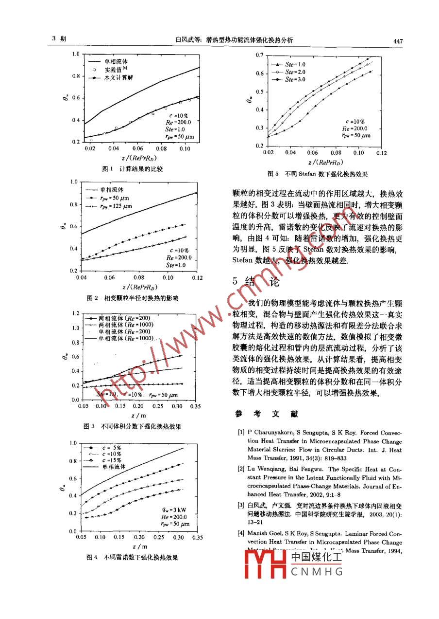 第24蒼第3期工程熱物理學(xué)報(bào)Vol 24 No.3003年5月JOURNAL OF ENGINEERING THERMOPHYSICSMay,2003潛熱型熱功能流體強(qiáng)化換熱分析白鳳武盧文強(qiáng)(中國(guó)科學(xué)院研究生院物理系,北京100039)摘要本文建立了分析帶有相變微膠囊的潛熱型熱功能流體的流動(dòng)和換熱過(guò)程數(shù)理模型,應(yīng)用有限差分法和移動(dòng)熱源進(jìn)行聯(lián)合求解,計(jì)算結(jié)果表明,相變微膠囊的加入,較好地提高了流體的換熱性能.獲得了相變顆粒大小和體積分?jǐn)?shù)對(duì)強(qiáng)化換熱態(tài)響等結(jié)果。計(jì)算結(jié)果對(duì)該類流體的設(shè)計(jì)和應(yīng)用提供了理論依據(jù)關(guān)鑣詞潛熱型熱功能流體;有限差分法;移功熱源法中圖分類號(hào):TK121文獻(xiàn)標(biāo)識(shí)碼A文章編號(hào):0253-231X(2003)03-0445-03ENHANCED HEAT TRANSFER ANALYSIS OF LATENTFUNCTIONALLY THERMAL FLUIDBAI Feng-Wu LU Wen-Qiang(Graduate School of the Chinese Academy of Sciences, Beijing 100039, China)Abstract A physical model has been developed to analyze the enhanced heat transfer process ofthe latent functionally thermal fluid with microencapsulated phase change material. The problem issolved by the combination of the finite difference method and the moving heat source method. thealculated results reveal that putting the phase change microcapsules into the fuids better improthe heat transfer capabilities of the mixture By the calculations, the effects of capsule radius andconcentration of particles are obtained. The numerical results provide the theoretic basis for theapplication and design of the latent functionally thermal AuidKey words lateat functionally thermal fuid; finite difference method; moving heat source method前言是不可壓縮層流牛頓流體。微膠囊顆粒是堅(jiān)硬的球潛熱型熱功能流體是由不同方法特制的相變材體,其兩相熱物性相同且不隨溫度變化只考慮流料微胺囊和單相傳熱流體構(gòu)成的一種固液多相流動(dòng)充分發(fā)展段,忽略流體的粘性耗散和軸向?qū)?體,是一種集儲(chǔ)熱與強(qiáng)化傳熱功能于一身的新型儲(chǔ)口溫度均勻,且低于融化點(diǎn)溫度傳熱介質(zhì)。已應(yīng)用于航天器熱控制、電子設(shè)備冷卻21工作流體換熱過(guò)程和流化床等領(lǐng)域。根據(jù)上述假設(shè),在柱坐標(biāo)系下,圓管內(nèi)工作流實(shí)際的換熱過(guò)程是混合物與壁面間的換熱,而體的充分發(fā)展段能量方程為顆粒的相變過(guò)程受到流體與顆粒間的熱交換控制(1-902=Rb(4+nam)+S(1)本文針對(duì)已有模型沒(méi)有反映這些物理過(guò)程的缺點(diǎn)其中表示溫度,P為密度,cp為定壓比熱,k為建立了新的物理模型,采用新的混合物比熱計(jì)算公式應(yīng)用有限差分法和移動(dòng)熱源法的聯(lián)合求解方法,導(dǎo)熱系數(shù),c為微膠囊的體積分?jǐn)?shù),R和2分別為數(shù)值模擬了定壁面熱流加熱的管道內(nèi)層流流動(dòng)的換坐標(biāo)系下的徑向和軸向坐標(biāo)變量,源項(xiàng)S表示相熱過(guò)程,分析了其強(qiáng)化換熱效果的主要影響參數(shù)變微膠囊與流體之間的換熱,u為流體速度,下標(biāo)2換熱過(guò)程的數(shù)理模型∫表示工作流體.充分發(fā)展段速度分布:u=2um(1-(R/RD)21基本假設(shè):最大微膠囊體積分?jǐn)?shù)為0.20,忽略顆粒對(duì)流體流動(dòng)的影響和顆粒間的相互作用,流體其中um為平均速度,RD為管子半徑收稿日期:2002-1228;修訂日期:20030318基金項(xiàng)目國(guó)家自然科學(xué)基金資助項(xiàng)目(No50176048;No5007602);國(guó)家作者簡(jiǎn)介白風(fēng)武(1975-),男,吉林九臺(tái)人,博土生,主要從事兩相流iTYH中國(guó)煤化工CNMHG446熱物理學(xué)報(bào)單位體積的微膠囊與流體之間的換熱量S為:r為顆粒的相界面半徑將式(8~10)代入式(7)得S=hpc(Tpu-Ts)/pu其中Tm為相變顆粒的壁面溫度,h為顆粒與周圍流體的對(duì)流換熱系數(shù),rp為顆粒的半徑22相變微膠囊的相變過(guò)程kR2+1+(m+1):Bc,/PaE(1)忽略相變過(guò)程液體的流動(dòng),顆粒在與流體換熱作用下的相變過(guò)程可用移動(dòng)熱源法描述:由方程(11)可以看出,混合物的能量方程受相a(rTp) g(r)變物質(zhì)的體積分?jǐn)?shù)和相變速率的影響at 0
