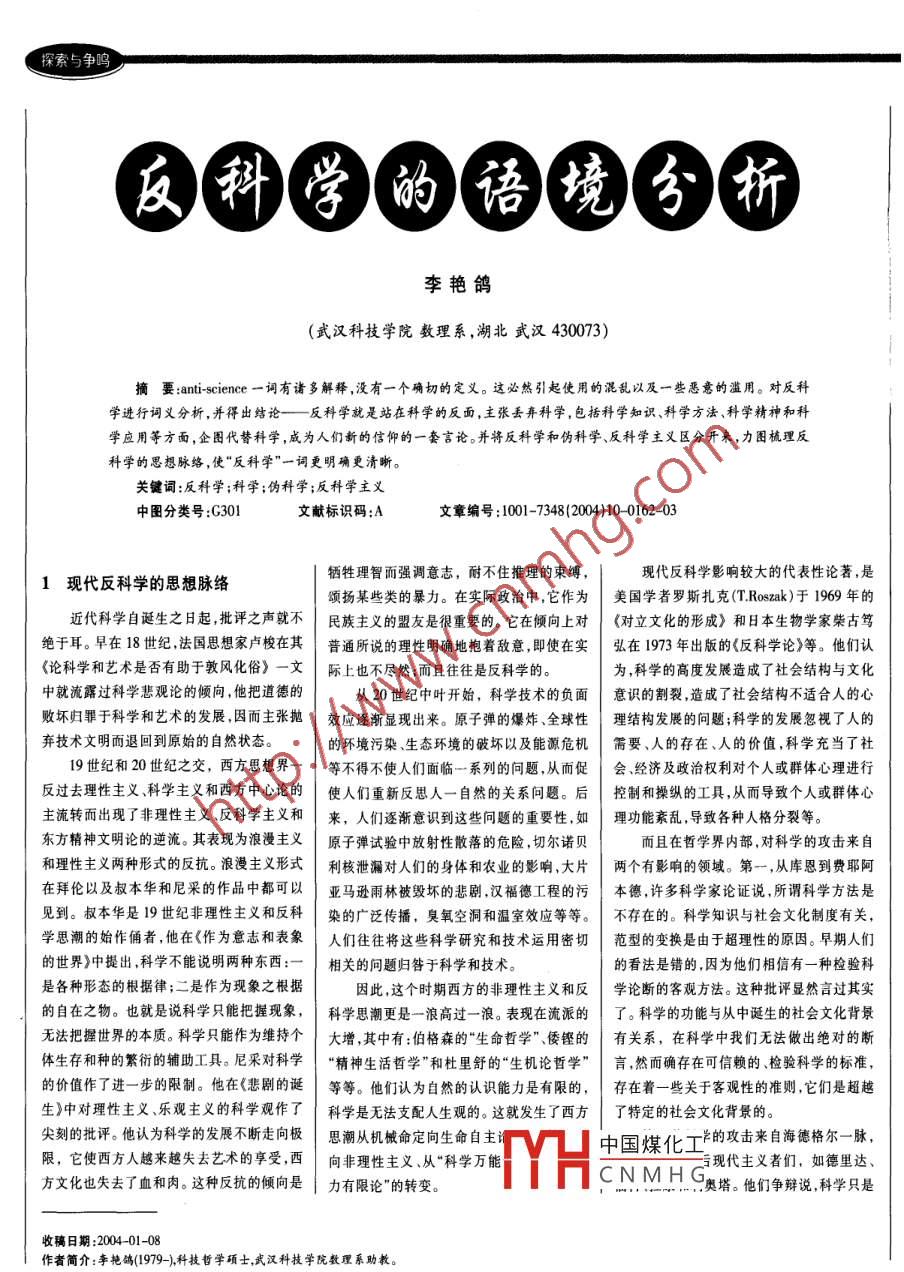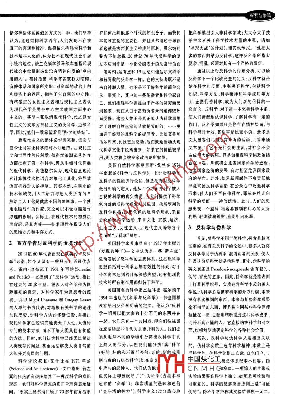探索與爭鳴反科(學(xué))的語境分析李艷鴿(武漢科技學(xué)院數(shù)理系,湖北武漢430073)摘要:anti-science 一詞有諸多解釋,沒有一個確切的定義。這必然引起使用的混亂以及一些惡意的濫用。對反科學(xué)進(jìn)行詞義分析,并得出結(jié)論--反科學(xué)就是站在科學(xué)的反面, 主張丟棄科學(xué),包括科學(xué)知識、科學(xué)方法、科學(xué)精神和科學(xué)應(yīng)用等方面,企圖代替科學(xué),成為人們新的信仰的一套言論。并將反科學(xué)和偽科學(xué)反科學(xué)主義區(qū)分開來,力圖梳理反科學(xué)的思想脈絡(luò),使“反科學(xué)”一詞更明確更清晰。關(guān)鍵詞:反科學(xué);科學(xué);偽科學(xué);反科學(xué)主義中圖分類號:G301文獻(xiàn)標(biāo)識碼:A文章編號:1001-7348 (2004)10- -0162-03犧牲理智而強調(diào)意志,耐不住推理的束縛,現(xiàn)代反科學(xué)影響較大的代表性論著,是1現(xiàn)代反科學(xué)的思 想脈絡(luò)頌揚某些類的暴力。在實際政治中,它作為美國學(xué)者羅斯扎克(T.Roszak)于1969年的近代科學(xué)自誕生之日起,批評之聲就不民族主義的盟友是很重要的。它在傾向上對《對立文化的形成》和日本生物學(xué)家柴古篤絕于耳。早在18世紀(jì),法國思想家盧梭在其普通所說的理性明確地抱著敵意,即使在實弘在1973年出版的《反科學(xué)論》等。他們認(rèn)《論科學(xué)和藝術(shù)是否有助于敦風(fēng)化俗》一-文際上也不盡然;而且往往是反科學(xué)的。為,科學(xué)的高度發(fā)展造成了社會結(jié)構(gòu)與文化中就流露過科學(xué)悲觀論的傾向,他把道德的從20世紀(jì)中葉開始,科學(xué)技術(shù)的負(fù)面意識的割裂,造成了社會結(jié)構(gòu)不適合人的心敗壞歸罪于科學(xué)和藝術(shù)的發(fā)展,因而主張拋效應(yīng)逐漸顯現(xiàn)出來。原子彈的爆炸、全球性理結(jié)構(gòu)發(fā)展的問題;科學(xué)的發(fā)展忽視了人的棄技術(shù)文明而退回到原始的自然狀態(tài)。的環(huán)境污染、生態(tài)環(huán)境的破壞以及能源危機需要、人的存在、人的價值,科學(xué)充當(dāng)了社19世紀(jì)和20世紀(jì)之交,西方思想界一等不得不使人們面臨-系列的問題,從而促會、經(jīng)濟及政治權(quán)利對個人或群體心理進(jìn)行反過去理性主義、科學(xué)主義和西方中心論的使人們重新反思人一自然的關(guān)系問題。后控制和操縱的工具,從而導(dǎo)致個人或群體心主流轉(zhuǎn)而出現(xiàn)了非理性主義、反科學(xué)主義和來,人們逐漸意識到這些問題的重要性,如理功能紊亂,導(dǎo)致各種人格分裂等。東方精神文明論的逆流。其表現(xiàn)為浪漫主義原子彈試驗中放射性散落的危險,切爾諾貝而且在哲學(xué)界內(nèi)部,對科學(xué)的攻擊來自和理性主義兩種形式的反抗。浪漫主義形式利核泄漏對人們的身體和農(nóng)業(yè)的影響,大片兩個有影響的領(lǐng)域。第一,從庫恩到費耶阿在拜倫以及叔本華和尼采的作品中都可以亞馬遜雨林被毀壞的悲劇,漢福德工程的污本德,許多科學(xué)家論證說,所謂科學(xué)方法是見到。叔本華是19世紀(jì)非理性主義和反科染的廣泛傳播,臭氧空洞和溫室效應(yīng)等等。不存在的。科學(xué)知識與社會文化制度有關(guān),學(xué)思潮的始作俑者,他在《作為意志和表象人們往往將這些科學(xué)研究和技術(shù)運用密切范型的變換是由于超理性的原因。早期人們的世界》中提出,科學(xué)不能說明兩種東西:一相關(guān)的問題歸咎于科學(xué)和技術(shù)。的看法是錯的,因為他們相信有一種檢驗科是各種形態(tài)的根據(jù)律;二是作為現(xiàn)象之根據(jù)因此,這個時期西方的非理性主義和反學(xué)論斷的客觀方法。這種批評顯然言過其實的自在之物。也就是說科學(xué)只能把握現(xiàn)象,科學(xué)思潮更是一浪高過一浪。表現(xiàn)在流派的了??茖W(xué)的功能與從中誕生的社會文化背景無法把握世界的本質(zhì)。科學(xué)只能作為維持個大增,其中有:伯格森的“生命哲學(xué)"、倭鏗的有關(guān)系,在科學(xué)中我們無法做出絕對的斷體生存和種的繁衍的輔助工具。尼采對科學(xué)“精神生活哲學(xué)”和杜里舒的“生機論哲學(xué)”言,然而確存在可信賴的、檢驗科學(xué)的標(biāo)準(zhǔn),的價值作了進(jìn)-一步的限制。他在《悲劇的誕等等。他們認(rèn)為自然的認(rèn)識能力是有限的,存在著一 些關(guān)于客觀性的準(zhǔn)則,它們是超越生》中對理性主義、樂觀主義的科學(xué)觀作了科學(xué)是無法支配人生觀的。這就發(fā)生了西方了特定的社會文化背景的。尖刻的批評。他認(rèn)為科學(xué)的發(fā)展不斷走向極思潮從機械命定向生命自主中國煤化工*的攻擊來自海德格爾-脈,限,它使西方人越來越失去藝術(shù)的享受,西向非理性主義、從“科學(xué)萬能三手現(xiàn)代主義者們,如德里達(dá)、方文化也失去了血和肉。這種反抗的傾向是力有限論”的轉(zhuǎn)變。YHCNM H6奧塔。他們爭辯說,科學(xué)只是收稿日期:2004-01-08作者簡介:李艷鴿(1979-),科技哲學(xué)碩士,武漢科技學(xué)院數(shù)理系助教。162科技進(jìn)步寫對策10月號2004探索與爭鳴諸多神話體系或敘述方式的一種。 他們堅持|羅 如何批判他那個時代的知識分子,而贊同把科學(xué)模型引入非科學(xué)