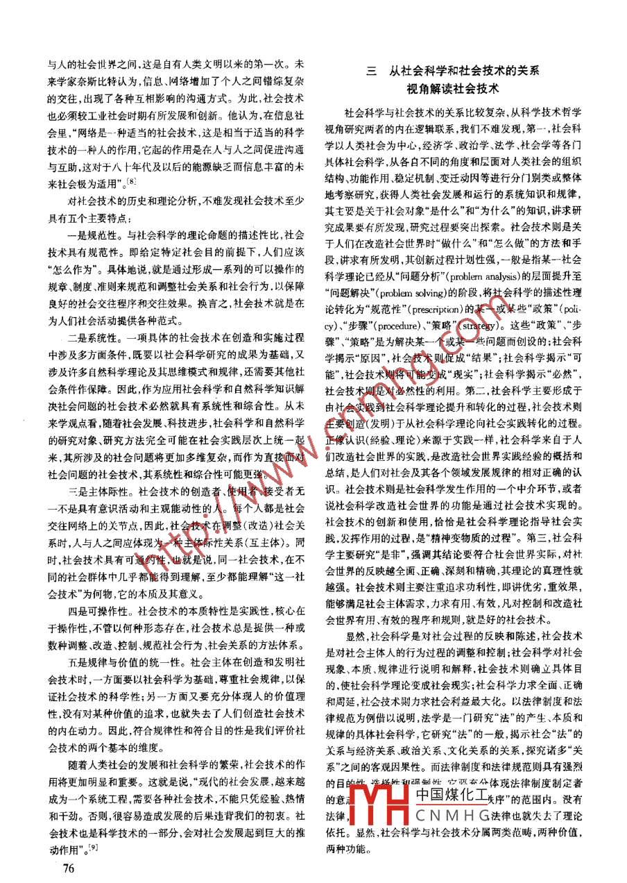 第23卷,第1期科學(xué)技術(shù)與辯證法Vol.23 No. 12006年2月Science, Technology and DialecticsFeb. ,2006試論社會技術(shù)的本質(zhì)趙大宇,田鵬穎2(1.東北大學(xué)科學(xué)技術(shù)哲學(xué)研究中心,遼寧沈陽10004;2.沈陽師范大學(xué)科學(xué)技術(shù)哲學(xué)研究中心,遼寧沈陽10034)摘要:社會技術(shù)的本質(zhì)問題是社會技術(shù)哲學(xué)研究的一個核心問題。 社會技術(shù)是人們改造社會世界、調(diào)整社會關(guān)系、控制社會運(yùn)行、解決社會矛盾、實(shí)現(xiàn)人類改造社會世界目的的實(shí)踐性知識體系。社會科學(xué)是社會技術(shù)的理論基礎(chǔ),社會技術(shù)是社會科學(xué)發(fā)生作用的中介。社會科學(xué)向社會技術(shù)的轉(zhuǎn)化是科學(xué)理論向社會實(shí)踐的轉(zhuǎn)化、客觀必然性向主觀目的性的轉(zhuǎn)化、相對真理性向社會功利性的轉(zhuǎn)化。關(guān)鍵詞:社會技術(shù);社會科學(xué);社會科學(xué)向社會技術(shù)轉(zhuǎn)化中圖分類號:N031文獻(xiàn)標(biāo)識碼:A文章編號:1003 - 5680(2006)01 - 0074 - 04社會技術(shù)的本質(zhì)問題是社會技術(shù)哲學(xué)研究的一個核心的認(rèn)識論前提。問題。筆者認(rèn)為,社會技術(shù)是人們改造社會世界,調(diào)整社會在西方以孔德等為代表的實(shí)證主義者認(rèn)為,社會現(xiàn)象和關(guān)系,控制社會運(yùn)行,解決社會矛盾,實(shí)現(xiàn)人類改造社會世界自然現(xiàn)象本質(zhì)上是一致的,即都是客觀的、因果性的和有規(guī)目的的實(shí)踐性知識體系。對社會技術(shù)的本質(zhì)可以從社會科律的,主張借用自然科學(xué)的方法和基本原則對人類社會進(jìn)行學(xué)與社會技術(shù)的關(guān)系視角深入理解。研究,試圖將社會科學(xué)建構(gòu)成“研究社會的自然科學(xué)”。但把社會科學(xué)自然科學(xué)化的思想觀點(diǎn)和理論嘗試一直遭到質(zhì)疑- -從科學(xué)學(xué)視角解讀社會科學(xué)和批判。特別是20世紀(jì)60年代以來,反對者的聲音越來越科學(xué)學(xué)家貝爾納認(rèn)為,“人類對他生活在里面的社會的高。一是來自馬克斯.韋伯開創(chuàng)的社會學(xué)人文主義傳統(tǒng)的批知識遠(yuǎn)比他們對周圍物質(zhì)世界的知識,或者對這個批界里生判。他認(rèn)為社會科學(xué)與自然科學(xué)在邏輯上大相徑庭,堅(jiān)持反長和生活著的植物和動物的知識更難于獲得,過去如此,現(xiàn)對用自然科學(xué)法則來使社會科學(xué)科學(xué)化。二是來自一些白在還是這樣,關(guān)于人類社會的各門科學(xué)作為-一個類別理論,然科學(xué) 家和社會科學(xué)家的批評,他們認(rèn)為,“社會科學(xué)的研究都是些最年青的和最不完備的科學(xué),而且就其主要形式來結(jié)果不如自然科學(xué)”,因而對社會科學(xué)的科學(xué)性表示懷疑。看,它們被稱為科學(xué),有些人是懷疑的。1社會科學(xué)是否是三是來白狄爾泰的懷疑,他認(rèn)為白然、自然科學(xué)與社會、社會科學(xué)的問題,進(jìn)而科學(xué)劃界問題,在嚴(yán)格意義上,這是一個哲科學(xué)的區(qū)別是本體論的,是原則性的。它們之間存在著諸如學(xué)問題。純粹的客觀性、外在性與自由的創(chuàng)造性、內(nèi)在性,確定性與非眾所周知,自然科學(xué)、社會科學(xué)和人文科學(xué)(本文暫不論確定性,普遍性與個別性,分類的循環(huán)與詮釋的循環(huán)的對立。及)是當(dāng)代科學(xué)的三大基本類型。自然科學(xué)對于社會科學(xué)的實(shí)際上,孔德的觀點(diǎn)和孔德觀點(diǎn)批判者的觀點(diǎn)都有失偏歷史先在性,確立了它在方法論上對于社會科學(xué)的邏輯先在頗。自然科學(xué)與社會科學(xué)在人的社會性和感性活動的基礎(chǔ)性;同時,社會科學(xué)的發(fā)展和成熟在某種意義上:更加強(qiáng)化了上是統(tǒng)-的,兩者之間的區(qū)別主要表現(xiàn)為客體范圍不同,即自然科學(xué)方法的這種邏輯先在性和方法論的示范性。這一自然科學(xué)的對象是人的感性活動造就的自然對象,而這種自客觀事實(shí)邏輯判斷是我們對社會科學(xué)進(jìn)行哲學(xué)研究的基本然對 象的物化所形成的人的白然恰恰是社會科學(xué)研究對象[收稿日期] 2005-06-13[作者簡介]趙大字(1953-),男 ,東北大學(xué)科學(xué)技術(shù)哲學(xué)研究中心科中國煤化工向?yàn)榧夹g(shù)哲學(xué),社會技術(shù)哲學(xué);田鸚穎(1963-),男,哲學(xué)博士,沈陽師范大學(xué)科學(xué)技術(shù)哲MYH. CNMH G為技術(shù)哲學(xué)、社會技術(shù)哲學(xué)、社會工程哲學(xué)。74不可分割的部分。從整體上.講,盡管社會科學(xué)與自然科學(xué)上,在知識經(jīng)濟(jì)時代,社會科學(xué)與自然科學(xué)相比毫不遜色?!昂投煌?但二者畢竟是“兩位一體”。 應(yīng)當(dāng)承認(rèn),社會科人類認(rèn)識和改造社會世界的任務(wù)與認(rèn)識和改造自然世界的學(xué)自產(chǎn)生之日起,就-直是在自然科學(xué)的思維方式影響下發(fā)任務(wù)同樣繁重,社會科學(xué)不僅要認(rèn)識和解決社會自身的矛生和發(fā)展的,但社會科學(xué)的系統(tǒng)發(fā)生,是有其客觀現(xiàn)實(shí)基礎(chǔ)盾,而且要解決自然科學(xué)(技術(shù))的片面發(fā)展所帶來的諸多社的,這就是白然科學(xué)技術(shù)